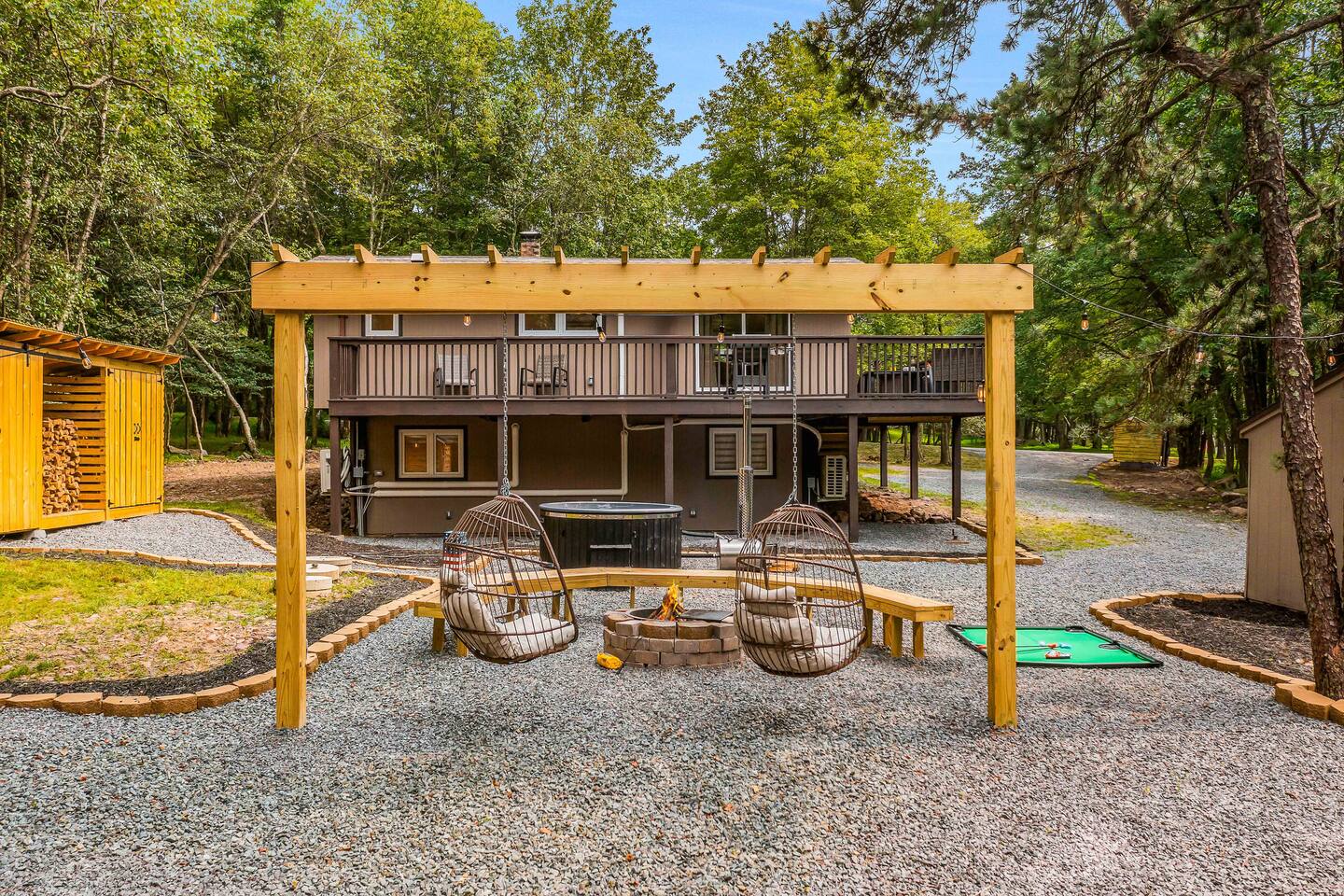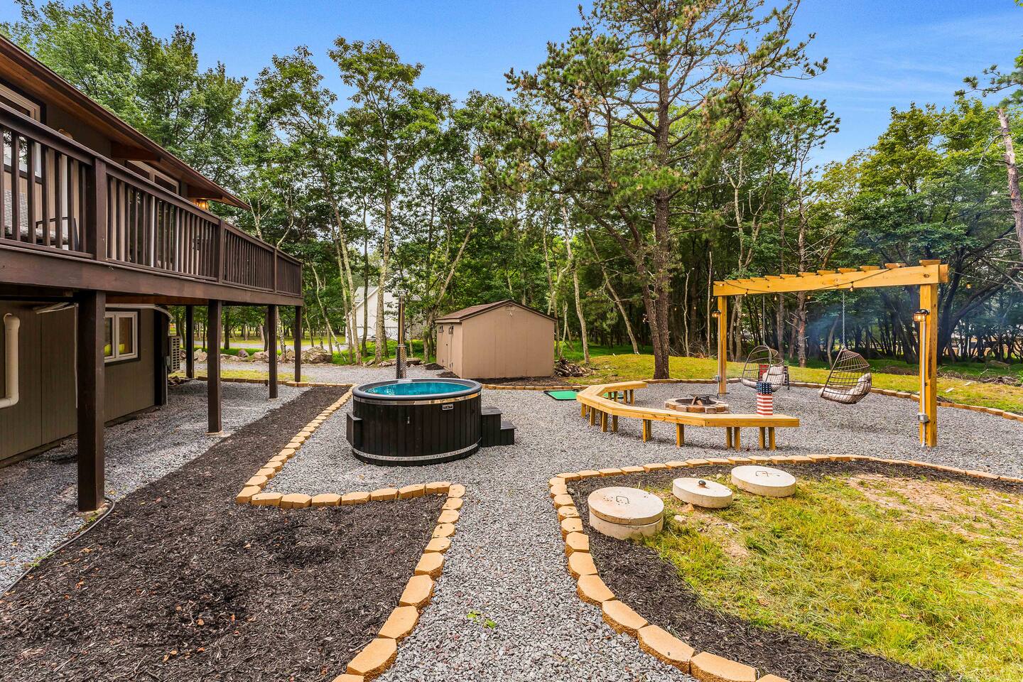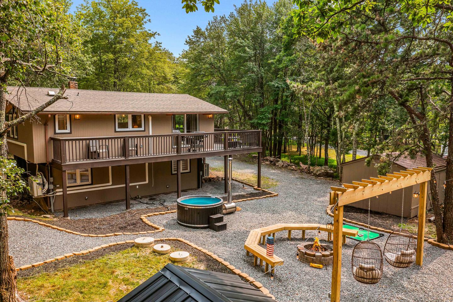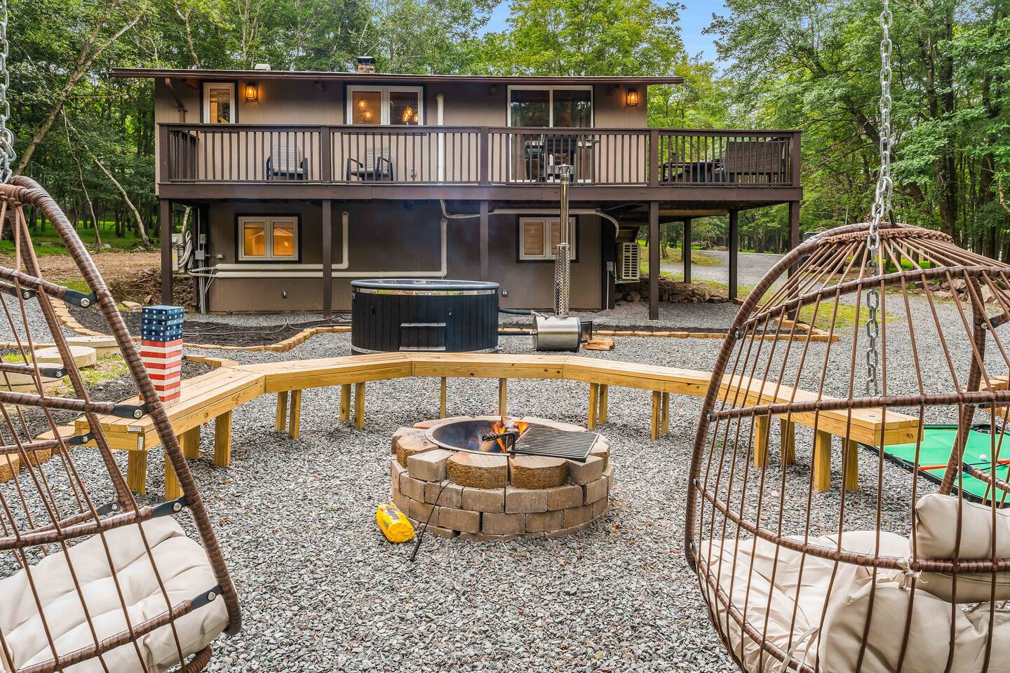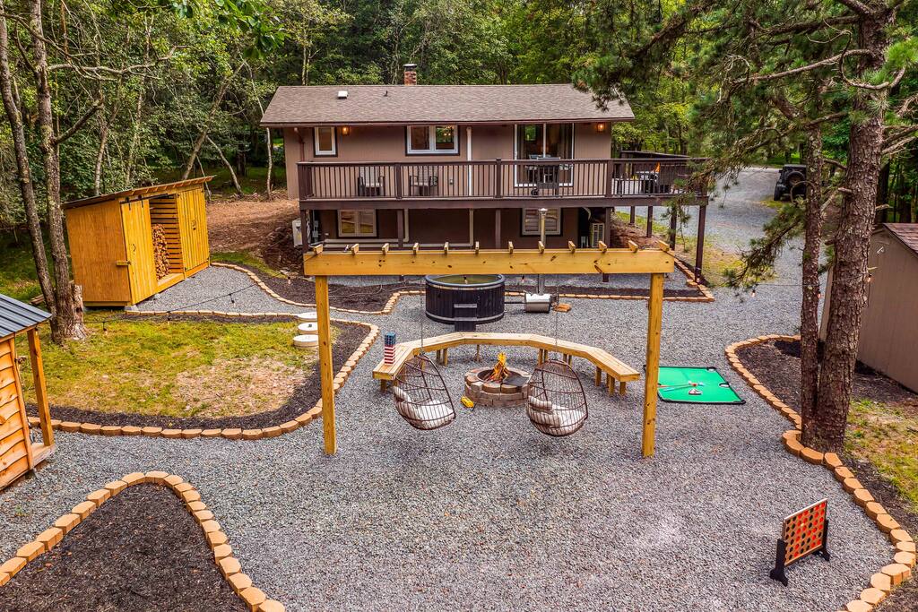 Escape to our 4BR 2BA Pocono Heaven where rustic warmth meets modern style—sleeps 9 in comfort. Gather in the open-concept living space with a cozy pellet stove, cook in the stylish kitchen & dine together with ease. Outdoors, enjoy a deck with BBQ and gas fire pit, plus a backyard oasis with swings & Bench around a fire pit, games, wood-burning hot tub, and sauna. Close to top Pocono attractions. Perfect blend of relaxation and adventure. Near Jack Frost Ski Resort, minutes from Pocono Raceway.