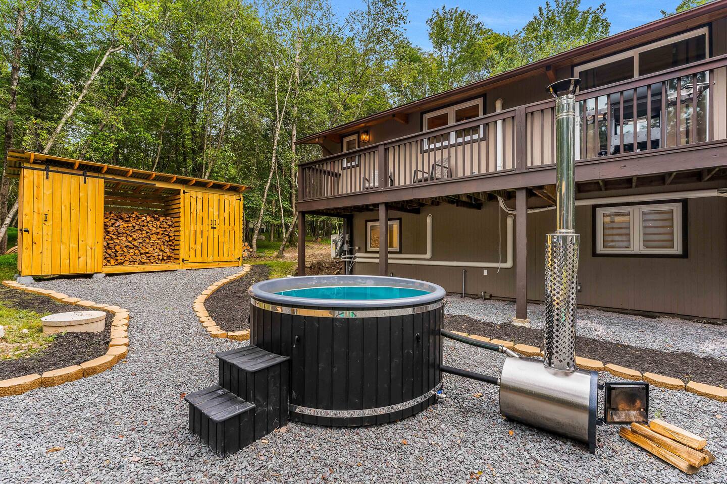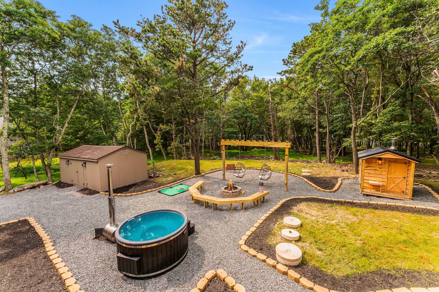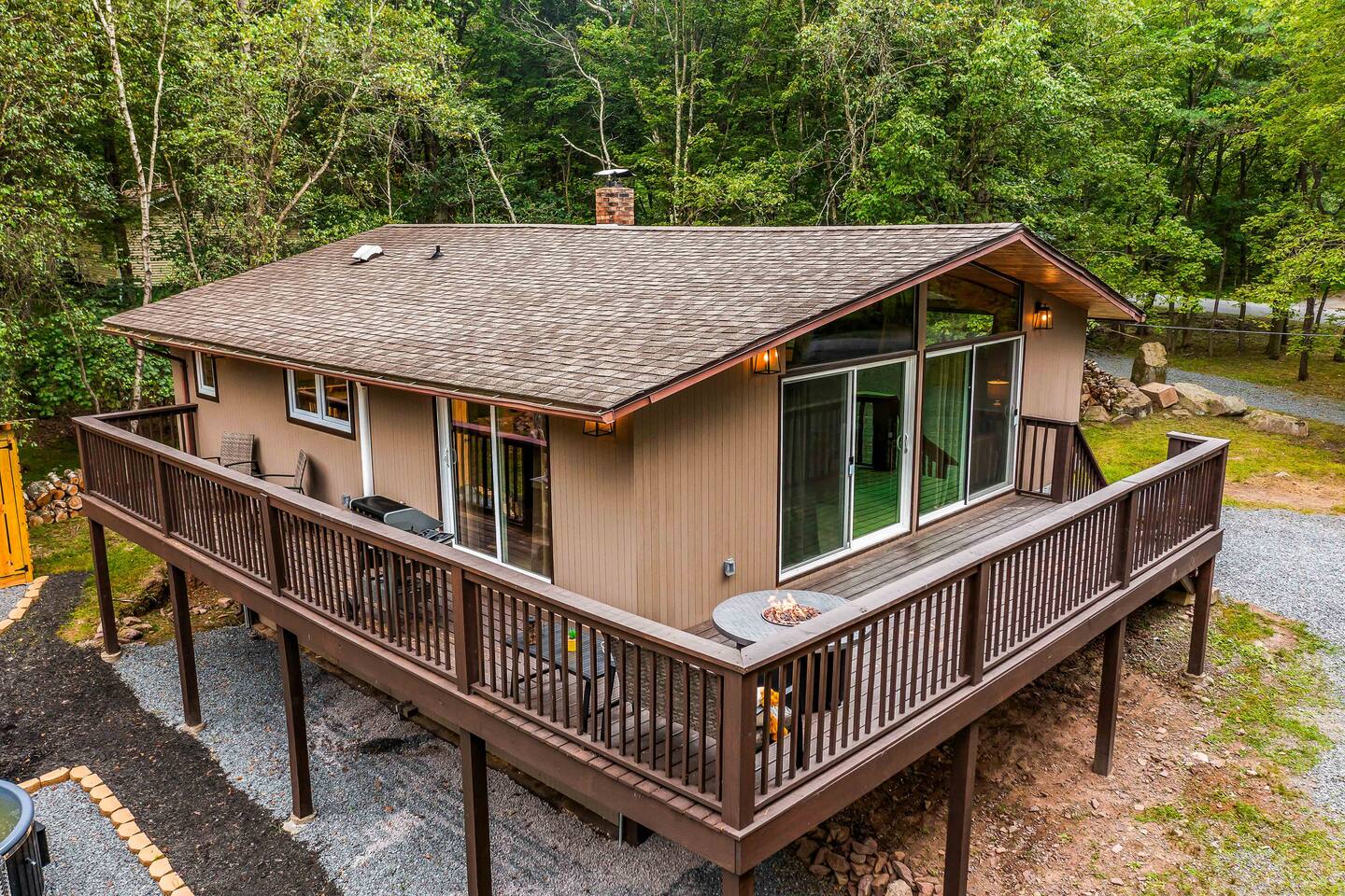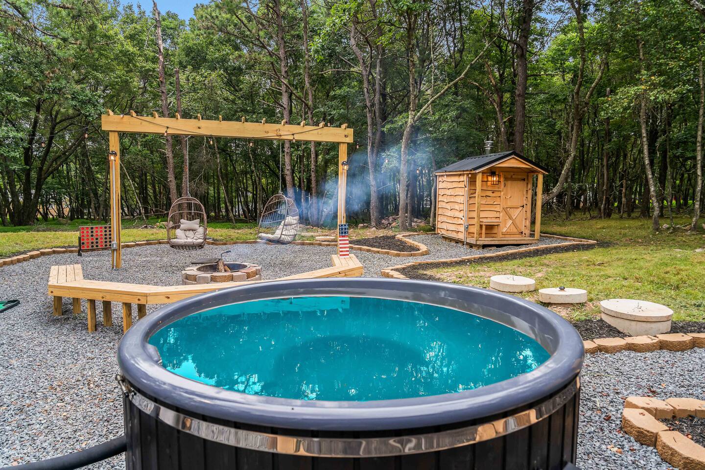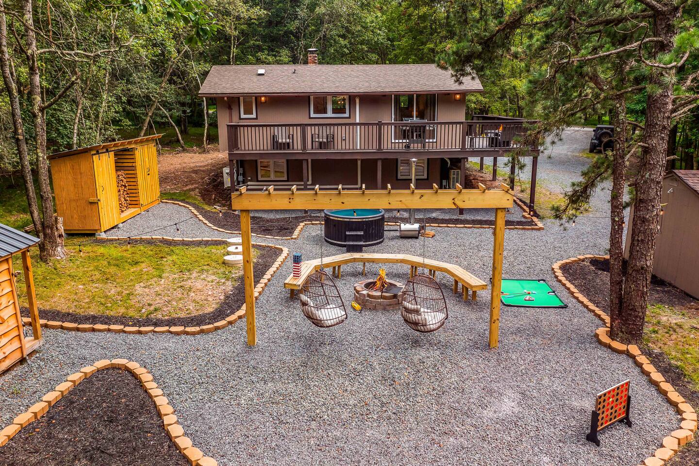 Escape to our 4BR 2BA Pocono Heaven where rustic warmth meets modern style—sleeps 9 in comfort. Gather in the open-concept living space with a cozy pellet stove, cook in the stylish kitchen & dine together with ease. Outdoors, enjoy a deck with BBQ and gas fire pit, plus a backyard oasis with swings & Bench around a fire pit, games, wood-burning hot tub, and sauna. Close to top Pocono attractions. Perfect blend of relaxation and adventure. Near Jack Frost Ski Resort, minutes from Pocono Raceway.