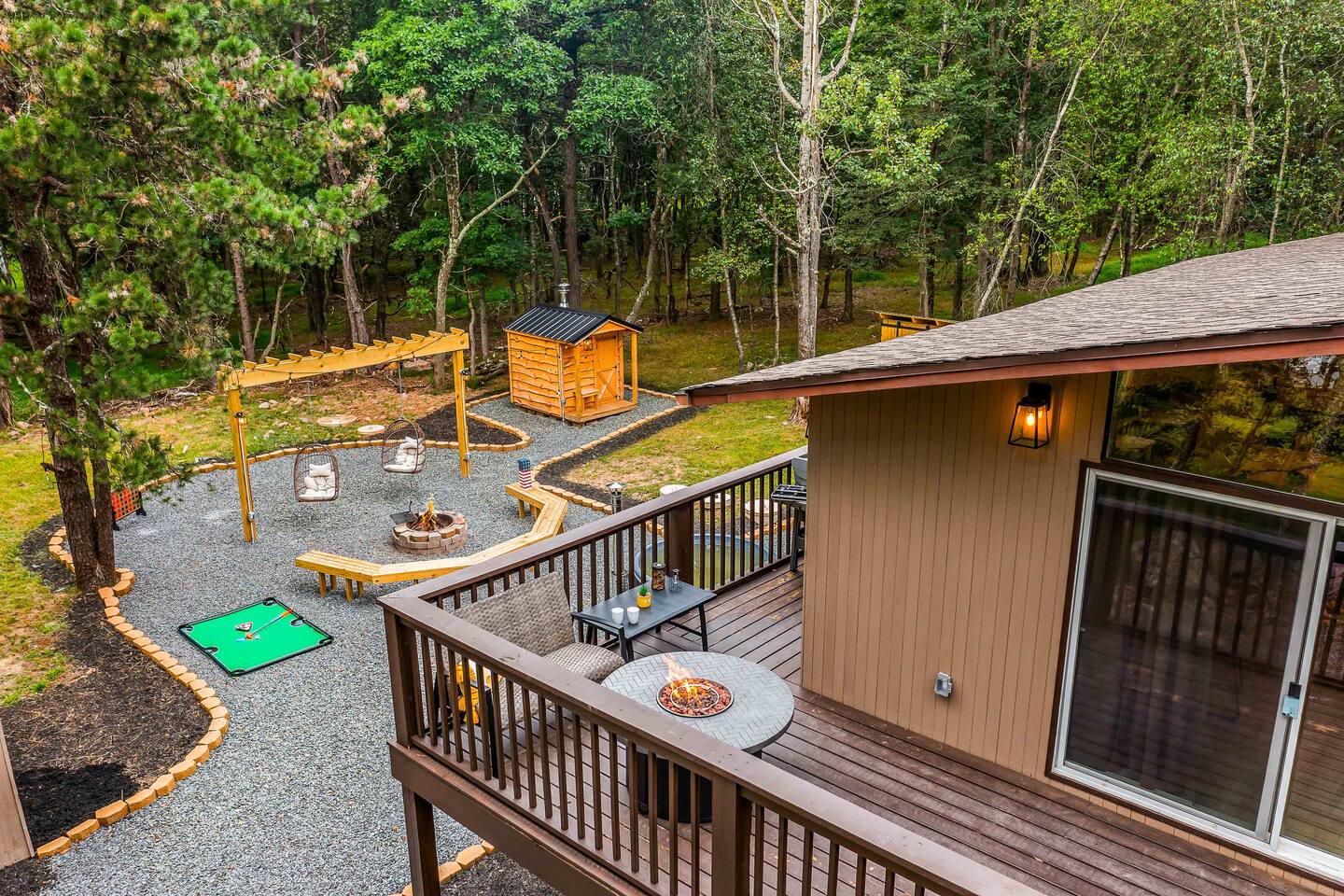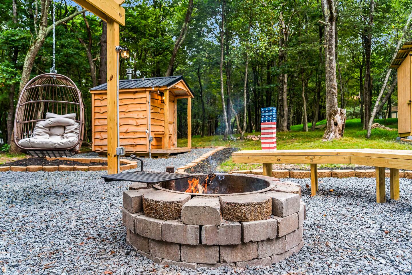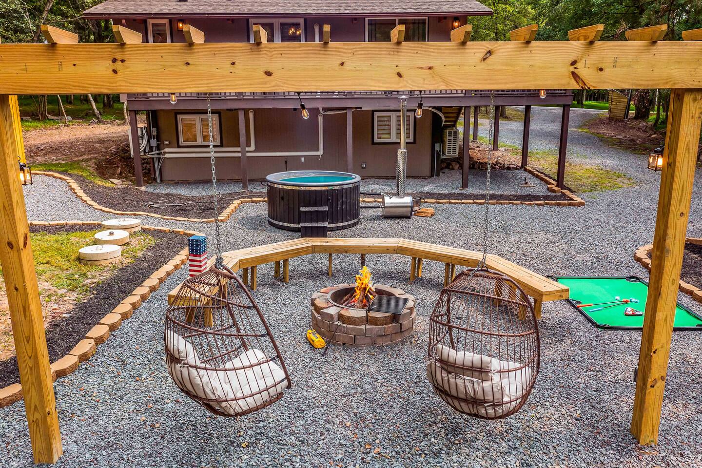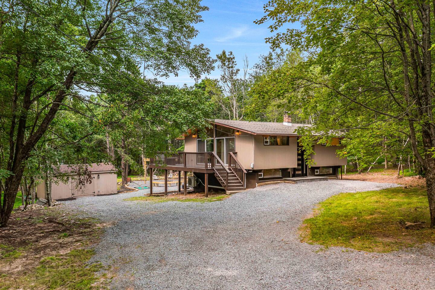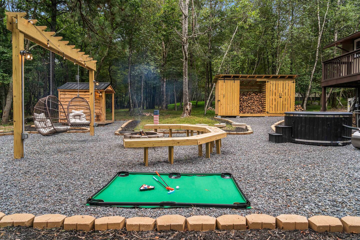 Escape to our 4BR 2BA Pocono Heaven where rustic warmth meets modern style—sleeps 9 in comfort. Gather in the open-concept living space with a cozy pellet stove, cook in the stylish kitchen & dine together with ease. Outdoors, enjoy a deck with BBQ and gas fire pit, plus a backyard oasis with swings & Bench around a fire pit, games, wood-burning hot tub, and sauna. Close to top Pocono attractions. Perfect blend of relaxation and adventure. Near Jack Frost Ski Resort, minutes from Pocono Raceway.