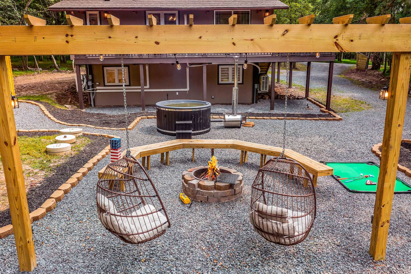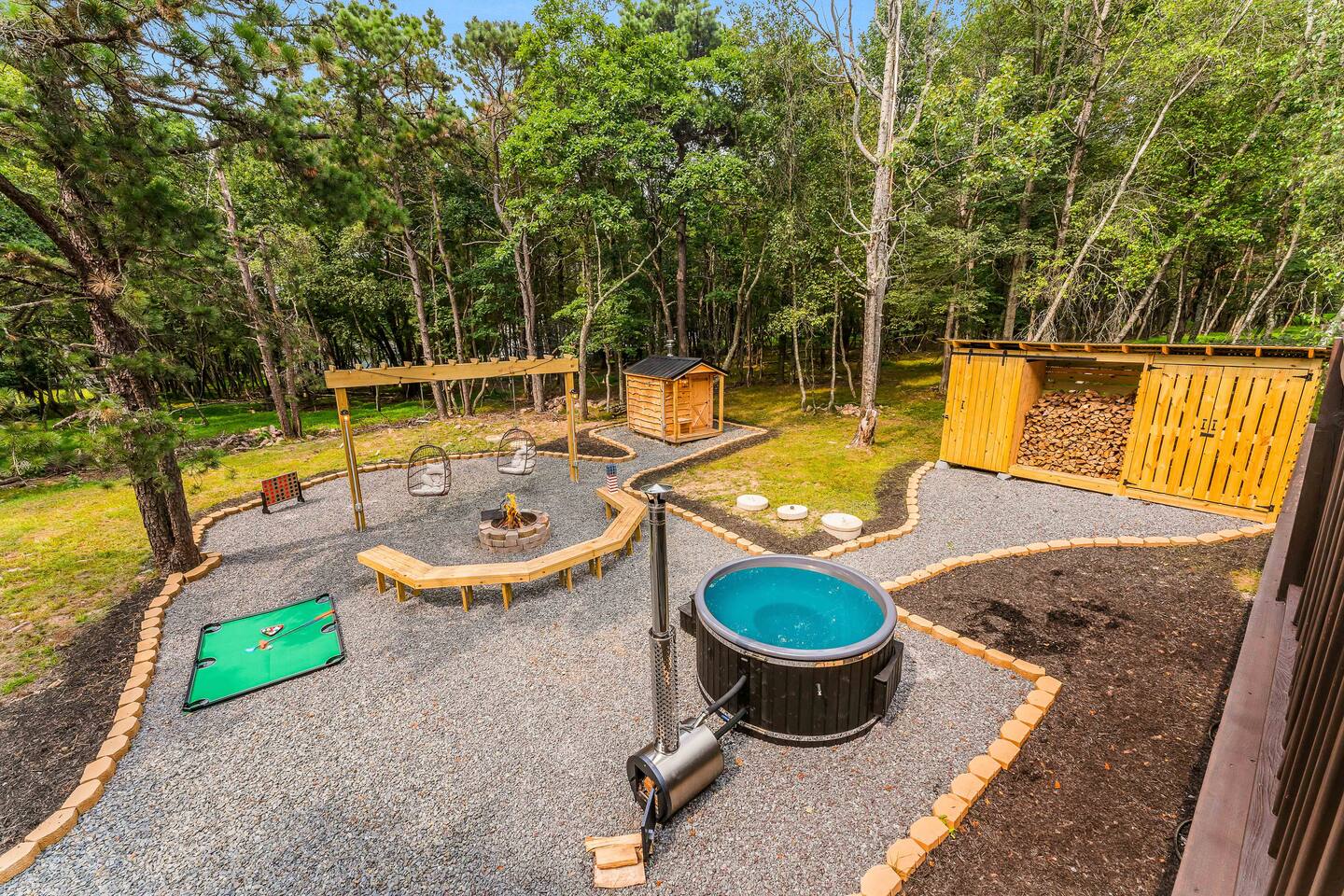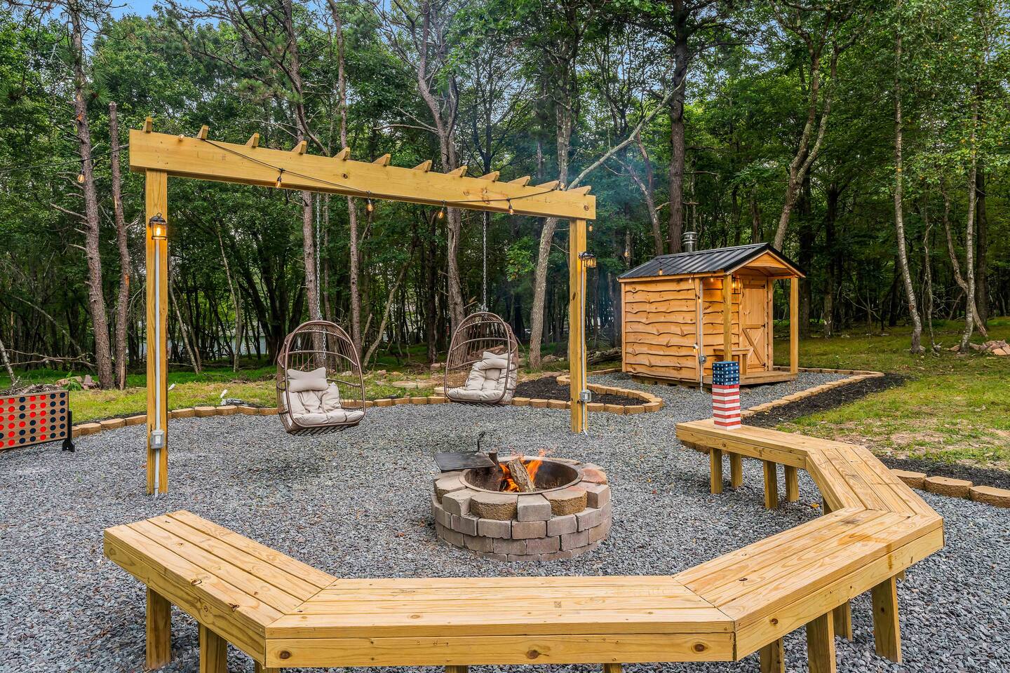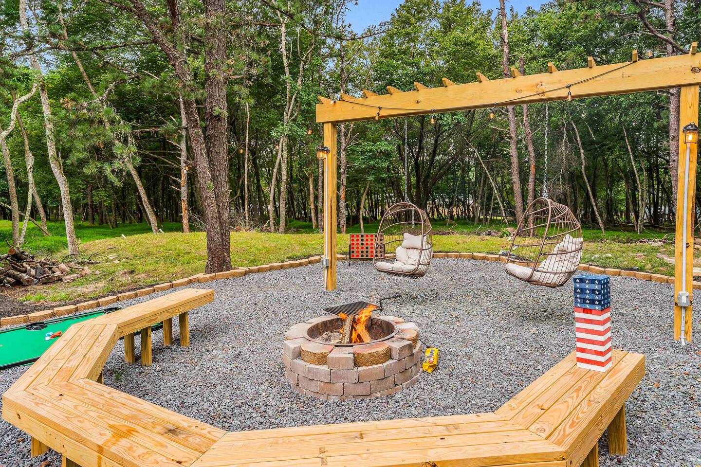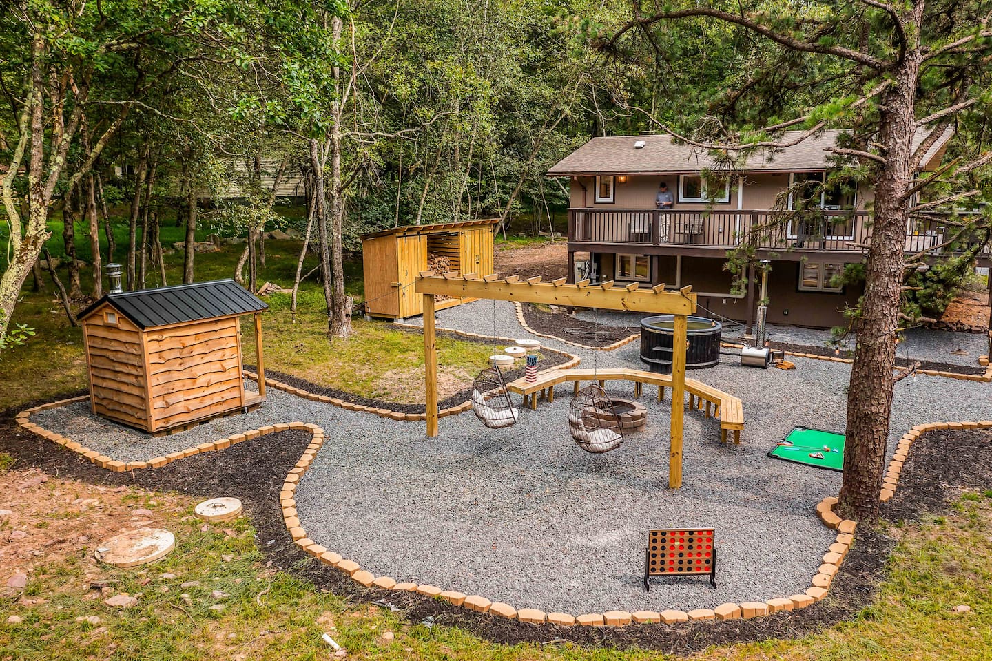 Escape to our 4BR 2BA Pocono Heaven where rustic warmth meets modern style—sleeps 9 in comfort. Gather in the open-concept living space with a cozy pellet stove, cook in the stylish kitchen & dine together with ease. Outdoors, enjoy a deck with BBQ and gas fire pit, plus a backyard oasis with swings & Bench around a fire pit, games, wood-burning hot tub, and sauna. Close to top Pocono attractions. Perfect blend of relaxation and adventure. Near Jack Frost Ski Resort, minutes from Pocono Raceway.