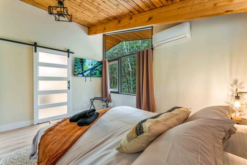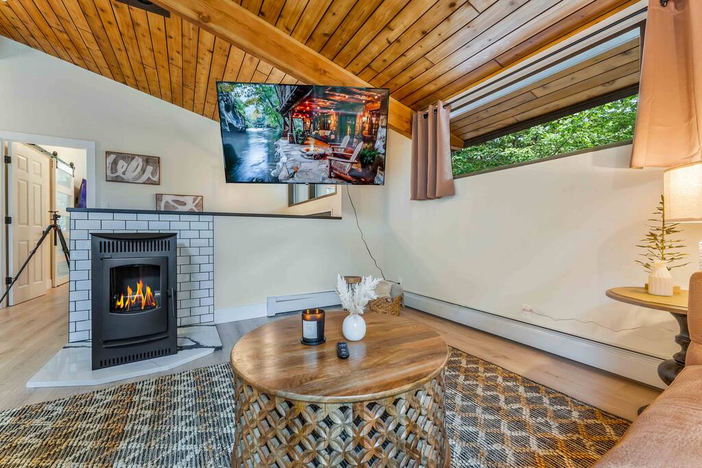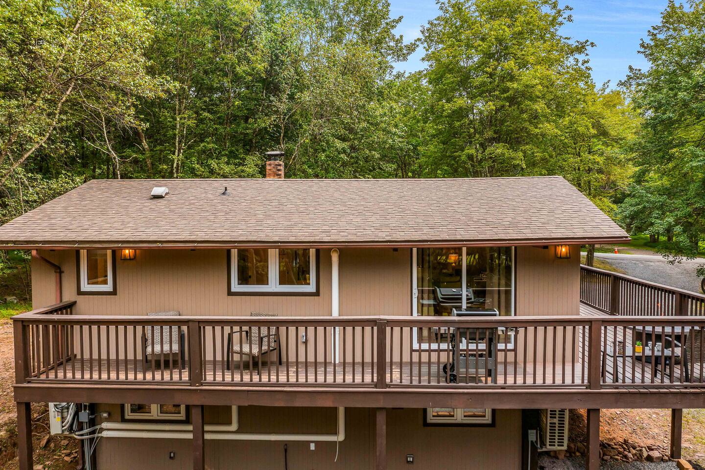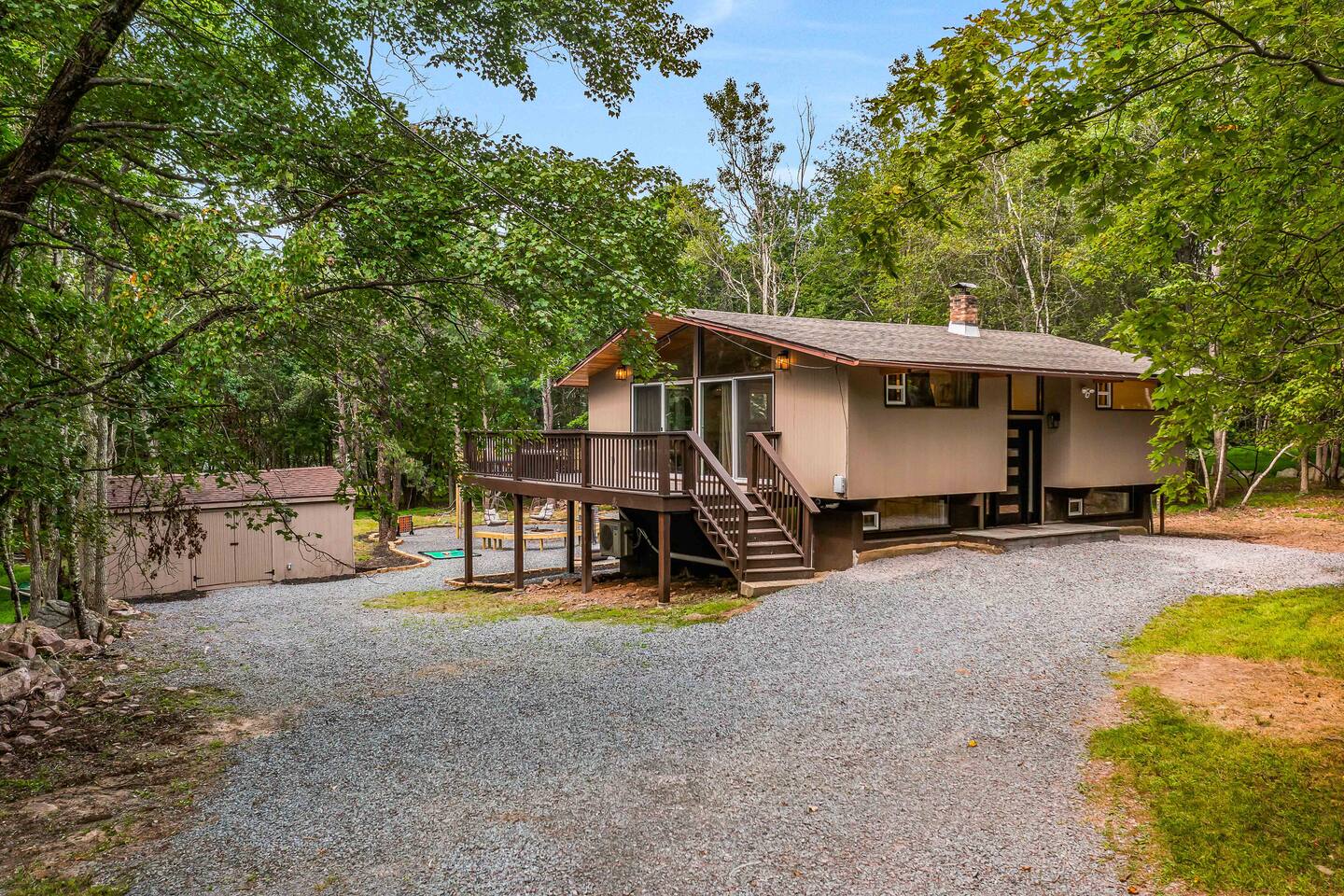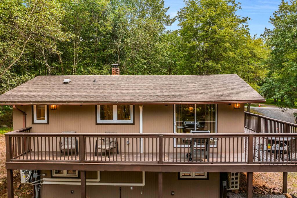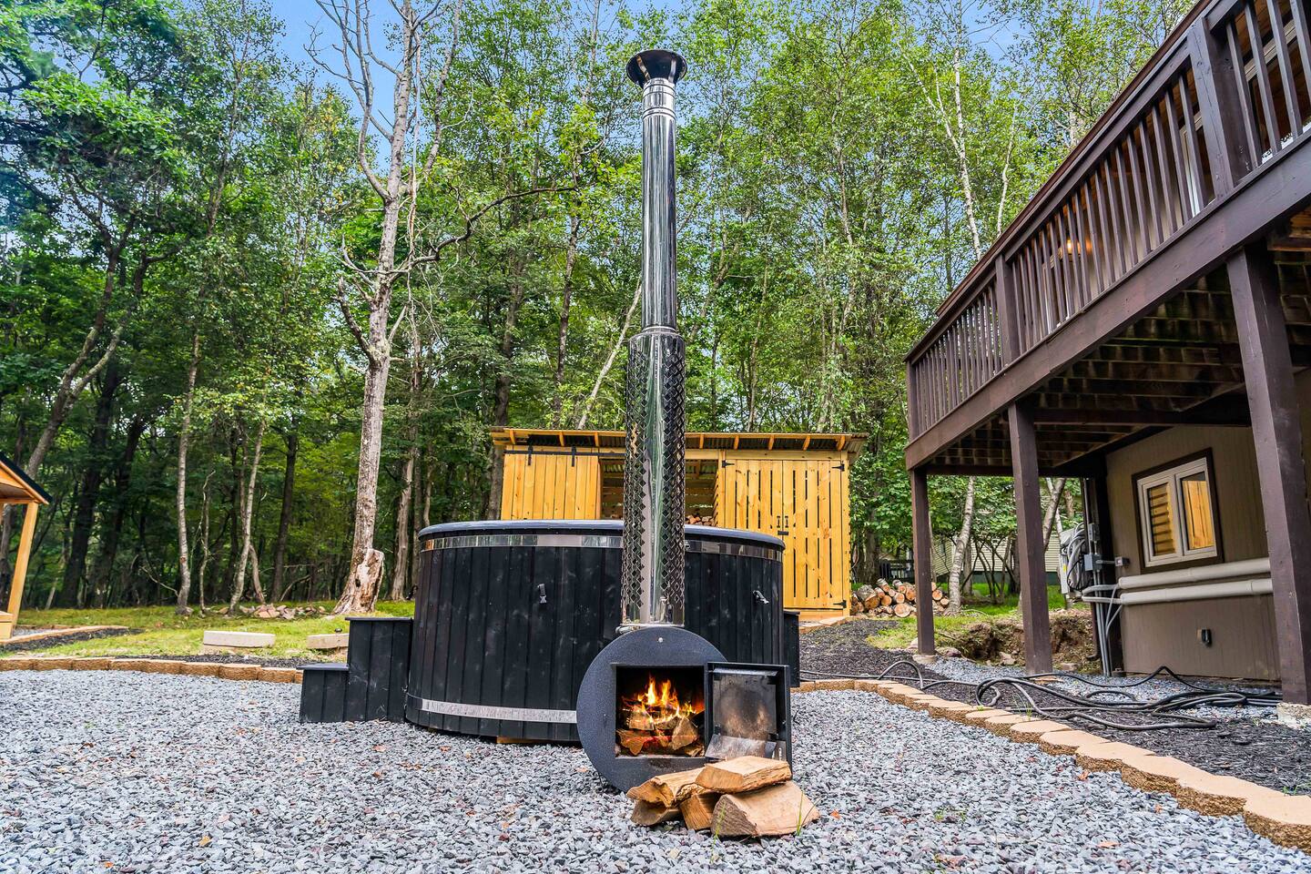 Step inside this split-level Pocono retreat and feel right at home. A central staircase connects both levels. Upper level (main living): Step up to an open-concept rustic-meets-modern space. Straight ahead is a spacious kitchen with an island; to the left are the dining and living areas (pellet stove) and sliding doors that lead to a deck with BBQ and gas-fire-pit seating. To the right of the stairs is the primary bedroom (queen bed, smart TV, closet) with private access to the upstairs bathroom — a luxurious space with a freestanding soaking tub and a separate shower. That bathroom is also accessible from the common area via the door by the kitchen. Lower level (fully detailed): Walk down the stairs to a long hallway that organizes the sleeping and service spaces — everything down here is easy to find and laid out for privacy and convenience. • Bedroom A (first door on the left): Bunk room with a twin/single over a full bed (twin on top, full on bottom) plus a closet — great for kids or extra guests. (Twin = 1 person, Full = 2 people.) • Bedroom B (next door): Queen bed and a closet — cozy and private. • Owner’s closet (small door between bedrooms): Locked and not accessible to guests. • Bedroom C (next door): Queen bed with a spacious closet — quiet and comfortable. • Downstairs bathroom (end of the hallway): Full bathroom with a shower — serves the lower-level bedrooms. • Laundry / Utility (door next to the downstairs bathroom): Guest-accessible utility room with washer and dryer for your convenience. • Second locked utility/owner’s closet (adjacent to laundry): Locked and not accessible to guests. This layout gives you three bedrooms downstairs (two queens + bunk room) plus the upstairs primary — total sleeping for 9 guests (queen upstairs = 2, two queens downstairs = 4, bunk = 3). Backyard & extras: Beyond the deck, the backyard is a complete entertainment zone: a real wood fire pit with half-moon wooden bench seating and two swings, a wood-burning hot tub (jets + LED lights), a wood-burning sauna, and a woodshed. We provide unlimited access to our wood supply for a $25 convenience fee. There’s also another shed that’s currently locked but will soon be a game room. Comfort & climate: The main open-concept area and every bedroom have split units for heating and cooling so everyone can stay comfortable year-round.