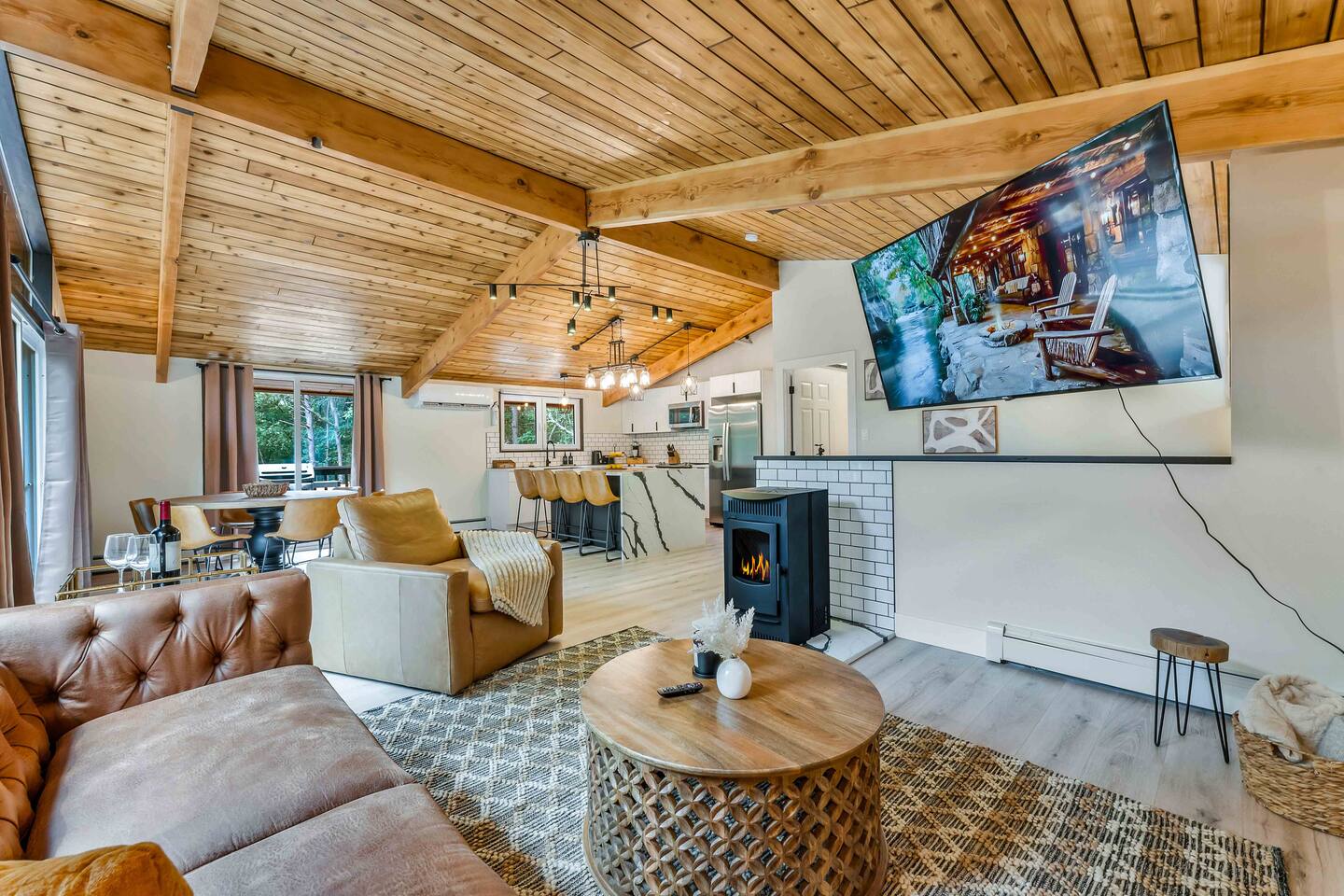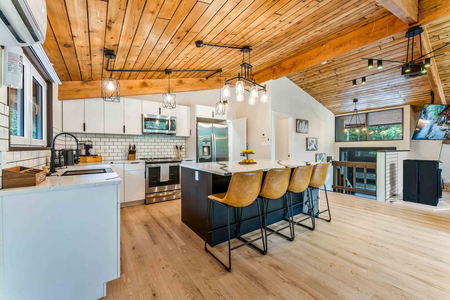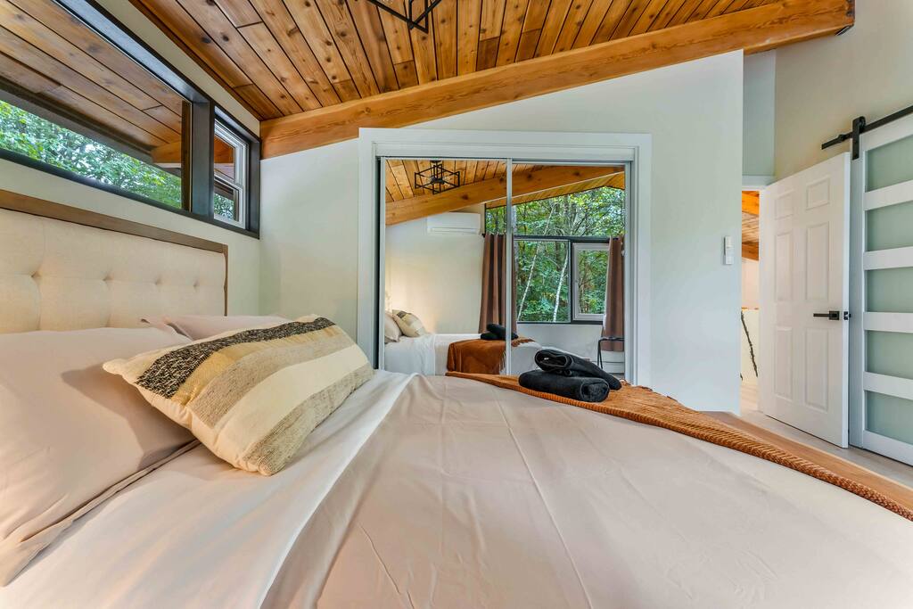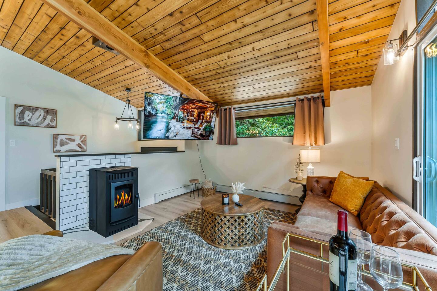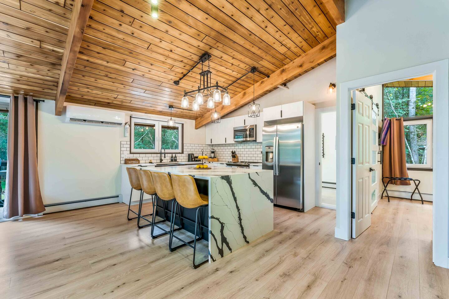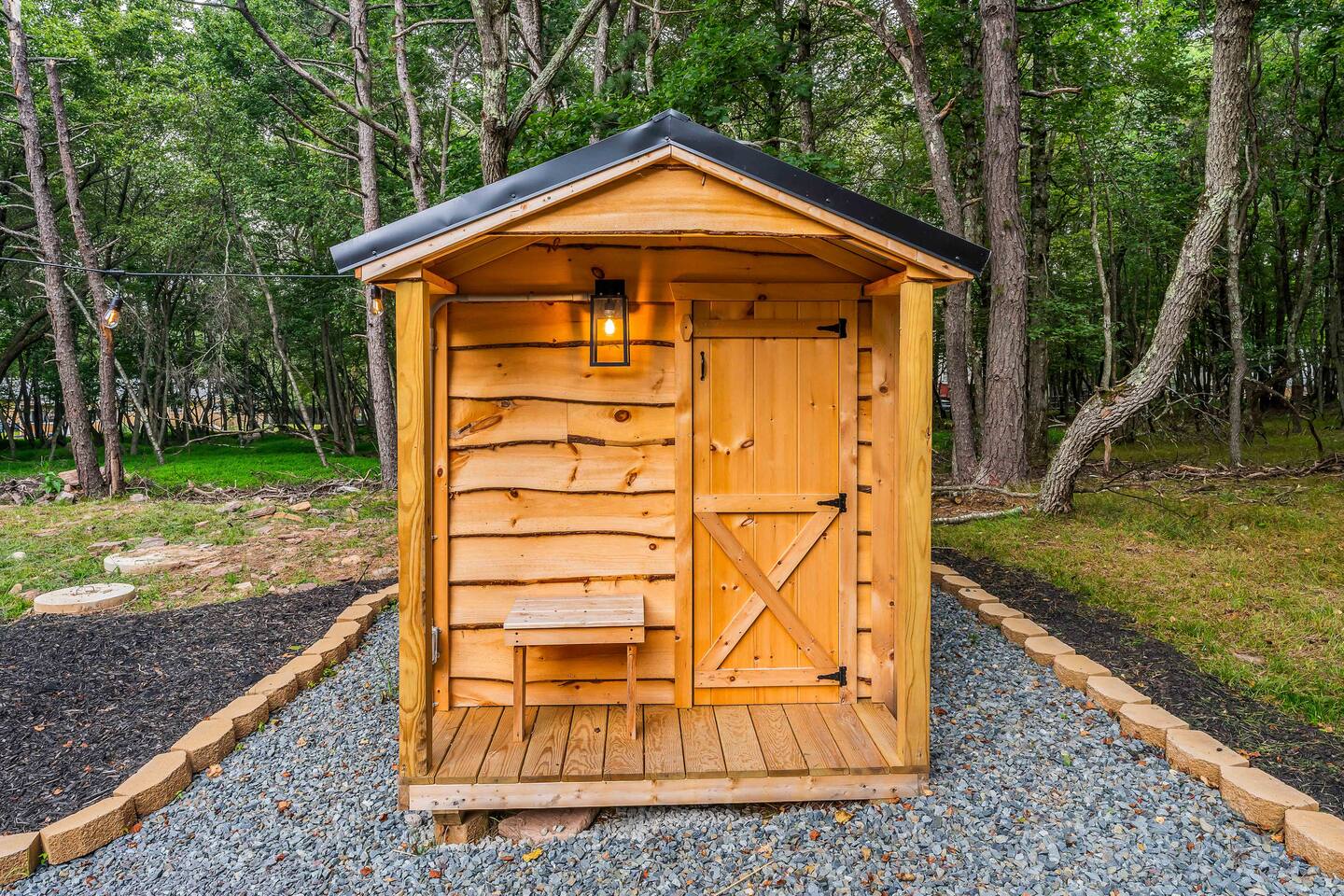 Step inside this split-level Pocono retreat and feel right at home. A central staircase connects both levels. Upper level (main living): Step up to an open-concept rustic-meets-modern space. Straight ahead is a spacious kitchen with an island; to the left are the dining and living areas (pellet stove) and sliding doors that lead to a deck with BBQ and gas-fire-pit seating. To the right of the stairs is the primary bedroom (queen bed, smart TV, closet) with private access to the upstairs bathroom — a luxurious space with a freestanding soaking tub and a separate shower. That bathroom is also accessible from the common area via the door by the kitchen. Lower level (fully detailed): Walk down the stairs to a long hallway that organizes the sleeping and service spaces — everything down here is easy to find and laid out for privacy and convenience. • Bedroom A (first door on the left): Bunk room with a twin/single over a full bed (twin on top, full on bottom) plus a closet — great for kids or extra guests. (Twin = 1 person, Full = 2 people.) • Bedroom B (next door): Queen bed and a closet — cozy and private. • Owner’s closet (small door between bedrooms): Locked and not accessible to guests. • Bedroom C (next door): Queen bed with a spacious closet — quiet and comfortable. • Downstairs bathroom (end of the hallway): Full bathroom with a shower — serves the lower-level bedrooms. • Laundry / Utility (door next to the downstairs bathroom): Guest-accessible utility room with washer and dryer for your convenience. • Second locked utility/owner’s closet (adjacent to laundry): Locked and not accessible to guests. This layout gives you three bedrooms downstairs (two queens + bunk room) plus the upstairs primary — total sleeping for 9 guests (queen upstairs = 2, two queens downstairs = 4, bunk = 3). Backyard & extras: Beyond the deck, the backyard is a complete entertainment zone: a real wood fire pit with half-moon wooden bench seating and two swings, a wood-burning hot tub (jets + LED lights), a wood-burning sauna, and a woodshed. We provide unlimited access to our wood supply for a $25 convenience fee. There’s also another shed that’s currently locked but will soon be a game room. Comfort & climate: The main open-concept area and every bedroom have split units for heating and cooling so everyone can stay comfortable year-round.
