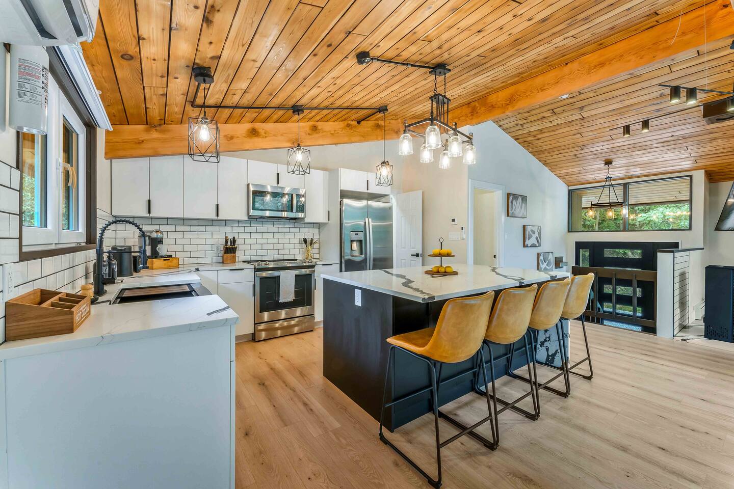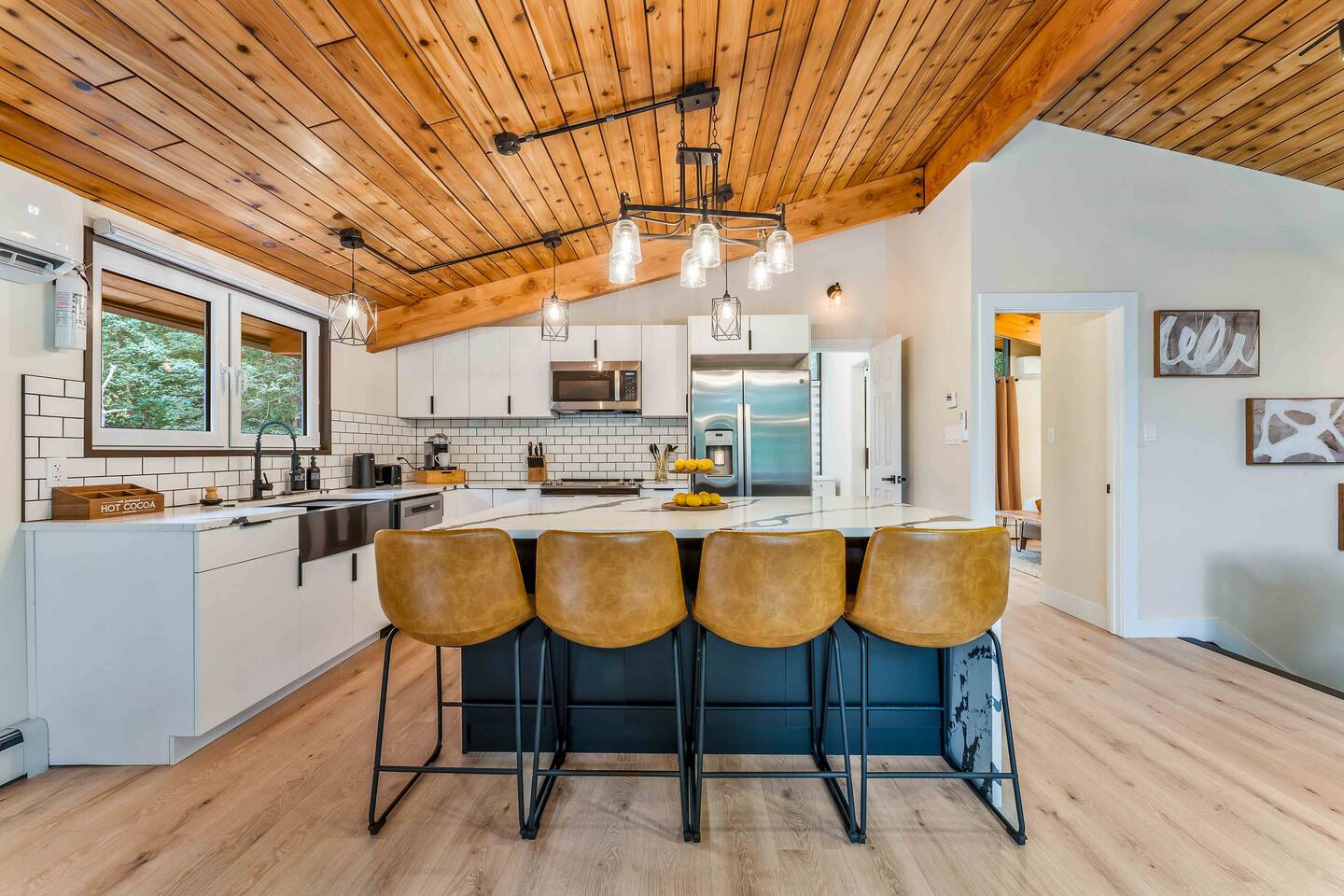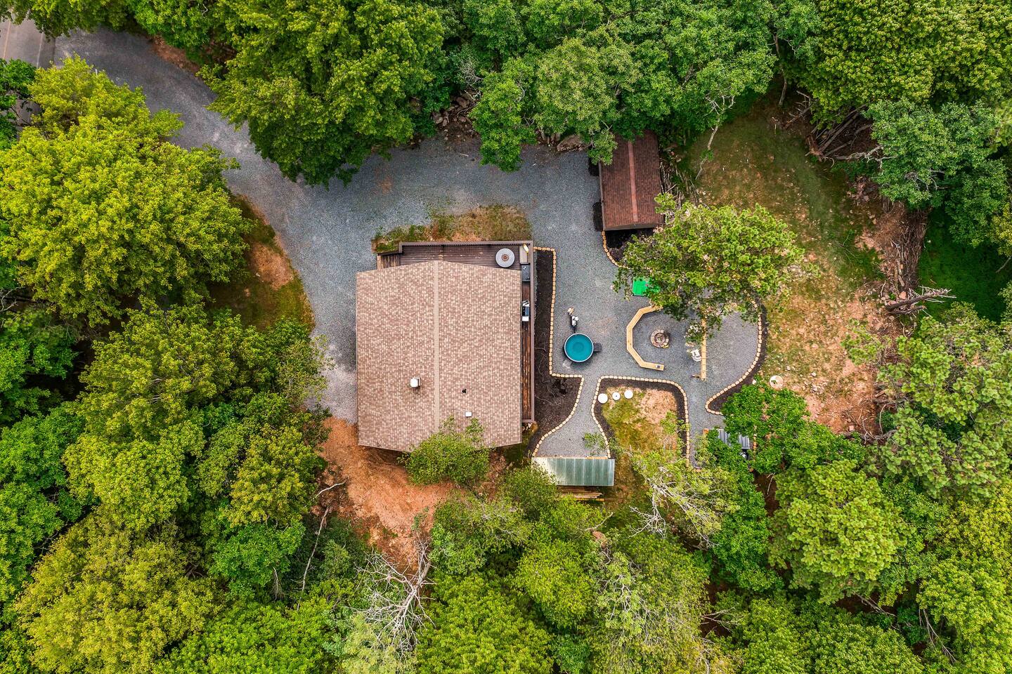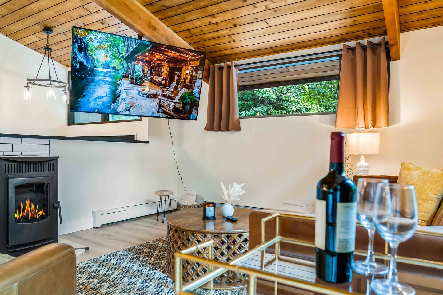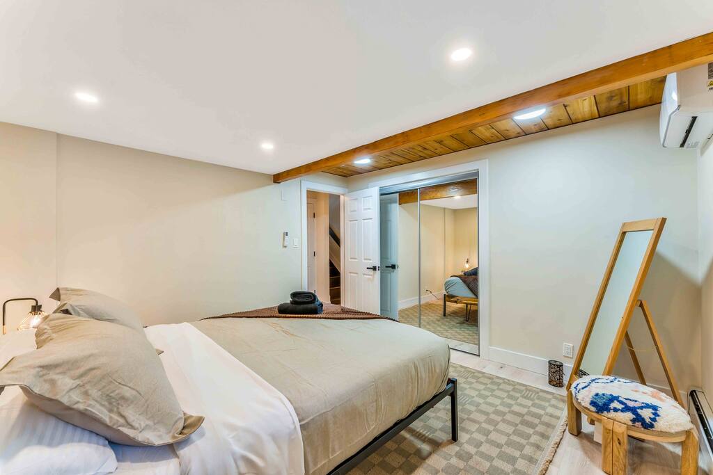 Step inside this split-level Pocono retreat and feel right at home. A central staircase connects both levels. Upper level (main living): Step up to an open-concept rustic-meets-modern space. Straight ahead is a spacious kitchen with an island; to the left are the dining and living areas (pellet stove) and sliding doors that lead to a deck with BBQ and gas-fire-pit seating. To the right of the stairs is the primary bedroom (queen bed, smart TV, closet) with private access to the upstairs bathroom — a luxurious space with a freestanding soaking tub and a separate shower. That bathroom is also accessible from the common area via the door by the kitchen. Lower level (fully detailed): Walk down the stairs to a long hallway that organizes the sleeping and service spaces — everything down here is easy to find and laid out for privacy and convenience. • Bedroom A (first door on the left): Bunk room with a twin/single over a full bed (twin on top, full on bottom) plus a closet — great for kids or extra guests. (Twin = 1 person, Full = 2 people.) • Bedroom B (next door): Queen bed and a closet — cozy and private. • Owner’s closet (small door between bedrooms): Locked and not accessible to guests. • Bedroom C (next door): Queen bed with a spacious closet — quiet and comfortable. • Downstairs bathroom (end of the hallway): Full bathroom with a shower — serves the lower-level bedrooms. • Laundry / Utility (door next to the downstairs bathroom): Guest-accessible utility room with washer and dryer for your convenience. • Second locked utility/owner’s closet (adjacent to laundry): Locked and not accessible to guests. This layout gives you three bedrooms downstairs (two queens + bunk room) plus the upstairs primary — total sleeping for 9 guests (queen upstairs = 2, two queens downstairs = 4, bunk = 3). Backyard & extras: Beyond the deck, the backyard is a complete entertainment zone: a real wood fire pit with half-moon wooden bench seating and two swings, a wood-burning hot tub (jets + LED lights), a wood-burning sauna, and a woodshed. We provide unlimited access to our wood supply for a $25 convenience fee. There’s also another shed that’s currently locked but will soon be a game room. Comfort & climate: The main open-concept area and every bedroom have split units for heating and cooling so everyone can stay comfortable year-round.