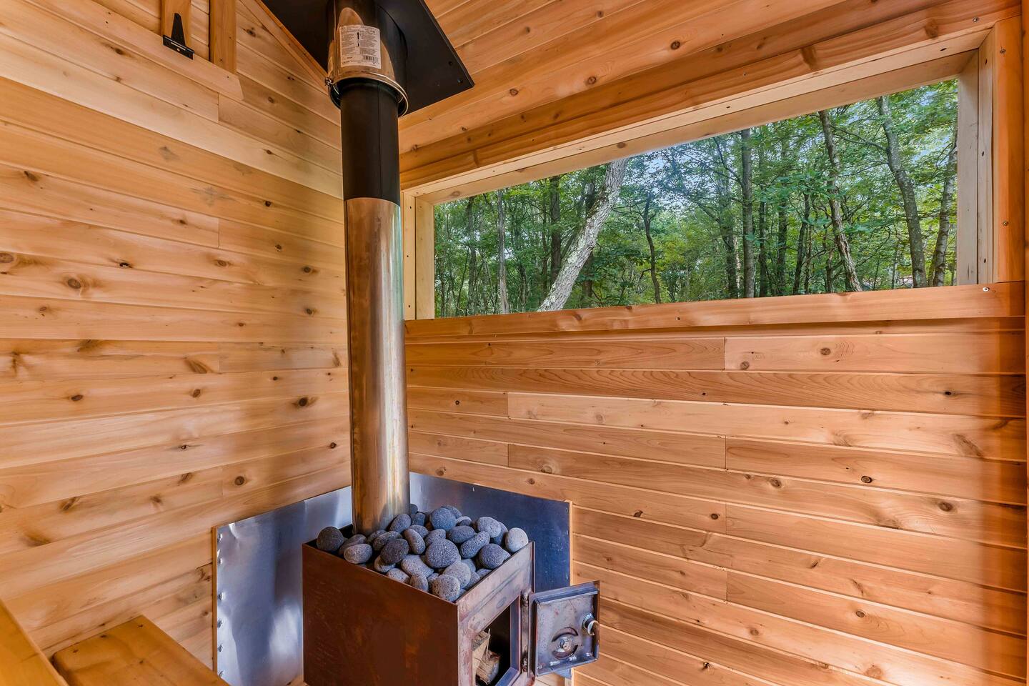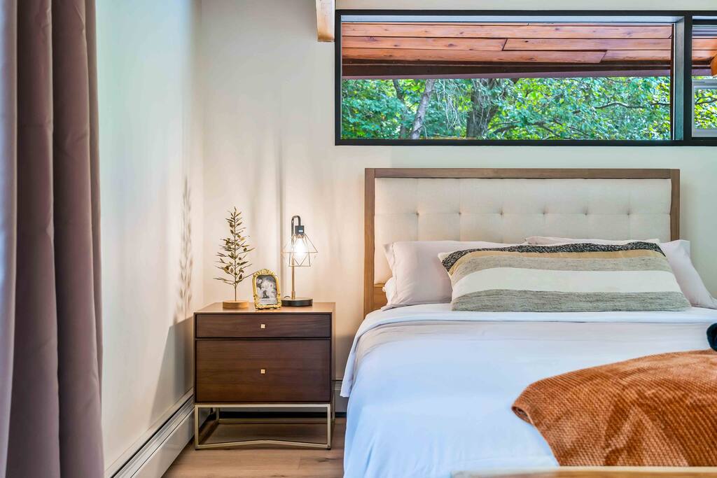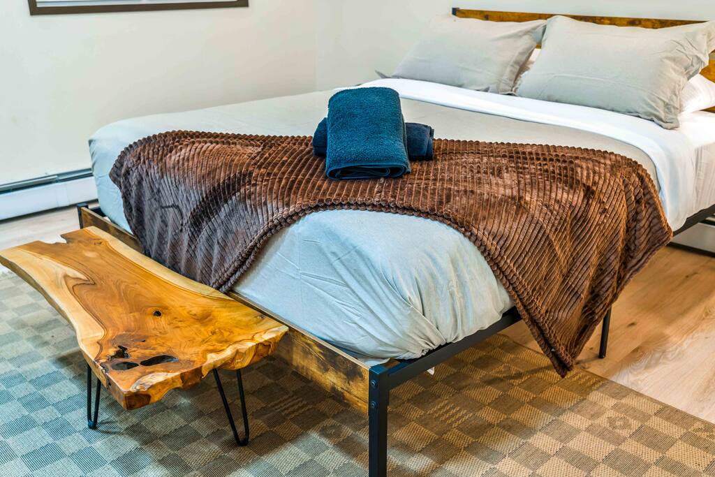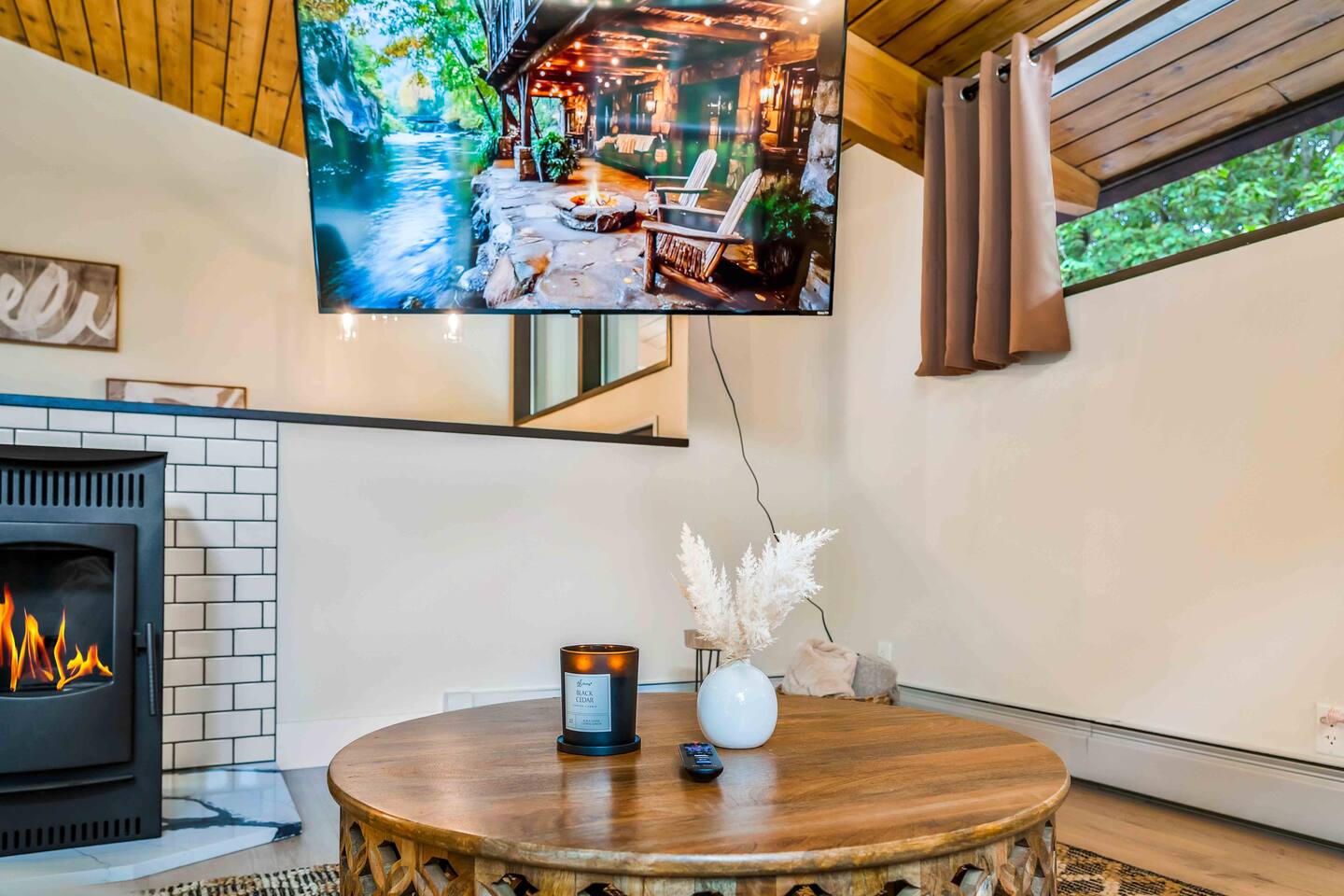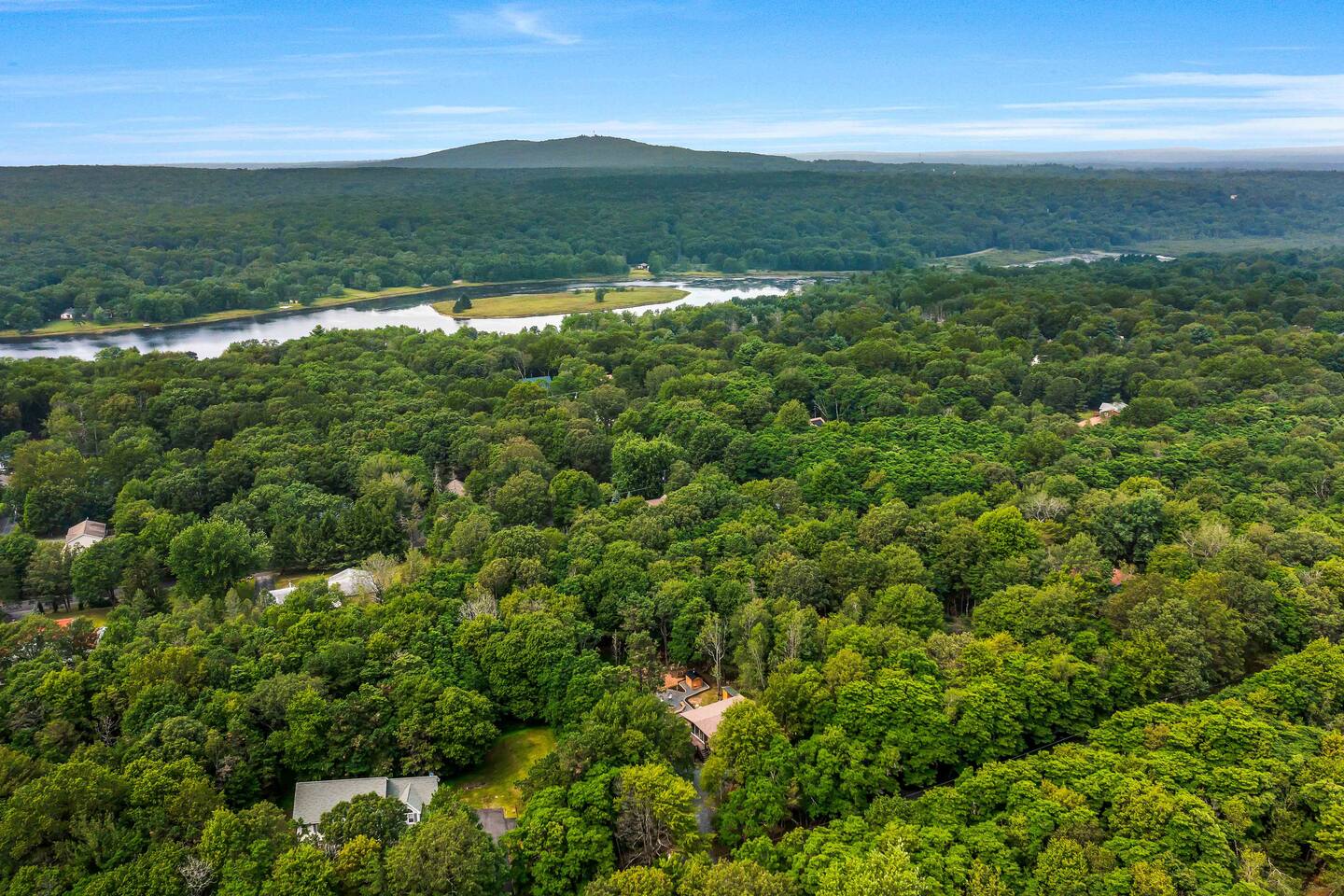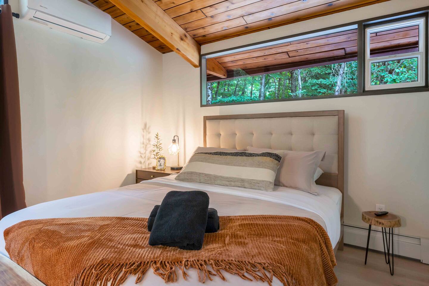Step inside this split-level Pocono retreat and feel right at home. A central staircase connects both levels. Upper level (main living): Step up to an open-concept rustic-meets-modern space. Straight ahead is a spacious kitchen with an island; to the left are the dining and living areas (pellet stove) and sliding doors that lead to a deck with BBQ and gas-fire-pit seating. To the right of the stairs is the primary bedroom (queen bed, smart TV, closet) with private access to the upstairs bathroom — a luxurious space with a freestanding soaking tub and a separate shower. That bathroom is also accessible from the common area via the door by the kitchen. Lower level (fully detailed): Walk down the stairs to a long hallway that organizes the sleeping and service spaces — everything down here is easy to find and laid out for privacy and convenience. • Bedroom A (first door on the left): Bunk room with a twin/single over a full bed (twin on top, full on bottom) plus a closet — great for kids or extra guests. (Twin = 1 person, Full = 2 people.) • Bedroom B (next door): Queen bed and a closet — cozy and private. • Owner’s closet (small door between bedrooms): Locked and not accessible to guests. • Bedroom C (next door): Queen bed with a spacious closet — quiet and comfortable. • Downstairs bathroom (end of the hallway): Full bathroom with a shower — serves the lower-level bedrooms. • Laundry / Utility (door next to the downstairs bathroom): Guest-accessible utility room with washer and dryer for your convenience. • Second locked utility/owner’s closet (adjacent to laundry): Locked and not accessible to guests. This layout gives you three bedrooms downstairs (two queens + bunk room) plus the upstairs primary — total sleeping for 9 guests (queen upstairs = 2, two queens downstairs = 4, bunk = 3). Backyard & extras: Beyond the deck, the backyard is a complete entertainment zone: a real wood fire pit with half-moon wooden bench seating and two swings, a wood-burning hot tub (jets + LED lights), a wood-burning sauna, and a woodshed. We provide unlimited access to our wood supply for a $25 convenience fee. There’s also another shed that’s currently locked but will soon be a game room. Comfort & climate: The main open-concept area and every bedroom have split units for heating and cooling so everyone can stay comfortable year-round.