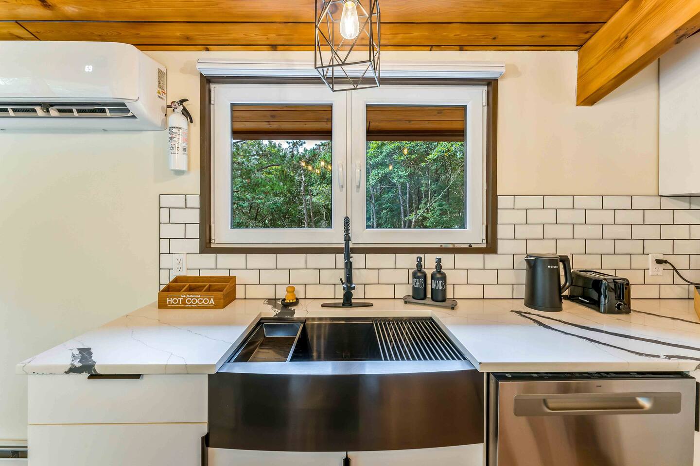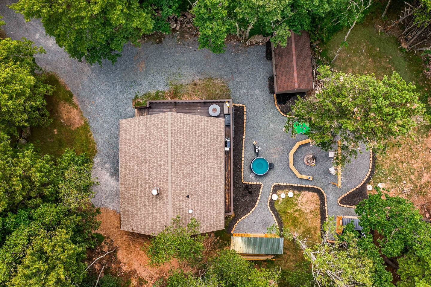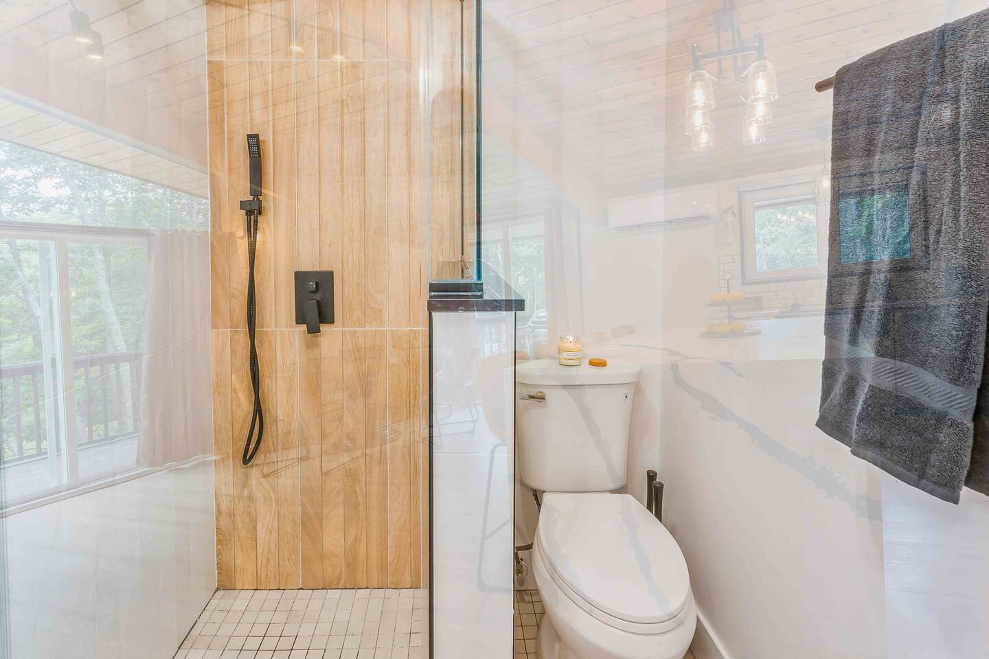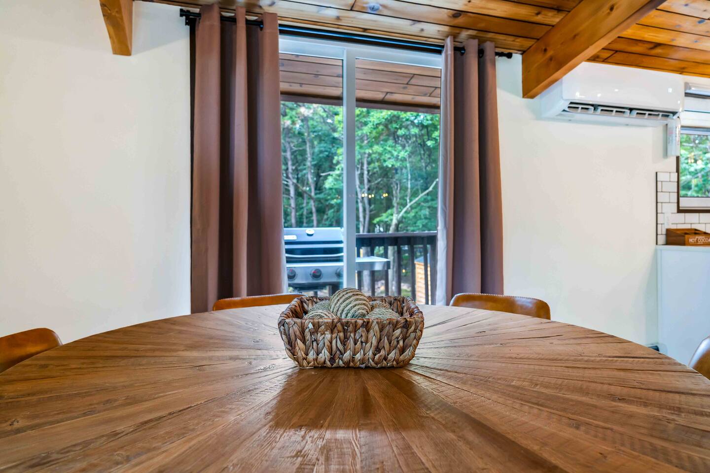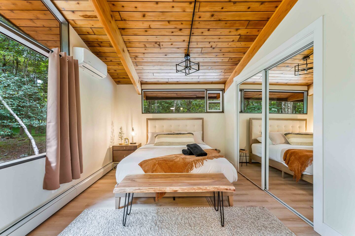 Step inside this split-level Pocono retreat and feel right at home. A central staircase connects both levels. Upper level (main living): Step up to an open-concept rustic-meets-modern space. Straight ahead is a spacious kitchen with an island; to the left are the dining and living areas (pellet stove) and sliding doors that lead to a deck with BBQ and gas-fire-pit seating. To the right of the stairs is the primary bedroom (queen bed, smart TV, closet) with private access to the upstairs bathroom — a luxurious space with a freestanding soaking tub and a separate shower. That bathroom is also accessible from the common area via the door by the kitchen. Lower level (fully detailed): Walk down the stairs to a long hallway that organizes the sleeping and service spaces — everything down here is easy to find and laid out for privacy and convenience. • Bedroom A (first door on the left): Bunk room with a twin/single over a full bed (twin on top, full on bottom) plus a closet — great for kids or extra guests. (Twin = 1 person, Full = 2 people.) • Bedroom B (next door): Queen bed and a closet — cozy and private. • Owner’s closet (small door between bedrooms): Locked and not accessible to guests. • Bedroom C (next door): Queen bed with a spacious closet — quiet and comfortable. • Downstairs bathroom (end of the hallway): Full bathroom with a shower — serves the lower-level bedrooms. • Laundry / Utility (door next to the downstairs bathroom): Guest-accessible utility room with washer and dryer for your convenience. • Second locked utility/owner’s closet (adjacent to laundry): Locked and not accessible to guests. This layout gives you three bedrooms downstairs (two queens + bunk room) plus the upstairs primary — total sleeping for 9 guests (queen upstairs = 2, two queens downstairs = 4, bunk = 3). Backyard & extras: Beyond the deck, the backyard is a complete entertainment zone: a real wood fire pit with half-moon wooden bench seating and two swings, a wood-burning hot tub (jets + LED lights), a wood-burning sauna, and a woodshed. We provide unlimited access to our wood supply for a $25 convenience fee. There’s also another shed that’s currently locked but will soon be a game room. Comfort & climate: The main open-concept area and every bedroom have split units for heating and cooling so everyone can stay comfortable year-round.
