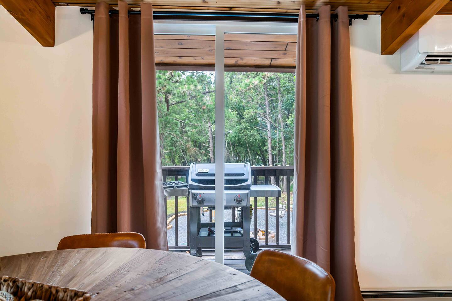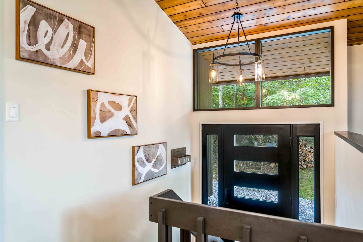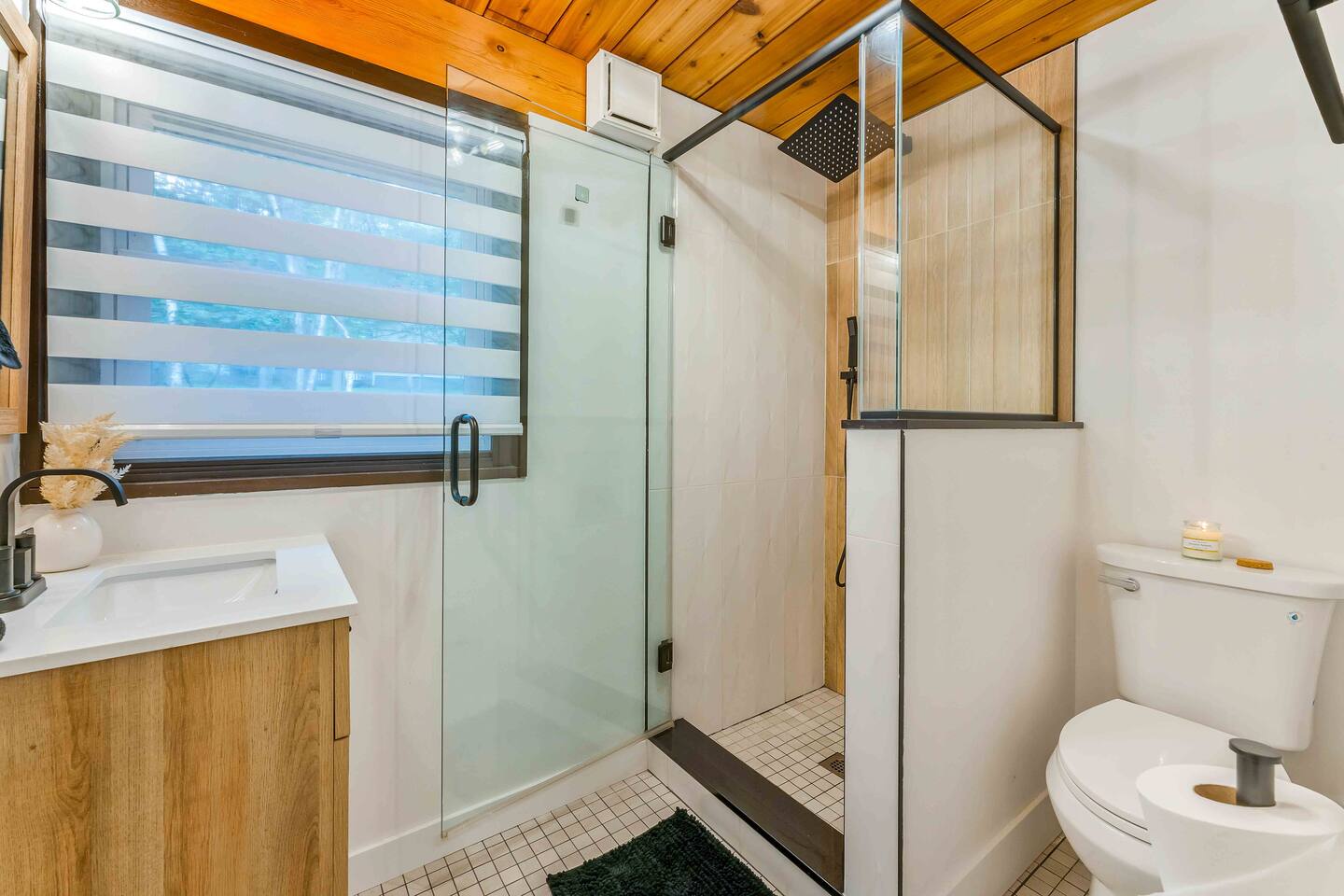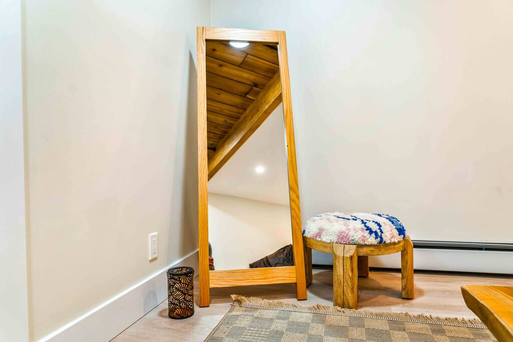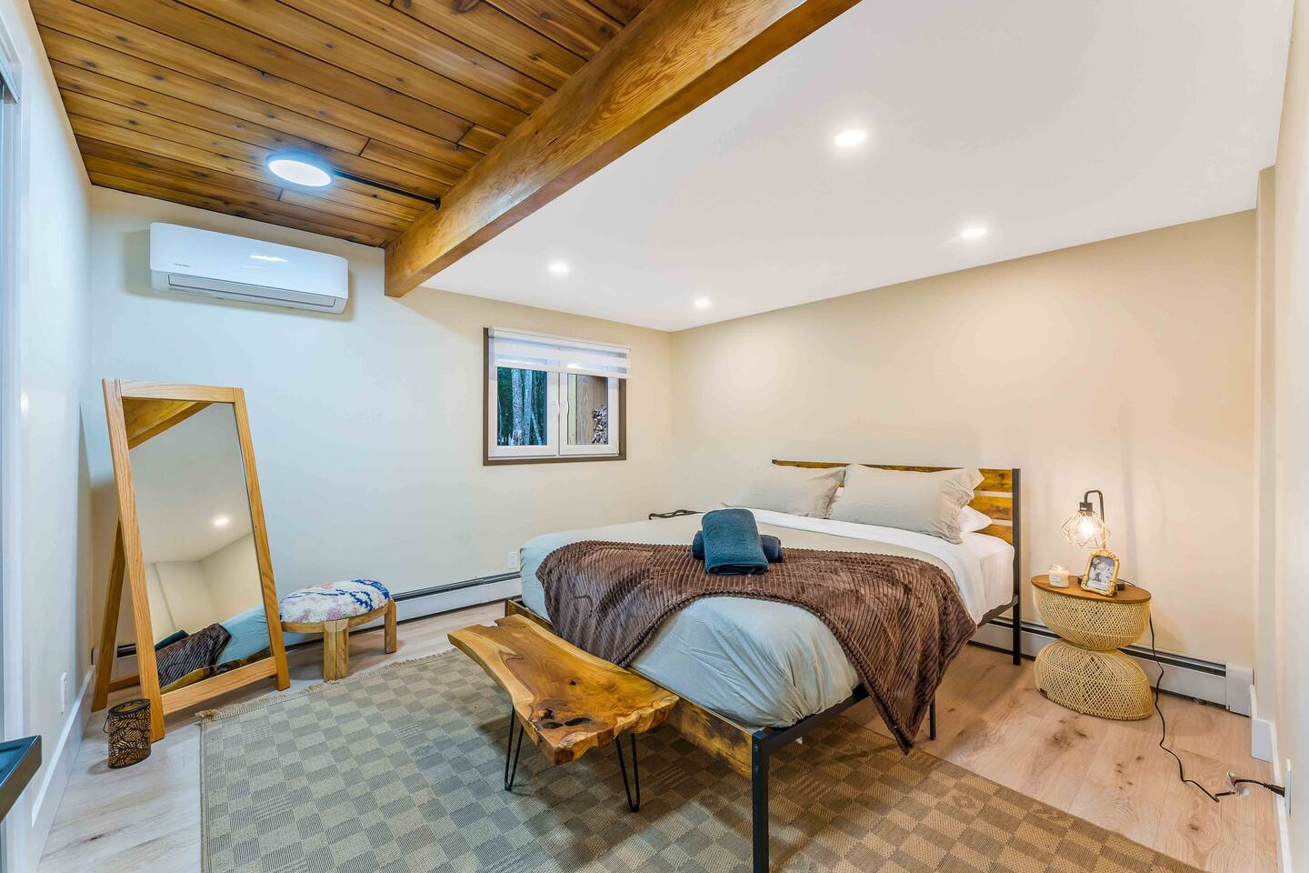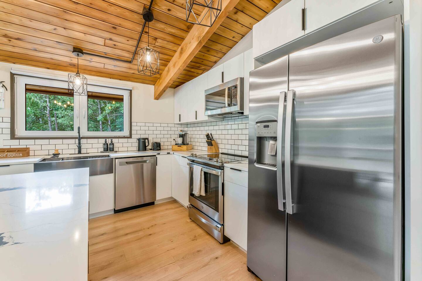 Step inside this split-level Pocono retreat and feel right at home. A central staircase connects both levels. Upper level (main living): Step up to an open-concept rustic-meets-modern space. Straight ahead is a spacious kitchen with an island; to the left are the dining and living areas (pellet stove) and sliding doors that lead to a deck with BBQ and gas-fire-pit seating. To the right of the stairs is the primary bedroom (queen bed, smart TV, closet) with private access to the upstairs bathroom — a luxurious space with a freestanding soaking tub and a separate shower. That bathroom is also accessible from the common area via the door by the kitchen. Lower level (fully detailed): Walk down the stairs to a long hallway that organizes the sleeping and service spaces — everything down here is easy to find and laid out for privacy and convenience. • Bedroom A (first door on the left): Bunk room with a twin/single over a full bed (twin on top, full on bottom) plus a closet — great for kids or extra guests. (Twin = 1 person, Full = 2 people.) • Bedroom B (next door): Queen bed and a closet — cozy and private. • Owner’s closet (small door between bedrooms): Locked and not accessible to guests. • Bedroom C (next door): Queen bed with a spacious closet — quiet and comfortable. • Downstairs bathroom (end of the hallway): Full bathroom with a shower — serves the lower-level bedrooms. • Laundry / Utility (door next to the downstairs bathroom): Guest-accessible utility room with washer and dryer for your convenience. • Second locked utility/owner’s closet (adjacent to laundry): Locked and not accessible to guests. This layout gives you three bedrooms downstairs (two queens + bunk room) plus the upstairs primary — total sleeping for 9 guests (queen upstairs = 2, two queens downstairs = 4, bunk = 3). Backyard & extras: Beyond the deck, the backyard is a complete entertainment zone: a real wood fire pit with half-moon wooden bench seating and two swings, a wood-burning hot tub (jets + LED lights), a wood-burning sauna, and a woodshed. We provide unlimited access to our wood supply for a $25 convenience fee. There’s also another shed that’s currently locked but will soon be a game room. Comfort & climate: The main open-concept area and every bedroom have split units for heating and cooling so everyone can stay comfortable year-round.