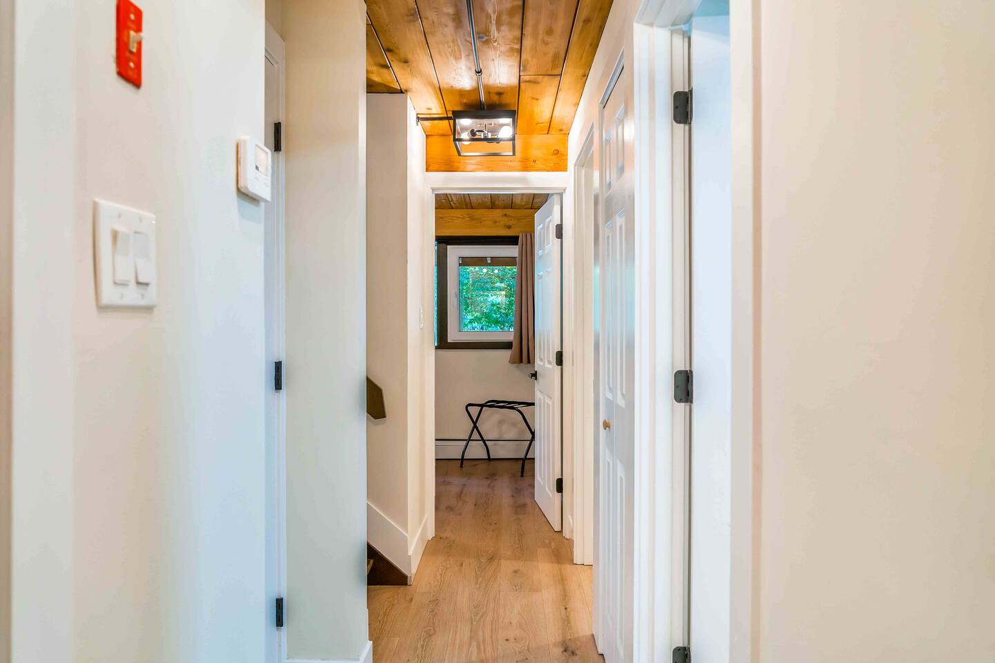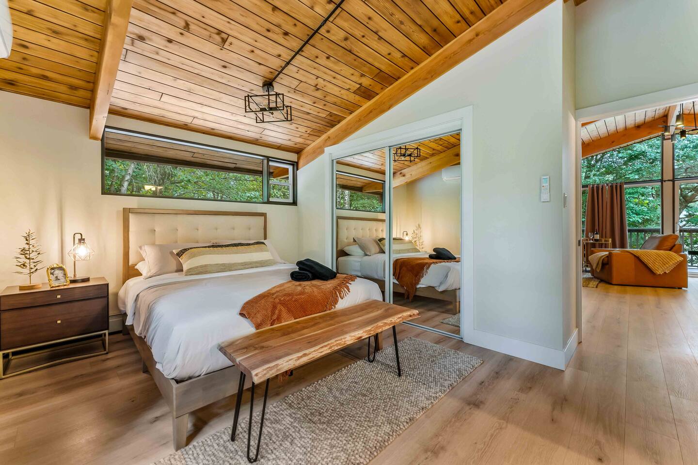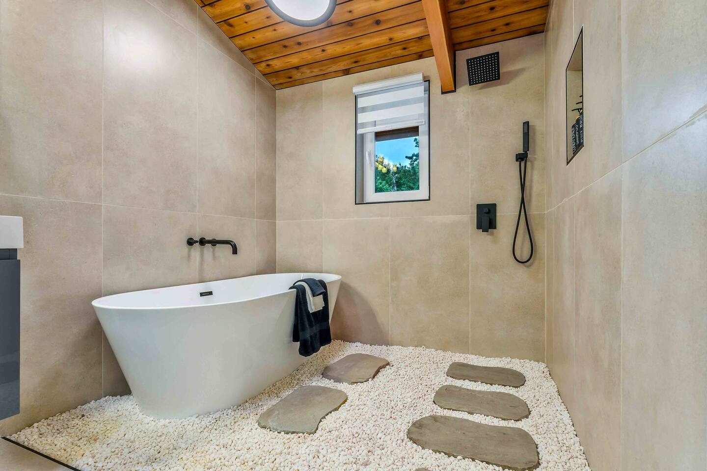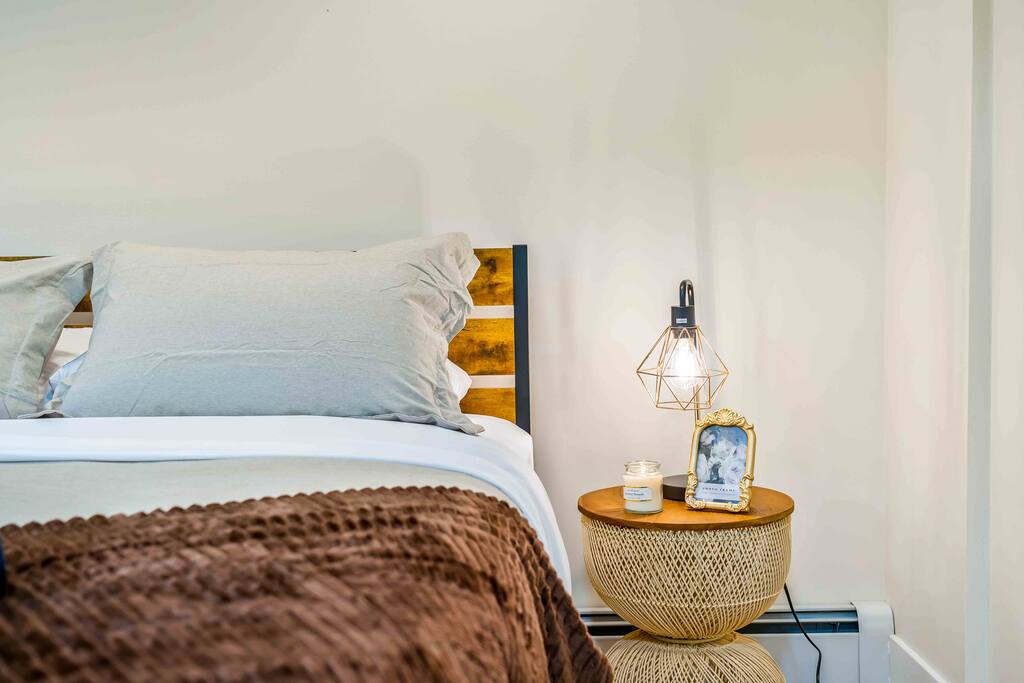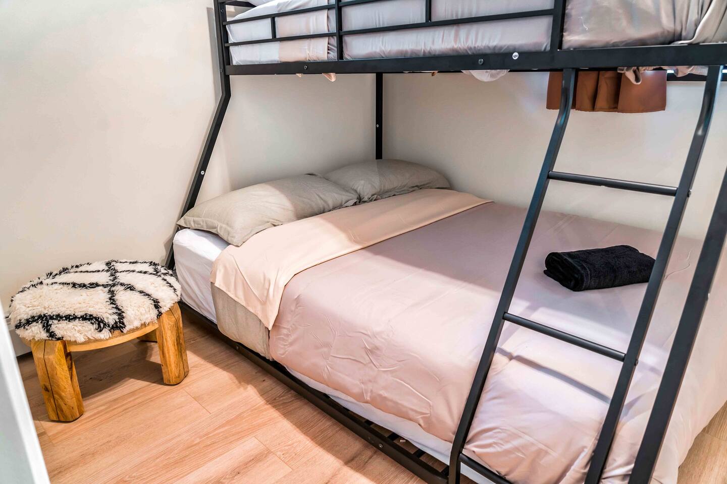 Step inside this split-level Pocono retreat and feel right at home. A central staircase connects both levels. Upper level (main living): Step up to an open-concept rustic-meets-modern space. Straight ahead is a spacious kitchen with an island; to the left are the dining and living areas (pellet stove) and sliding doors that lead to a deck with BBQ and gas-fire-pit seating. To the right of the stairs is the primary bedroom (queen bed, smart TV, closet) with private access to the upstairs bathroom — a luxurious space with a freestanding soaking tub and a separate shower. That bathroom is also accessible from the common area via the door by the kitchen. Lower level (fully detailed): Walk down the stairs to a long hallway that organizes the sleeping and service spaces — everything down here is easy to find and laid out for privacy and convenience. • Bedroom A (first door on the left): Bunk room with a twin/single over a full bed (twin on top, full on bottom) plus a closet — great for kids or extra guests. (Twin = 1 person, Full = 2 people.) • Bedroom B (next door): Queen bed and a closet — cozy and private. • Owner’s closet (small door between bedrooms): Locked and not accessible to guests. • Bedroom C (next door): Queen bed with a spacious closet — quiet and comfortable. • Downstairs bathroom (end of the hallway): Full bathroom with a shower — serves the lower-level bedrooms. • Laundry / Utility (door next to the downstairs bathroom): Guest-accessible utility room with washer and dryer for your convenience. • Second locked utility/owner’s closet (adjacent to laundry): Locked and not accessible to guests. This layout gives you three bedrooms downstairs (two queens + bunk room) plus the upstairs primary — total sleeping for 9 guests (queen upstairs = 2, two queens downstairs = 4, bunk = 3). Backyard & extras: Beyond the deck, the backyard is a complete entertainment zone: a real wood fire pit with half-moon wooden bench seating and two swings, a wood-burning hot tub (jets + LED lights), a wood-burning sauna, and a woodshed. We provide unlimited access to our wood supply for a $25 convenience fee. There’s also another shed that’s currently locked but will soon be a game room. Comfort & climate: The main open-concept area and every bedroom have split units for heating and cooling so everyone can stay comfortable year-round.