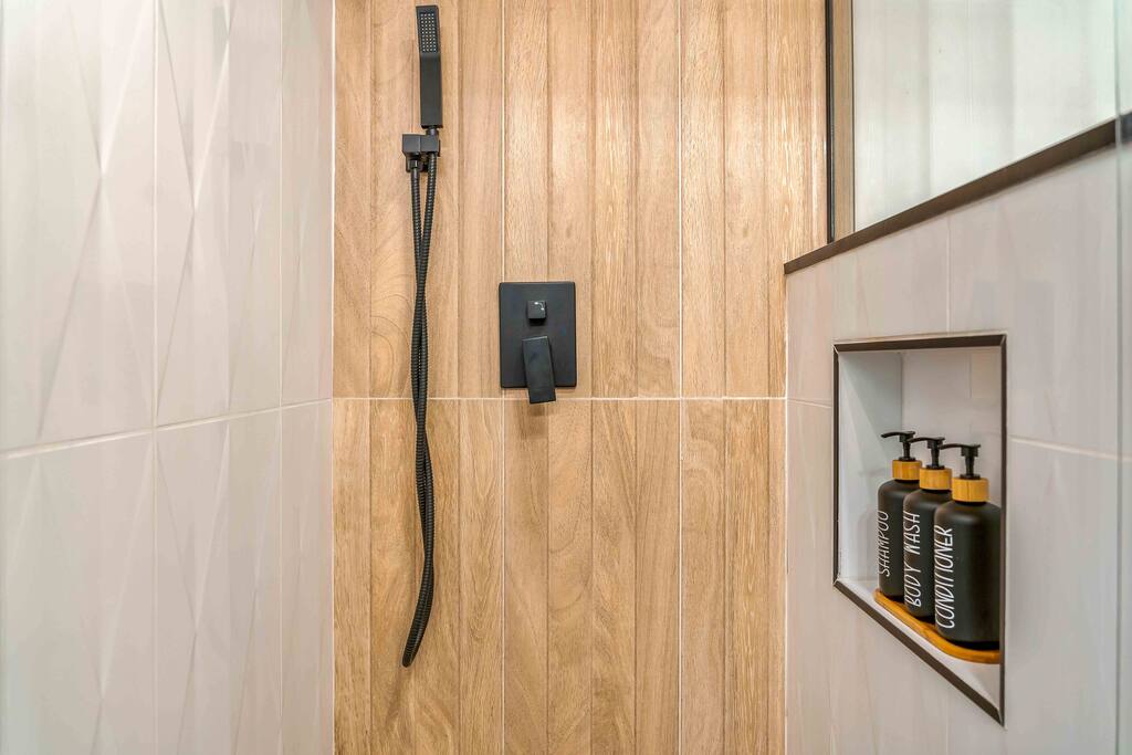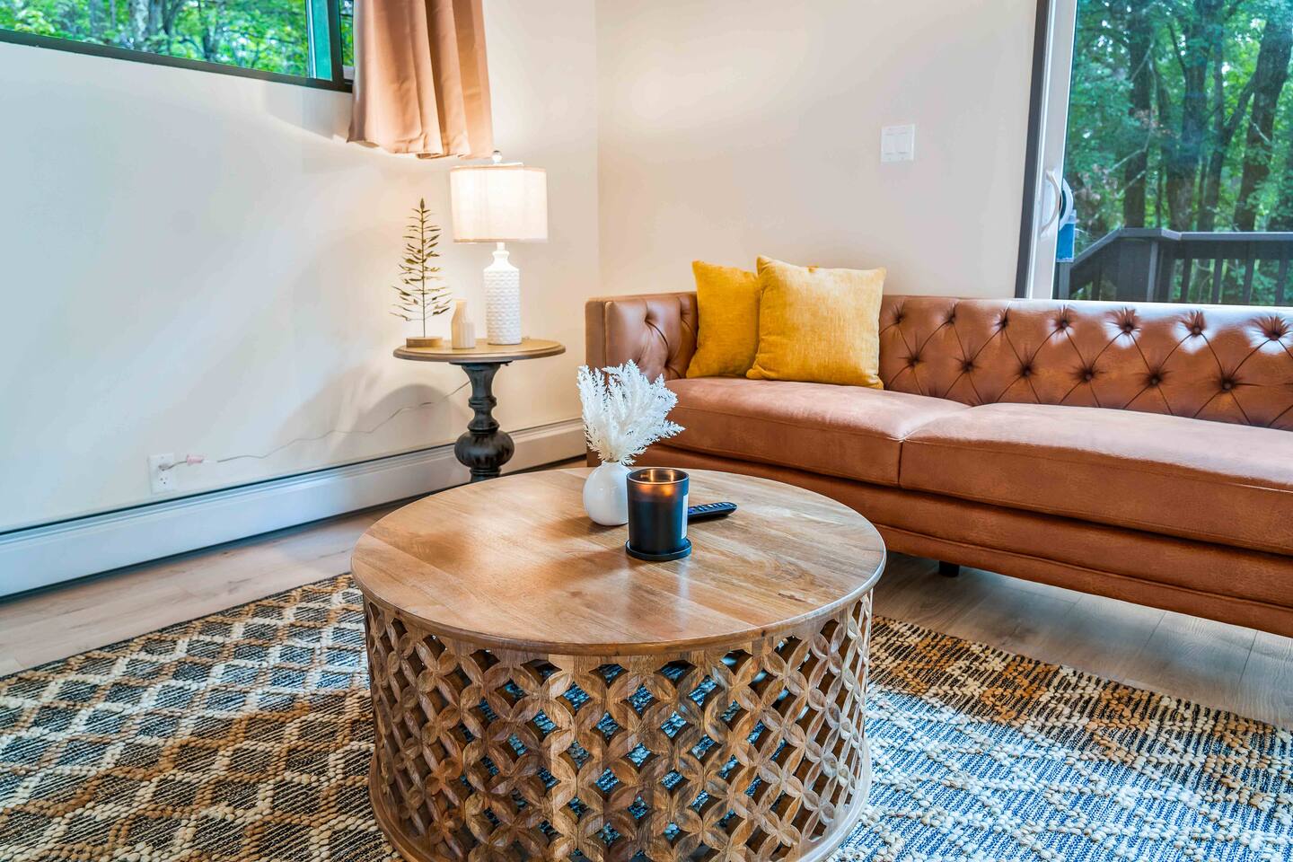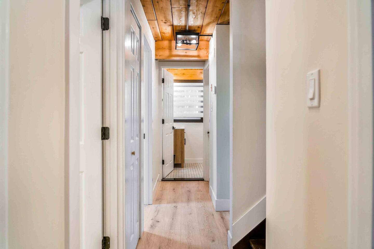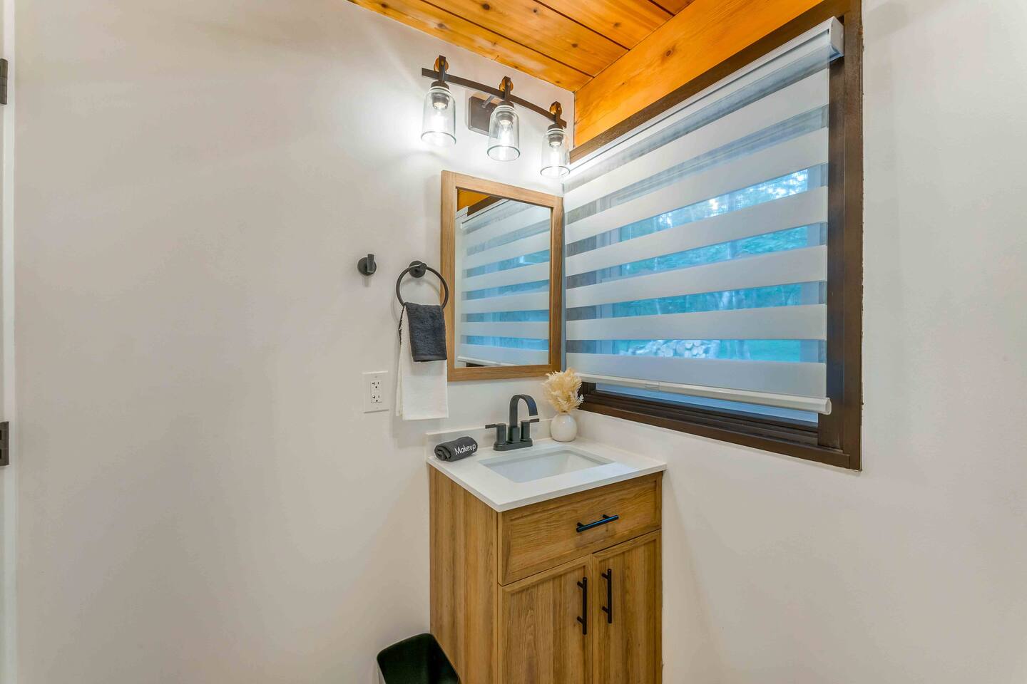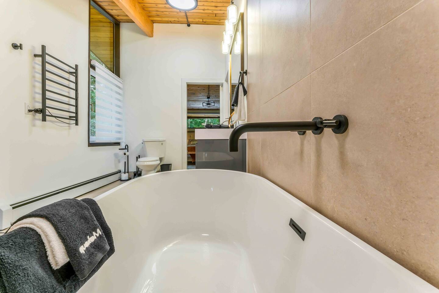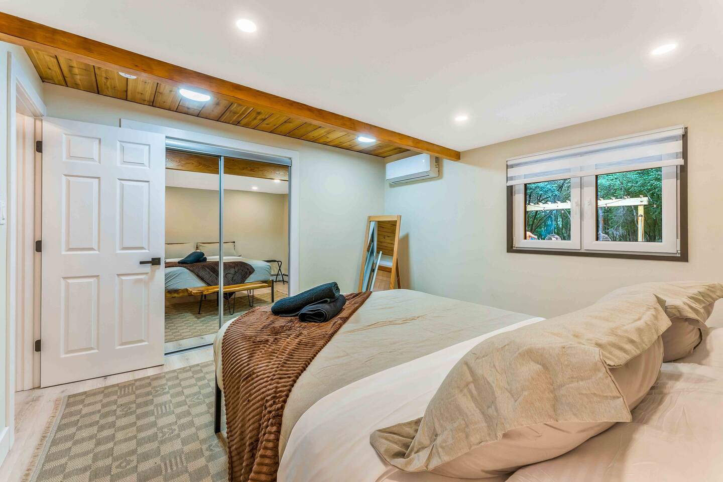 Step inside this split-level Pocono retreat and feel right at home. A central staircase connects both levels. Upper level (main living): Step up to an open-concept rustic-meets-modern space. Straight ahead is a spacious kitchen with an island; to the left are the dining and living areas (pellet stove) and sliding doors that lead to a deck with BBQ and gas-fire-pit seating. To the right of the stairs is the primary bedroom (queen bed, smart TV, closet) with private access to the upstairs bathroom — a luxurious space with a freestanding soaking tub and a separate shower. That bathroom is also accessible from the common area via the door by the kitchen. Lower level (fully detailed): Walk down the stairs to a long hallway that organizes the sleeping and service spaces — everything down here is easy to find and laid out for privacy and convenience. • Bedroom A (first door on the left): Bunk room with a twin/single over a full bed (twin on top, full on bottom) plus a closet — great for kids or extra guests. (Twin = 1 person, Full = 2 people.) • Bedroom B (next door): Queen bed and a closet — cozy and private. • Owner’s closet (small door between bedrooms): Locked and not accessible to guests. • Bedroom C (next door): Queen bed with a spacious closet — quiet and comfortable. • Downstairs bathroom (end of the hallway): Full bathroom with a shower — serves the lower-level bedrooms. • Laundry / Utility (door next to the downstairs bathroom): Guest-accessible utility room with washer and dryer for your convenience. • Second locked utility/owner’s closet (adjacent to laundry): Locked and not accessible to guests. This layout gives you three bedrooms downstairs (two queens + bunk room) plus the upstairs primary — total sleeping for 9 guests (queen upstairs = 2, two queens downstairs = 4, bunk = 3). Backyard & extras: Beyond the deck, the backyard is a complete entertainment zone: a real wood fire pit with half-moon wooden bench seating and two swings, a wood-burning hot tub (jets + LED lights), a wood-burning sauna, and a woodshed. We provide unlimited access to our wood supply for a $25 convenience fee. There’s also another shed that’s currently locked but will soon be a game room. Comfort & climate: The main open-concept area and every bedroom have split units for heating and cooling so everyone can stay comfortable year-round.