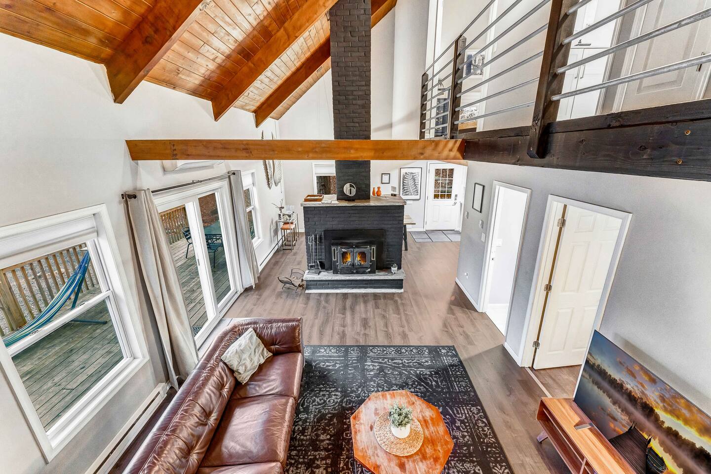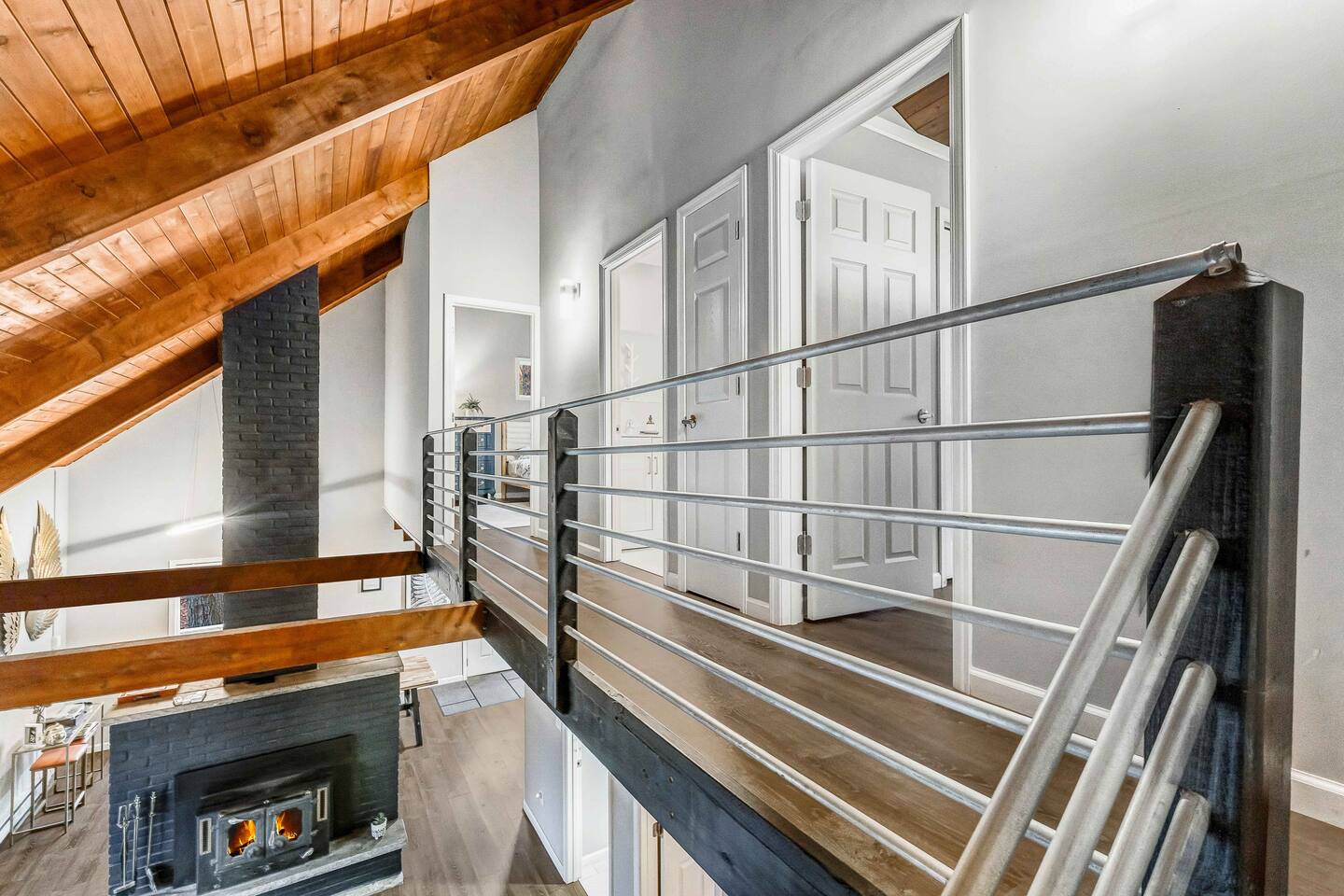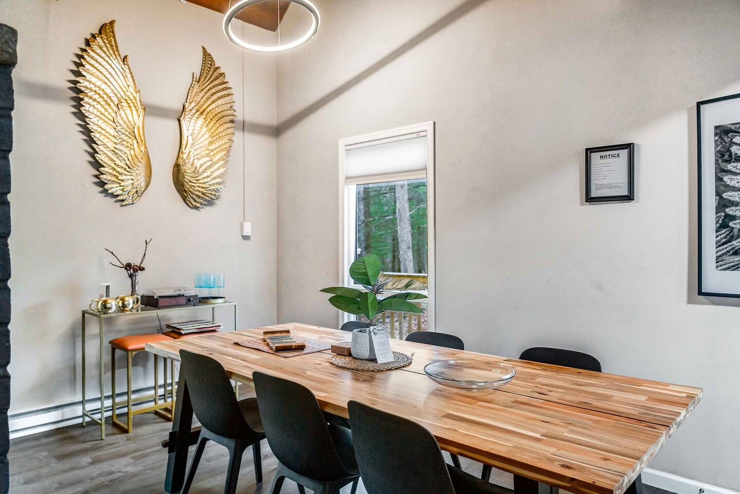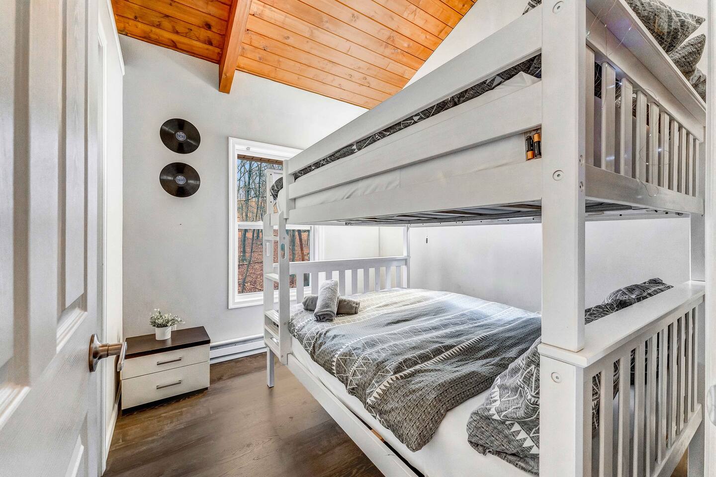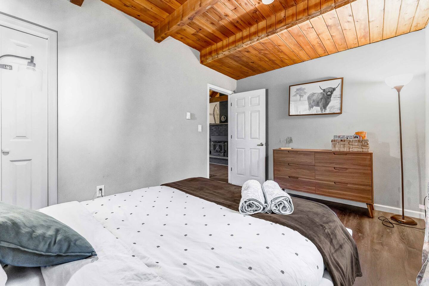 Welcome to our beautiful and spacious home, perfect for a relaxing getaway with family or friends. Nestled in a serene neighborhood, this property combines modern amenities with cozy charm for an unforgettable stay. Main Level: You’ll access the house through a side entrance, where you'll walk into an open-concept layout of the kitchen and dining room. The kitchen is fully equipped for all your cooking needs, and the dining area is perfect for enjoying meals together. As you continue through the space, you’ll step into the inviting living room, featuring high ceilings that open up to the second floor. The room is centered around a cozy wood-burning fireplace, and the comfortable sitting area is equipped with a TV for your entertainment. From here, you can access the first-level bedroom with a queen-sized bed & a dresser for your belongings. You will also find there a locked owners closet that guests unfortunately do not have access to. The main level also includes a full bathroom with a shower. Second Floor: Up the stairs, you’ll find the second bedroom on your right, featuring a full-over-full bunk bed and a closet for your storage needs. Just down the hallway, you’ll find another small closet that is locked for the owners' use only. Next, a second full bathroom awaits, complete with a spacious shower. Continuing down the hall, the third bedroom is the largest, offering ample space, a dresser, and a closet for your comfort. Deck & Outdoor Amenities: Step outside the sliding door in the main level living room onto the front deck, where you’ll find a cozy sitting area with a gas fireplace, an outdoor heater to keep you warm on cooler evenings, a hammock for relaxation, a dining table for outdoor meals, and a BBQ for grilling. Please note, the outdoor cushions and hammock hanging material will be stored in the outdoor storage box next to the deck. Heading down the deck stairs to the side of the property, you'll discover even more outdoor amenities, including a wood-burning hot tub that fits up to 6 people, an outdoor TV, a fire pit, a swing, and a wood shed for your convenience. Parking: There is spacious parking available right in front of the property, making it easy to come and go. Whether you're looking to relax in comfort, enjoy the outdoors, or explore the area, this home offers everything you need for a memorable stay. We can't wait to welcome you!