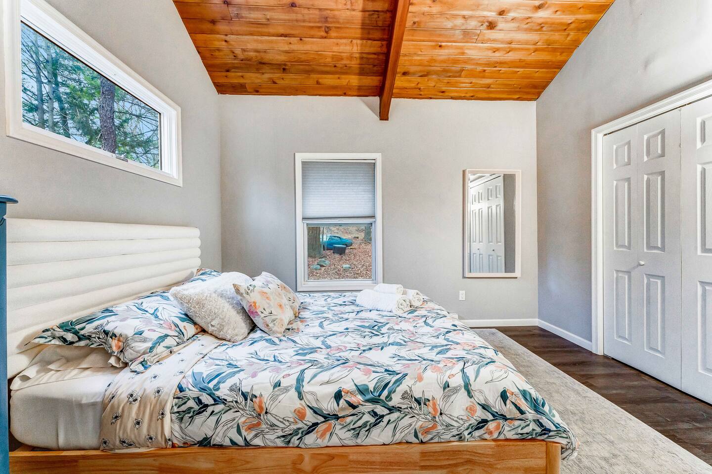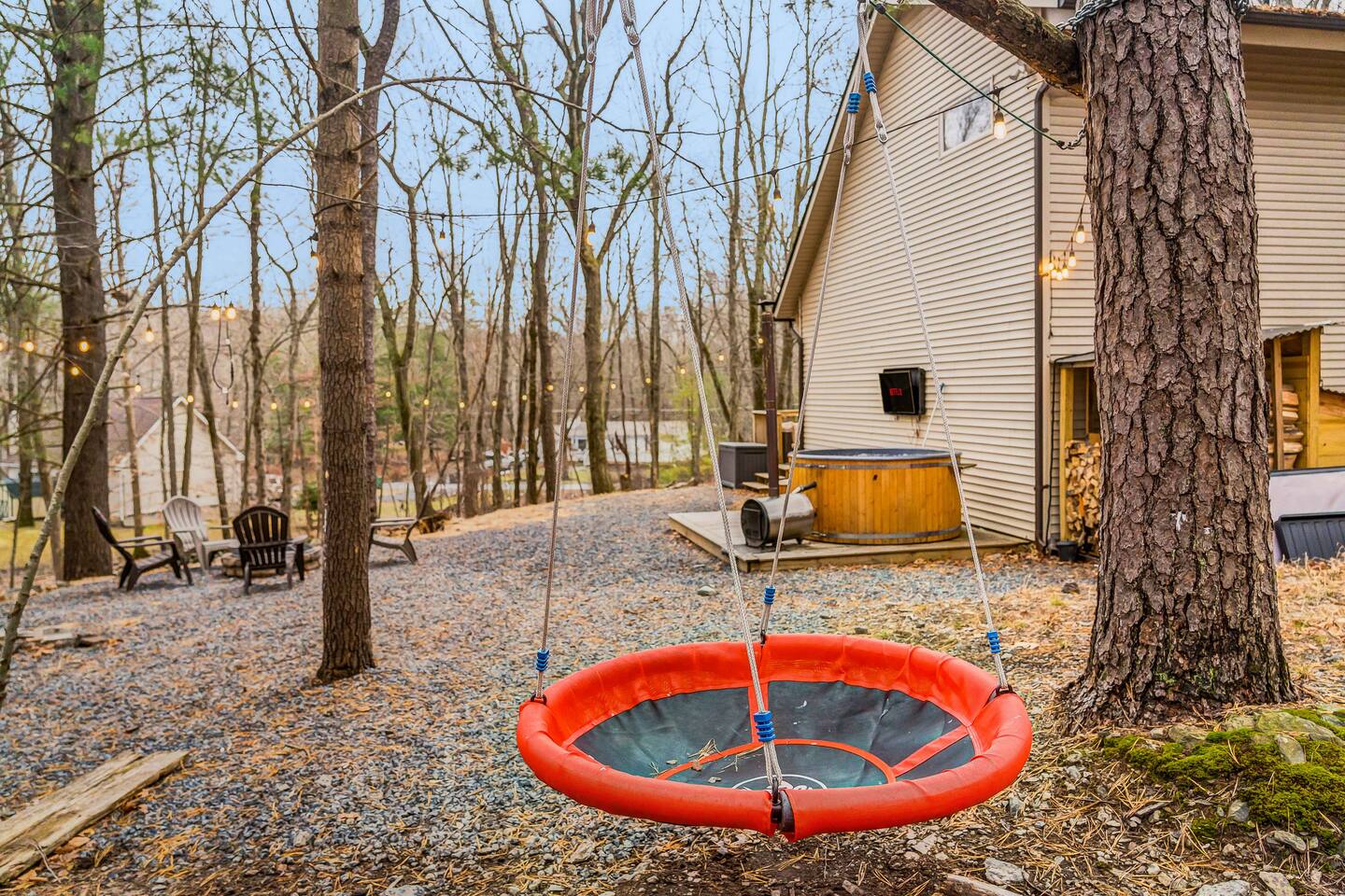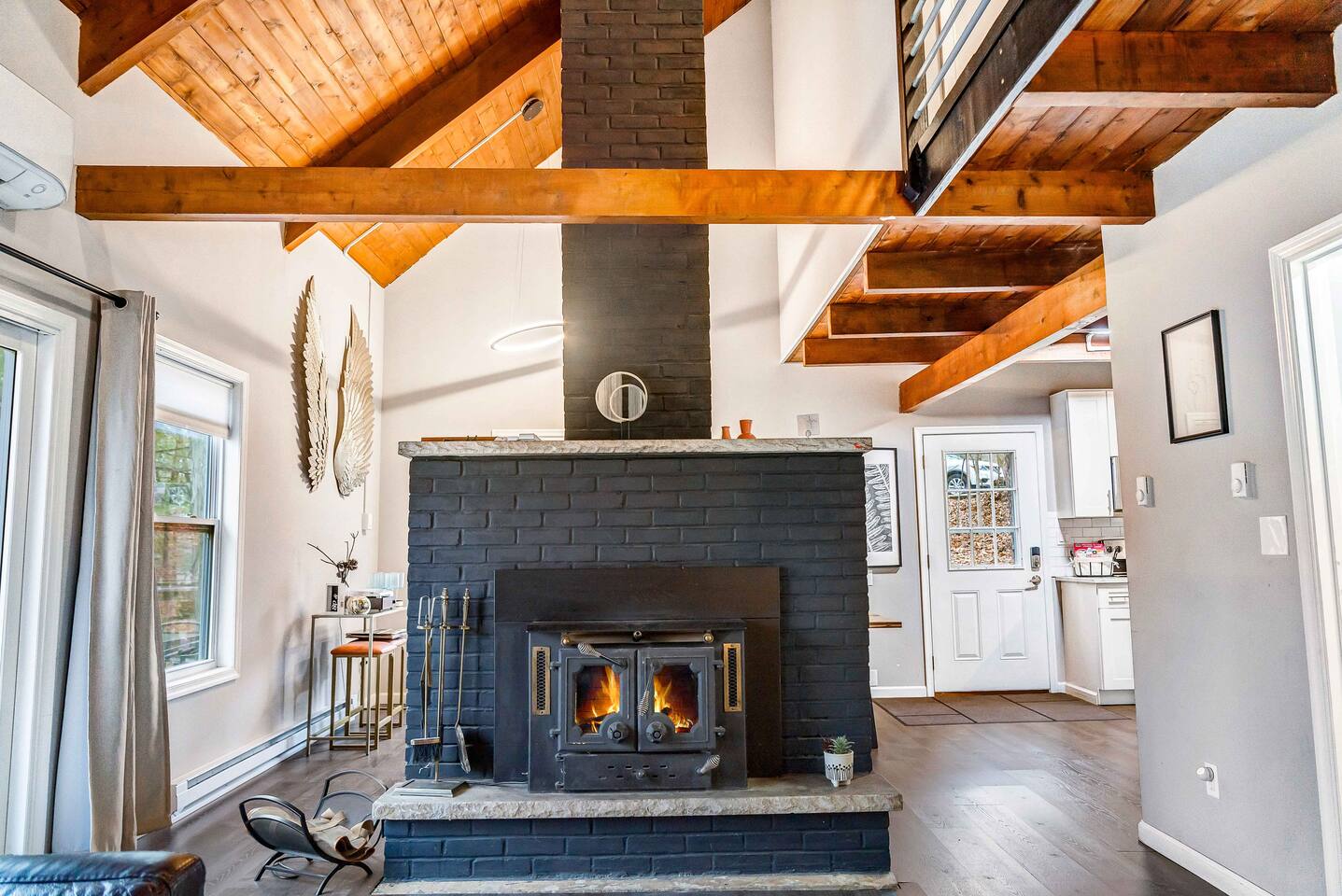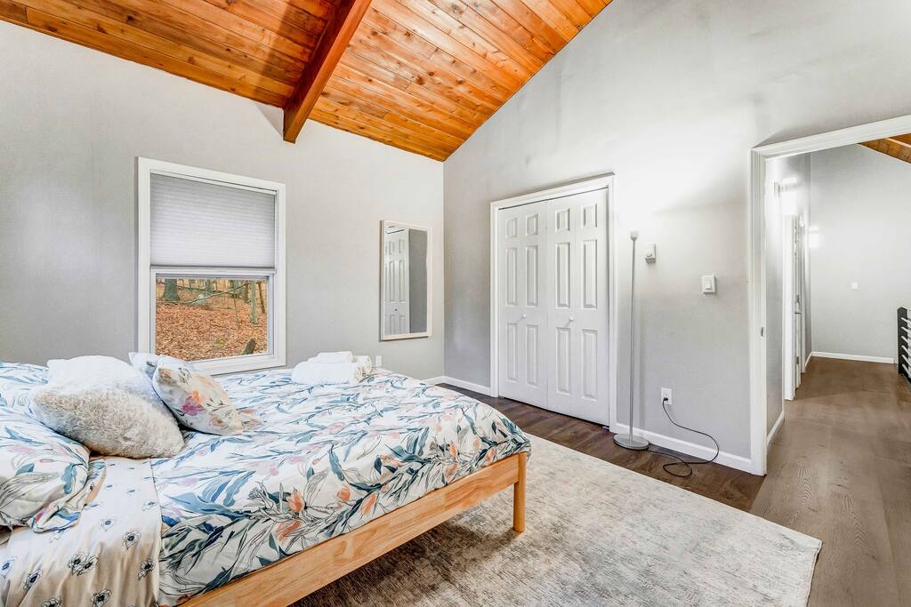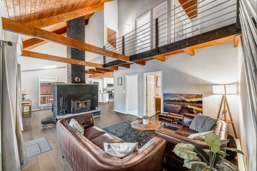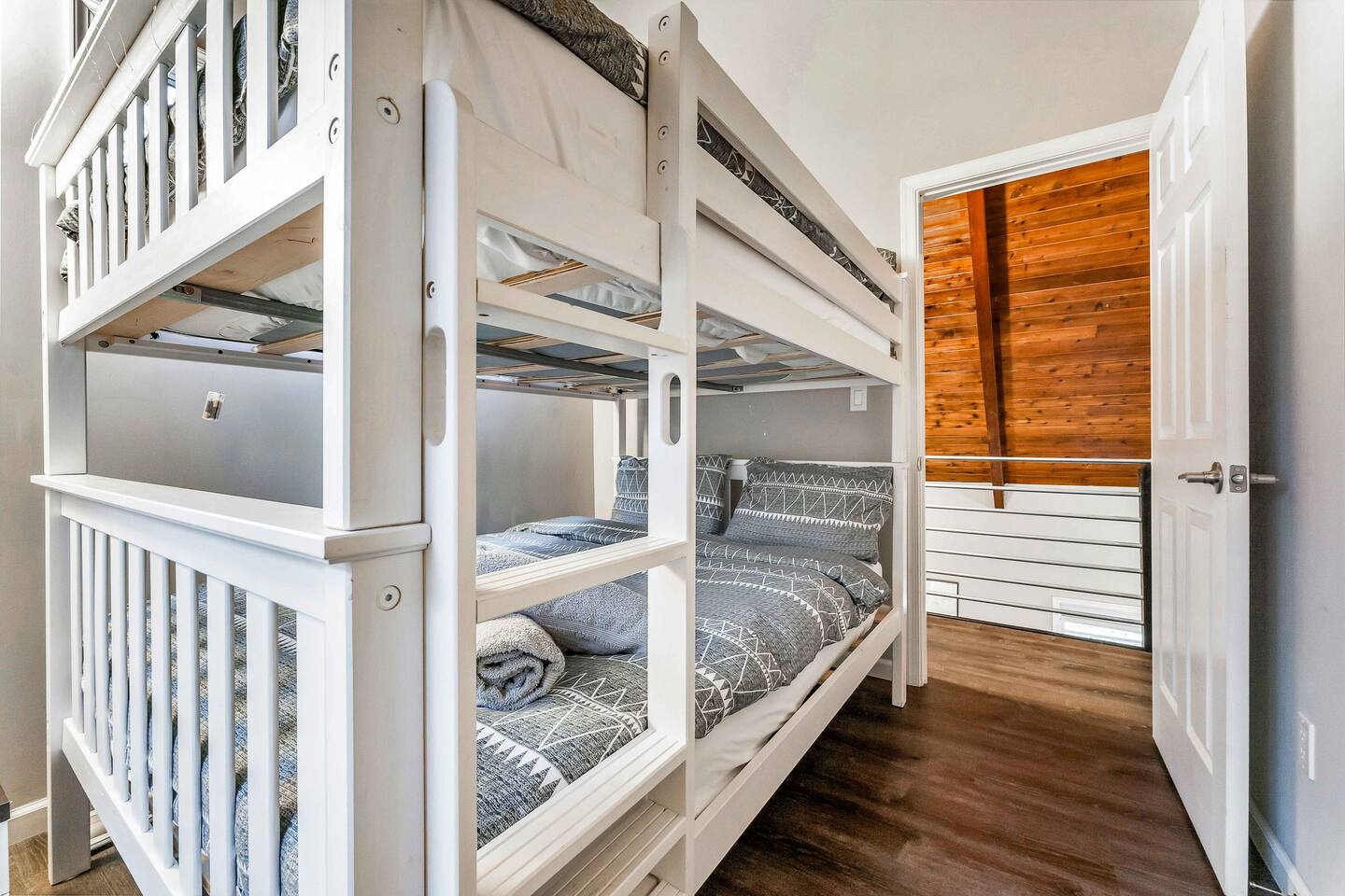 Welcome to our beautiful and spacious home, perfect for a relaxing getaway with family or friends. Nestled in a serene neighborhood, this property combines modern amenities with cozy charm for an unforgettable stay. Main Level: You’ll access the house through a side entrance, where you'll walk into an open-concept layout of the kitchen and dining room. The kitchen is fully equipped for all your cooking needs, and the dining area is perfect for enjoying meals together. As you continue through the space, you’ll step into the inviting living room, featuring high ceilings that open up to the second floor. The room is centered around a cozy wood-burning fireplace, and the comfortable sitting area is equipped with a TV for your entertainment. From here, you can access the first-level bedroom with a queen-sized bed & a dresser for your belongings. You will also find there a locked owners closet that guests unfortunately do not have access to. The main level also includes a full bathroom with a shower. Second Floor: Up the stairs, you’ll find the second bedroom on your right, featuring a full-over-full bunk bed and a closet for your storage needs. Just down the hallway, you’ll find another small closet that is locked for the owners' use only. Next, a second full bathroom awaits, complete with a spacious shower. Continuing down the hall, the third bedroom is the largest, offering ample space, a dresser, and a closet for your comfort. Deck & Outdoor Amenities: Step outside the sliding door in the main level living room onto the front deck, where you’ll find a cozy sitting area with a gas fireplace, an outdoor heater to keep you warm on cooler evenings, a hammock for relaxation, a dining table for outdoor meals, and a BBQ for grilling. Please note, the outdoor cushions and hammock hanging material will be stored in the outdoor storage box next to the deck. Heading down the deck stairs to the side of the property, you'll discover even more outdoor amenities, including a wood-burning hot tub that fits up to 6 people, an outdoor TV, a fire pit, a swing, and a wood shed for your convenience. Parking: There is spacious parking available right in front of the property, making it easy to come and go. Whether you're looking to relax in comfort, enjoy the outdoors, or explore the area, this home offers everything you need for a memorable stay. We can't wait to welcome you!