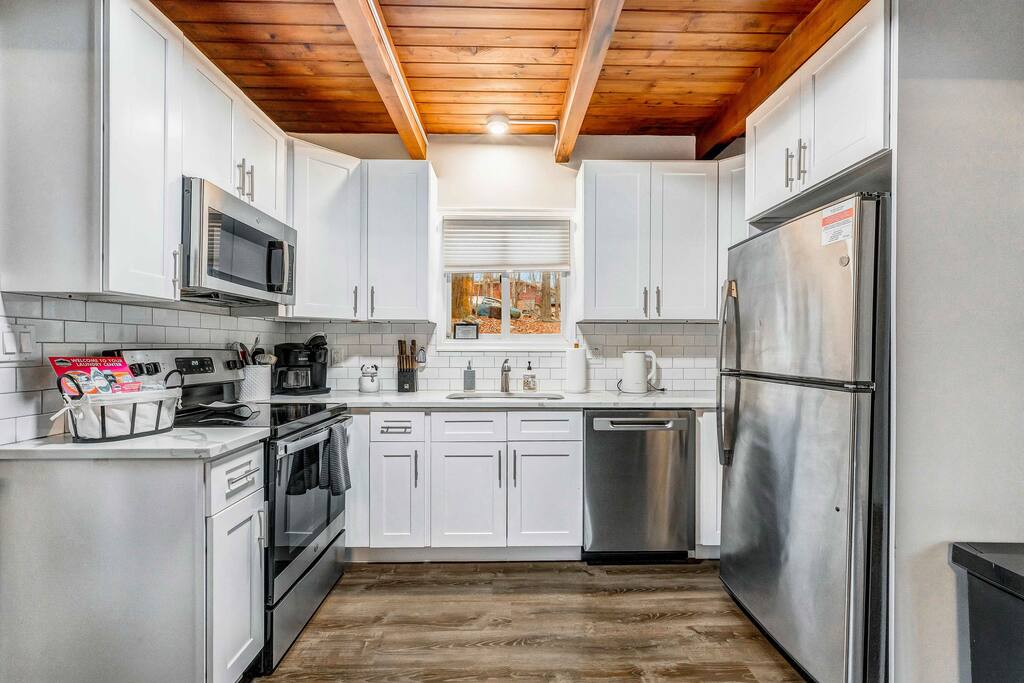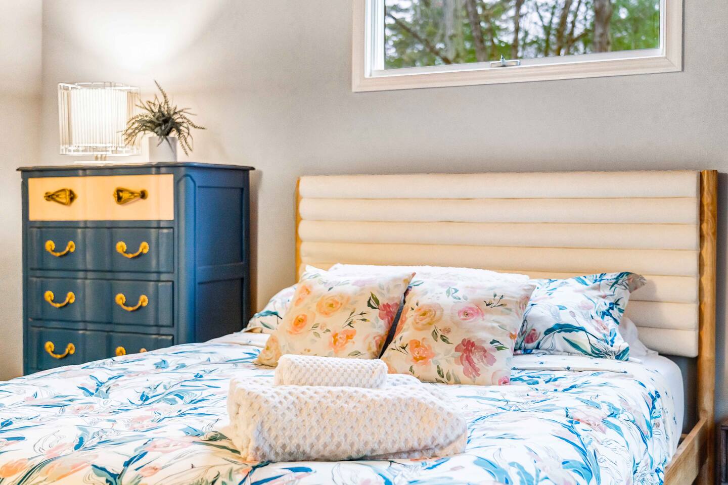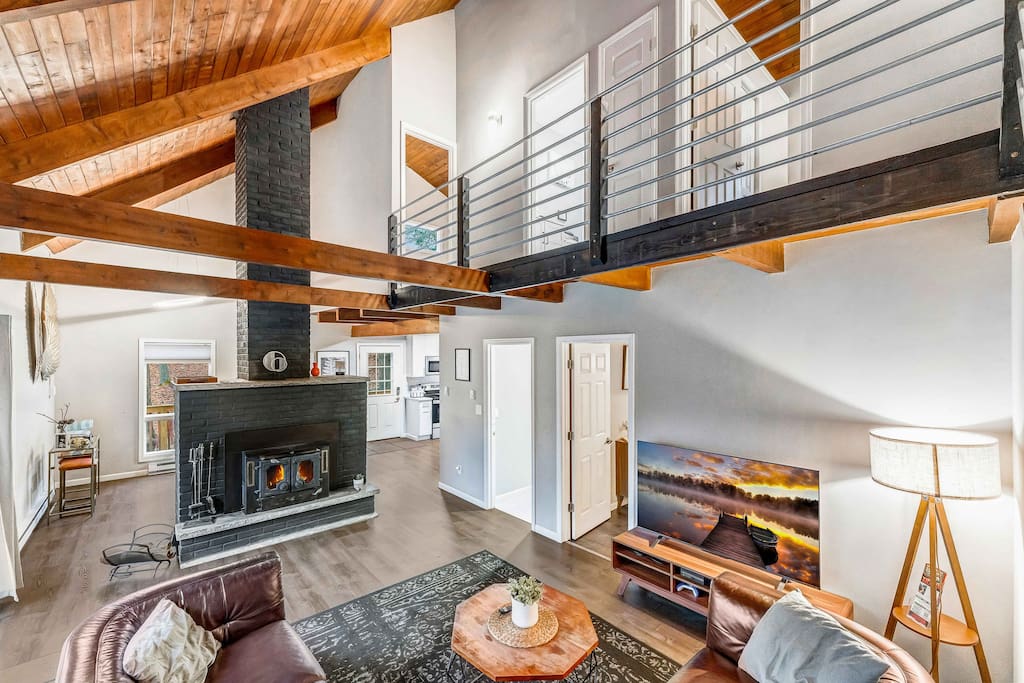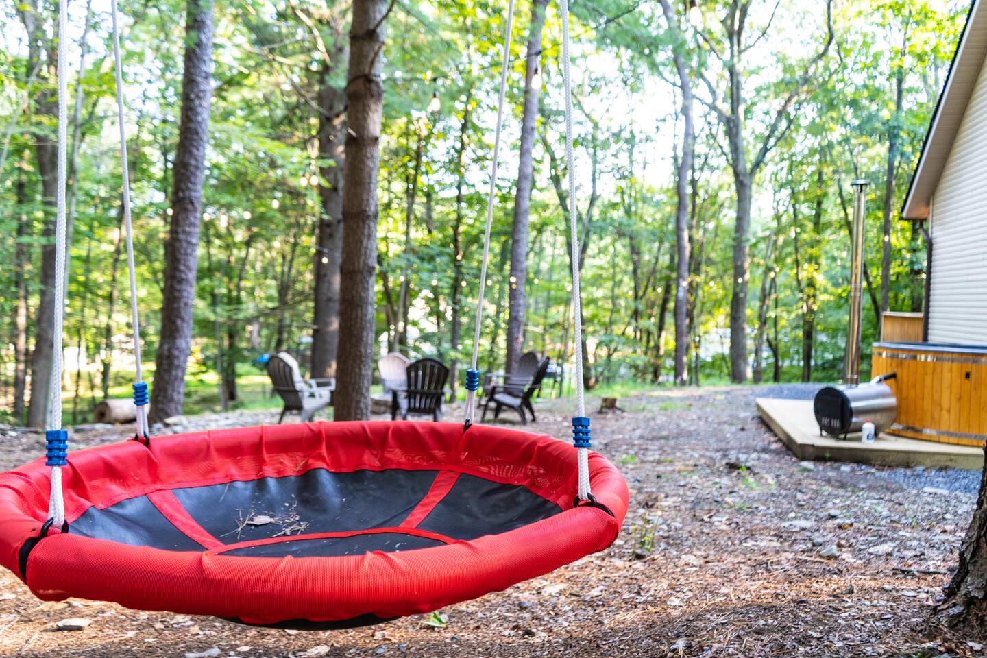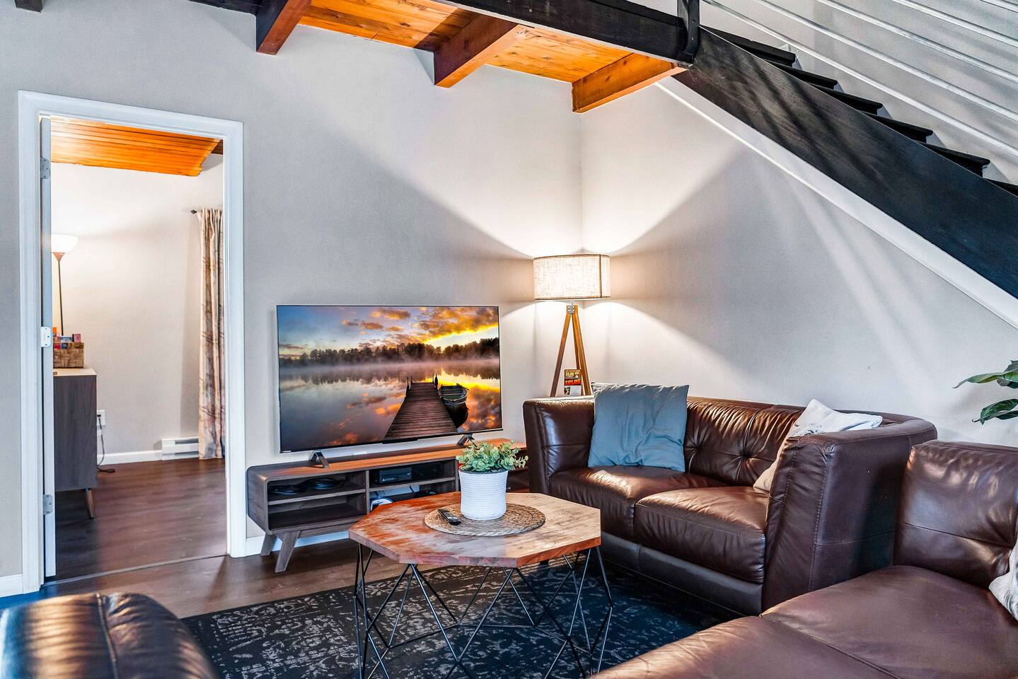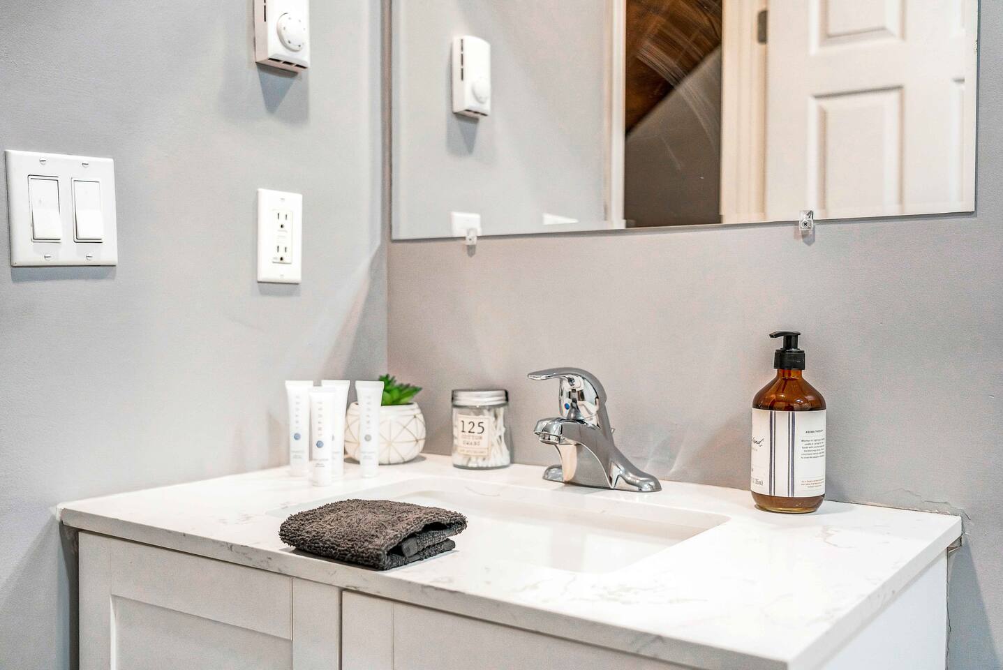 Welcome to our beautiful and spacious home, perfect for a relaxing getaway with family or friends. Nestled in a serene neighborhood, this property combines modern amenities with cozy charm for an unforgettable stay. Main Level: You’ll access the house through a side entrance, where you'll walk into an open-concept layout of the kitchen and dining room. The kitchen is fully equipped for all your cooking needs, and the dining area is perfect for enjoying meals together. As you continue through the space, you’ll step into the inviting living room, featuring high ceilings that open up to the second floor. The room is centered around a cozy wood-burning fireplace, and the comfortable sitting area is equipped with a TV for your entertainment. From here, you can access the first-level bedroom with a queen-sized bed & a dresser for your belongings. You will also find there a locked owners closet that guests unfortunately do not have access to. The main level also includes a full bathroom with a shower. Second Floor: Up the stairs, you’ll find the second bedroom on your right, featuring a full-over-full bunk bed and a closet for your storage needs. Just down the hallway, you’ll find another small closet that is locked for the owners' use only. Next, a second full bathroom awaits, complete with a spacious shower. Continuing down the hall, the third bedroom is the largest, offering ample space, a dresser, and a closet for your comfort. Deck & Outdoor Amenities: Step outside the sliding door in the main level living room onto the front deck, where you’ll find a cozy sitting area with a gas fireplace, an outdoor heater to keep you warm on cooler evenings, a hammock for relaxation, a dining table for outdoor meals, and a BBQ for grilling. Please note, the outdoor cushions and hammock hanging material will be stored in the outdoor storage box next to the deck. Heading down the deck stairs to the side of the property, you'll discover even more outdoor amenities, including a wood-burning hot tub that fits up to 6 people, an outdoor TV, a fire pit, a swing, and a wood shed for your convenience. Parking: There is spacious parking available right in front of the property, making it easy to come and go. Whether you're looking to relax in comfort, enjoy the outdoors, or explore the area, this home offers everything you need for a memorable stay. We can't wait to welcome you!