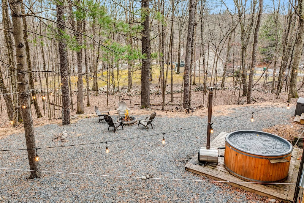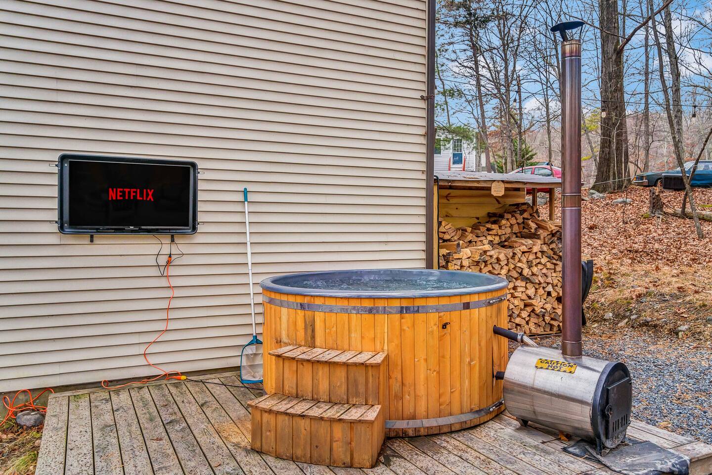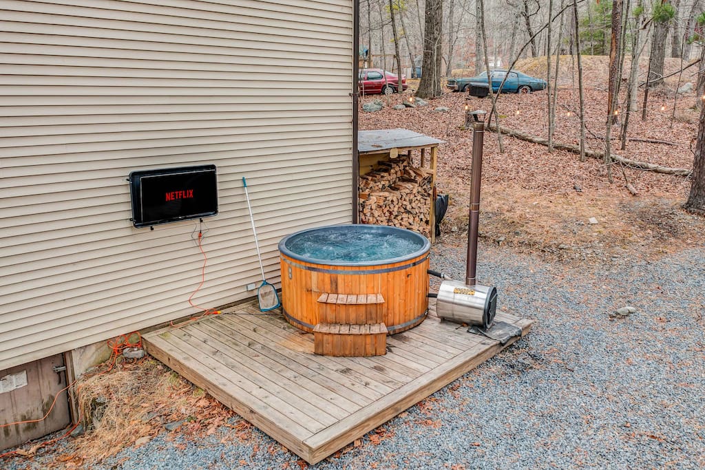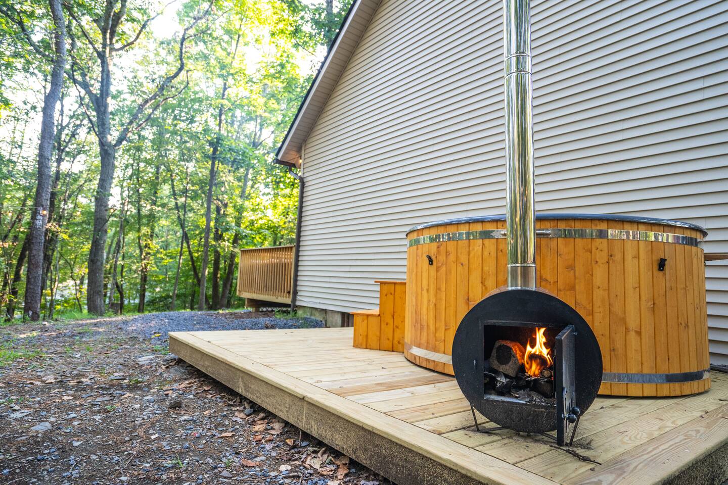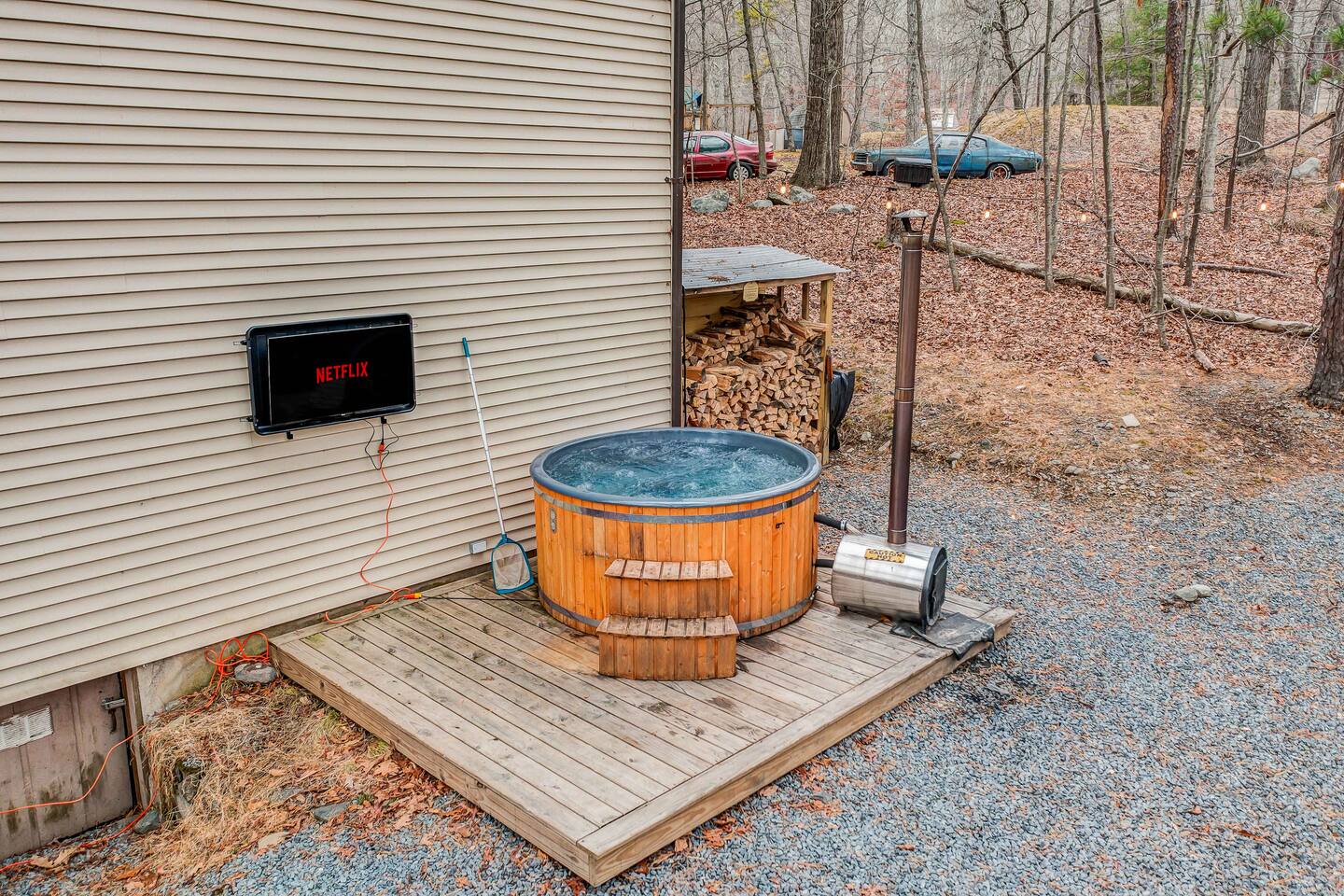 True nature escape with a wood burning hot tub, outdoor TV, fireplace & all the essentials you need for your Getaway escape! Hi-speed WiFi making it the perfect space to work from home. Great Location, only 10min drive from Shawnee Mountain & Bushkill Falls. The Cabin is suited for 8 people with 3 bedrooms. Open floor plan that connects the Kitchen, dining room and living space highlighted by a beautiful fireplace.Imagine yourself relaxing with your closest admiring nature's breathtaking views!