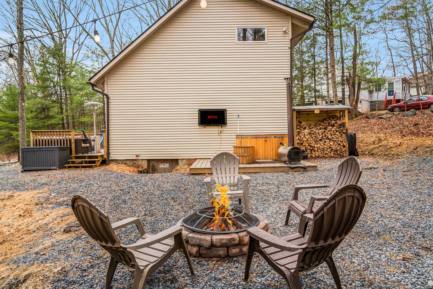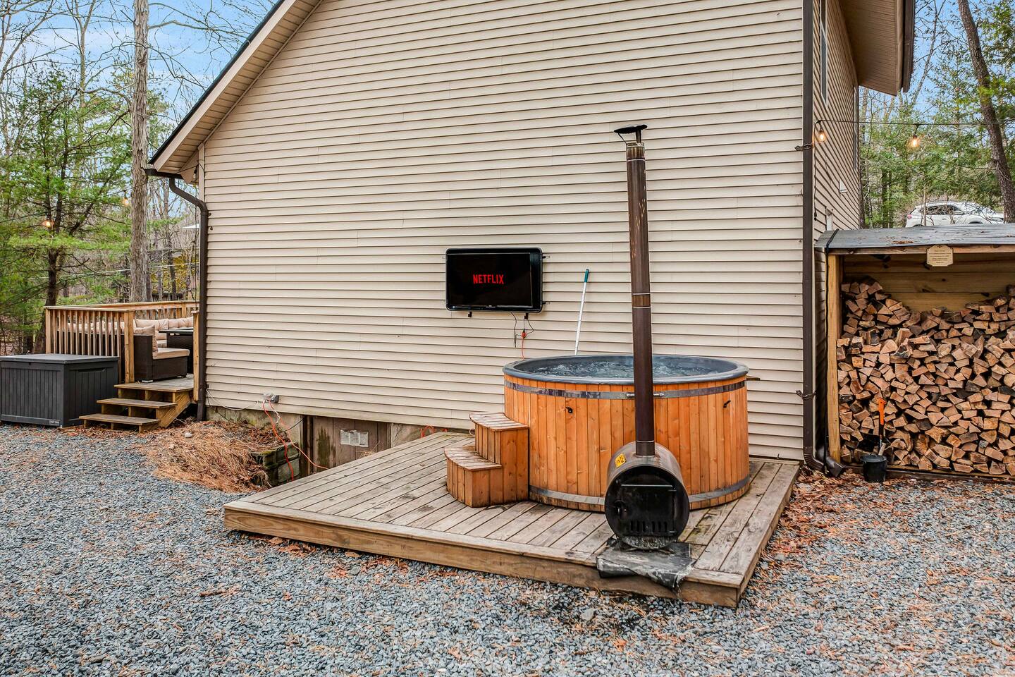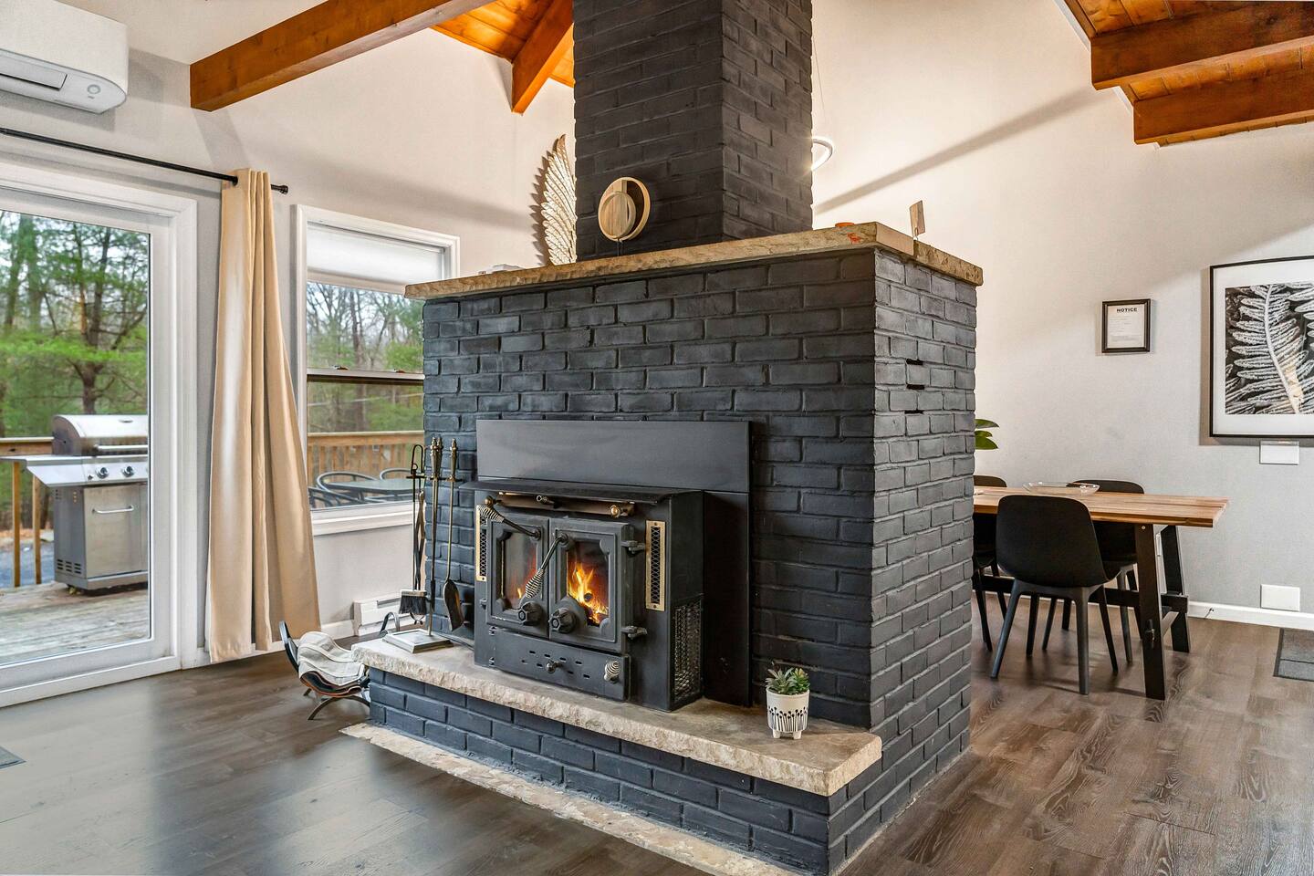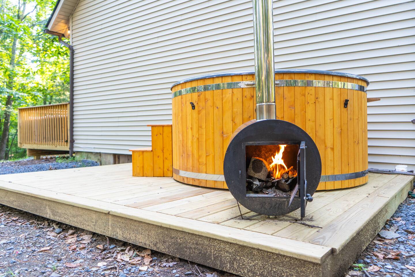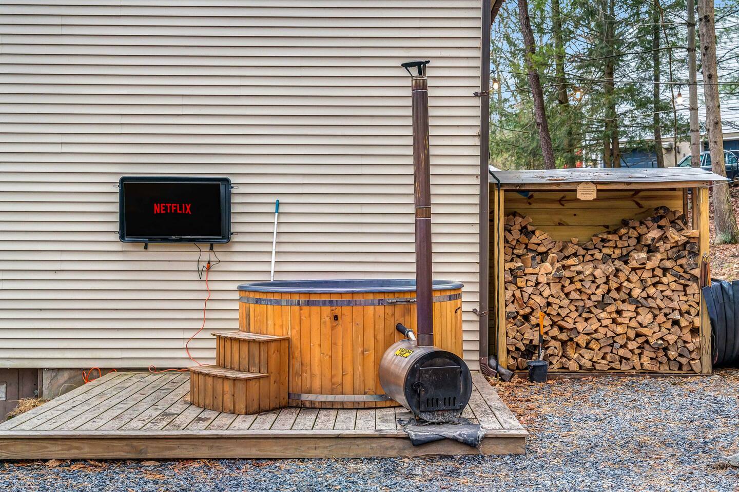 True nature escape with a wood burning hot tub, outdoor TV, fireplace & all the essentials you need for your Getaway escape! Hi-speed WiFi making it the perfect space to work from home. Great Location, only 10min drive from Shawnee Mountain & Bushkill Falls. The Cabin is suited for 8 people with 3 bedrooms. Open floor plan that connects the Kitchen, dining room and living space highlighted by a beautiful fireplace.Imagine yourself relaxing with your closest admiring nature's breathtaking views!