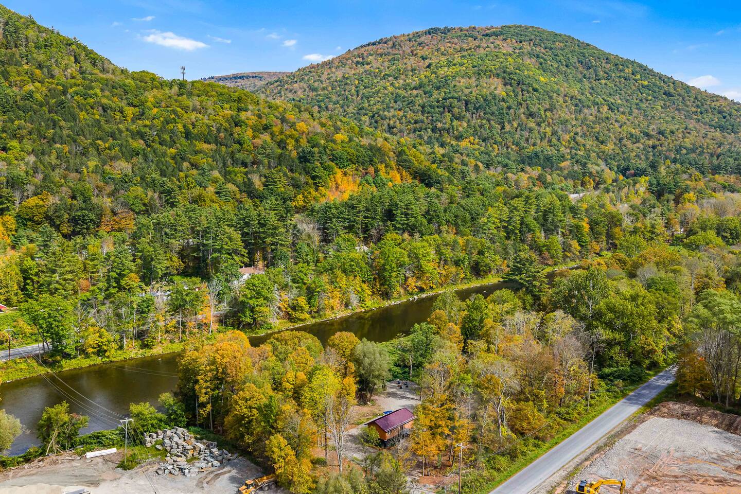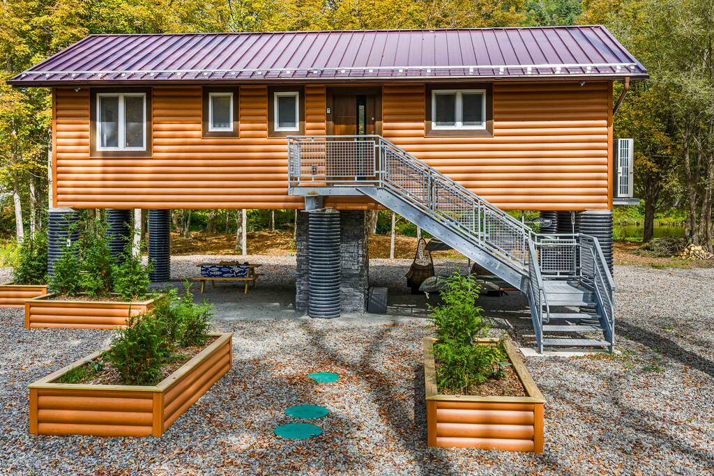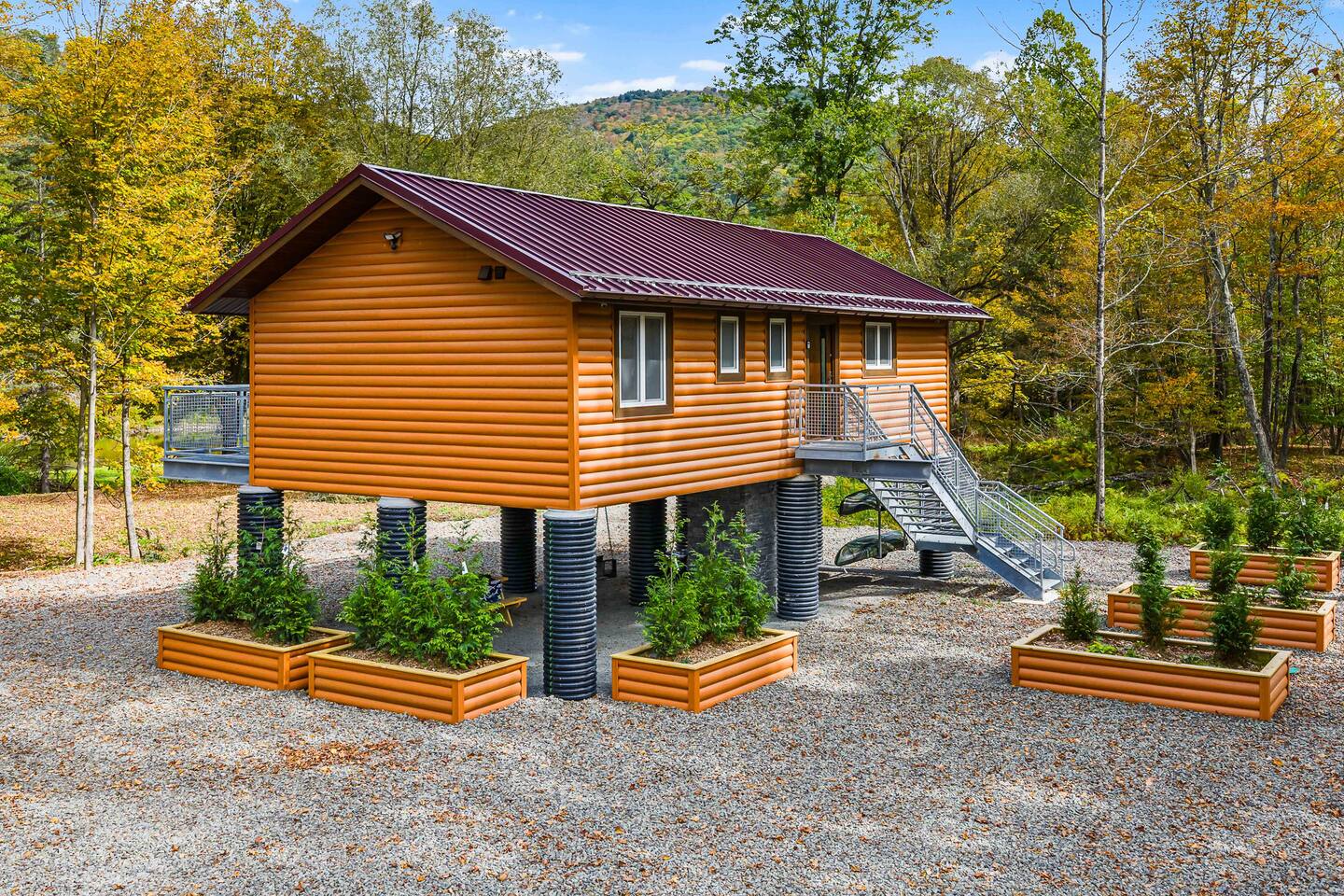 Charming Log Cabin on Beaver Kill River in the Catskills - a haven for fishing or relaxing in nature. Newly built 2 BD, 1 Bath retreat with rustic charm & modern comfort. Cozy living room with electric fireplace & smart TV, fully equipped kitchen, and balcony with BBQ. Under the house, a covered lounge with a swing, dining area, and kayaks (available to use with with signed disclosure). In the yard, enjoy a fire pit, decorative fireplace, and direct river access with serene seating by the water.