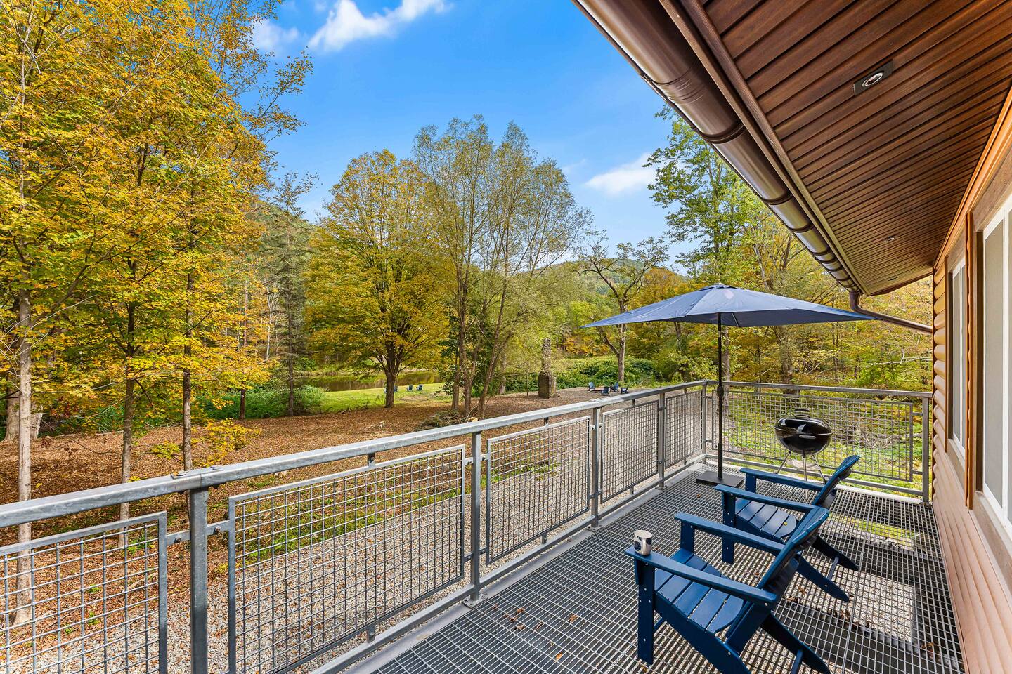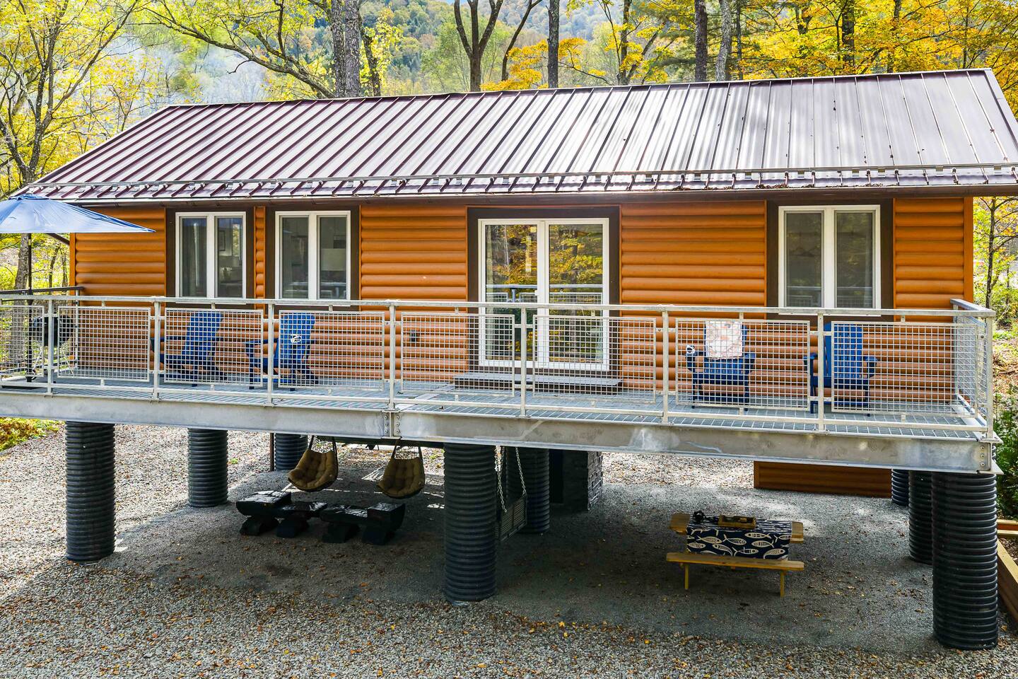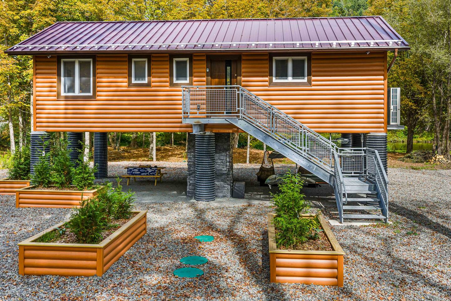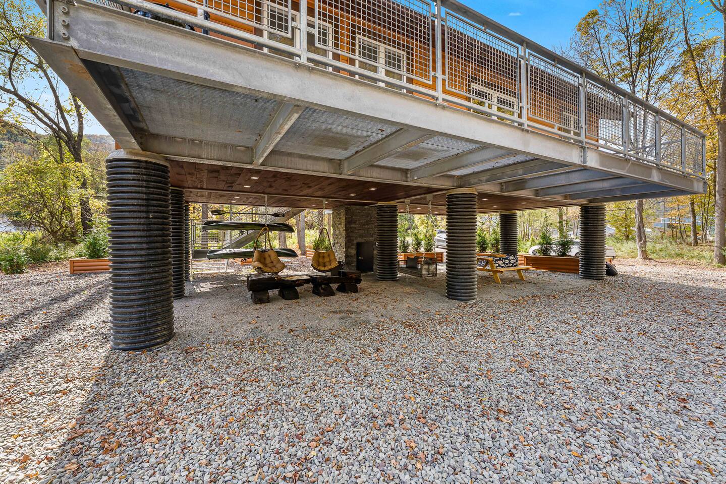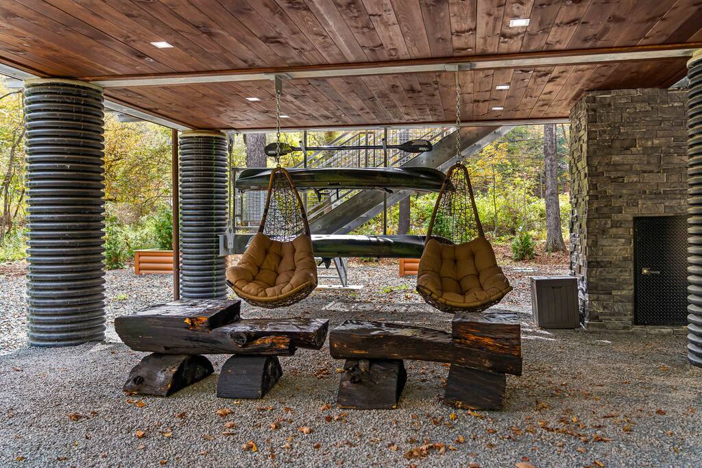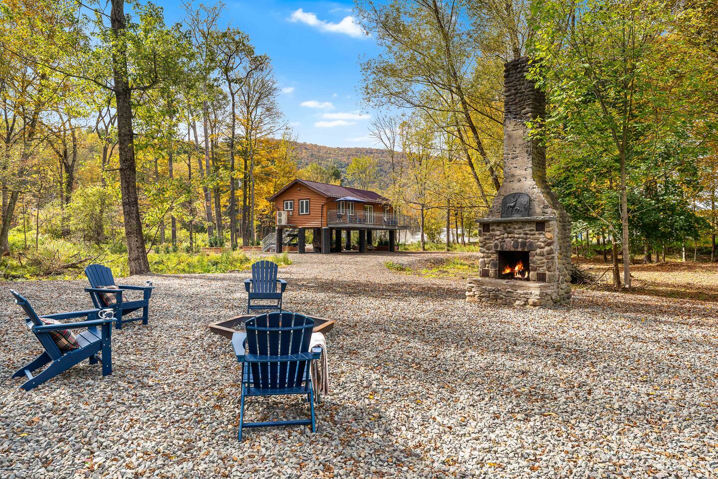 MAIN LEVEL LAYOUT: As you walk in, you’ll be greeted by an open-concept space. The kitchen is to your right, while two closets are on your left — the first is open for guest use, and the second is a locked owner’s closet. Continuing forward, you’ll find the living and dining area. The right side features a cozy living room with a couch, coffee table, Smart TV, and an electric fireplace. On the left, a sliding door leads to the balcony, and a dining table with seating for four completes the space. On the further left side of the main level, there are two bedrooms and one full bathroom: Right bedroom: Full-size bed Left bedroom: Queen bed The bathroom, located next to the queen bedroom, includes a shower. BALCONY: Accessible from the living room area, the balcony offers Adirondack chairs and a charcoal grill, perfect for outdoor dining or relaxing. UNDER THE HOUSE AREA: A great place to unwind — featuring outdoor swings with a coffee table, two kayaks available for use (with signed waiver), an outdoor dining table, and another charcoal grill. BACKYARD: Enjoy the fire pit area with a decorative fireplace (for display only — no fires permitted inside it). From here, you’ll have direct access to the Beaver Kill, perfect for relaxing by the water or casting a line.
