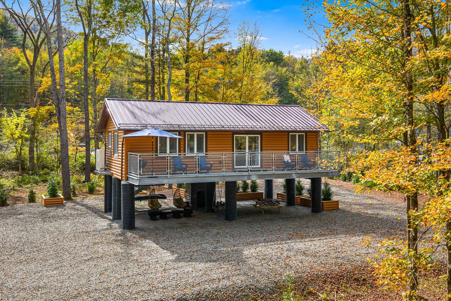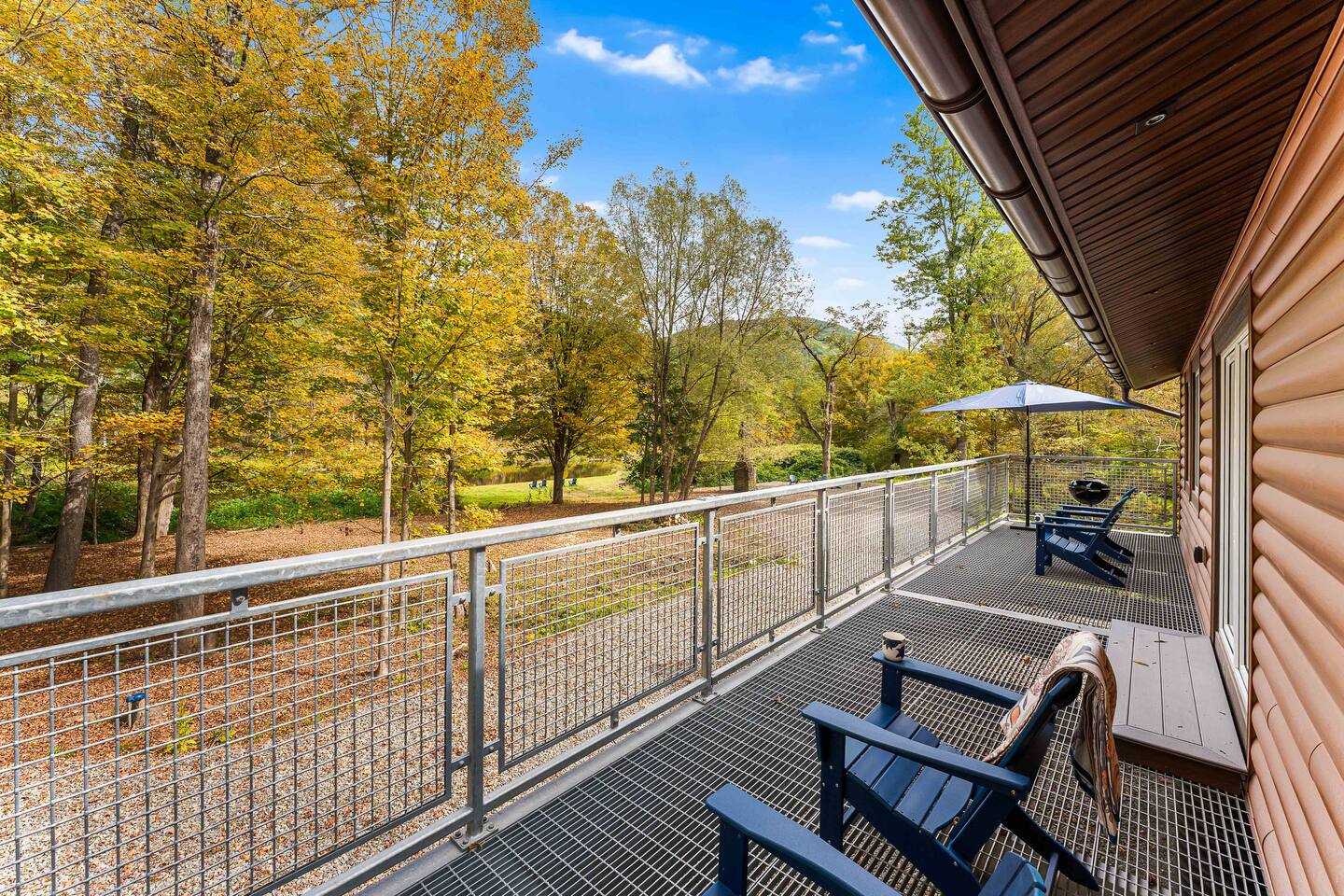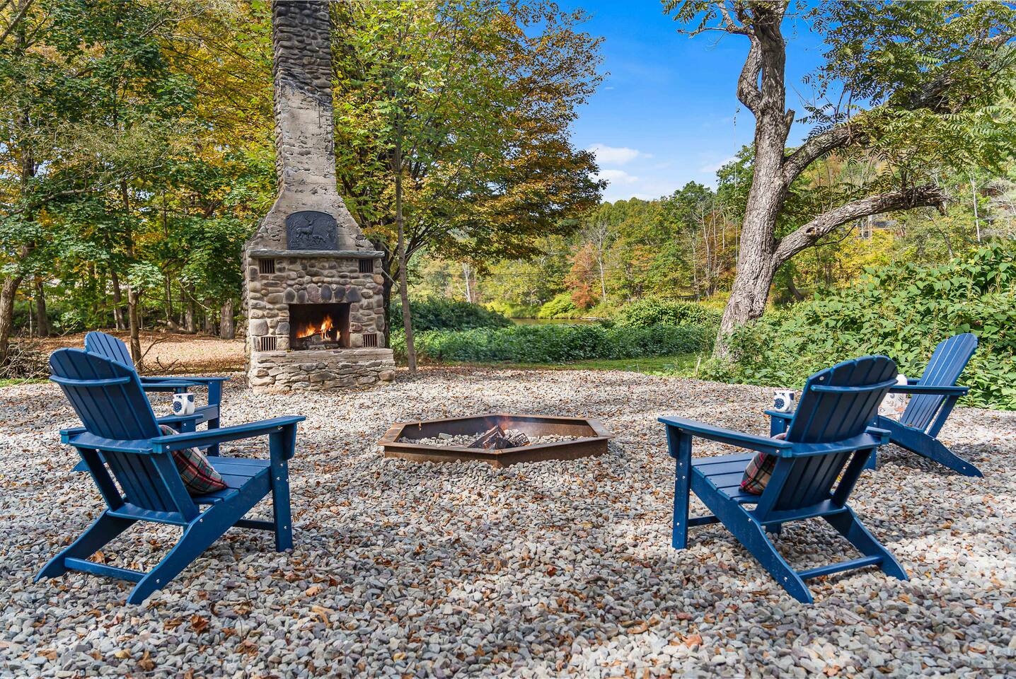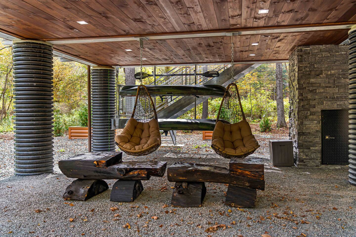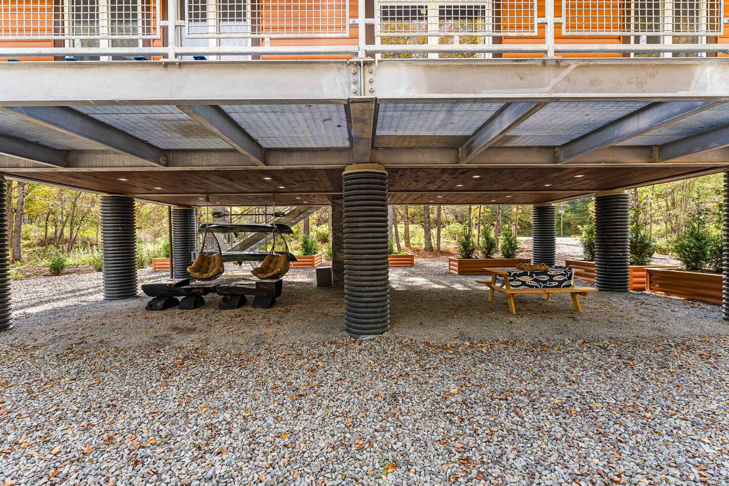 MAIN LEVEL LAYOUT: As you walk in, you’ll be greeted by an open-concept space. The kitchen is to your right, while two closets are on your left — the first is open for guest use, and the second is a locked owner’s closet. Continuing forward, you’ll find the living and dining area. The right side features a cozy living room with a couch, coffee table, Smart TV, and an electric fireplace. On the left, a sliding door leads to the balcony, and a dining table with seating for four completes the space. On the further left side of the main level, there are two bedrooms and one full bathroom: Right bedroom: Full-size bed Left bedroom: Queen bed The bathroom, located next to the queen bedroom, includes a shower. BALCONY: Accessible from the living room area, the balcony offers Adirondack chairs and a charcoal grill, perfect for outdoor dining or relaxing. UNDER THE HOUSE AREA: A great place to unwind — featuring outdoor swings with a coffee table, two kayaks available for use (with signed waiver), an outdoor dining table, and another charcoal grill. BACKYARD: Enjoy the fire pit area with a decorative fireplace (for display only — no fires permitted inside it). From here, you’ll have direct access to the Beaver Kill, perfect for relaxing by the water or casting a line.