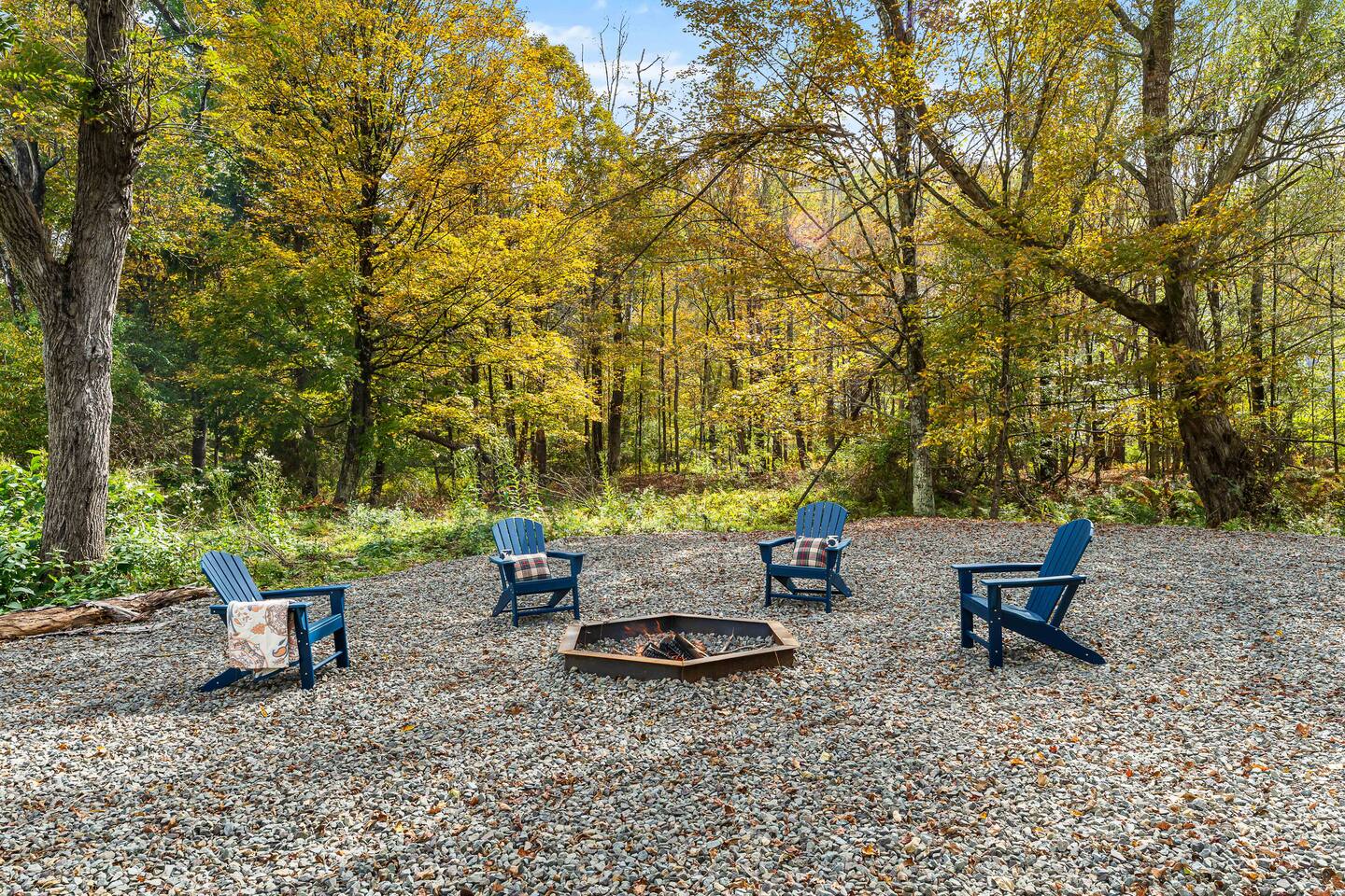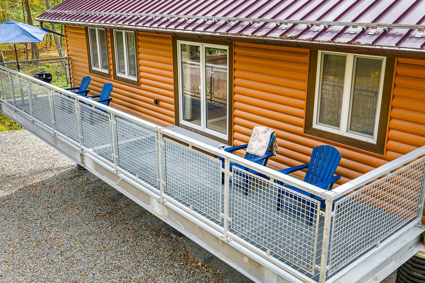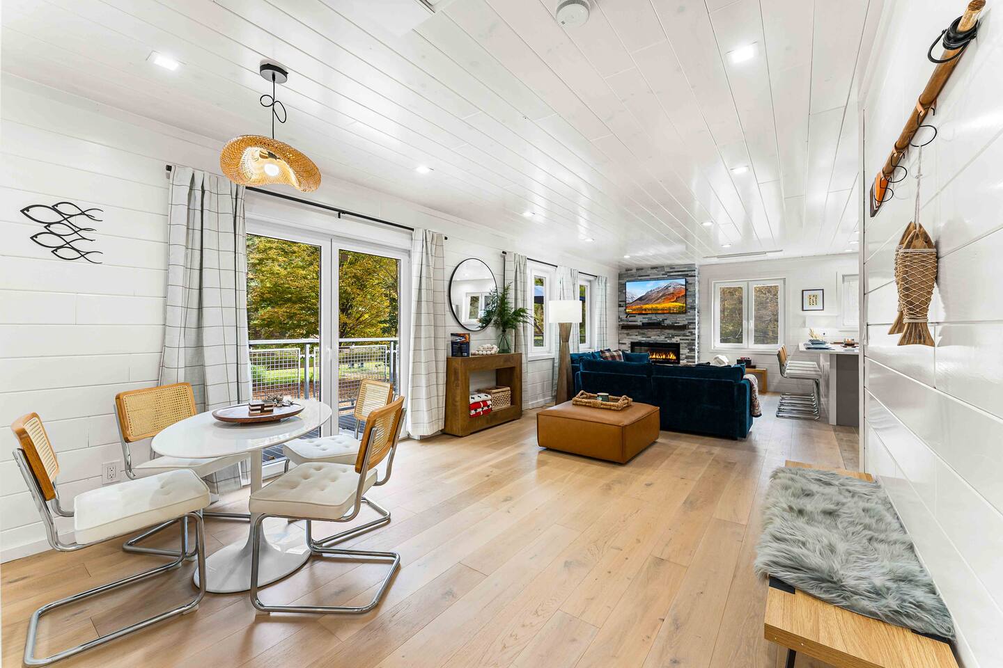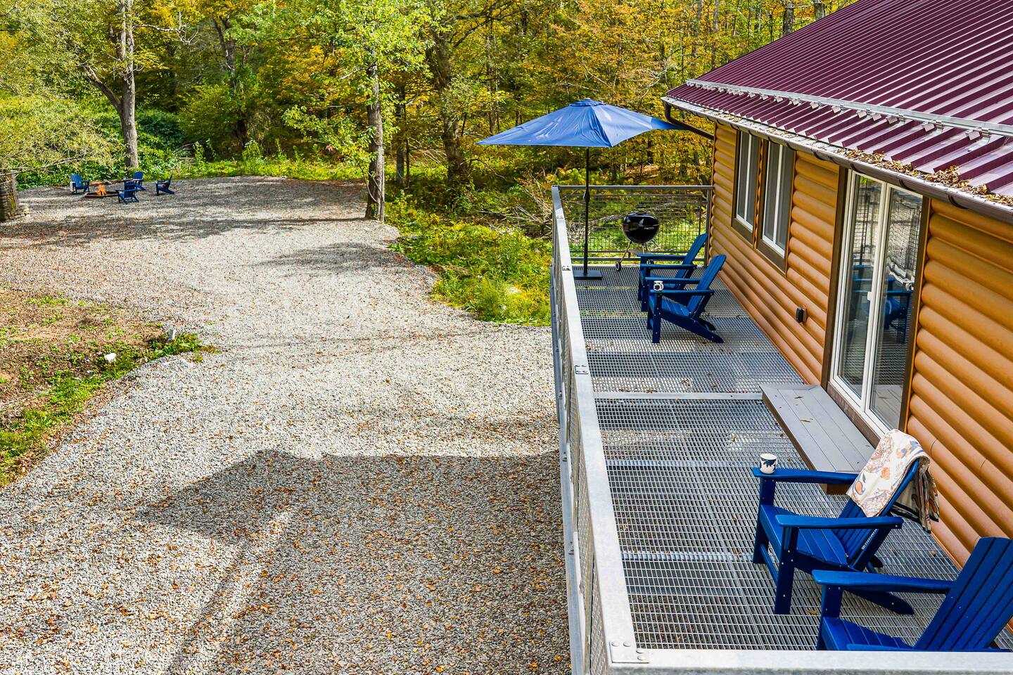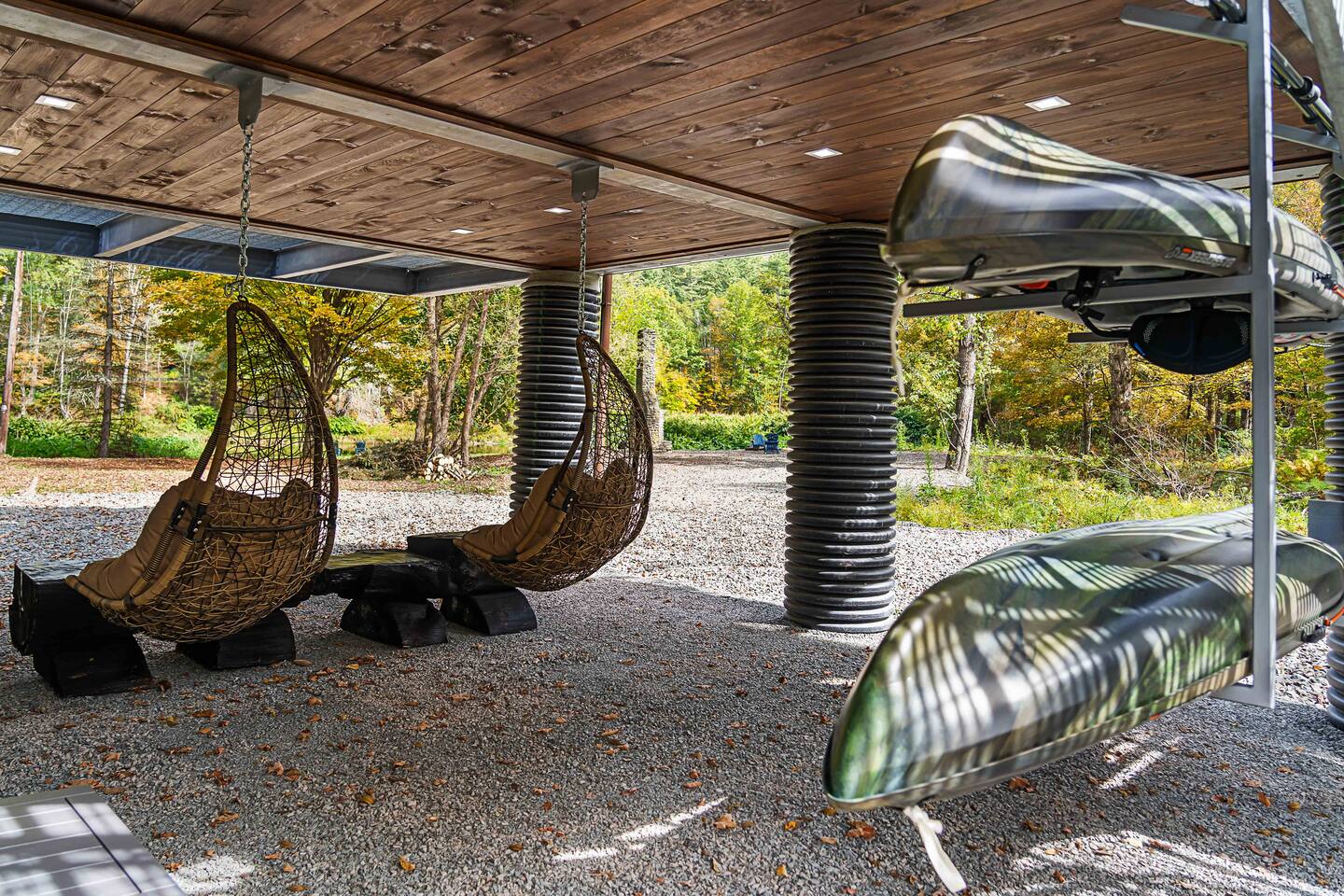 MAIN LEVEL LAYOUT: As you walk in, you’ll be greeted by an open-concept space. The kitchen is to your right, while two closets are on your left — the first is open for guest use, and the second is a locked owner’s closet. Continuing forward, you’ll find the living and dining area. The right side features a cozy living room with a couch, coffee table, Smart TV, and an electric fireplace. On the left, a sliding door leads to the balcony, and a dining table with seating for four completes the space. On the further left side of the main level, there are two bedrooms and one full bathroom: Right bedroom: Full-size bed Left bedroom: Queen bed The bathroom, located next to the queen bedroom, includes a shower. BALCONY: Accessible from the living room area, the balcony offers Adirondack chairs and a charcoal grill, perfect for outdoor dining or relaxing. UNDER THE HOUSE AREA: A great place to unwind — featuring outdoor swings with a coffee table, two kayaks available for use (with signed waiver), an outdoor dining table, and another charcoal grill. BACKYARD: Enjoy the fire pit area with a decorative fireplace (for display only — no fires permitted inside it). From here, you’ll have direct access to the Beaver Kill, perfect for relaxing by the water or casting a line.