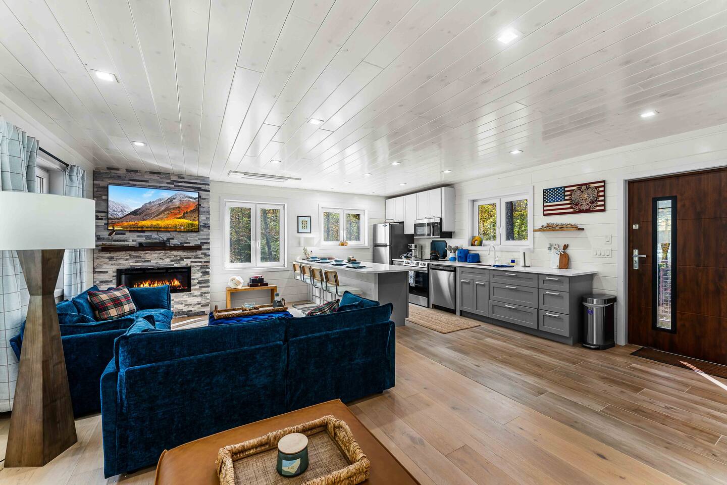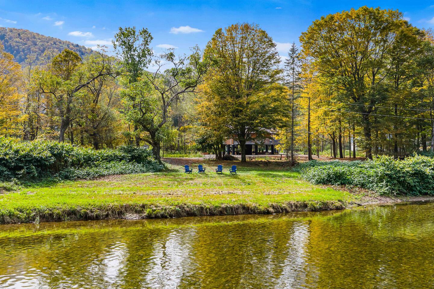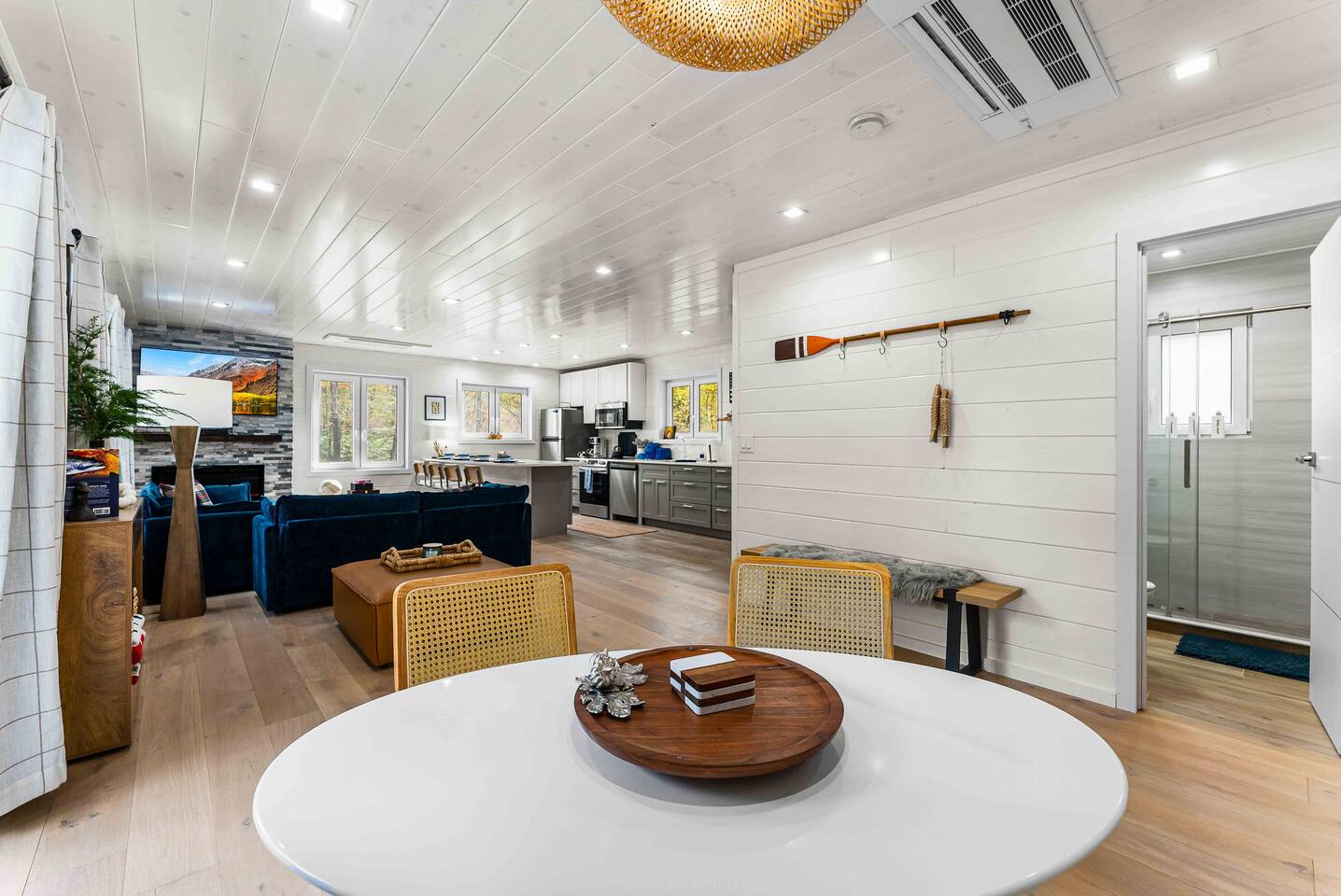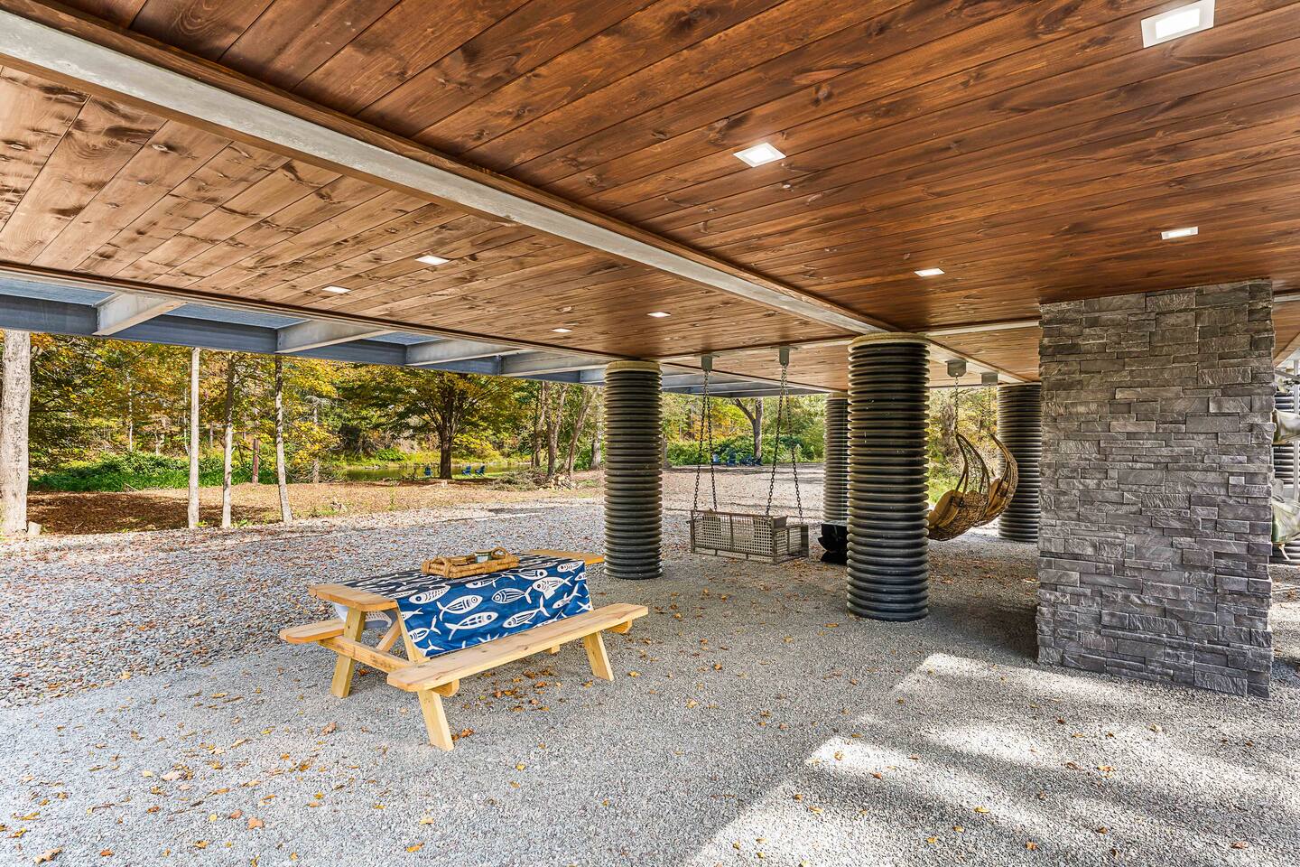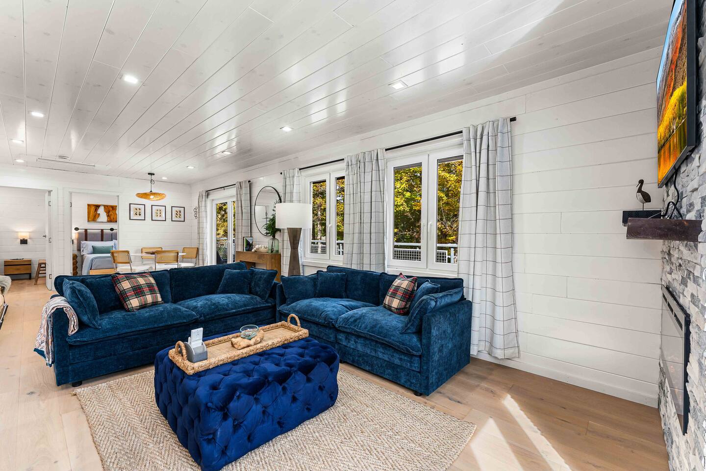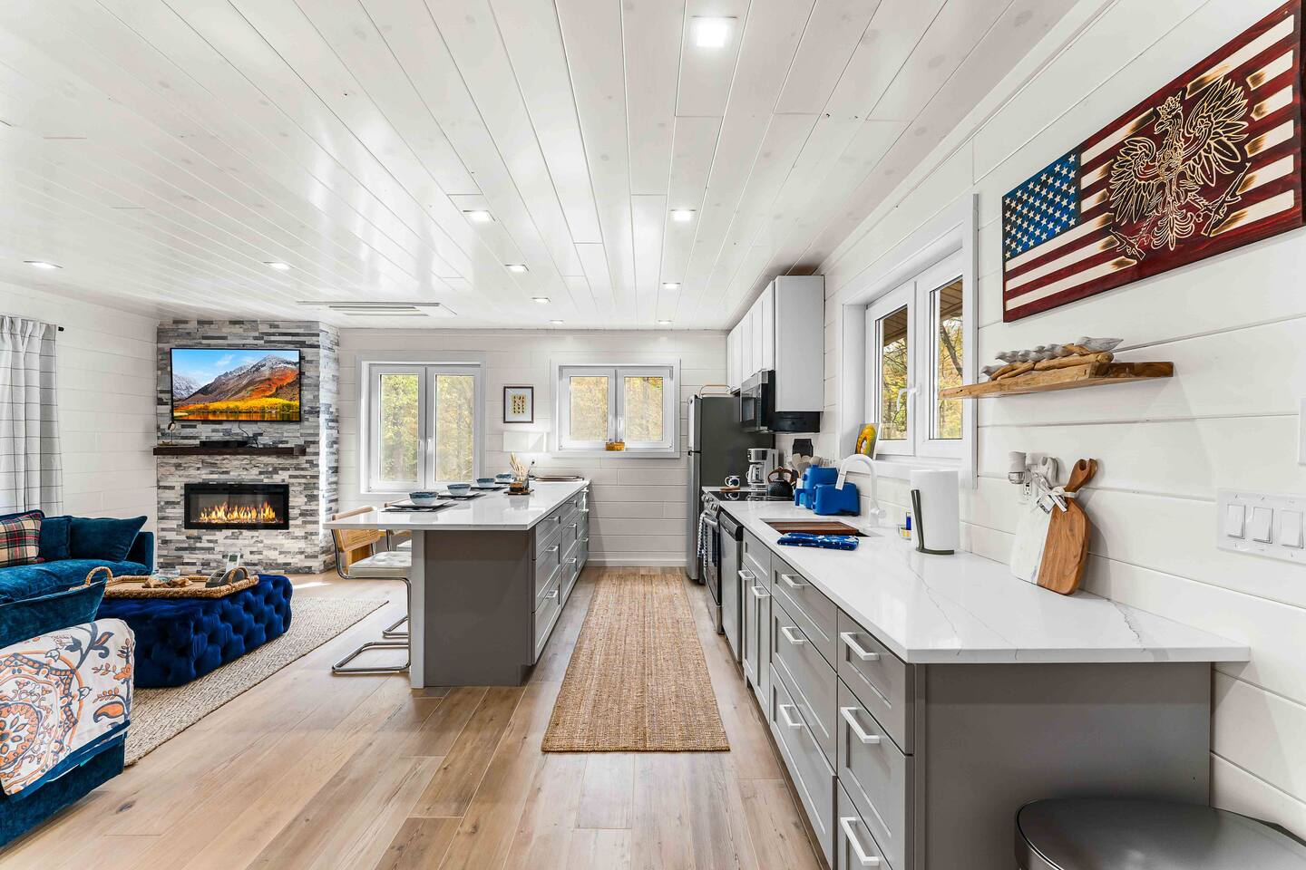 MAIN LEVEL LAYOUT: As you walk in, you’ll be greeted by an open-concept space. The kitchen is to your right, while two closets are on your left — the first is open for guest use, and the second is a locked owner’s closet. Continuing forward, you’ll find the living and dining area. The right side features a cozy living room with a couch, coffee table, Smart TV, and an electric fireplace. On the left, a sliding door leads to the balcony, and a dining table with seating for four completes the space. On the further left side of the main level, there are two bedrooms and one full bathroom: Right bedroom: Full-size bed Left bedroom: Queen bed The bathroom, located next to the queen bedroom, includes a shower. BALCONY: Accessible from the living room area, the balcony offers Adirondack chairs and a charcoal grill, perfect for outdoor dining or relaxing. UNDER THE HOUSE AREA: A great place to unwind — featuring outdoor swings with a coffee table, two kayaks available for use (with signed waiver), an outdoor dining table, and another charcoal grill. BACKYARD: Enjoy the fire pit area with a decorative fireplace (for display only — no fires permitted inside it). From here, you’ll have direct access to the Beaver Kill, perfect for relaxing by the water or casting a line.