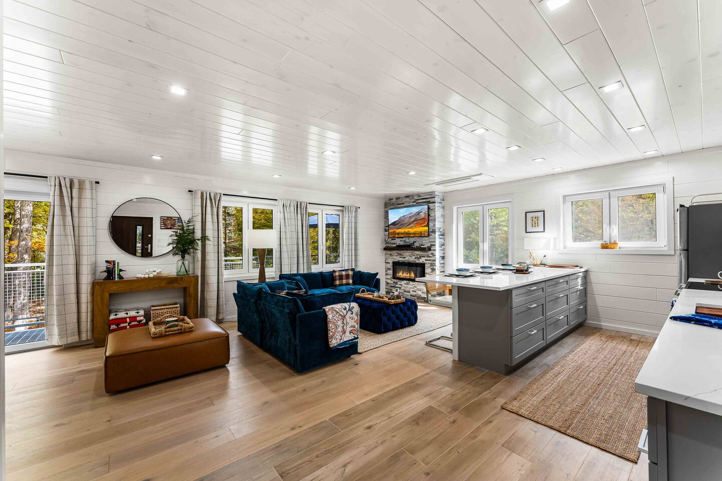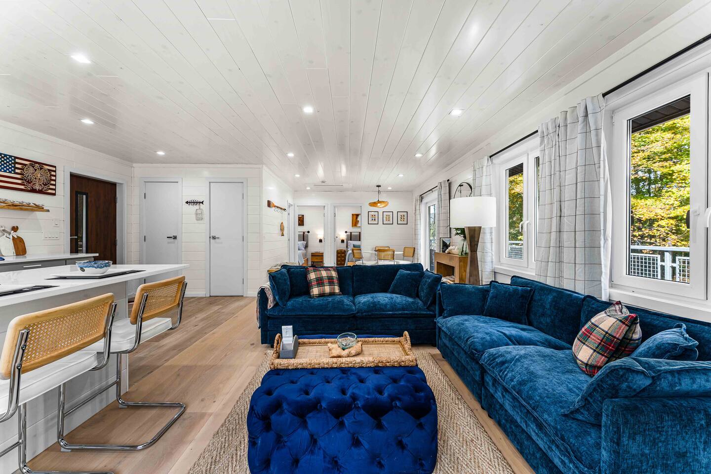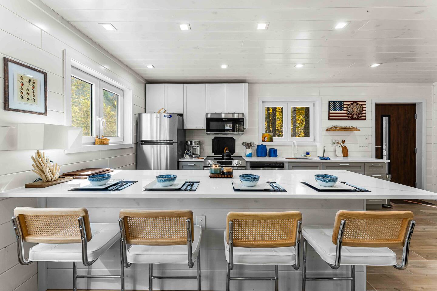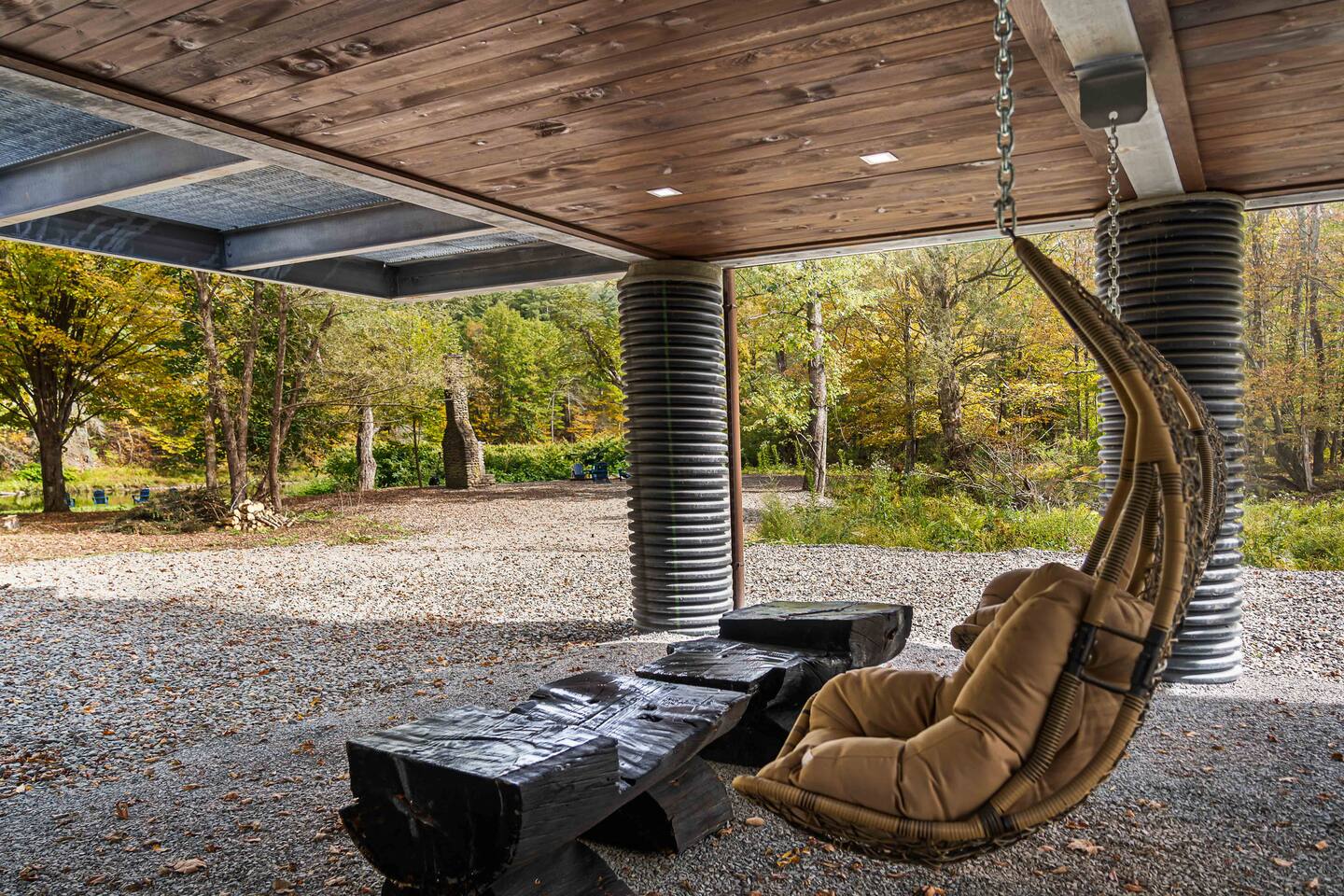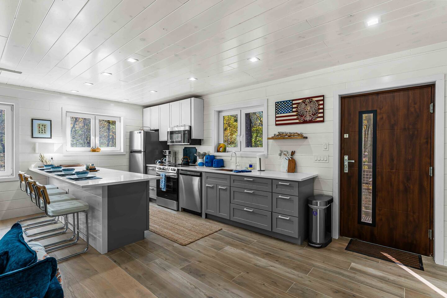 MAIN LEVEL LAYOUT: As you walk in, you’ll be greeted by an open-concept space. The kitchen is to your right, while two closets are on your left — the first is open for guest use, and the second is a locked owner’s closet. Continuing forward, you’ll find the living and dining area. The right side features a cozy living room with a couch, coffee table, Smart TV, and an electric fireplace. On the left, a sliding door leads to the balcony, and a dining table with seating for four completes the space. On the further left side of the main level, there are two bedrooms and one full bathroom: Right bedroom: Full-size bed Left bedroom: Queen bed The bathroom, located next to the queen bedroom, includes a shower. BALCONY: Accessible from the living room area, the balcony offers Adirondack chairs and a charcoal grill, perfect for outdoor dining or relaxing. UNDER THE HOUSE AREA: A great place to unwind — featuring outdoor swings with a coffee table, two kayaks available for use (with signed waiver), an outdoor dining table, and another charcoal grill. BACKYARD: Enjoy the fire pit area with a decorative fireplace (for display only — no fires permitted inside it). From here, you’ll have direct access to the Beaver Kill, perfect for relaxing by the water or casting a line.