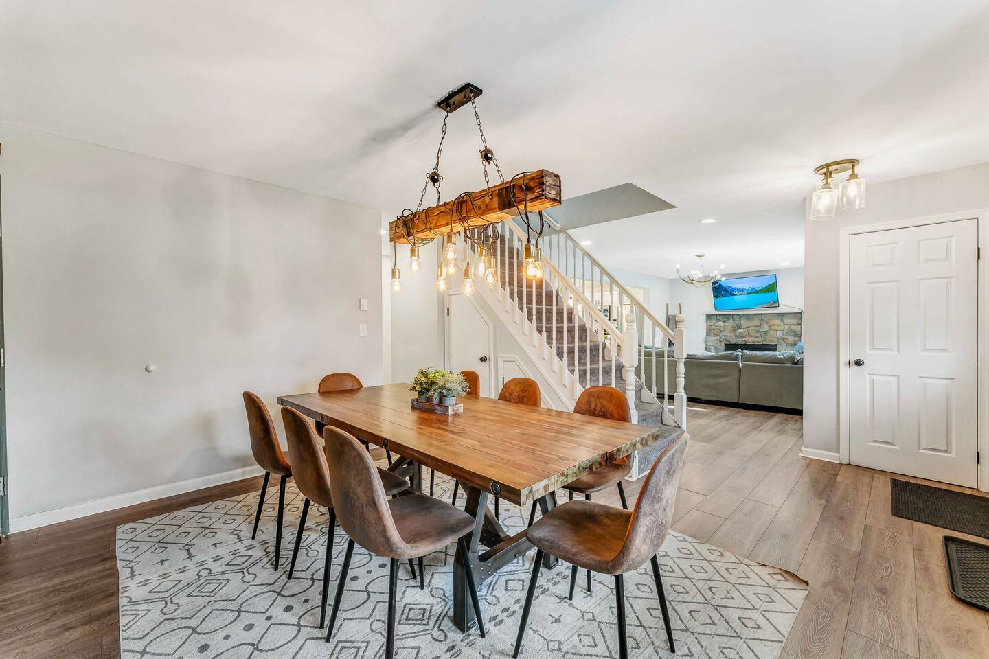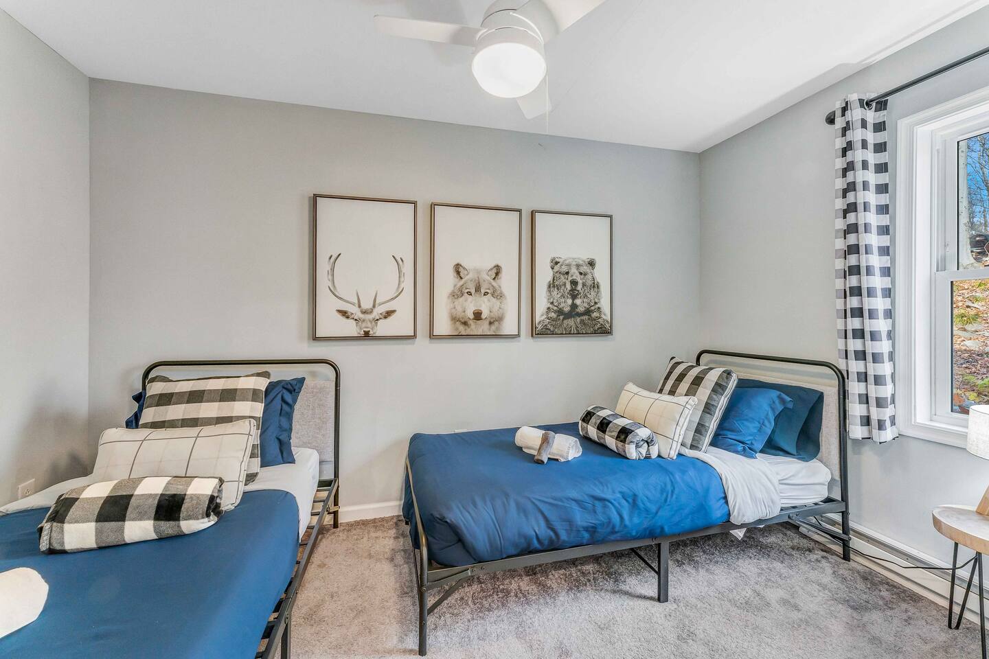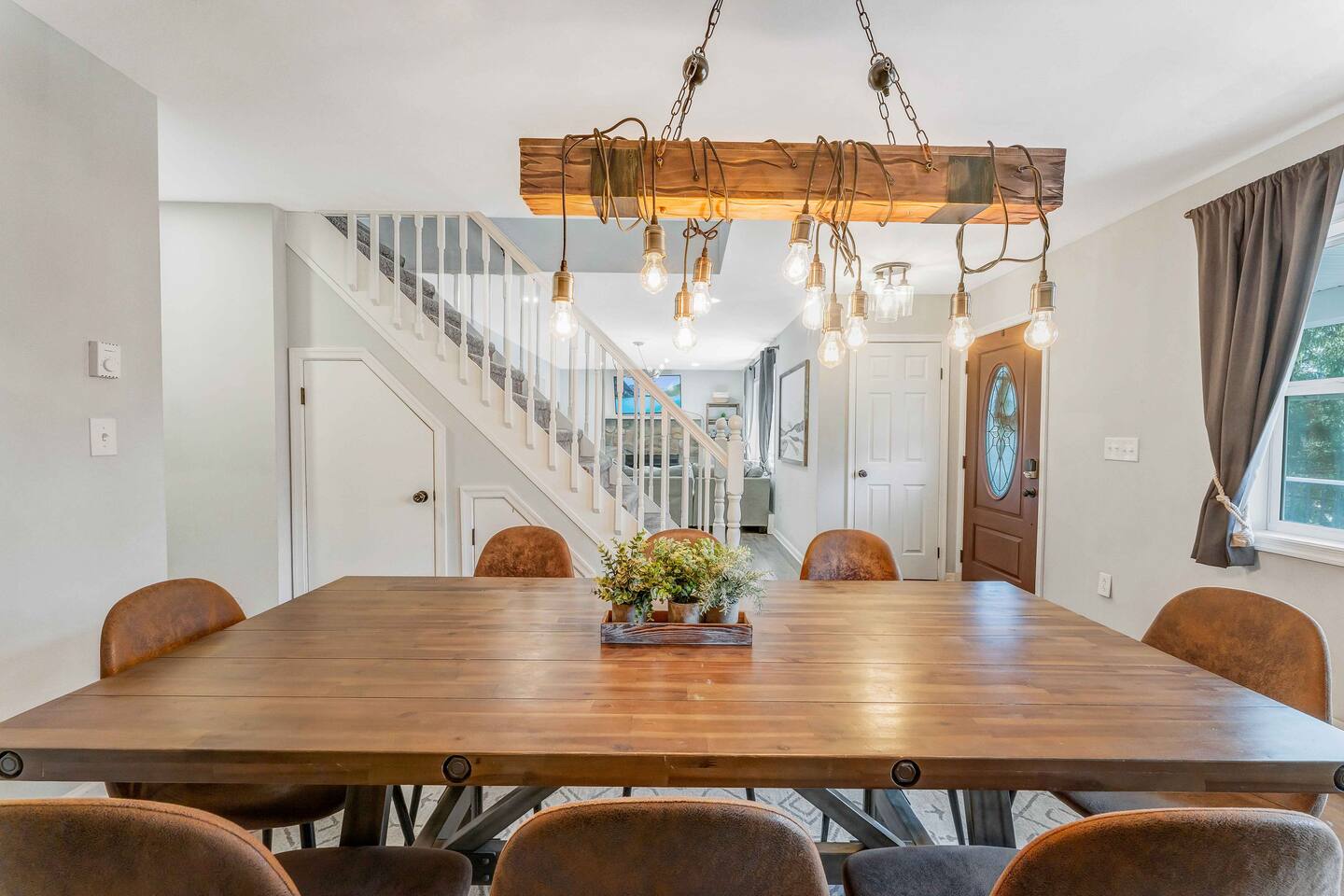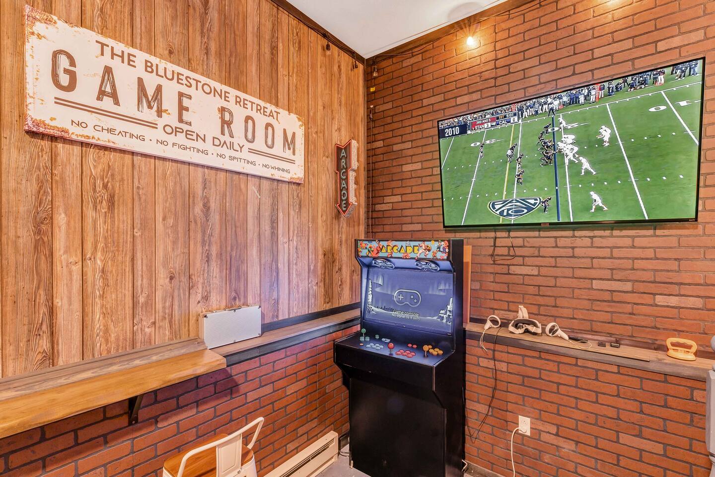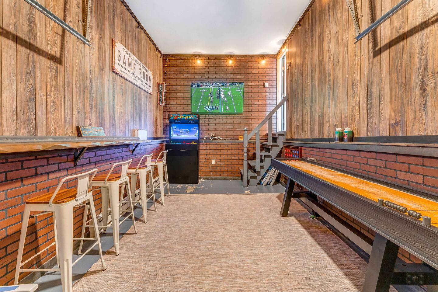 Welcome to our beautiful Airbnb! This spacious home offers a perfect blend of comfort and style across two levels, providing a relaxing and enjoyable experience for families or groups. 1st Level: As you step into the home, you’ll be greeted by a beautiful dining area that seamlessly connects to the living room and kitchen, creating an open and inviting space for relaxation and entertaining. The kitchen is fully equipped, making it easy to prepare meals for your group. Adjacent to the dining area, there is a cozy bedroom with two single beds. A full bathroom serves this level, and you'll also find a laundry room for added convenience. A hidden door in the dining room area leads to the game room, offering hours of fun and entertainment. Living room area has a single "sleeper/couch" that can be used as an additional sleeping accommodation. From the kitchen, you can walk out through a sliding door to the backyard, where you'll discover a serene outdoor space. The deck is home to an electric hot tub, perfect for unwinding after a long day. There’s also a BBQ for grilling up a delicious meal, along with an outdoor dining area and a fire pit area, ideal for gathering around and enjoying the evening. 2nd Floor: The second floor features a primary suite with a luxurious king-size bed and a full bathroom for your ultimate comfort and privacy. There’s an additional full bathroom located in the hallway, conveniently accessible from the other bedrooms. Two more bedrooms on this floor offer flexible sleeping arrangements, one with a queen-size bed and the other with a queen-size bed and a workstation, perfect for those who need to get some work done while away. Whether you’re here to relax or have fun, this home is designed to meet all your needs. We hope you enjoy your stay!