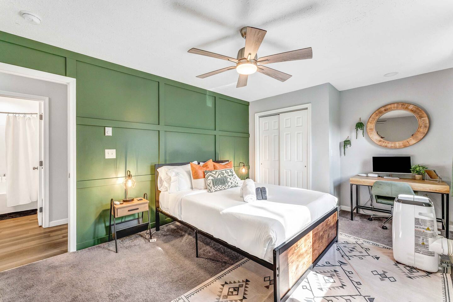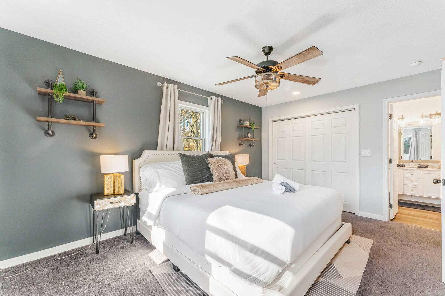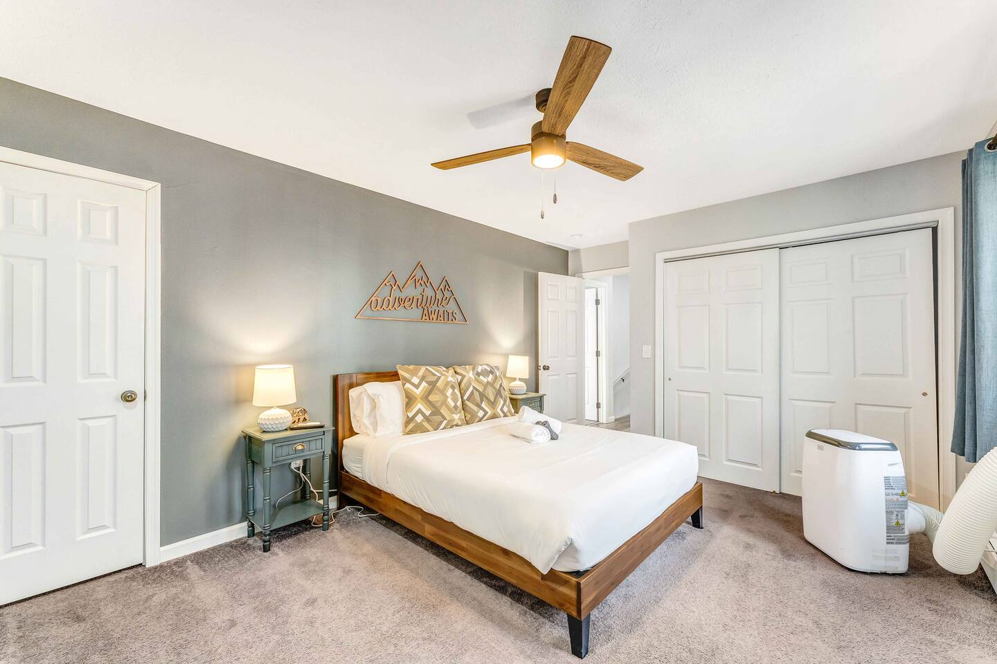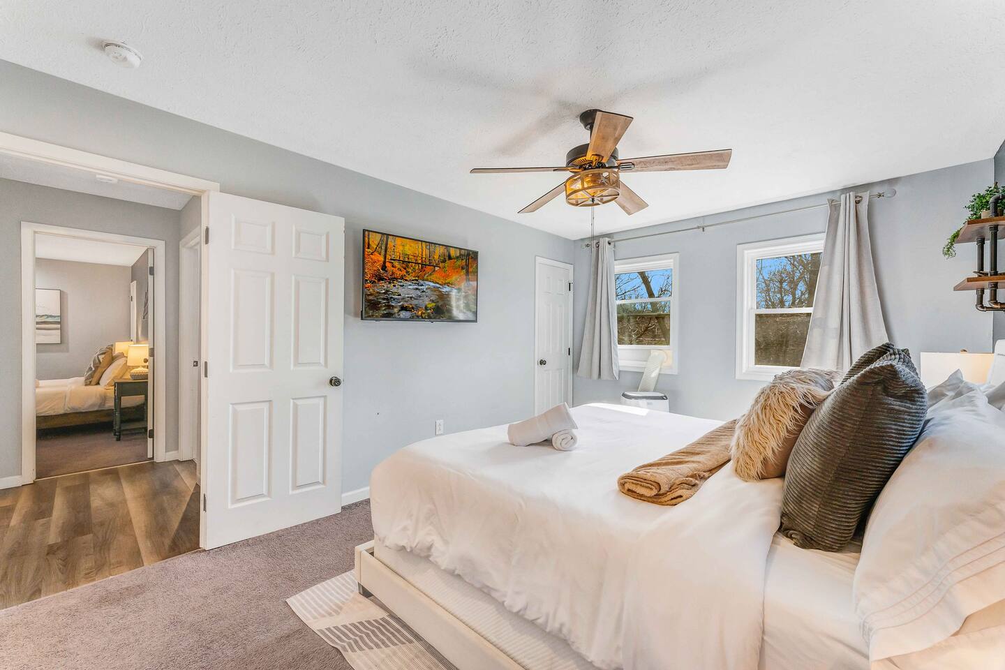 Welcome to our beautiful Airbnb! This spacious home offers a perfect blend of comfort and style across two levels, providing a relaxing and enjoyable experience for families or groups. 1st Level: As you step into the home, you’ll be greeted by a beautiful dining area that seamlessly connects to the living room and kitchen, creating an open and inviting space for relaxation and entertaining. The kitchen is fully equipped, making it easy to prepare meals for your group. Adjacent to the dining area, there is a cozy bedroom with two single beds. A full bathroom serves this level, and you'll also find a laundry room for added convenience. A hidden door in the dining room area leads to the game room, offering hours of fun and entertainment. Living room area has a single "sleeper/couch" that can be used as an additional sleeping accommodation. From the kitchen, you can walk out through a sliding door to the backyard, where you'll discover a serene outdoor space. The deck is home to an electric hot tub, perfect for unwinding after a long day. There’s also a BBQ for grilling up a delicious meal, along with an outdoor dining area and a fire pit area, ideal for gathering around and enjoying the evening. 2nd Floor: The second floor features a primary suite with a luxurious king-size bed and a full bathroom for your ultimate comfort and privacy. There’s an additional full bathroom located in the hallway, conveniently accessible from the other bedrooms. Two more bedrooms on this floor offer flexible sleeping arrangements, one with a queen-size bed and the other with a queen-size bed and a workstation, perfect for those who need to get some work done while away. Whether you’re here to relax or have fun, this home is designed to meet all your needs. We hope you enjoy your stay!