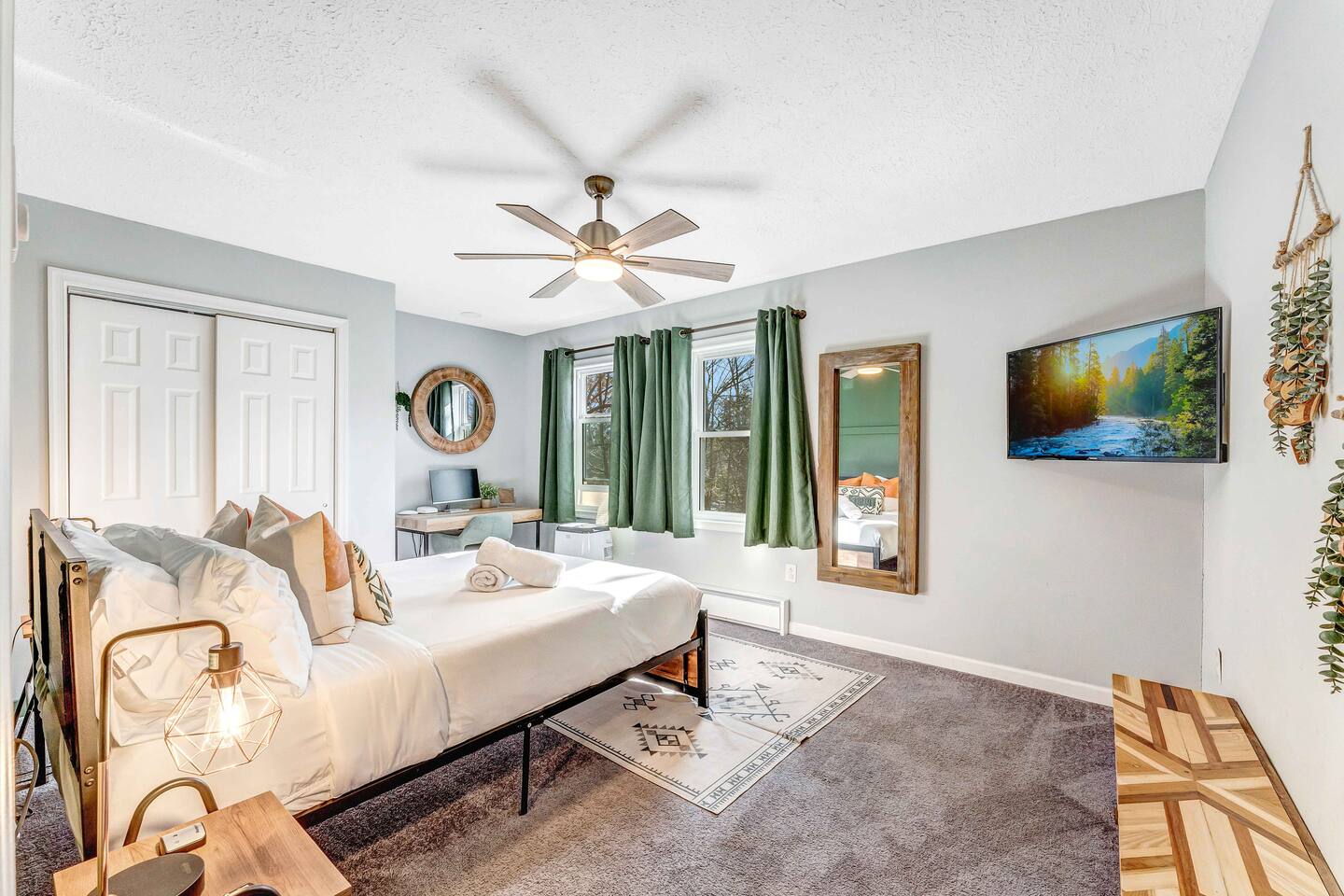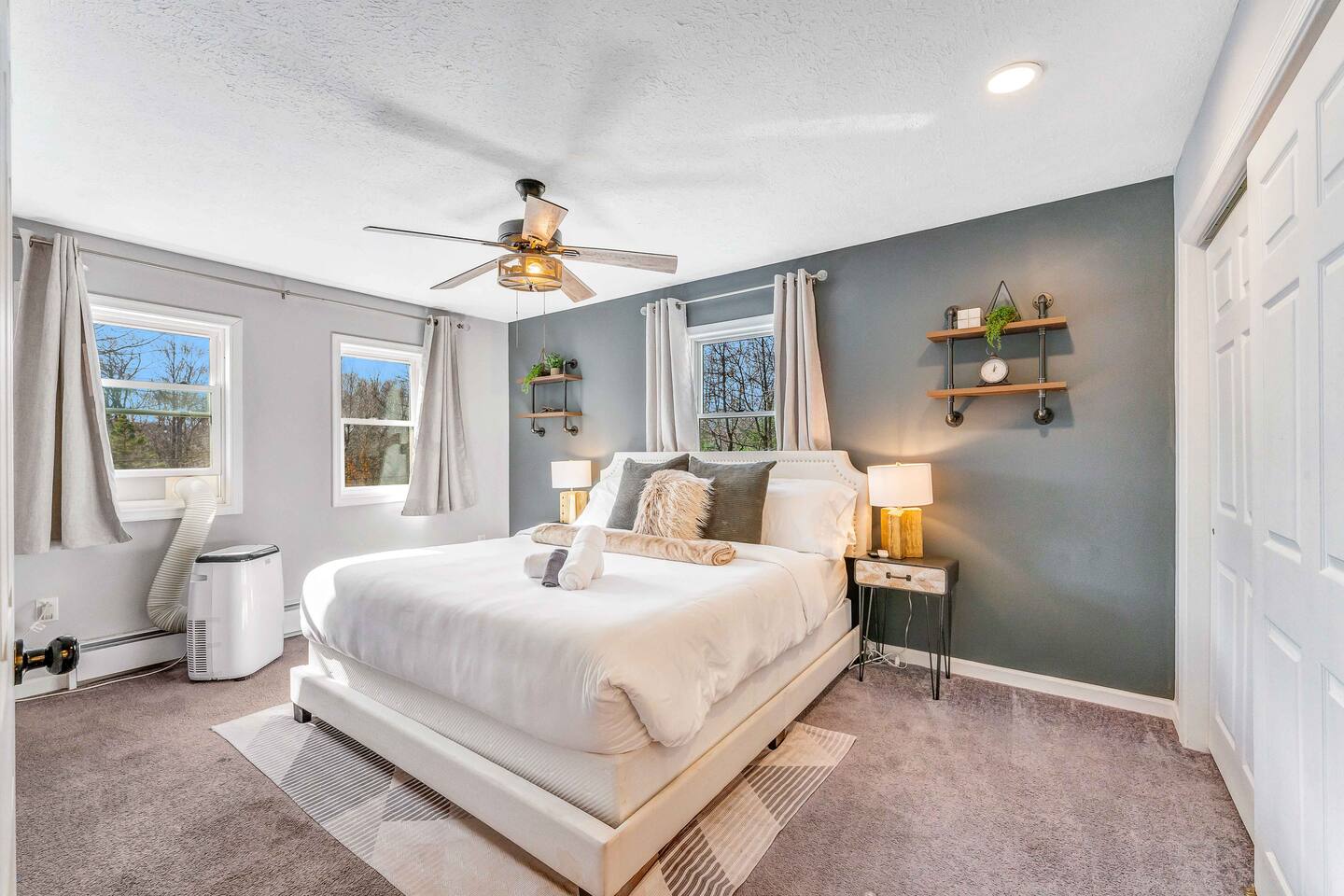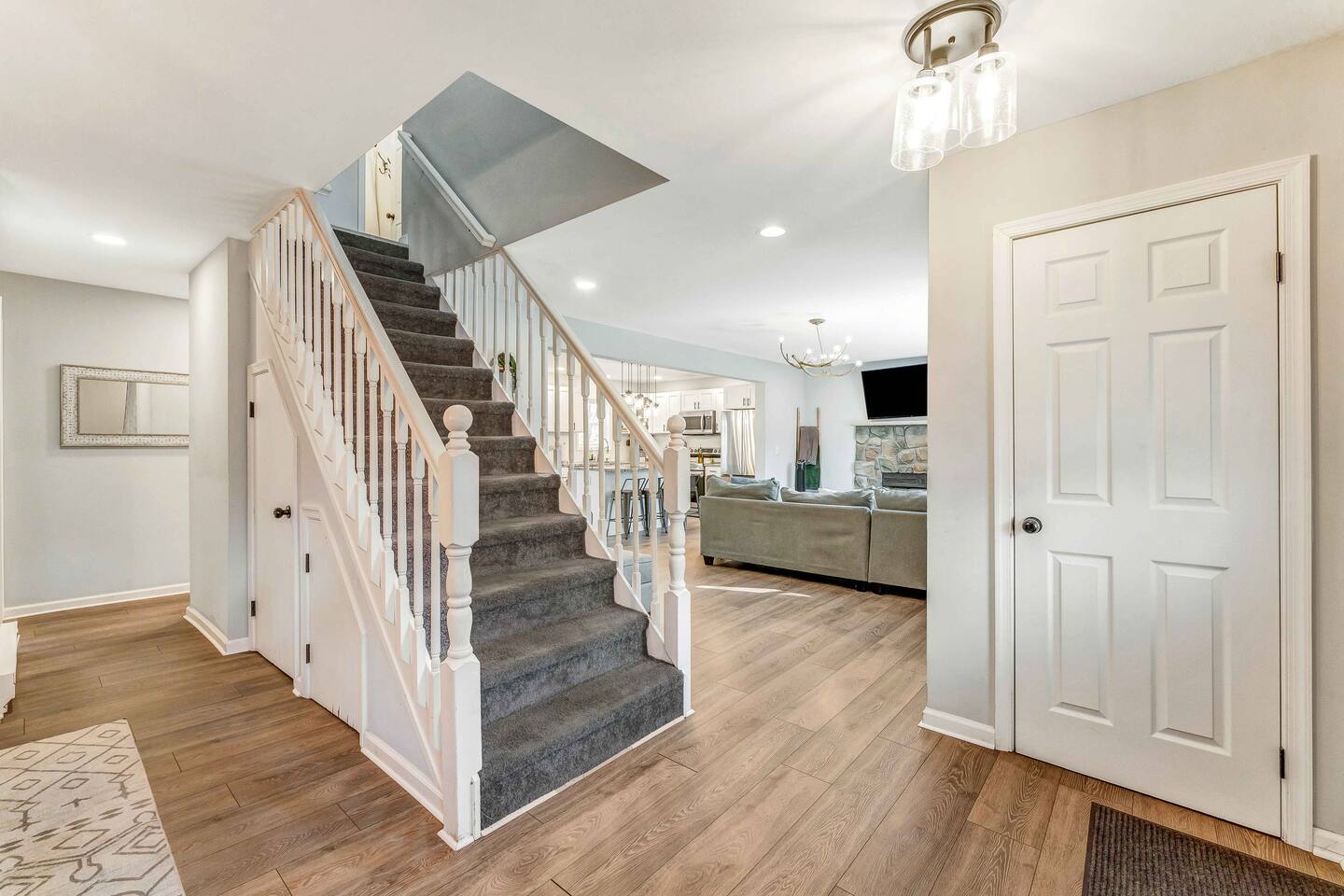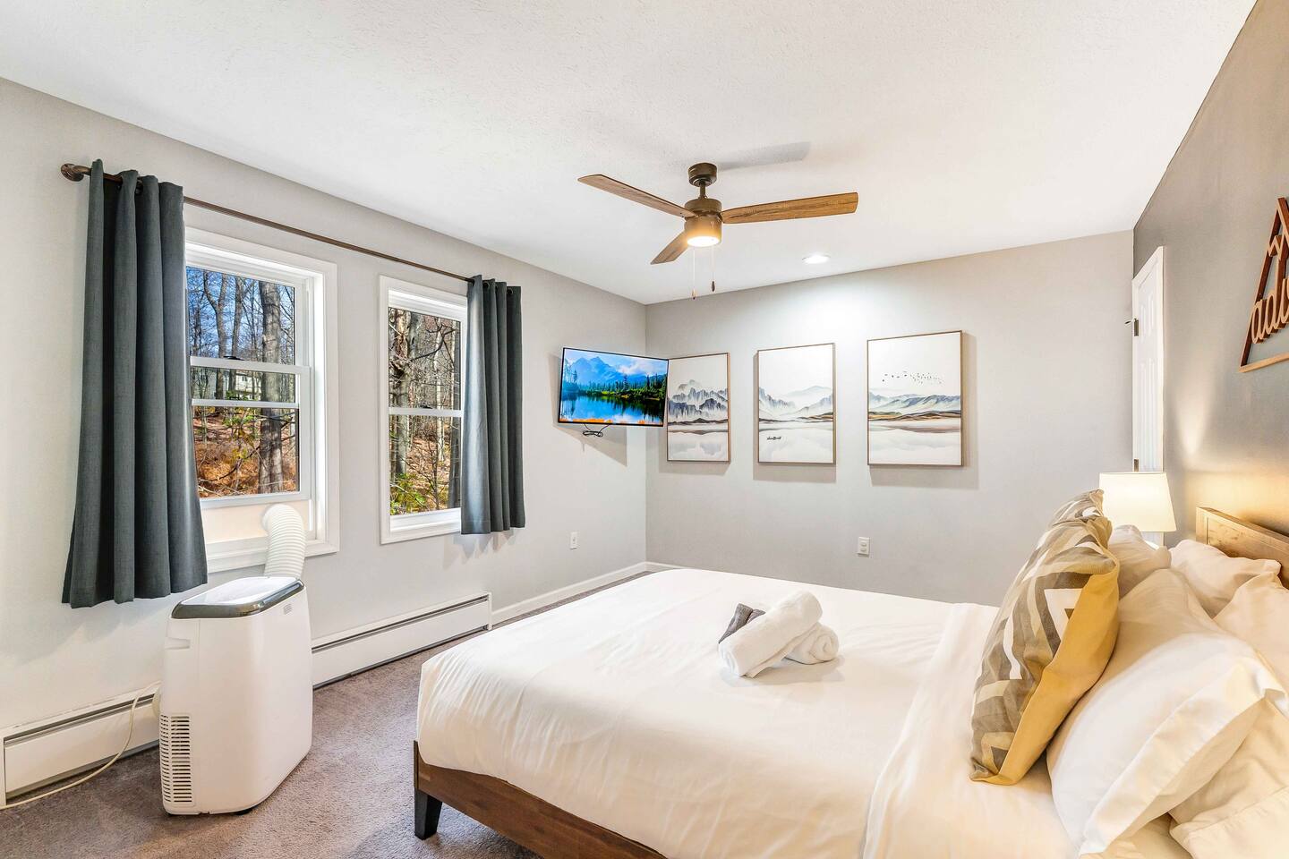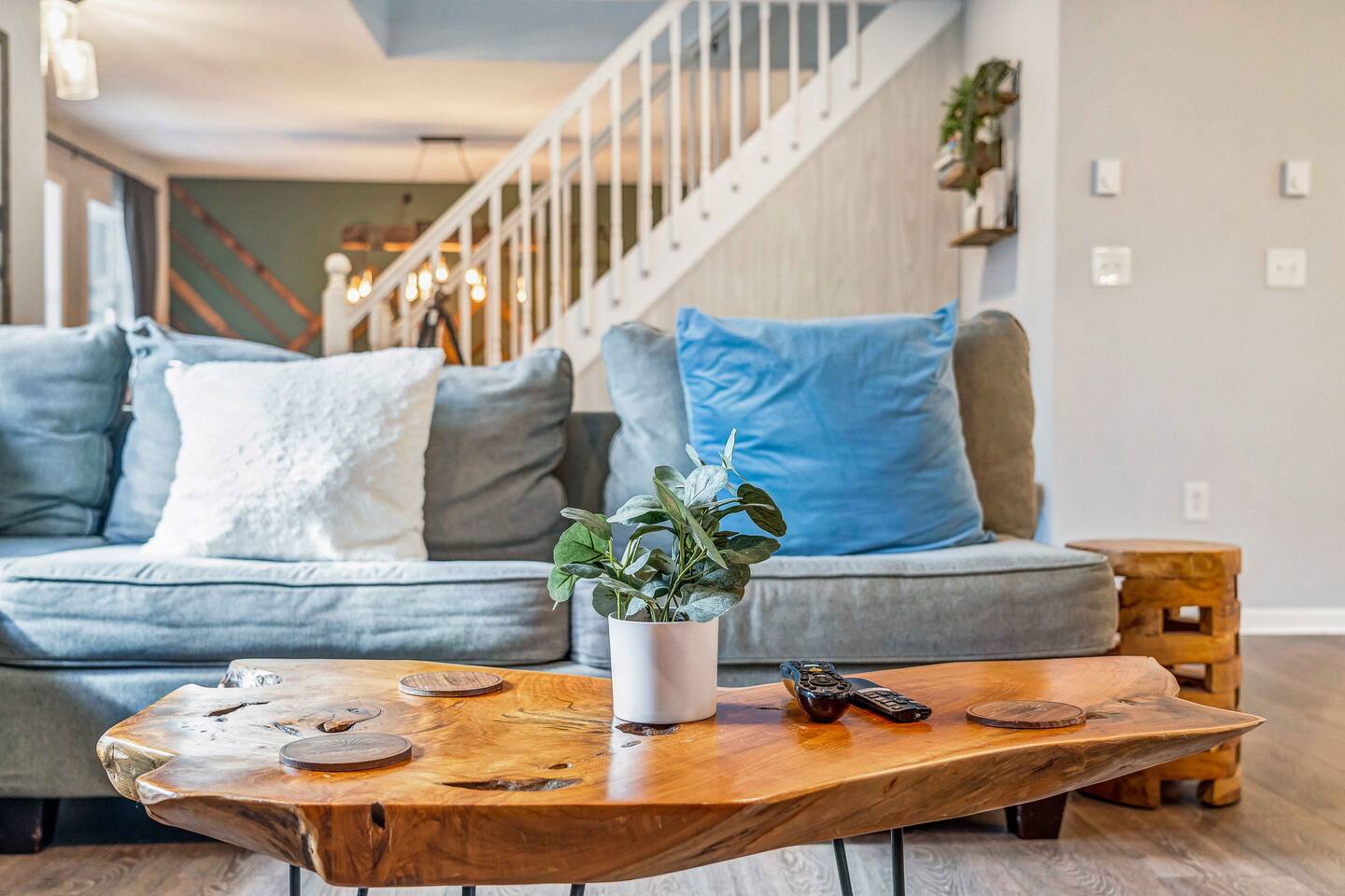 Welcome to our beautiful Airbnb! This spacious home offers a perfect blend of comfort and style across two levels, providing a relaxing and enjoyable experience for families or groups. 1st Level: As you step into the home, you’ll be greeted by a beautiful dining area that seamlessly connects to the living room and kitchen, creating an open and inviting space for relaxation and entertaining. The kitchen is fully equipped, making it easy to prepare meals for your group. Adjacent to the dining area, there is a cozy bedroom with two single beds. A full bathroom serves this level, and you'll also find a laundry room for added convenience. A hidden door in the dining room area leads to the game room, offering hours of fun and entertainment. Living room area has a single "sleeper/couch" that can be used as an additional sleeping accommodation. From the kitchen, you can walk out through a sliding door to the backyard, where you'll discover a serene outdoor space. The deck is home to an electric hot tub, perfect for unwinding after a long day. There’s also a BBQ for grilling up a delicious meal, along with an outdoor dining area and a fire pit area, ideal for gathering around and enjoying the evening. 2nd Floor: The second floor features a primary suite with a luxurious king-size bed and a full bathroom for your ultimate comfort and privacy. There’s an additional full bathroom located in the hallway, conveniently accessible from the other bedrooms. Two more bedrooms on this floor offer flexible sleeping arrangements, one with a queen-size bed and the other with a queen-size bed and a workstation, perfect for those who need to get some work done while away. Whether you’re here to relax or have fun, this home is designed to meet all your needs. We hope you enjoy your stay!