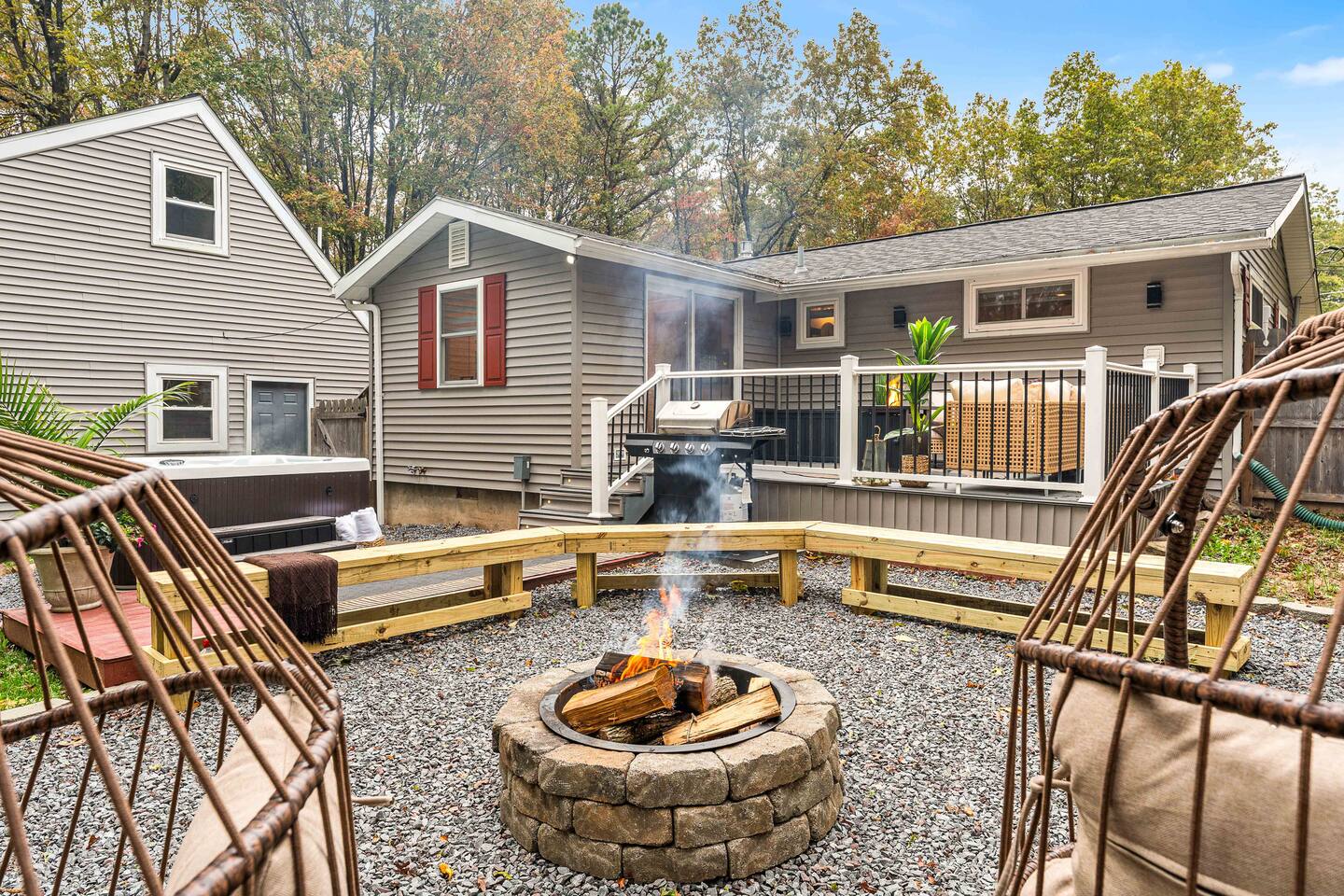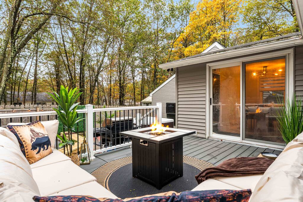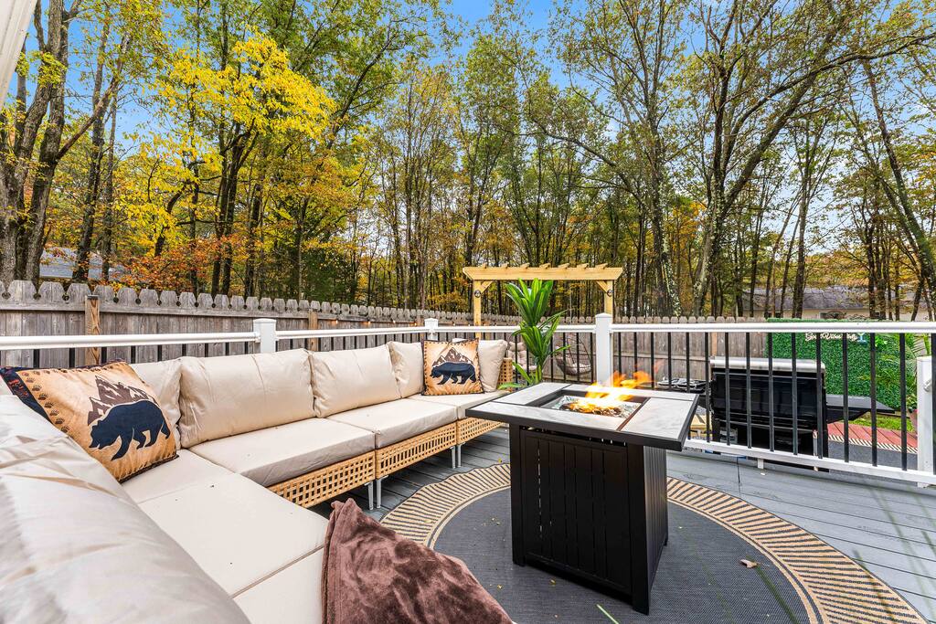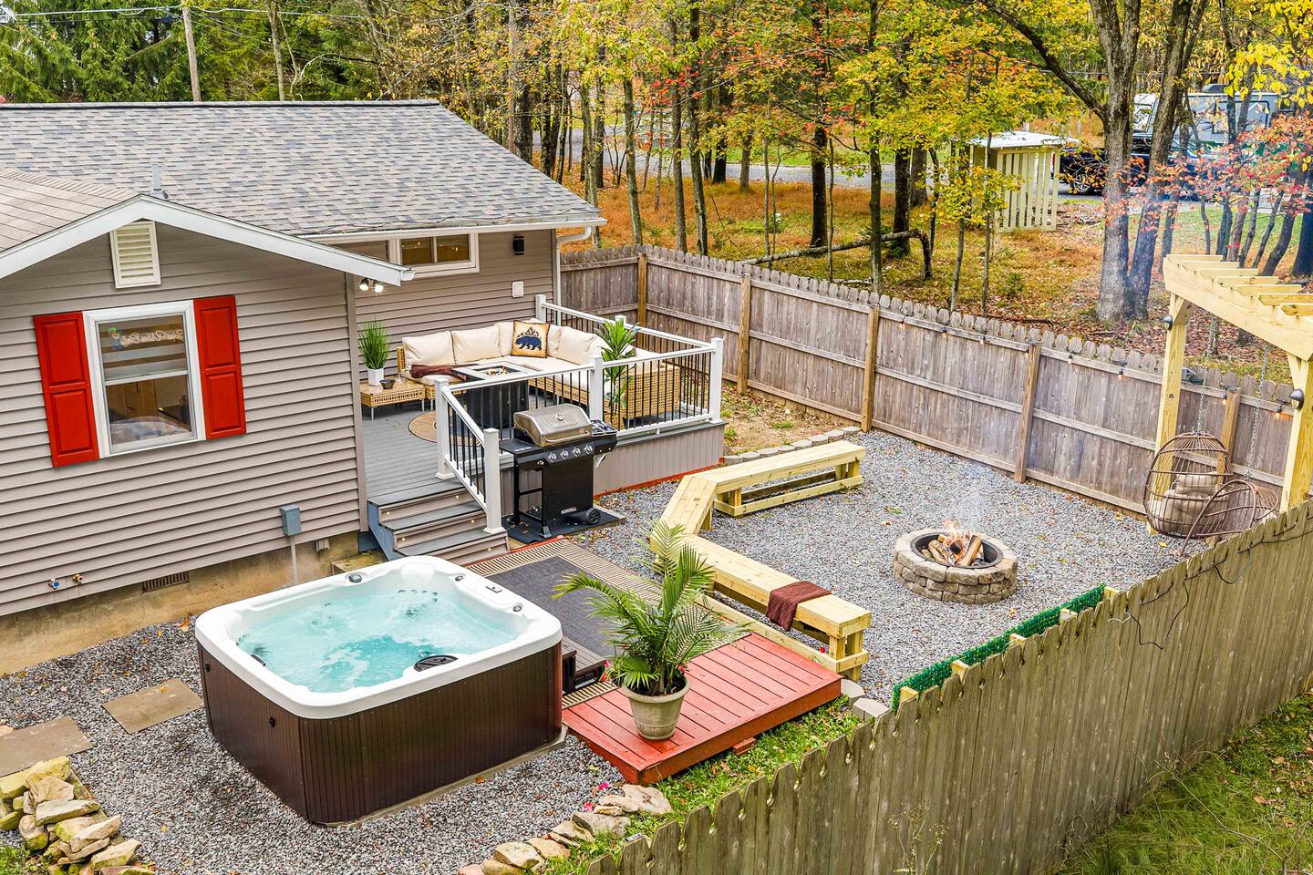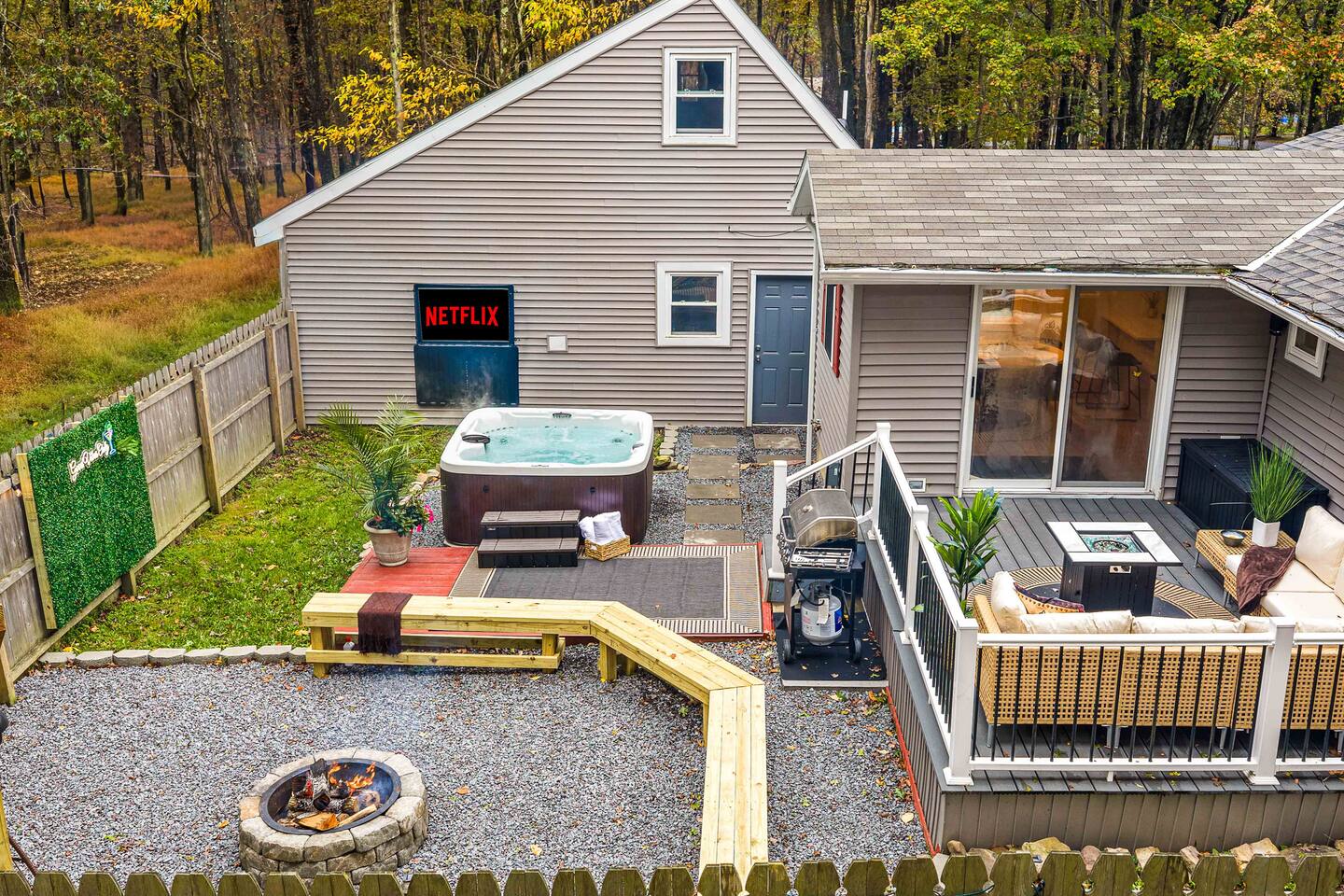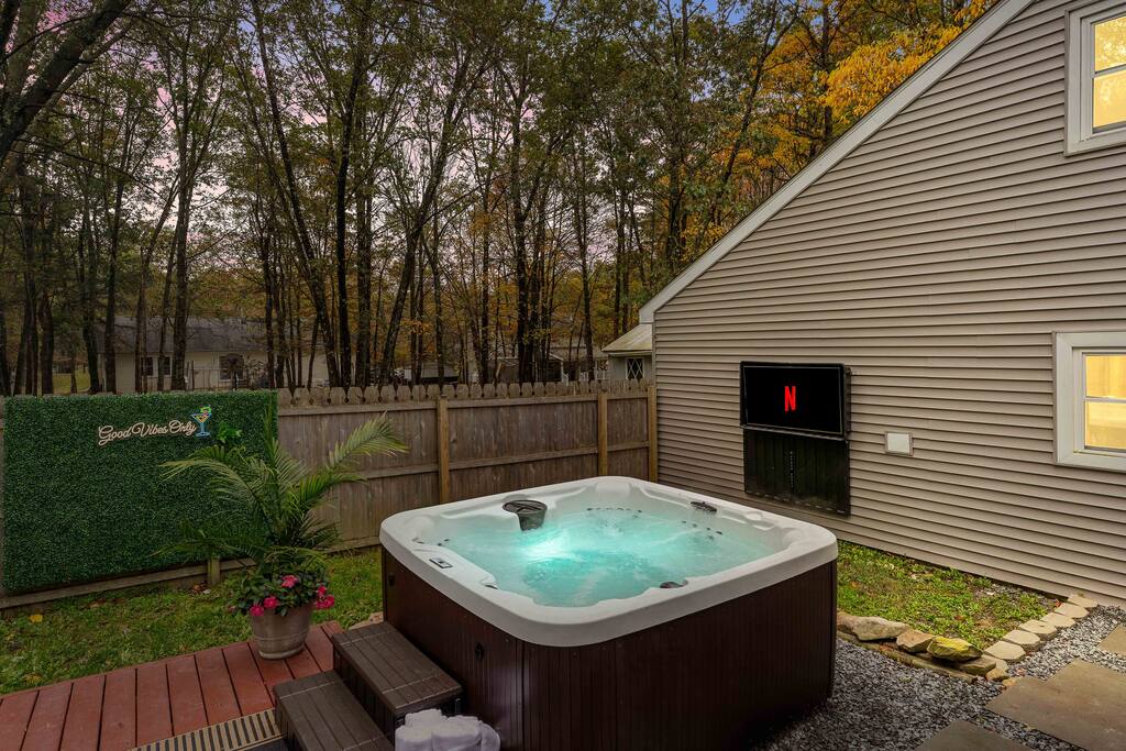 Stylish 2BD Cabin in the Poconos with a fully fenced backyard packed with every amenity you can dream of! Relax in the hot tub, enjoy movies on the outdoor TV, or gather by the real wood fire pit with swings and a chic wood bench. Take pictures by the grass wall with a neon sign, grill on the BBQ, or unwind on the deck with a gas fire pit. Inside, enjoy modern décor, a cozy gas fireplace, full kitchen, laundry, and front porch perfect for morning coffee. Close to all main Pocono attractions!