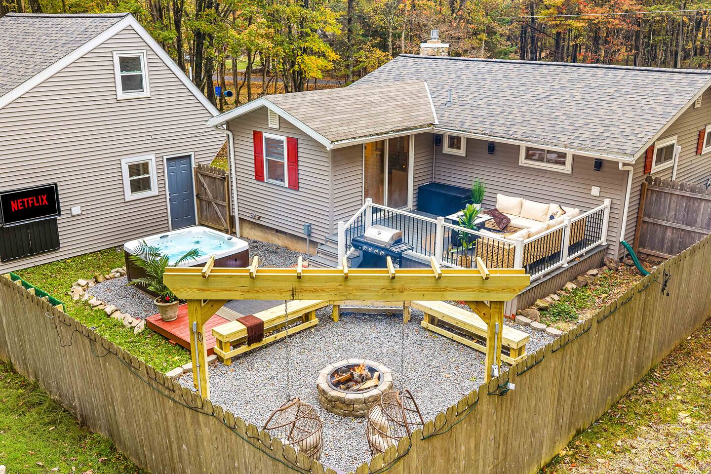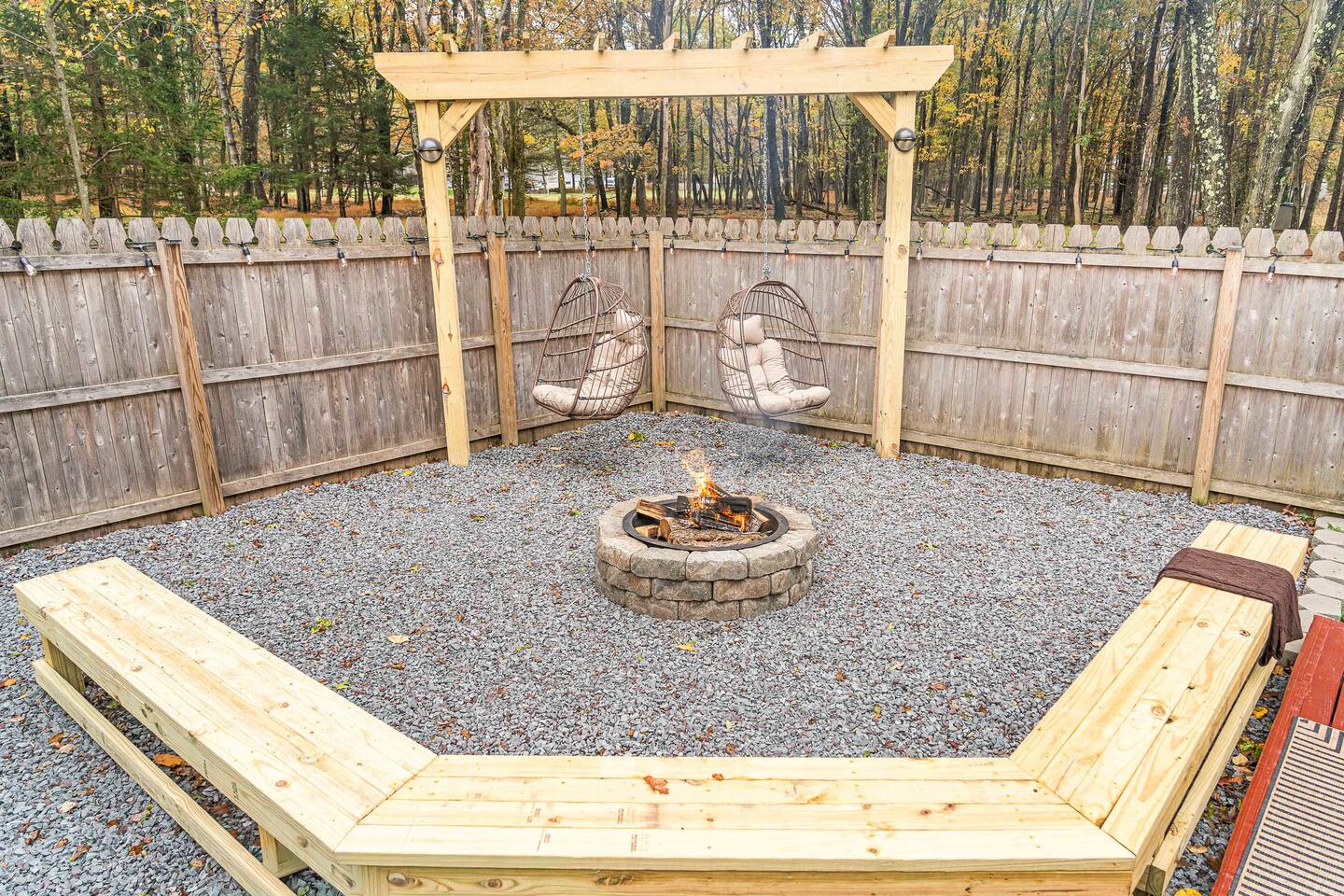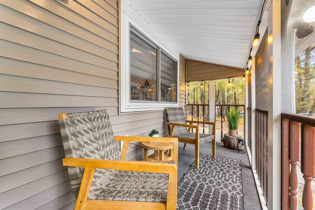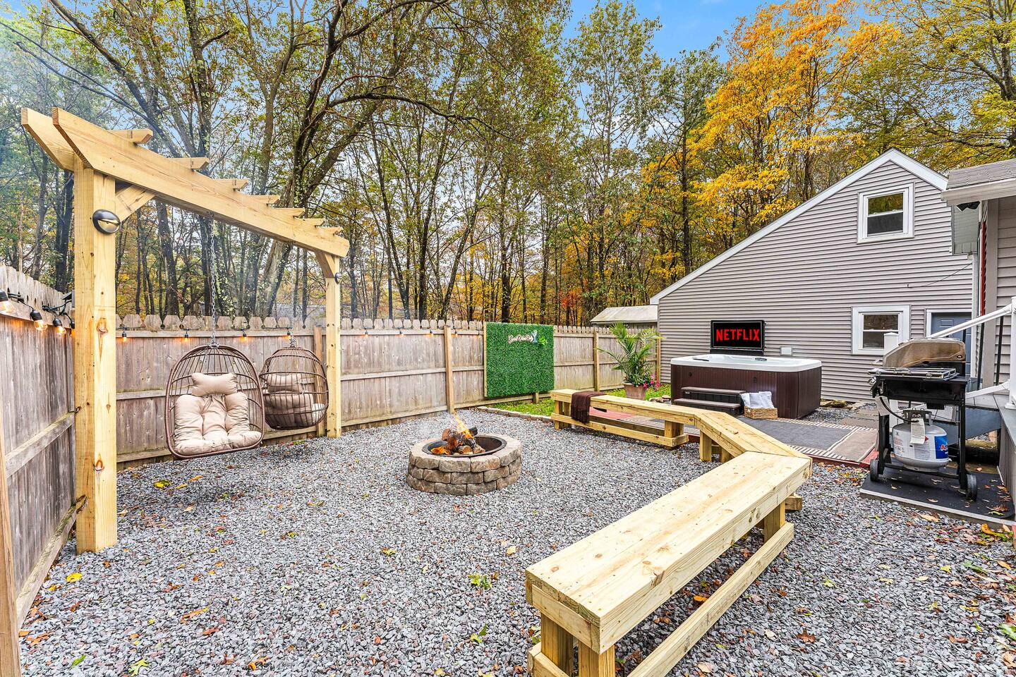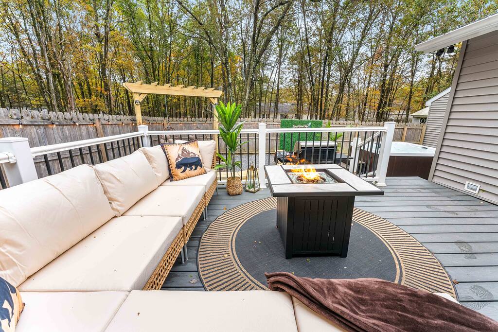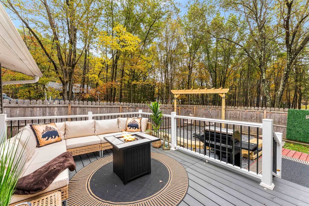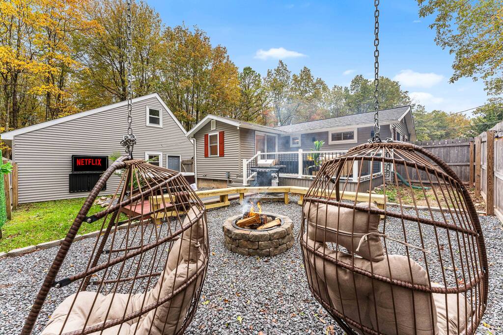 Stylish 2BD Cabin in the Poconos with a fully fenced backyard packed with every amenity you can dream of! Relax in the hot tub, enjoy movies on the outdoor TV, or gather by the real wood fire pit with swings and a chic wood bench. Take pictures by the grass wall with a neon sign, grill on the BBQ, or unwind on the deck with a gas fire pit. Inside, enjoy modern décor, a cozy gas fireplace, full kitchen, laundry, and front porch perfect for morning coffee. Close to all main Pocono attractions!