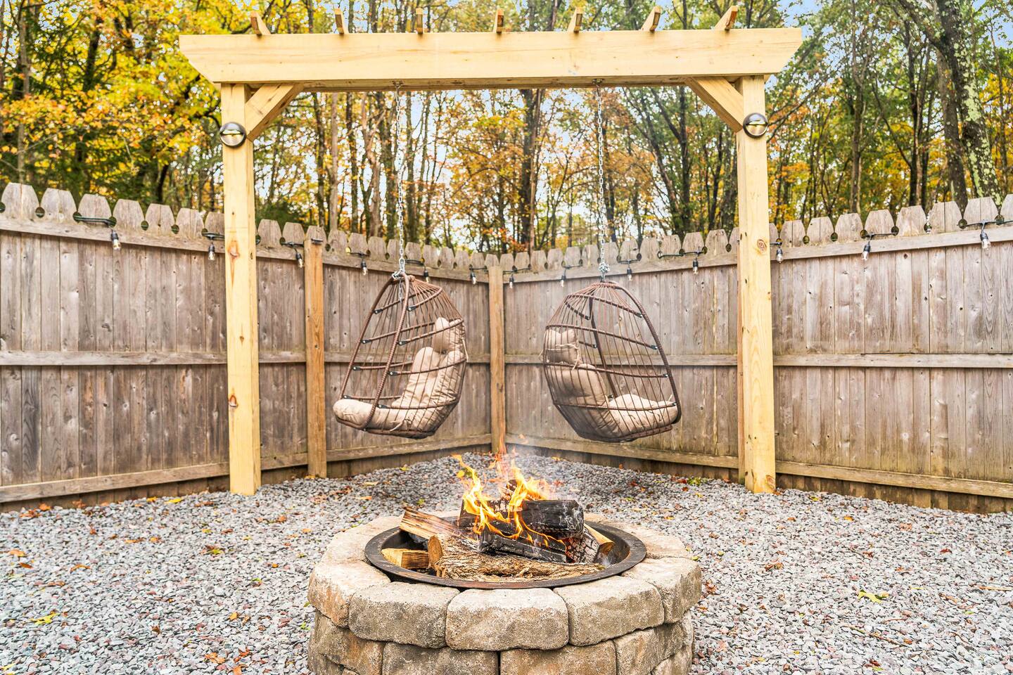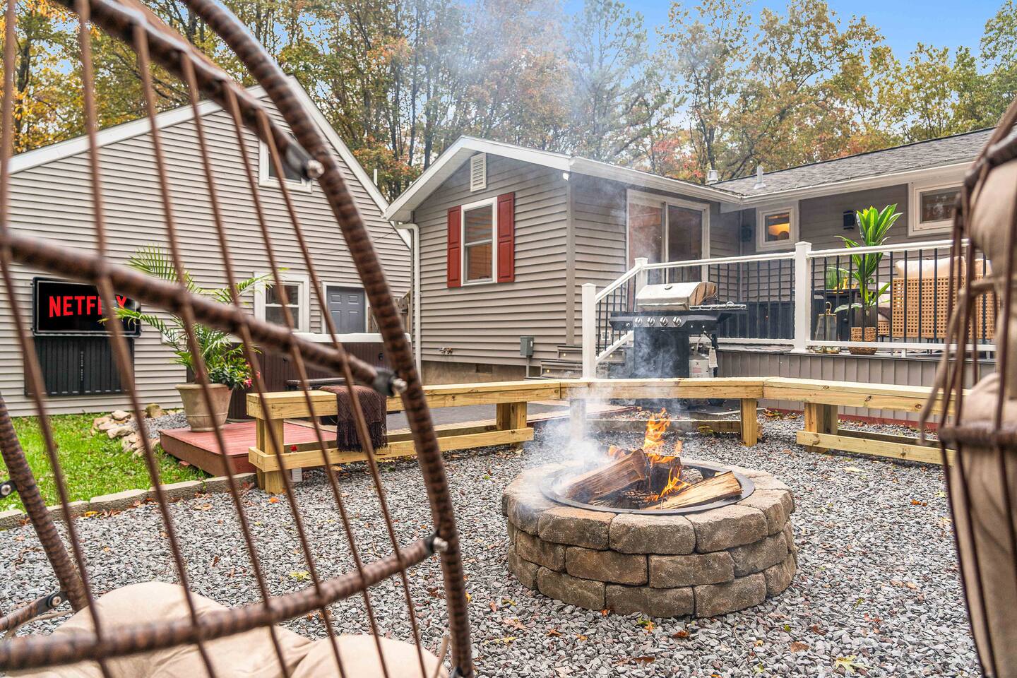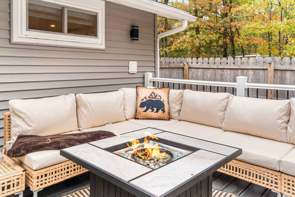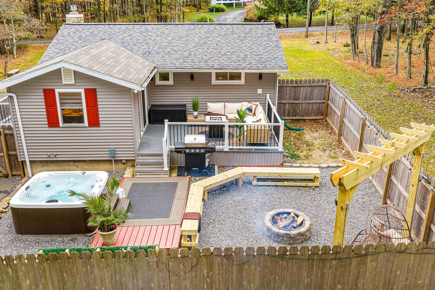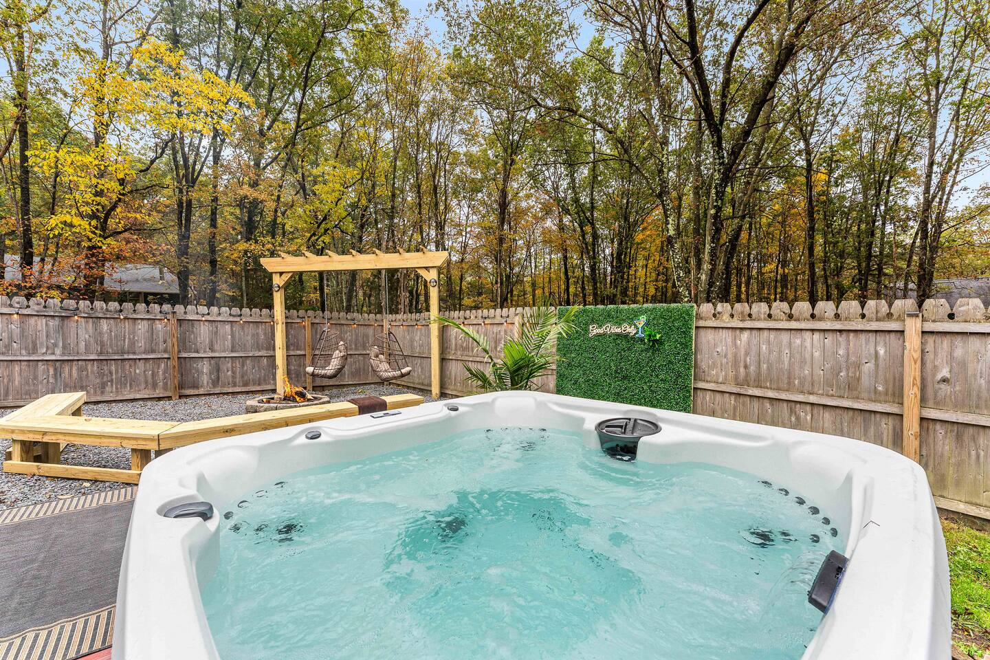 Stylish 2BD Cabin in the Poconos with a fully fenced backyard packed with every amenity you can dream of! Relax in the hot tub, enjoy movies on the outdoor TV, or gather by the real wood fire pit with swings and a chic wood bench. Take pictures by the grass wall with a neon sign, grill on the BBQ, or unwind on the deck with a gas fire pit. Inside, enjoy modern décor, a cozy gas fireplace, full kitchen, laundry, and front porch perfect for morning coffee. Close to all main Pocono attractions!
