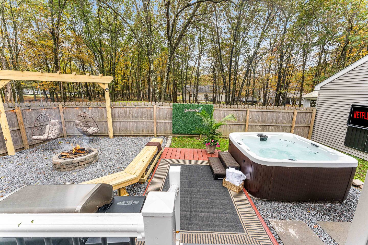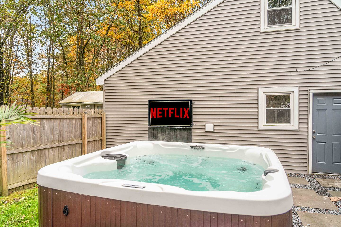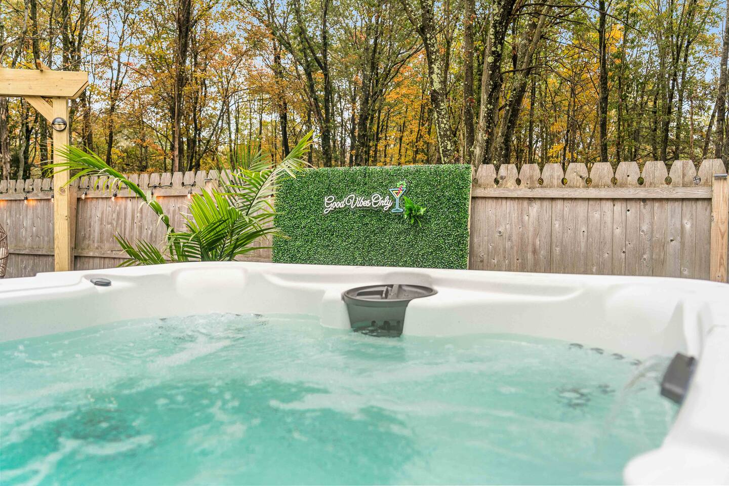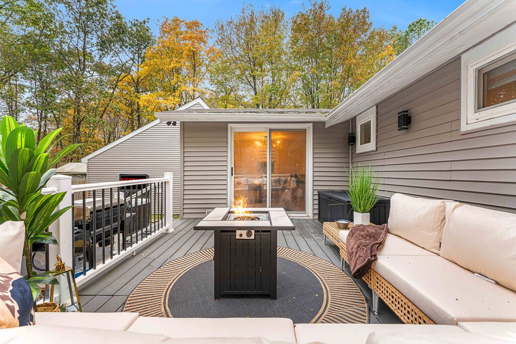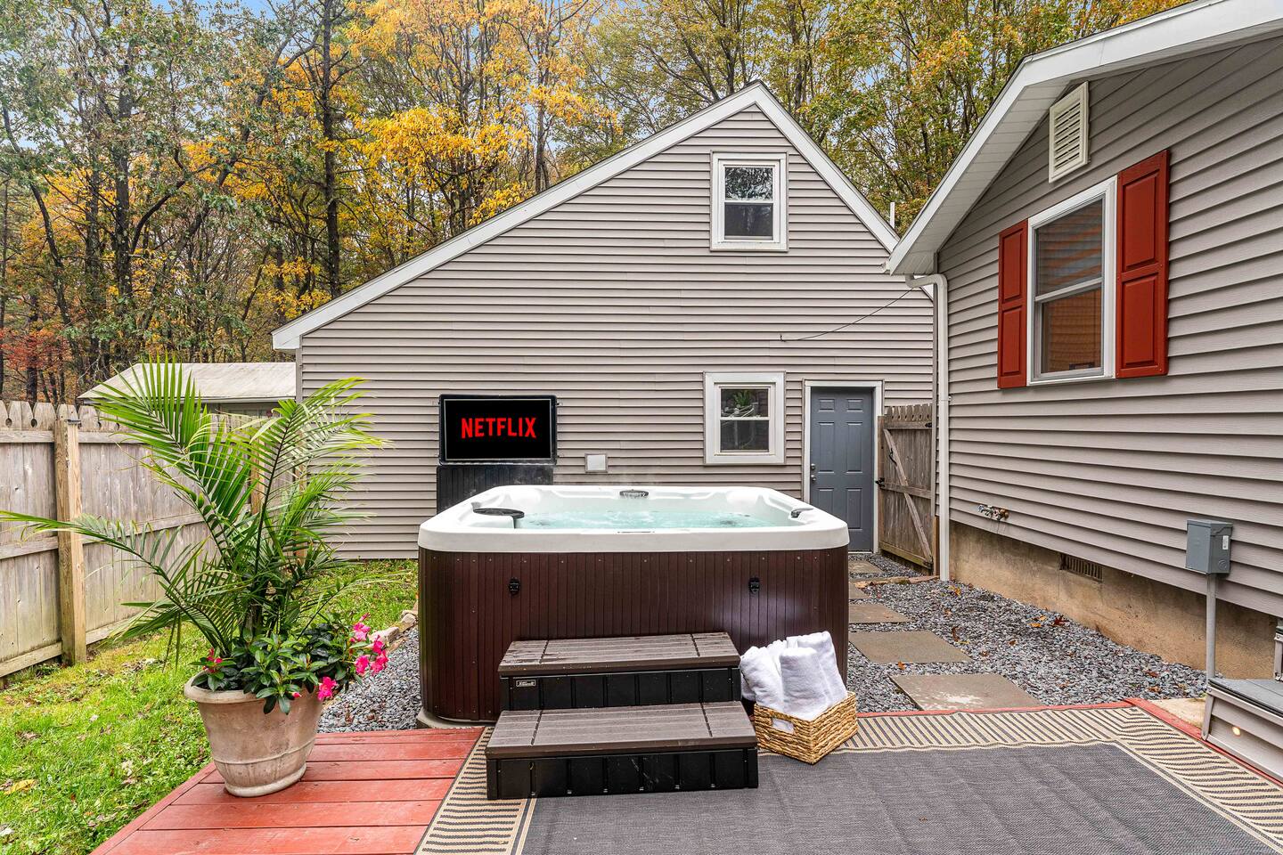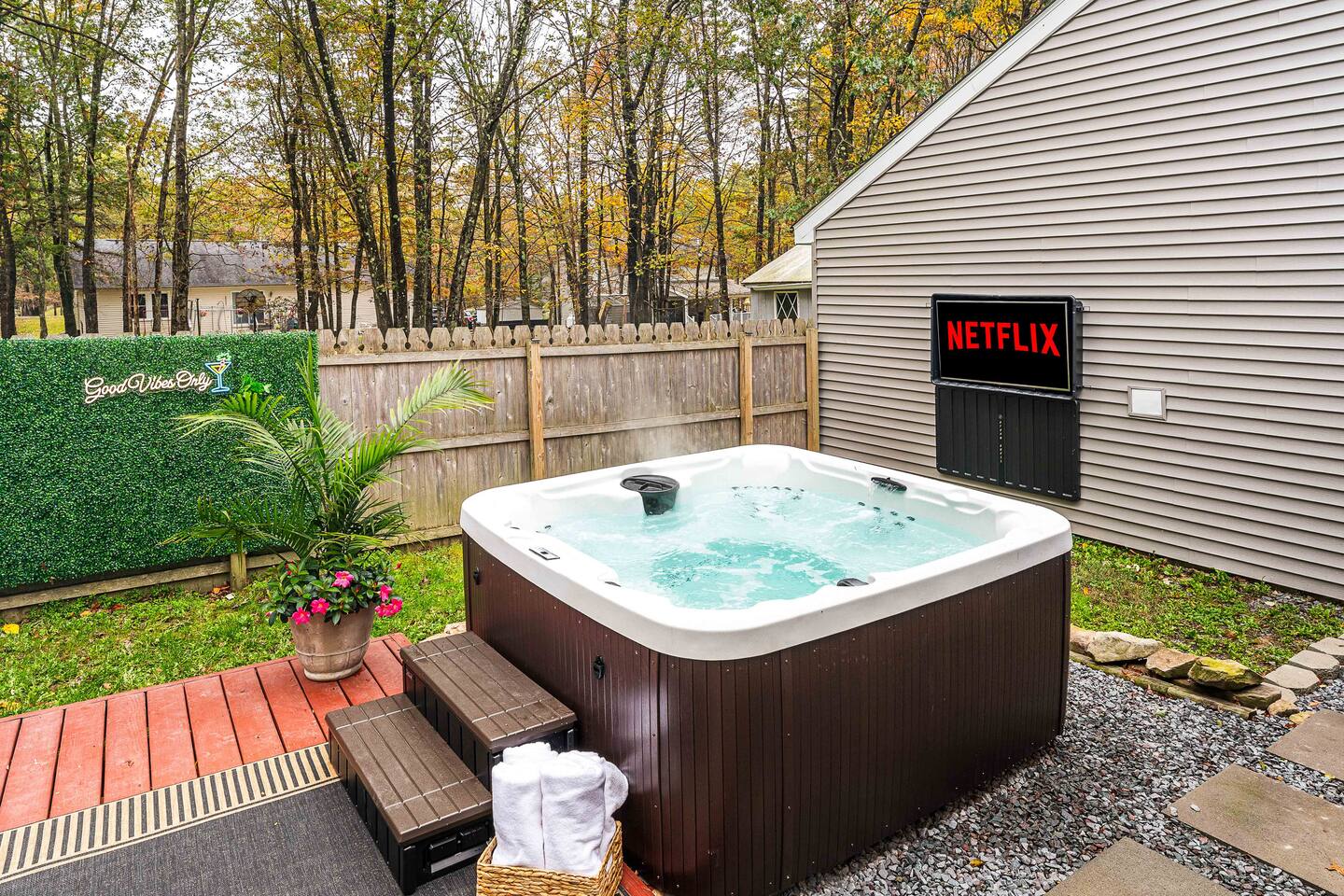 Stylish 2BD Cabin in the Poconos with a fully fenced backyard packed with every amenity you can dream of! Relax in the hot tub, enjoy movies on the outdoor TV, or gather by the real wood fire pit with swings and a chic wood bench. Take pictures by the grass wall with a neon sign, grill on the BBQ, or unwind on the deck with a gas fire pit. Inside, enjoy modern décor, a cozy gas fireplace, full kitchen, laundry, and front porch perfect for morning coffee. Close to all main Pocono attractions!
