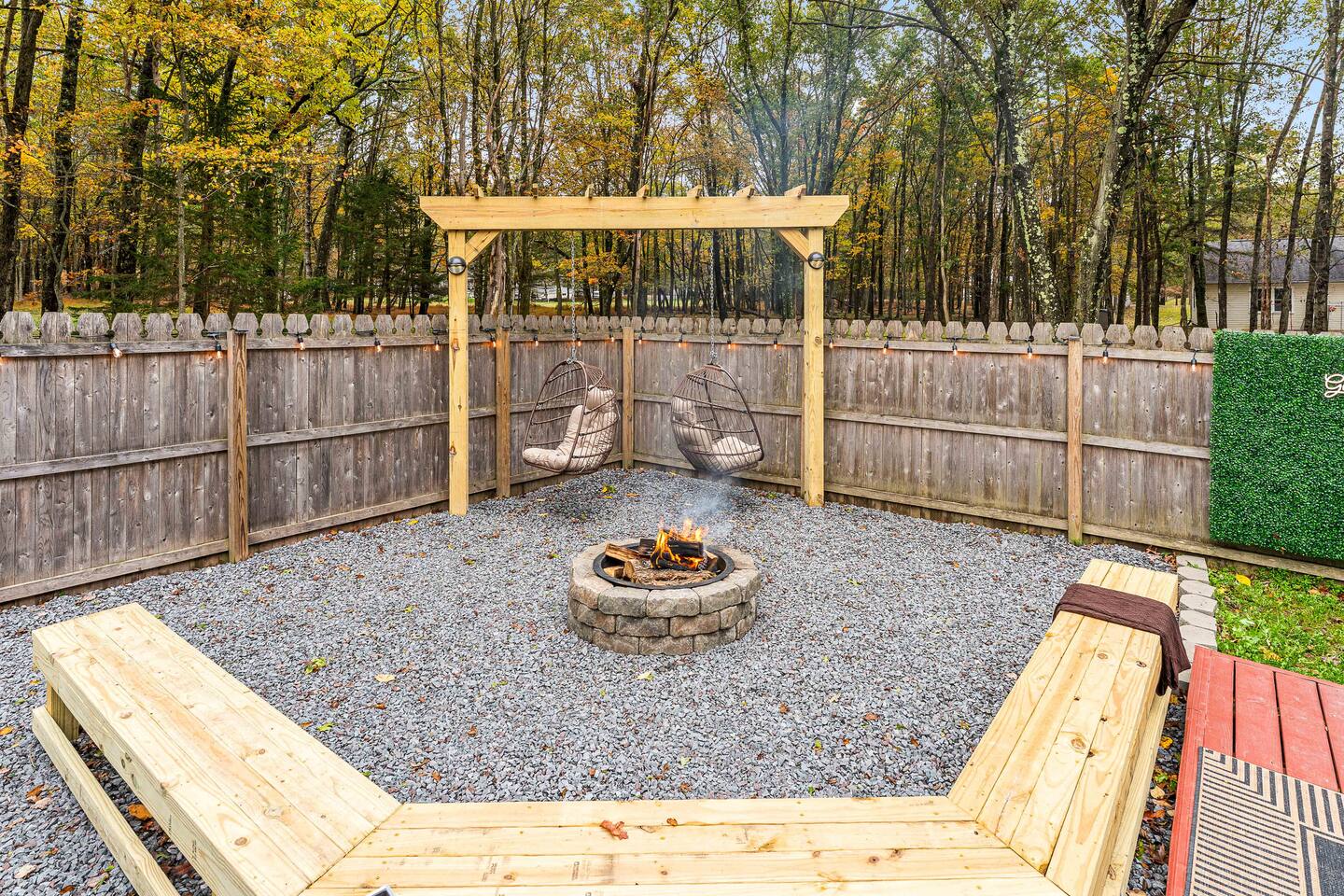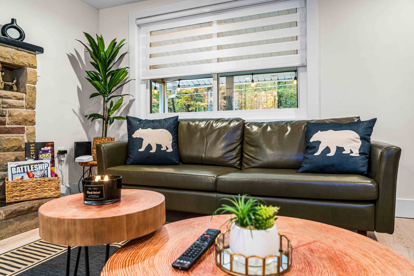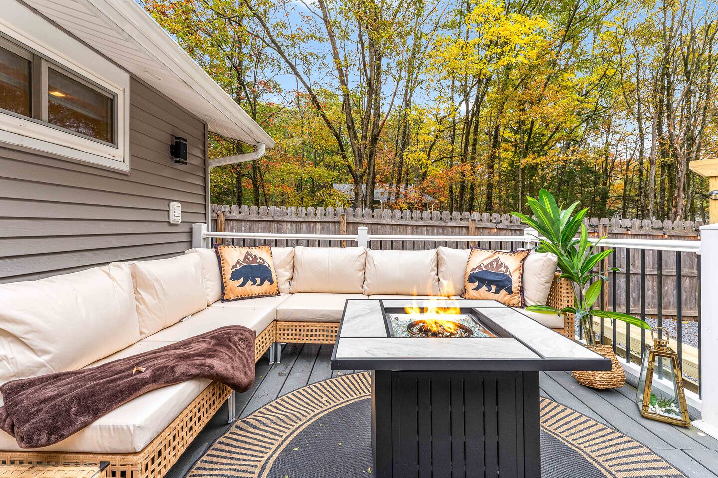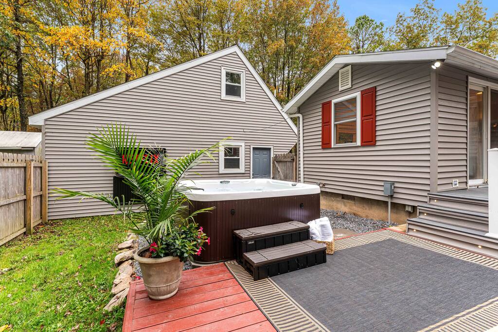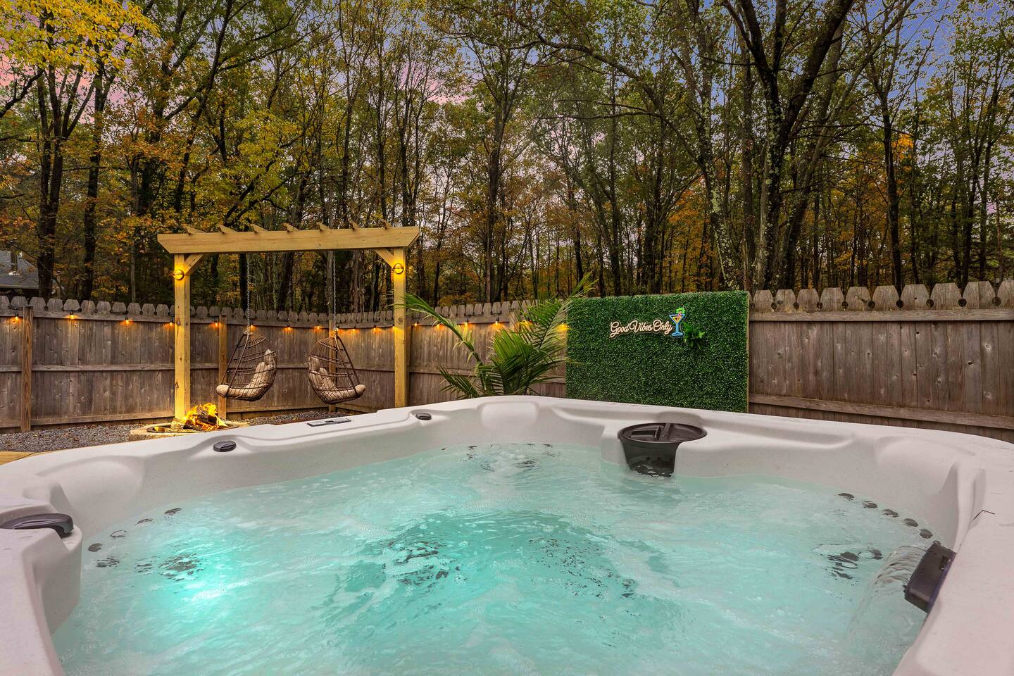 Stylish 2BD Cabin in the Poconos with a fully fenced backyard packed with every amenity you can dream of! Relax in the hot tub, enjoy movies on the outdoor TV, or gather by the real wood fire pit with swings and a chic wood bench. Take pictures by the grass wall with a neon sign, grill on the BBQ, or unwind on the deck with a gas fire pit. Inside, enjoy modern décor, a cozy gas fireplace, full kitchen, laundry, and front porch perfect for morning coffee. Close to all main Pocono attractions!