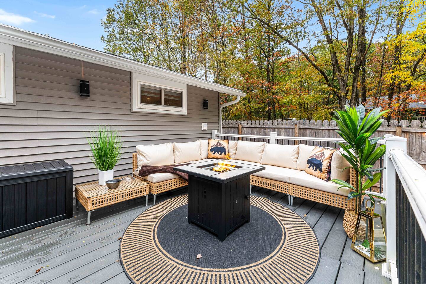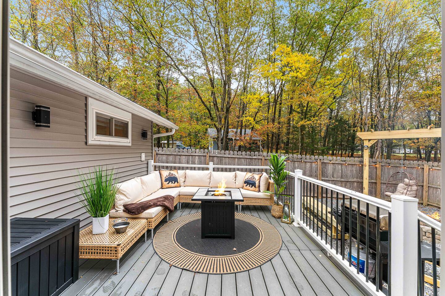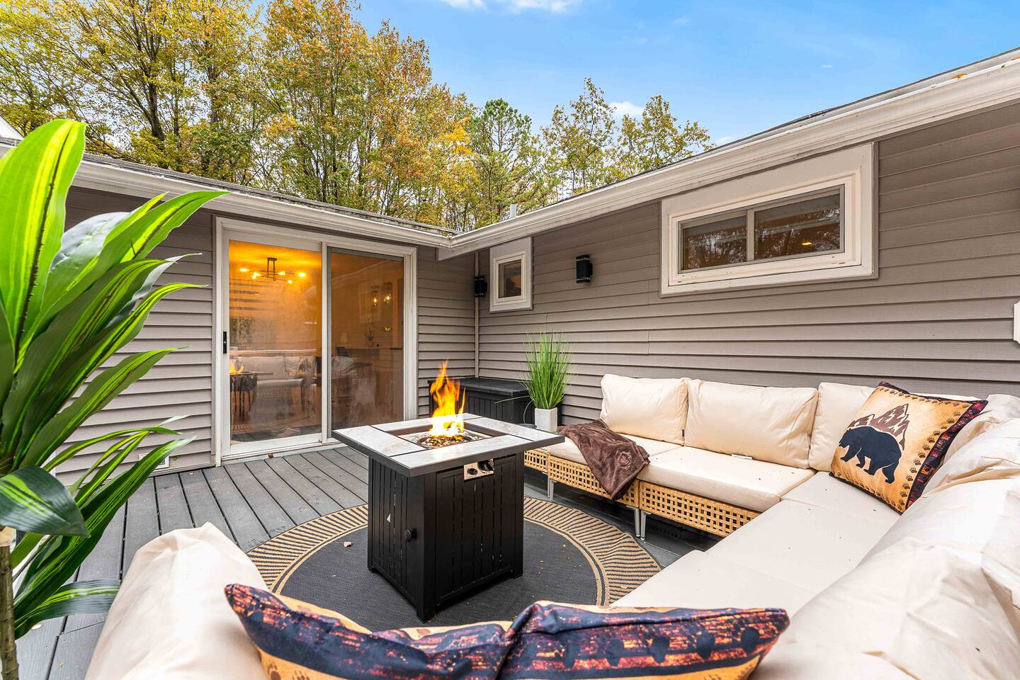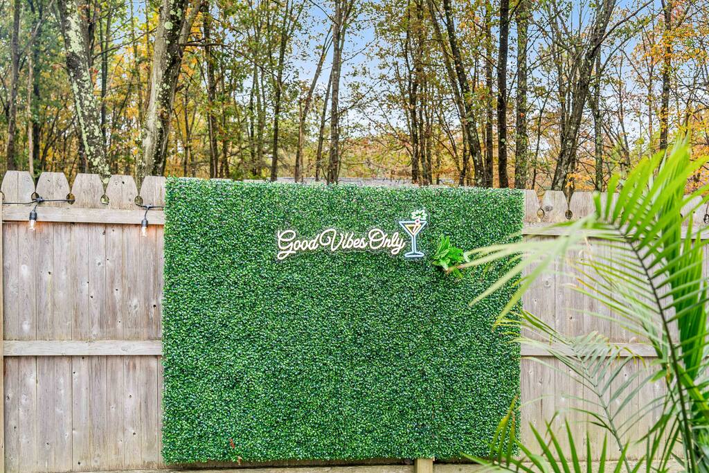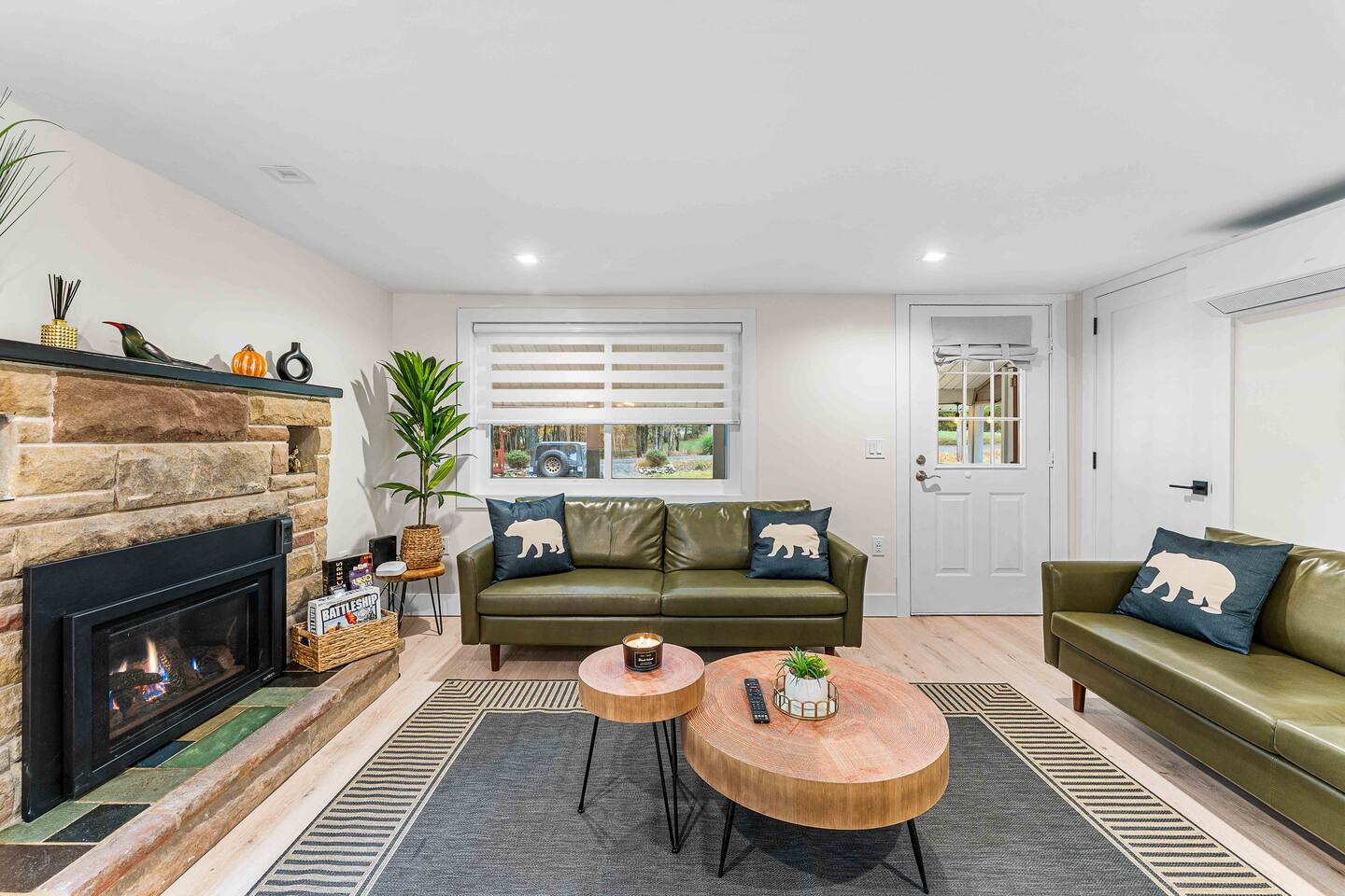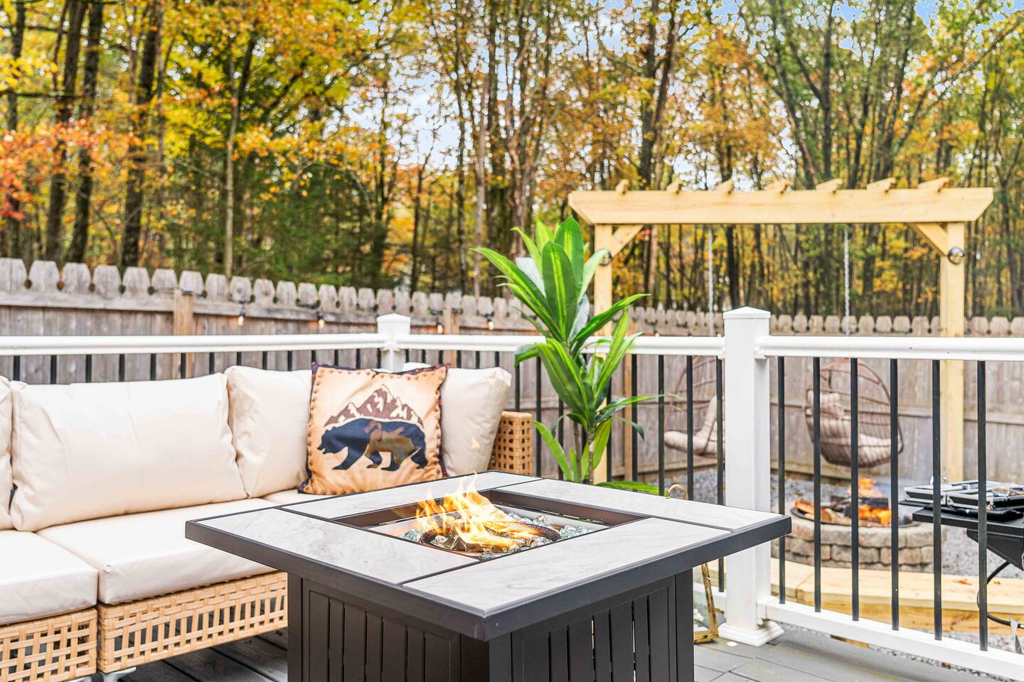 Stylish 2BD Cabin in the Poconos with a fully fenced backyard packed with every amenity you can dream of! Relax in the hot tub, enjoy movies on the outdoor TV, or gather by the real wood fire pit with swings and a chic wood bench. Take pictures by the grass wall with a neon sign, grill on the BBQ, or unwind on the deck with a gas fire pit. Inside, enjoy modern décor, a cozy gas fireplace, full kitchen, laundry, and front porch perfect for morning coffee. Close to all main Pocono attractions!