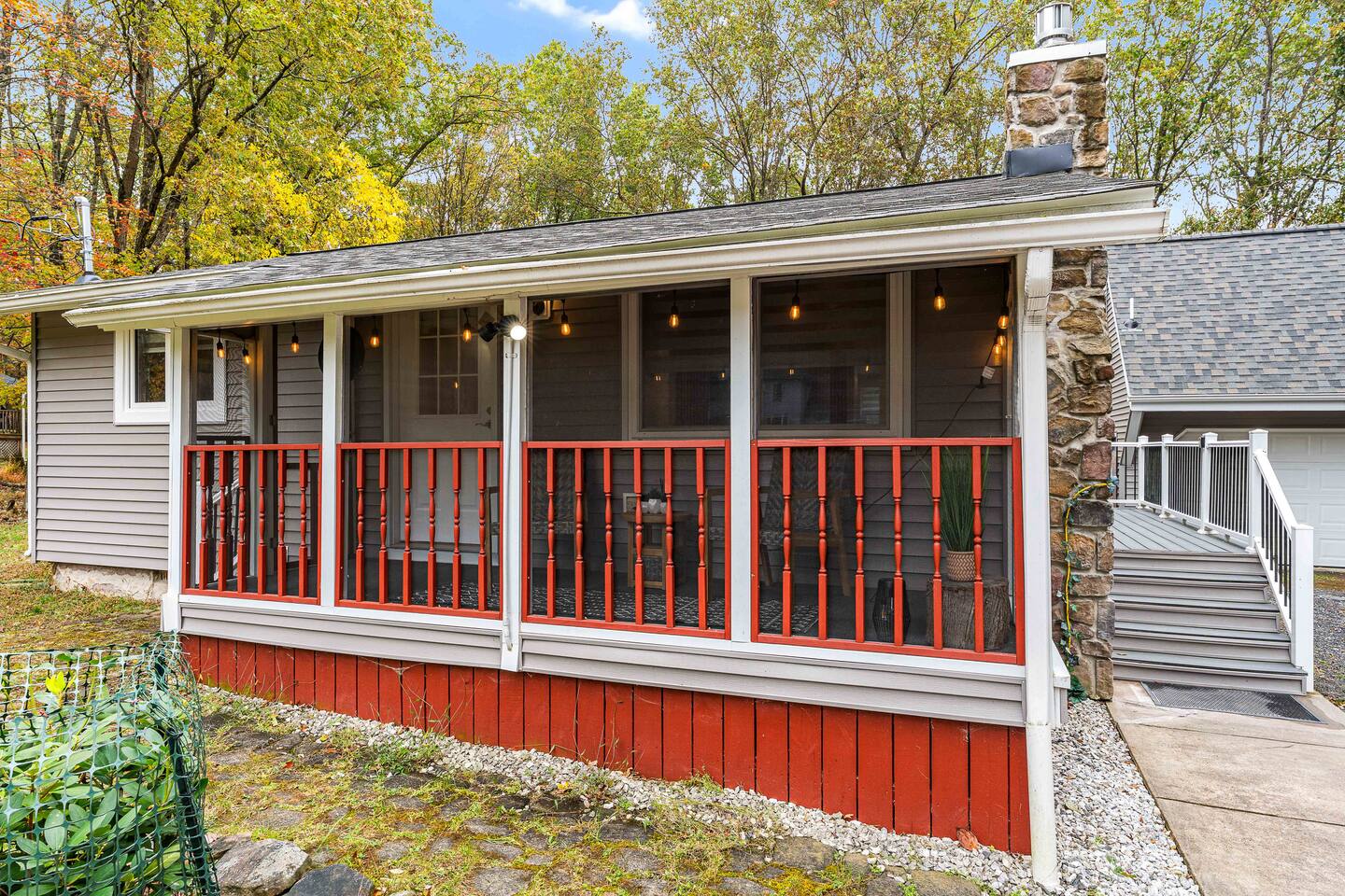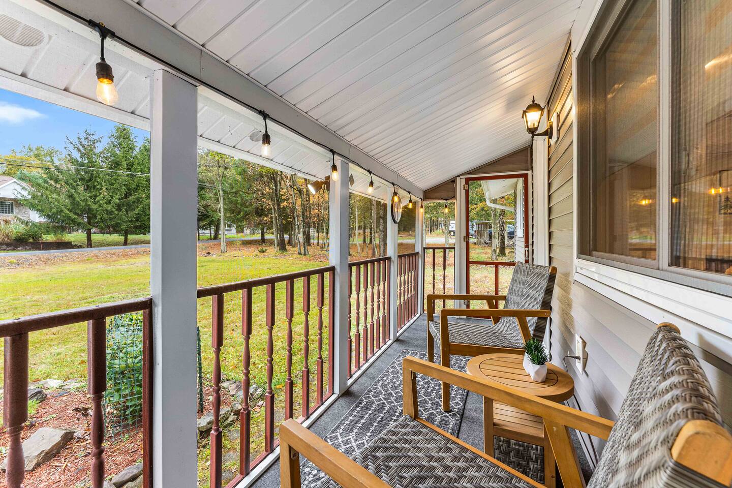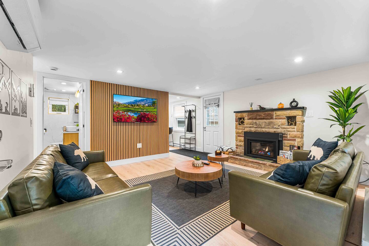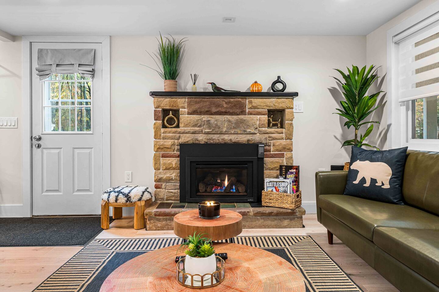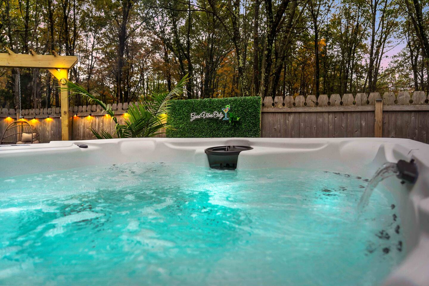 Stylish 2BD Cabin in the Poconos with a fully fenced backyard packed with every amenity you can dream of! Relax in the hot tub, enjoy movies on the outdoor TV, or gather by the real wood fire pit with swings and a chic wood bench. Take pictures by the grass wall with a neon sign, grill on the BBQ, or unwind on the deck with a gas fire pit. Inside, enjoy modern décor, a cozy gas fireplace, full kitchen, laundry, and front porch perfect for morning coffee. Close to all main Pocono attractions!