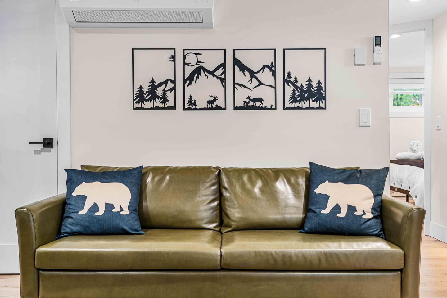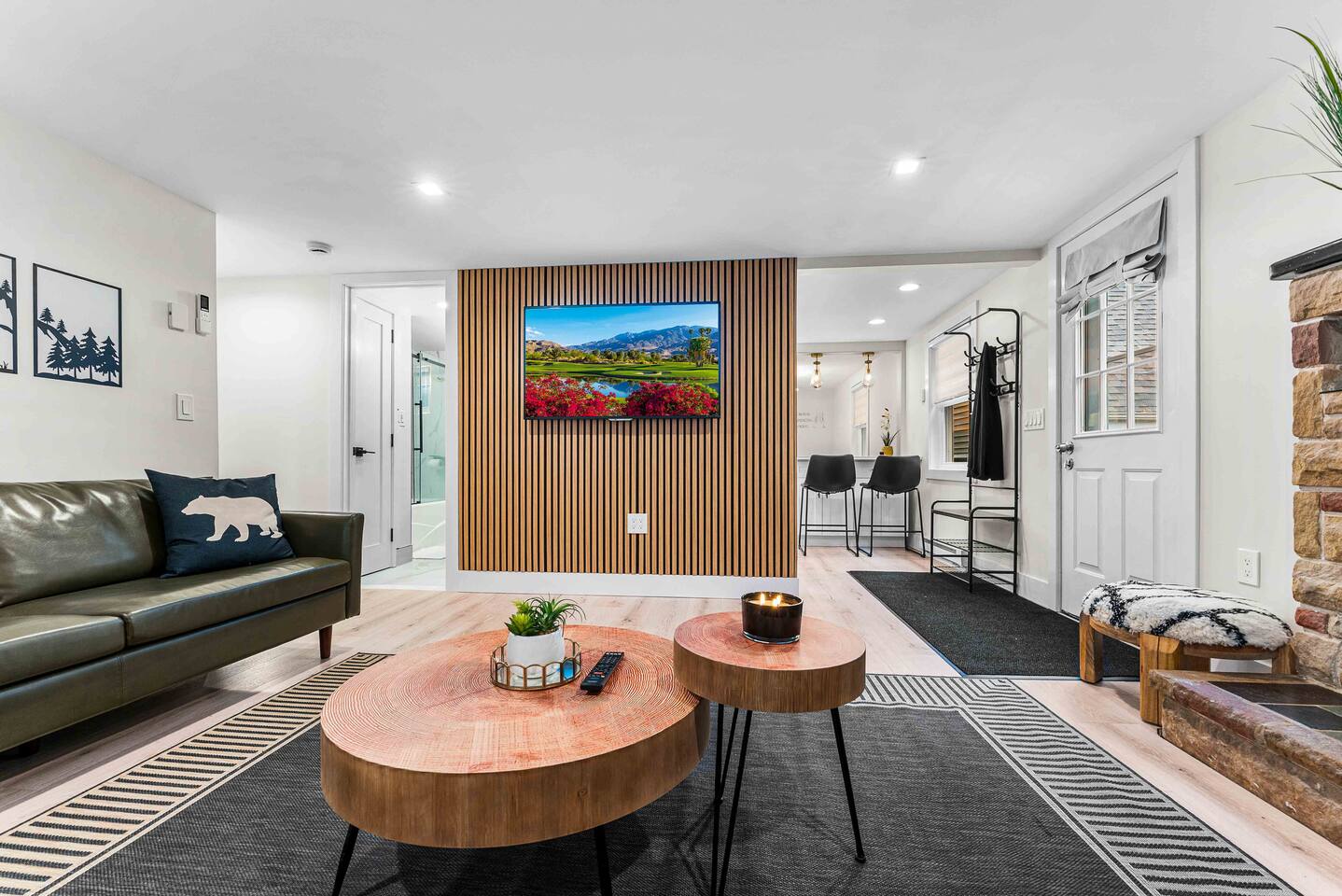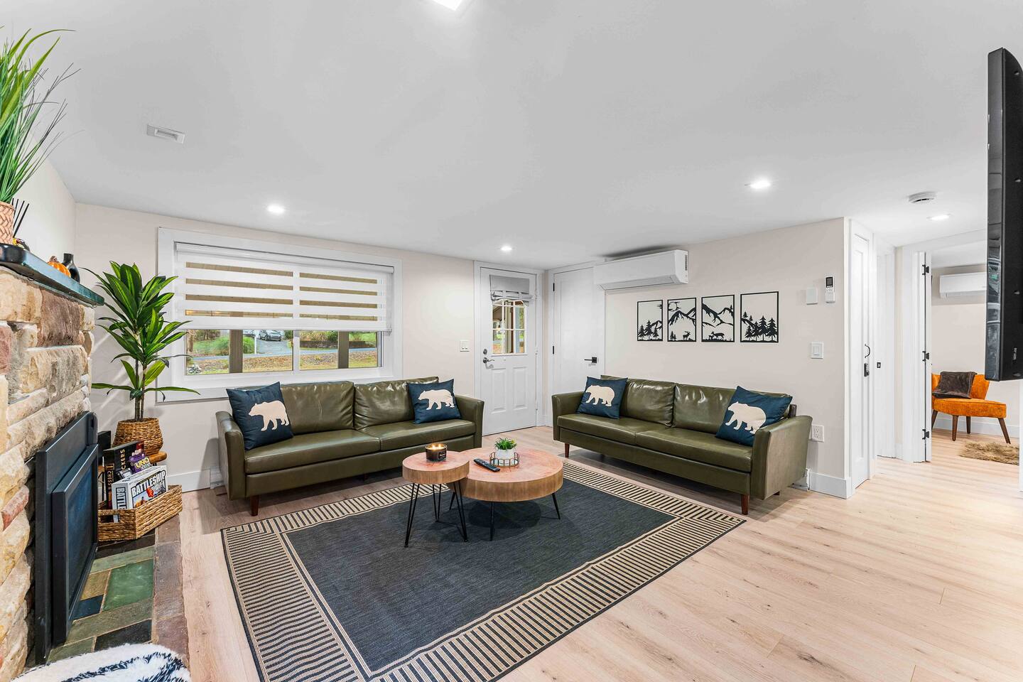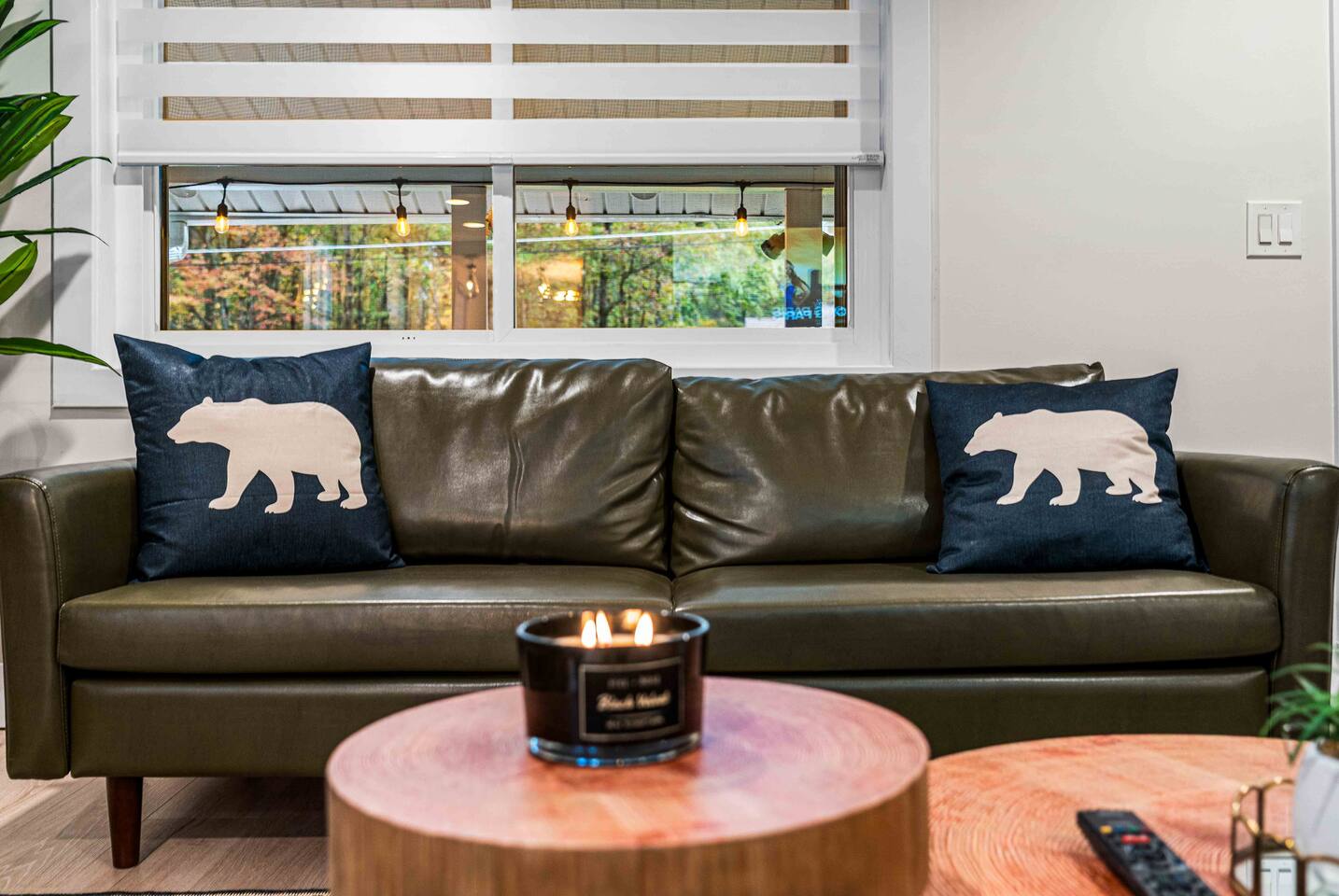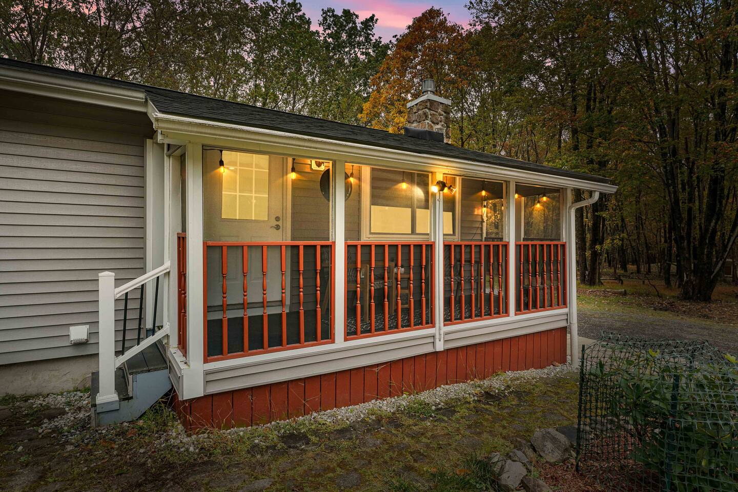 Stylish 2BD Cabin in the Poconos with a fully fenced backyard packed with every amenity you can dream of! Relax in the hot tub, enjoy movies on the outdoor TV, or gather by the real wood fire pit with swings and a chic wood bench. Take pictures by the grass wall with a neon sign, grill on the BBQ, or unwind on the deck with a gas fire pit. Inside, enjoy modern décor, a cozy gas fireplace, full kitchen, laundry, and front porch perfect for morning coffee. Close to all main Pocono attractions!