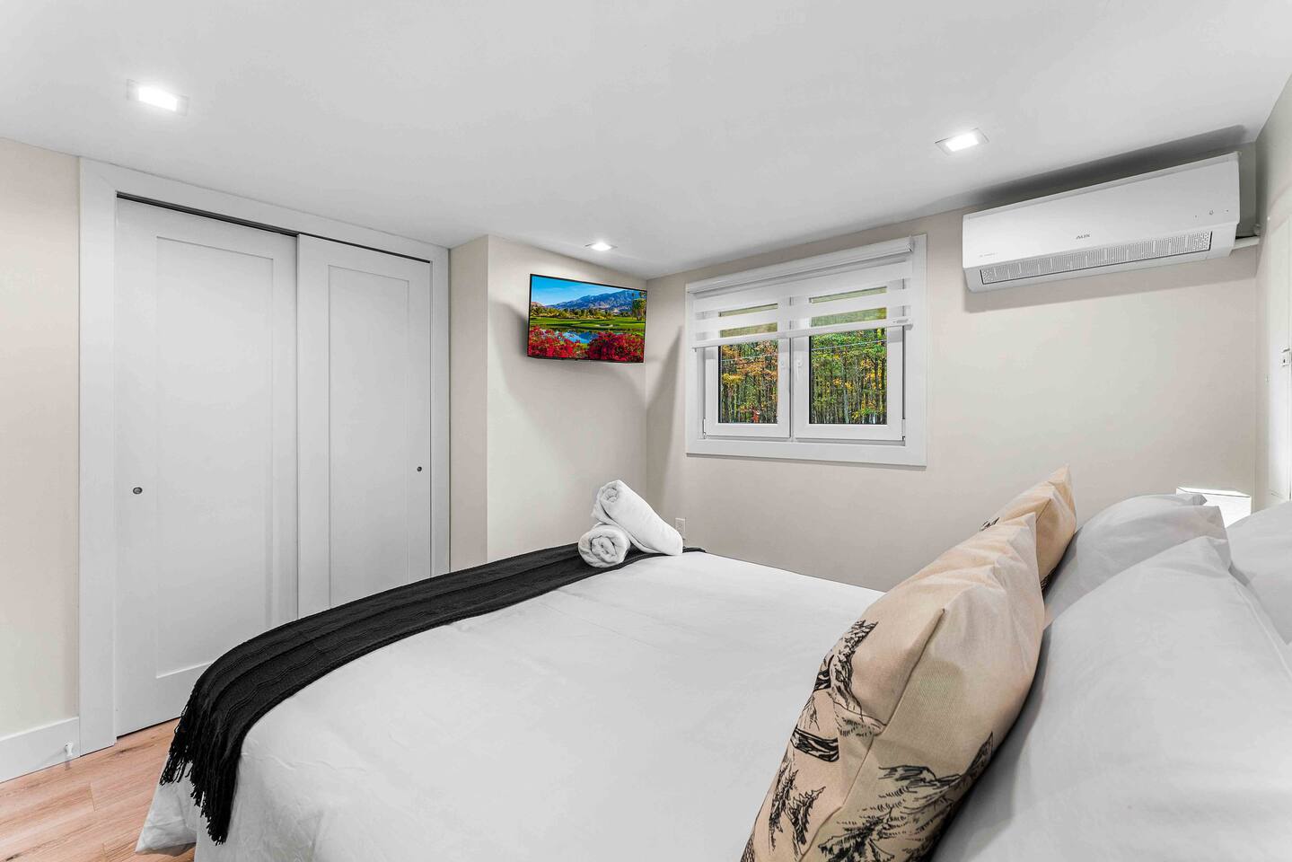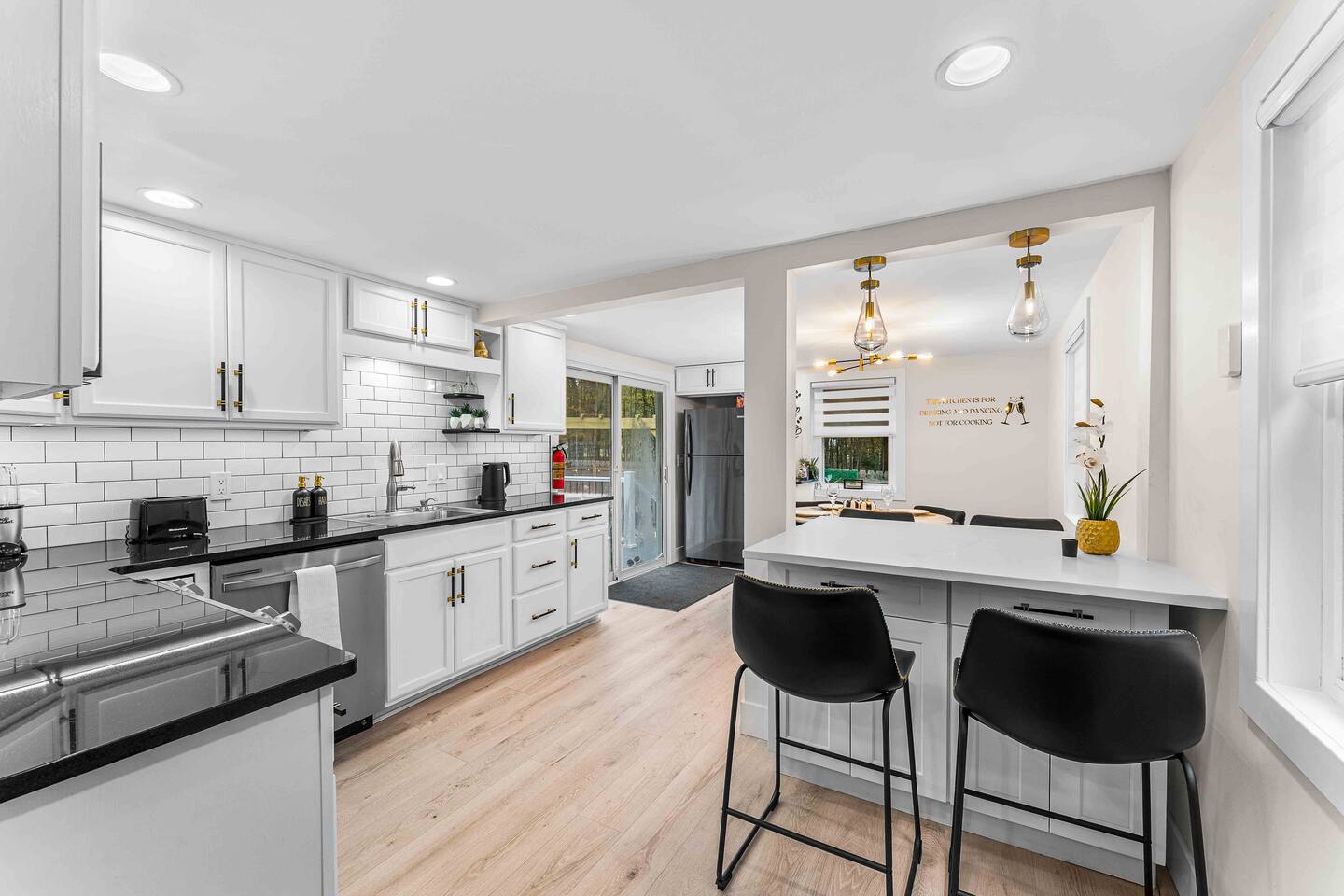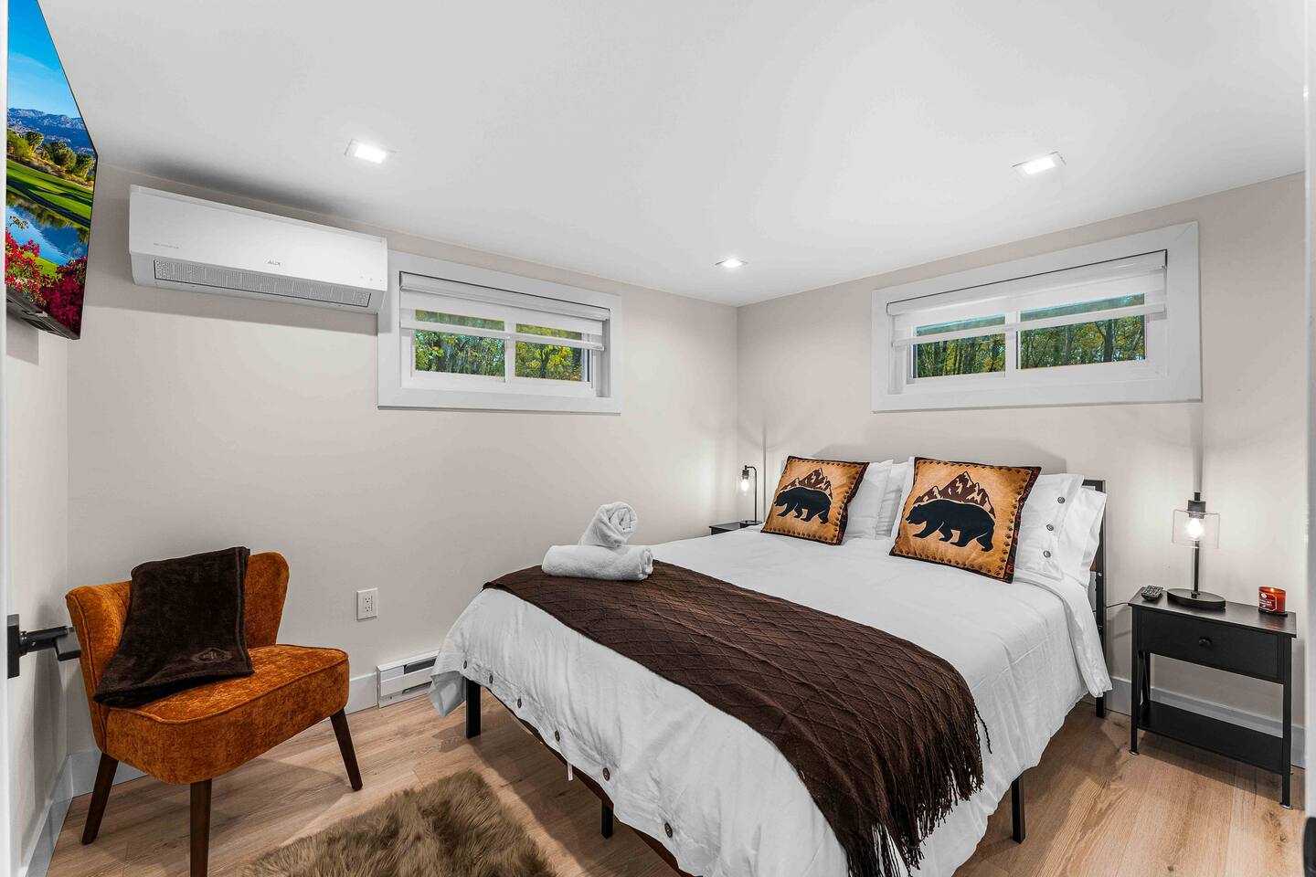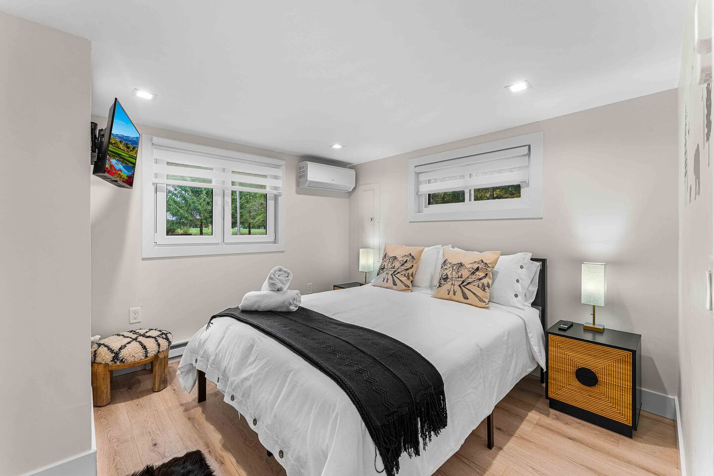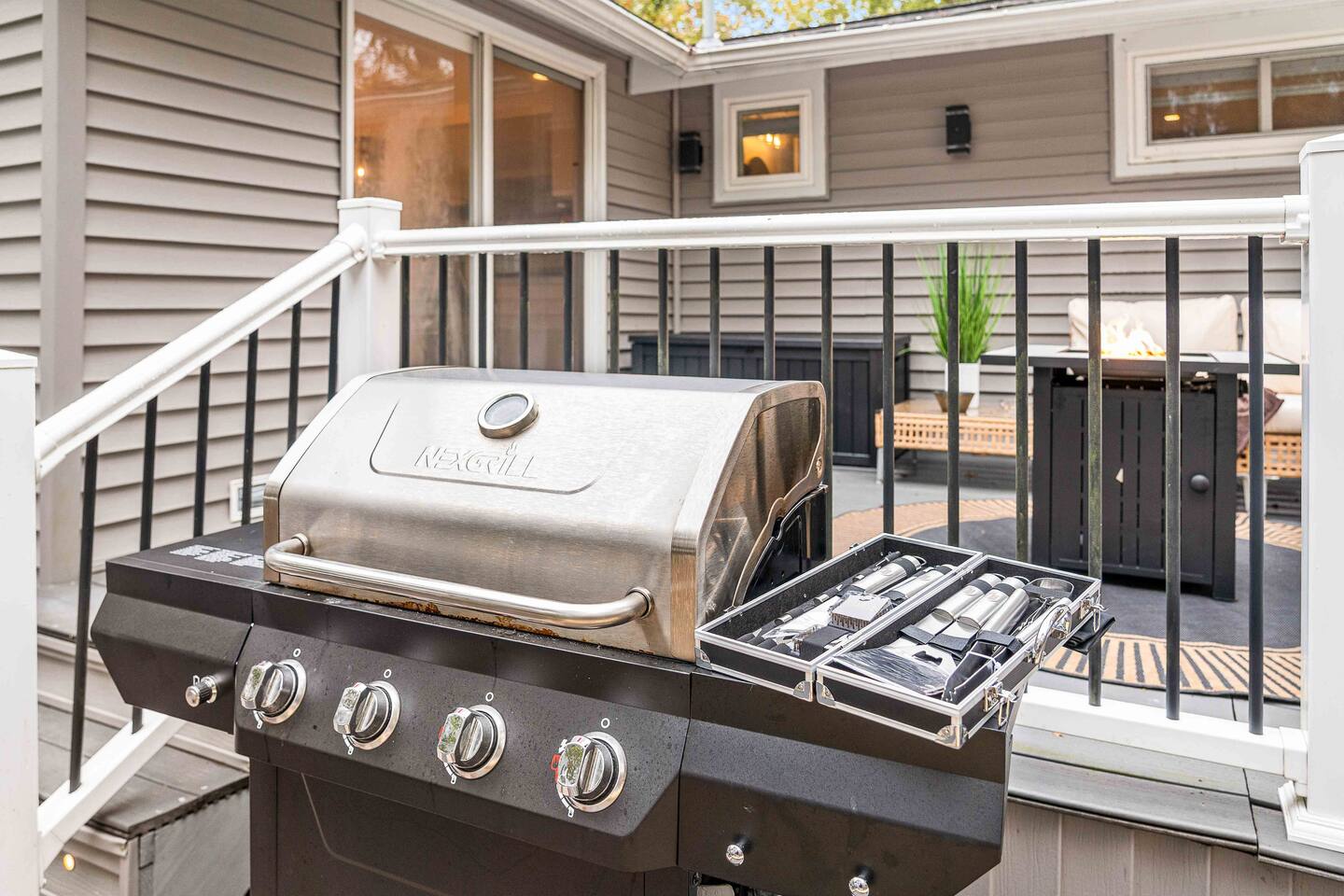 WELCOME TO OUR CABIN We are so happy to host you and hope you enjoy every moment of your stay! This cozy and stylish home is designed for comfort, relaxation, and creating special memories with family and friends. INSIDE As you enter through the side entrance, you’ll be welcomed by an open-concept space filled with warmth and light. To the right, a fully equipped kitchen features an eat-in island and a round dining table—perfect for shared meals. From here, you can step out to the deck or backyard for fresh air and outdoor enjoyment. Across from the entrance, the living room offers a gas fireplace and a smart TV—ideal for movie nights or board games. Connected to it is a bright sunroom with a sitting area, leading directly to the front yard. Behind the door next to the sunroom, you’ll find a stackable washer and dryer for your convenience. Down the hallway, the first door on the right is a full bathroom with a tub and shower combo. The closet opposite is for owners’ use. At the end of the hallway are two bedrooms, each with a queen-size bed, closet, and TV for your comfort. Sleeping arrangement can accommodate up to 6 guests, with 2 queen size bedrooms we have and 2 air mattresses. DECK Relax on the deck’s cozy sitting area with a gas firepit, perfect for morning coffee or evening chats. A few steps down lead you to the backyard oasis. BACKYARD Unwind in the electric hot tub while enjoying your favorite shows on the outdoor TV. Fire up the propane BBQ for a delicious meal, or capture fun moments by the artificial grass wall with a neon sign. Gather around the wood fire pit, complete with a wooden bench and swing set—an inviting spot for s’mores and stories. The fully fenced yard ensures privacy and safety for all. Please note: Guests do not have access to the garage.