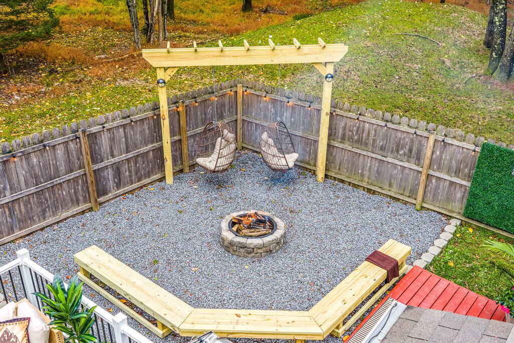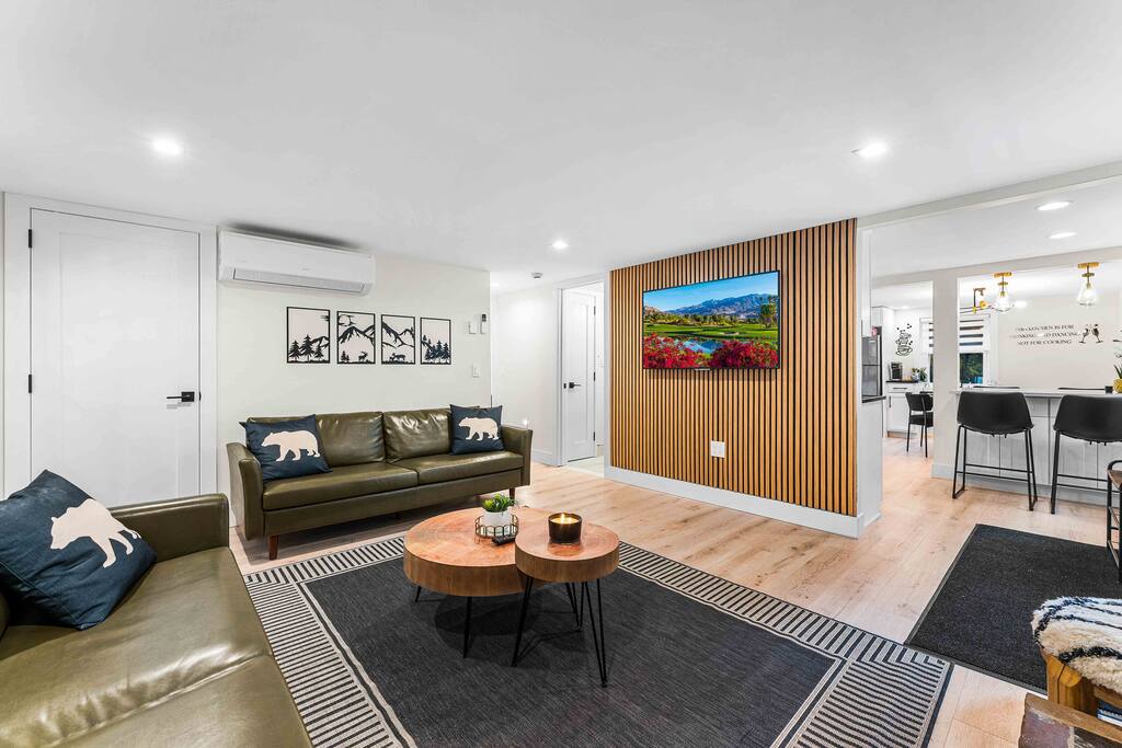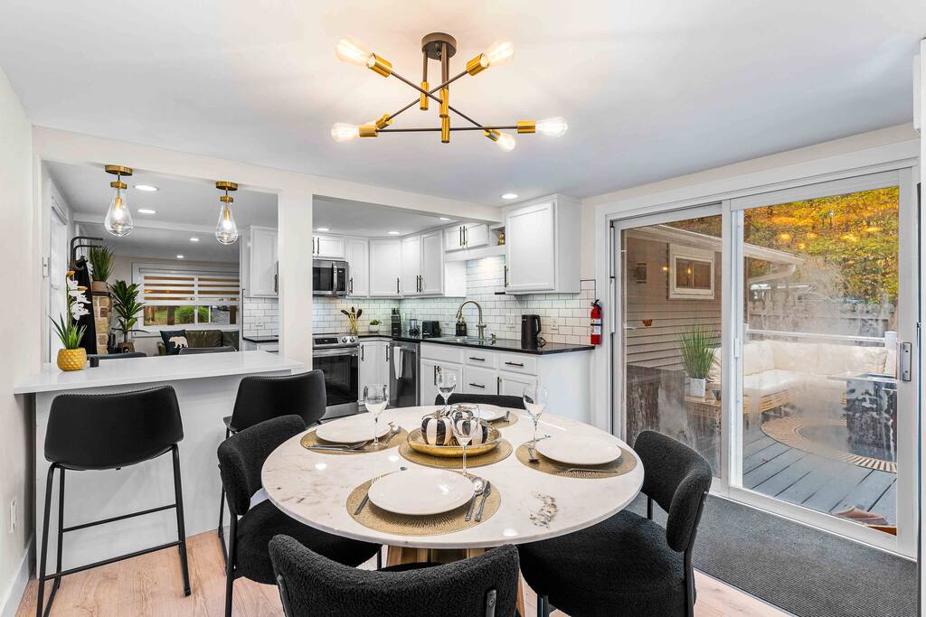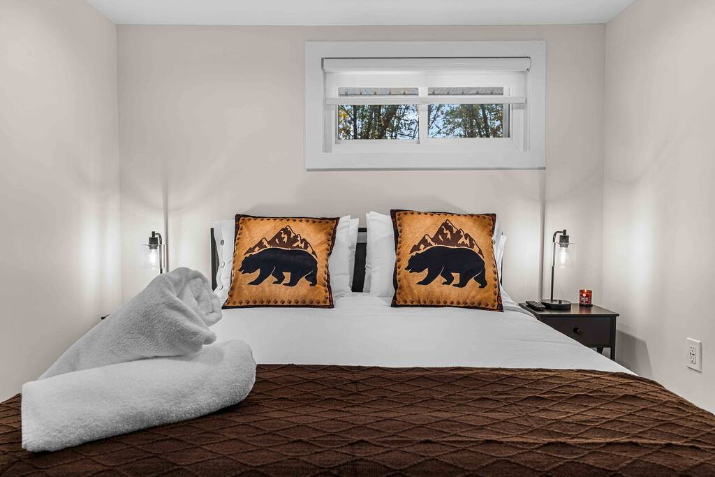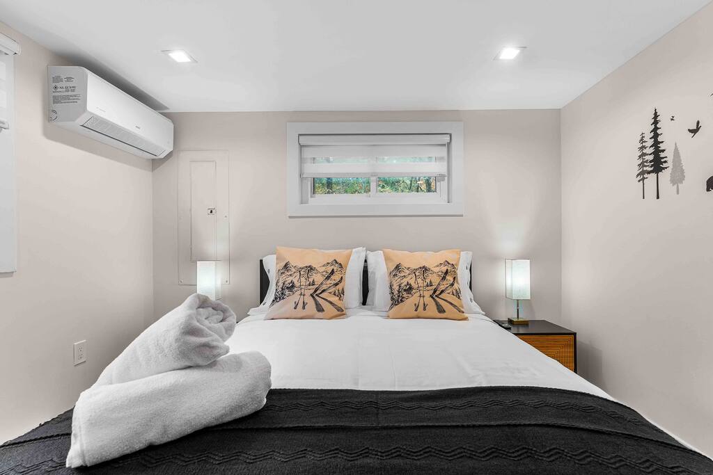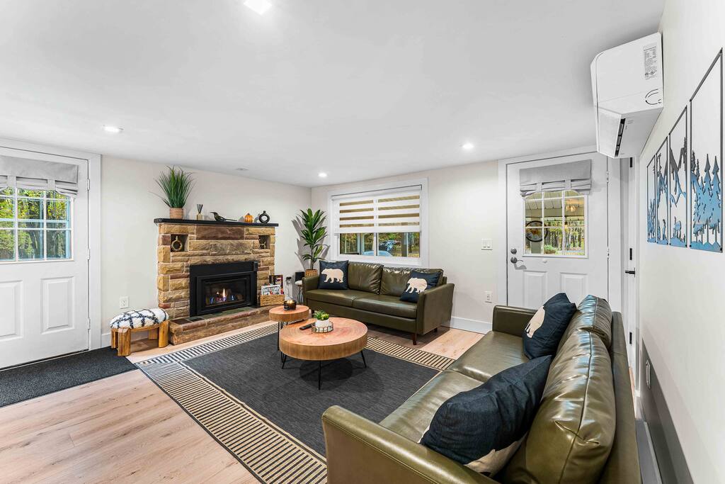WELCOME TO OUR CABIN We are so happy to host you and hope you enjoy every moment of your stay! This cozy and stylish home is designed for comfort, relaxation, and creating special memories with family and friends. INSIDE As you enter through the side entrance, you’ll be welcomed by an open-concept space filled with warmth and light. To the right, a fully equipped kitchen features an eat-in island and a round dining table—perfect for shared meals. From here, you can step out to the deck or backyard for fresh air and outdoor enjoyment. Across from the entrance, the living room offers a gas fireplace and a smart TV—ideal for movie nights or board games. Connected to it is a bright sunroom with a sitting area, leading directly to the front yard. Behind the door next to the sunroom, you’ll find a stackable washer and dryer for your convenience. Down the hallway, the first door on the right is a full bathroom with a tub and shower combo. The closet opposite is for owners’ use. At the end of the hallway are two bedrooms, each with a queen-size bed, closet, and TV for your comfort. DECK Relax on the deck’s cozy sitting area with a gas firepit, perfect for morning coffee or evening chats. A few steps down lead you to the backyard oasis. BACKYARD Unwind in the electric hot tub while enjoying your favorite shows on the outdoor TV. Fire up the propane BBQ for a delicious meal, or capture fun moments by the artificial grass wall with a neon sign. Gather around the wood fire pit, complete with a wooden bench and swing set—an inviting spot for s’mores and stories. The fully fenced yard ensures privacy and safety for all. Please note: Guests do not have access to the garage.