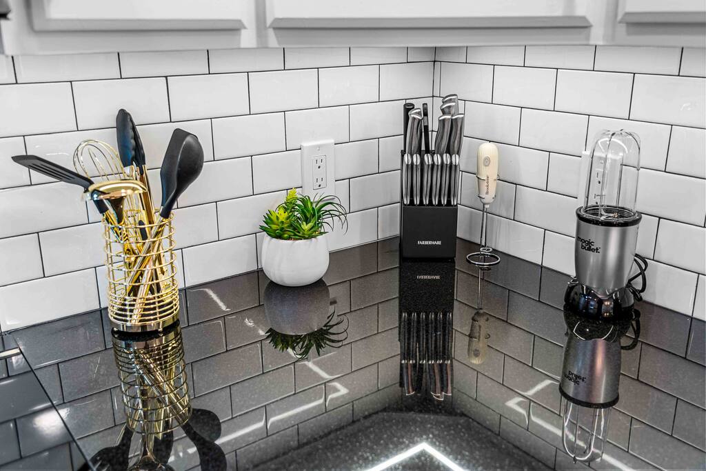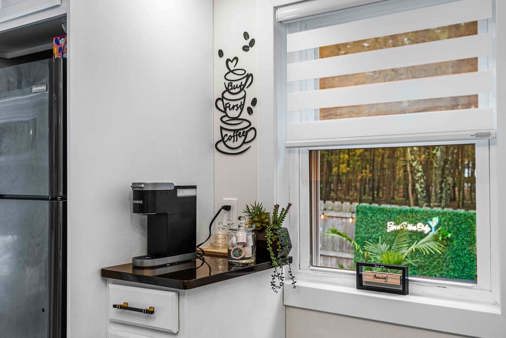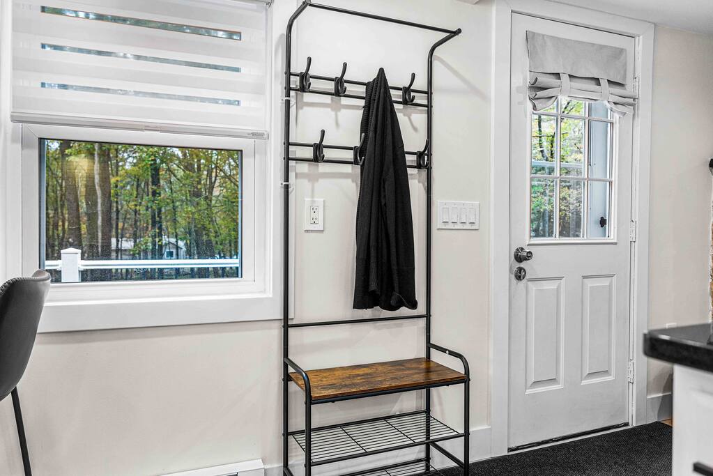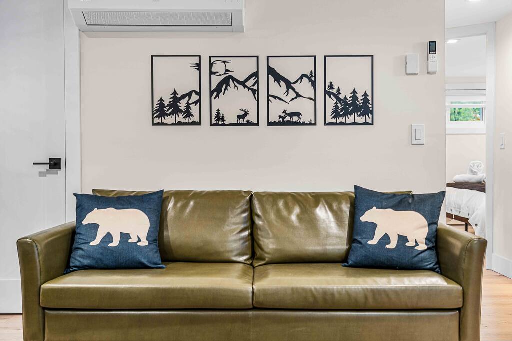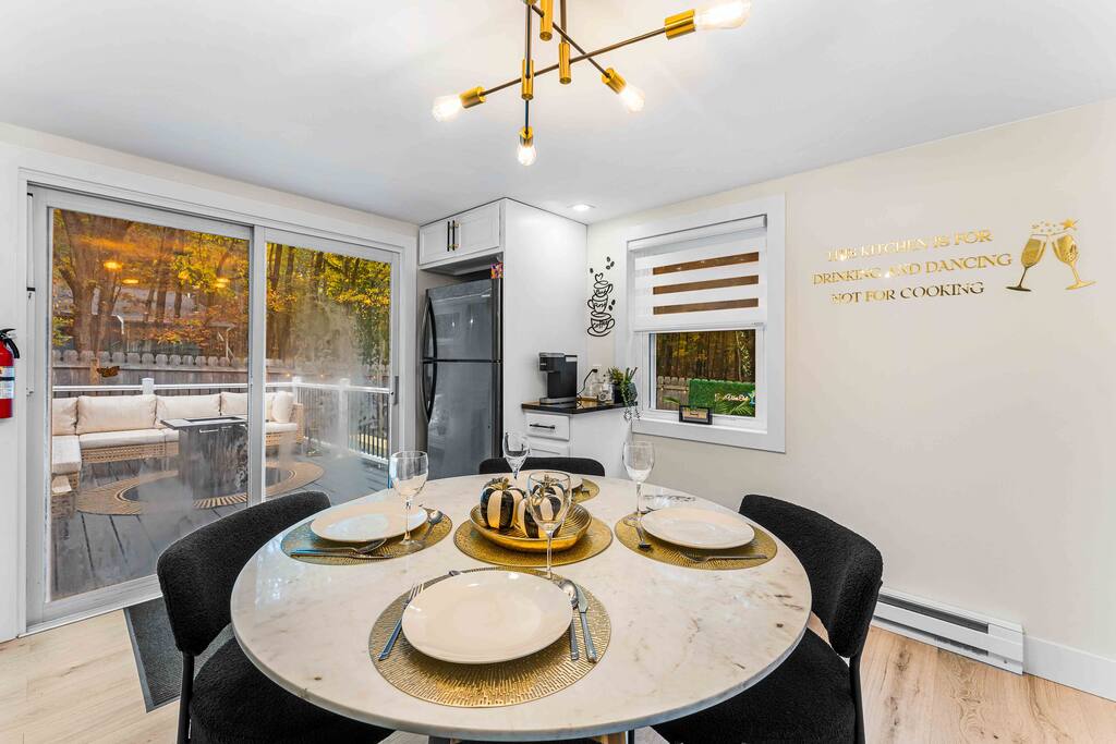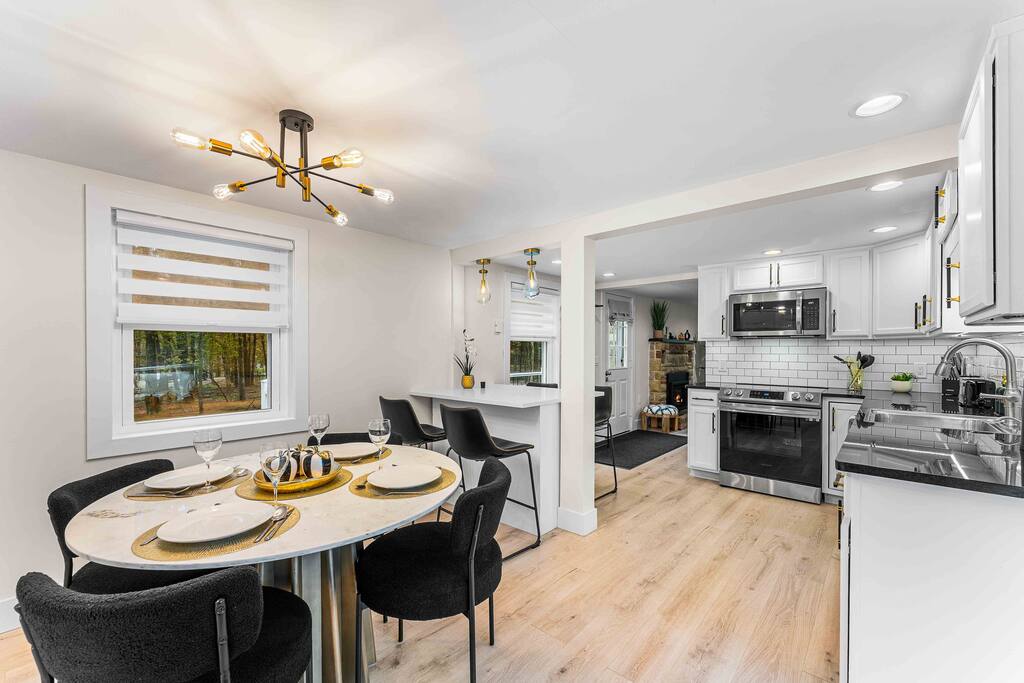 WELCOME TO OUR CABIN We are so happy to host you and hope you enjoy every moment of your stay! This cozy and stylish home is designed for comfort, relaxation, and creating special memories with family and friends. INSIDE As you enter through the side entrance, you’ll be welcomed by an open-concept space filled with warmth and light. To the right, a fully equipped kitchen features an eat-in island and a round dining table—perfect for shared meals. From here, you can step out to the deck or backyard for fresh air and outdoor enjoyment. Across from the entrance, the living room offers a gas fireplace and a smart TV—ideal for movie nights or board games. Connected to it is a bright sunroom with a sitting area, leading directly to the front yard. Behind the door next to the sunroom, you’ll find a stackable washer and dryer for your convenience. Down the hallway, the first door on the right is a full bathroom with a tub and shower combo. The closet opposite is for owners’ use. At the end of the hallway are two bedrooms, each with a queen-size bed, closet, and TV for your comfort. DECK Relax on the deck’s cozy sitting area with a gas firepit, perfect for morning coffee or evening chats. A few steps down lead you to the backyard oasis. BACKYARD Unwind in the electric hot tub while enjoying your favorite shows on the outdoor TV. Fire up the propane BBQ for a delicious meal, or capture fun moments by the artificial grass wall with a neon sign. Gather around the wood fire pit, complete with a wooden bench and swing set—an inviting spot for s’mores and stories. The fully fenced yard ensures privacy and safety for all. Please note: Guests do not have access to the garage.