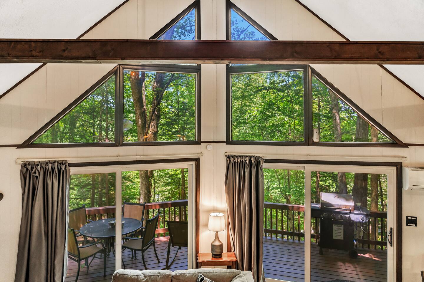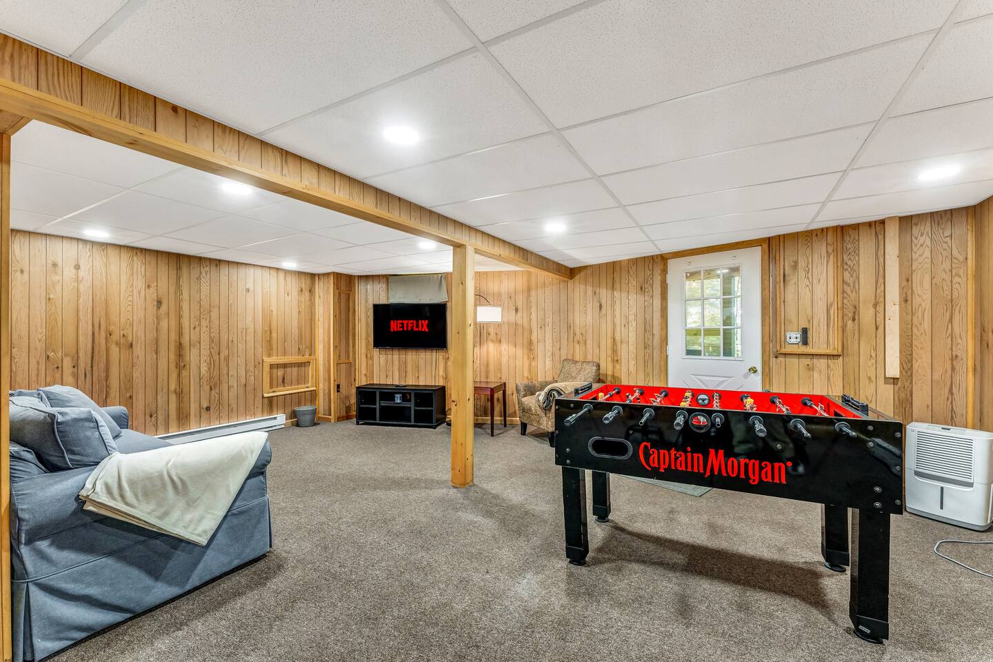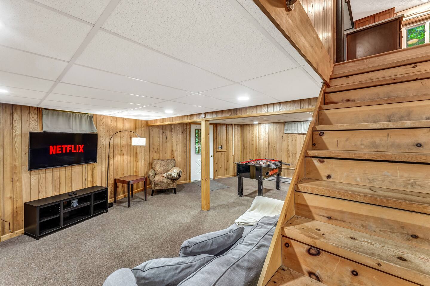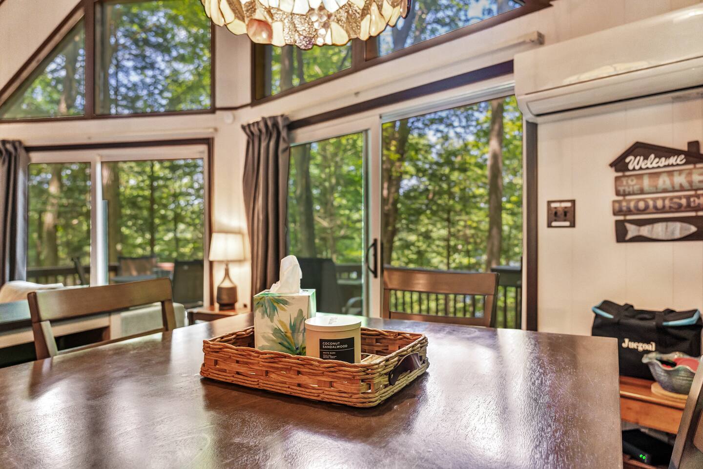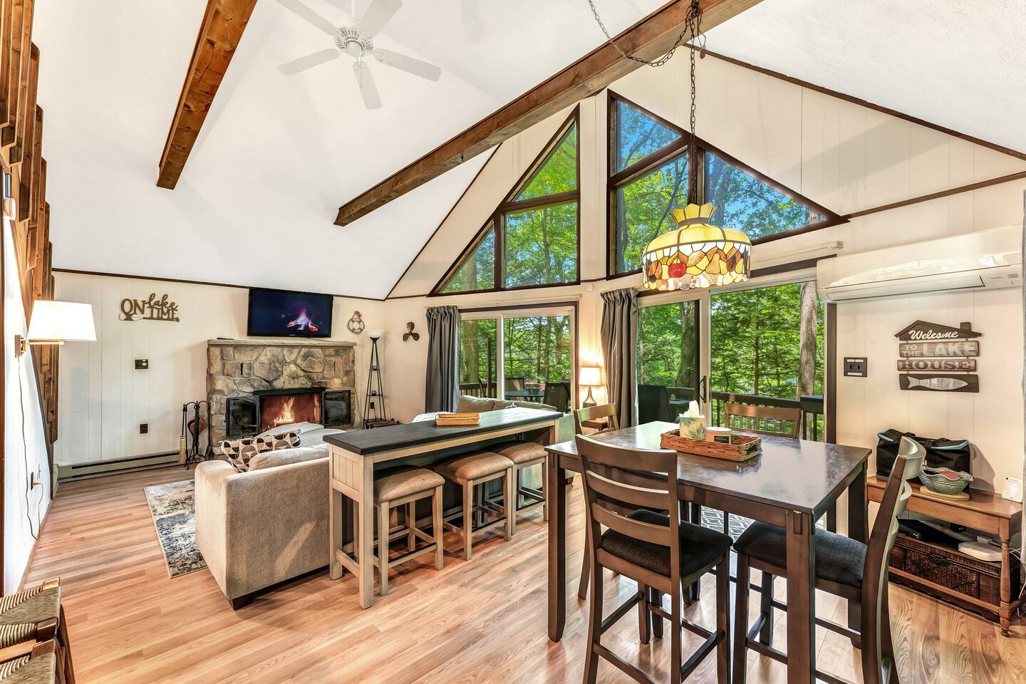 Feel Free to Review the Video of our Property! UPPER LEVEL: Enjoy the comfort of the primary suite featuring a luxurious king-sized bed and a Roku TV for entertainment. For extra sleeping arrangements, there's an additional single bed that rolls out to another single bed, perfect for families or groups needing flexibility. The suite connects to a small hallway where you'll find a locked closet designated for owner use. A full bathroom with a shower completes this level, offering privacy and convenience. Continuing through the hallway you will find another Bedroom with two full beds and a half bathroom. MIDDLE LEVEL: Main Living area offers spacious living space perfect for relaxation. Gather around the wood-burning fireplace on chilly evenings, or unwind in front of the TV after a day of adventure. The cozy living room is designed for comfort and features ample seating for everyone. Adjacent to the living room is the dining area perfect for family meals or group gatherings. The nearby kitchen is equipped with modern appliances, making meal preparation a breeze. Whether you're whipping up breakfast or cooking a gourmet dinner, you'll find everything you need right at your fingertips. A full bathroom with a shower is conveniently located on this level, ensuring everyone has easy access to facilities without having to climb stairs. Bedrooms on Middle Level: On this level, you'll find two additional bedrooms: One bedroom features a comfortable full-sized bed, perfect for a couple or individual seeking privacy and relaxation. The second bedroom offers a full bunk bed setup, with a single bed over a full-sized bed. This arrangement is ideal for families or groups, providing flexibility and plenty of sleeping space. OUTDOOR DECK: Step outside to our private deck, a perfect spot for enjoying the fresh air and soaking in the beautiful surroundings and seasonal view of Lake Wallenpaupack. Whether you're hosting a barbecue or simply relaxing with a good book, our deck is designed with your comfort in mind. BBQ Grill: Fire up the grill and cook up delicious meals for your family or friends. Dining Table: Gather around the outdoor dining table for al fresco meals under the sun or stars. It's the ideal setting for enjoying your favorite dishes while surrounded by nature. Gas Firepit: As the evening cools down, gather around the cozy gas firepit. Perfect for roasting marshmallows, sharing stories, or simply relaxing with a warm drink, the firepit adds a touch of warmth and ambiance to your outdoor experience. LOWER LEVEL: Descend to our lower level and discover a haven of entertainment and relaxation. Second Living Room: Relax on the comfortable couch and catch up on your favorite shows using the Roku-enabled TV. The foosball table and arcade game add a playful touch, perfect for friendly competitions and hours of entertainment. Laundry Room: Conveniently located on the lower level, our laundry room is equipped with a washer and dryer, making it easy to keep your clothes clean and fresh during your stay. Lower Level Deck: Step outside to the lower level deck, where you'll find even more amenities designed for outdoor enjoyment. Wood Burning Hot Tub: Unwind and soothe your muscles in our wood burning hot tub, surrounded by the tranquil ambiance of the outdoors. Please note that we do not provide wood for the hot tub, but it is available for purchase. Outdoor TV: Watch your favorite movies or sports games outdoors with our dedicated outdoor TV, combining the pleasures of soaking in the hot tub with entertainment. ADDITIONAL AMENITIES: Throughout the home, you'll find high-speed Wi-Fi, air conditioning for summer comfort, and heating to keep you warm during cooler months. Lots of parking for multiple cars or even a boat.