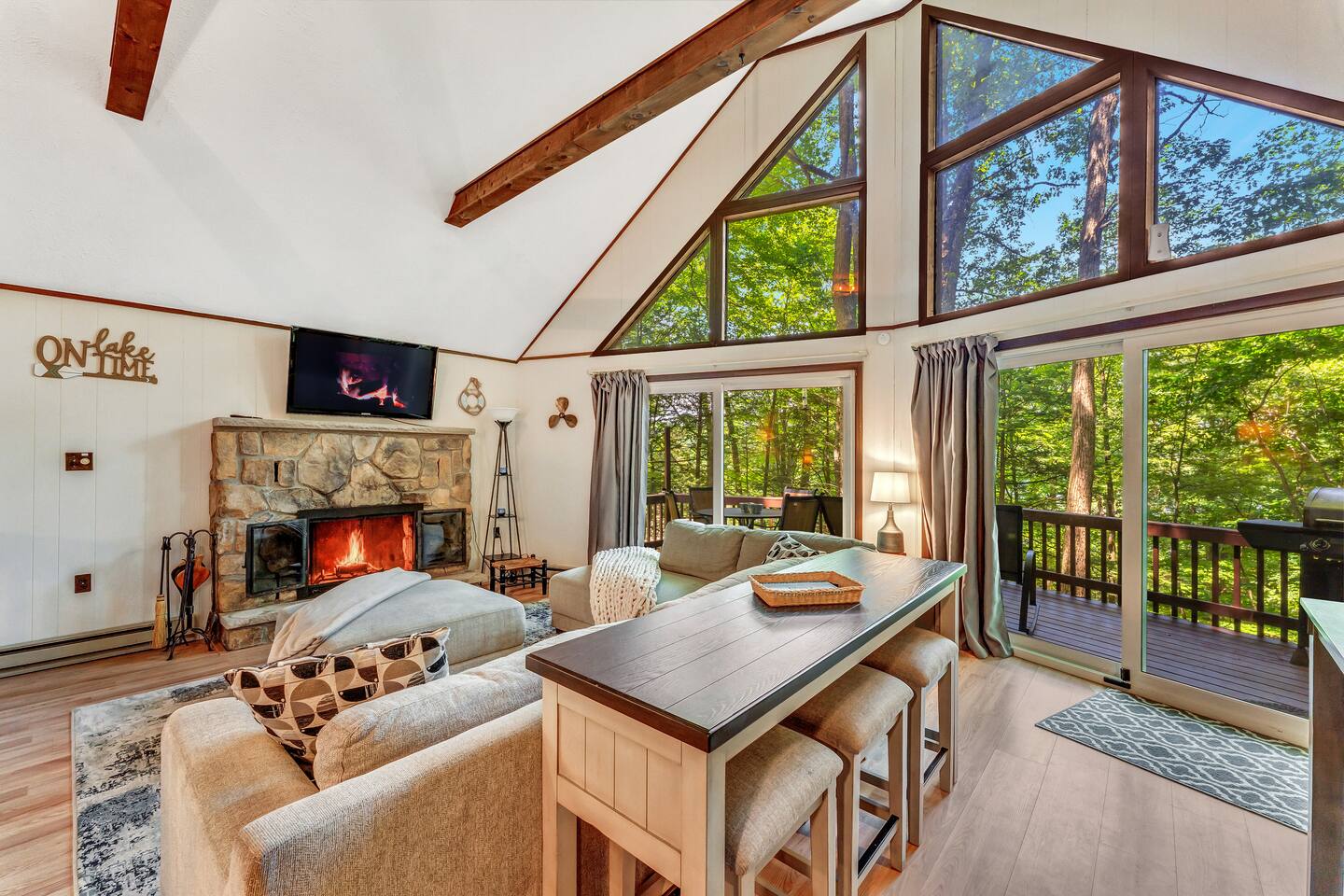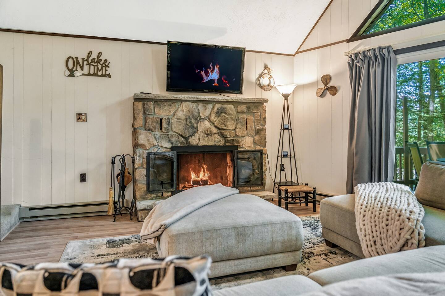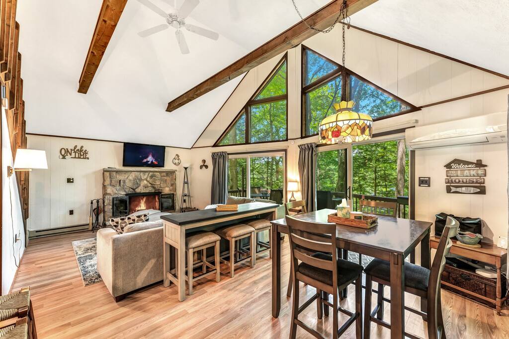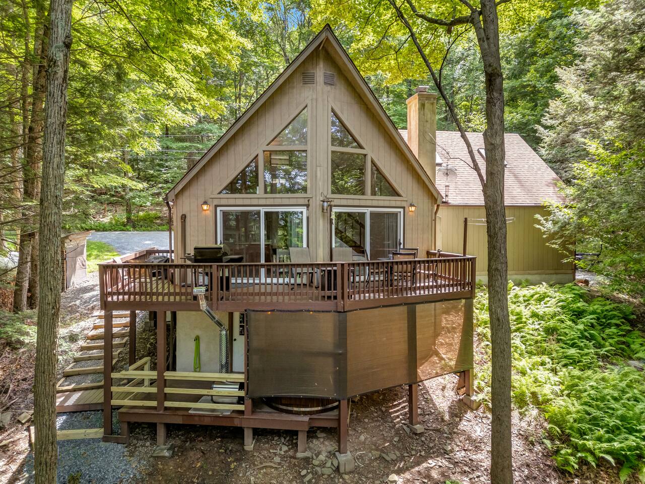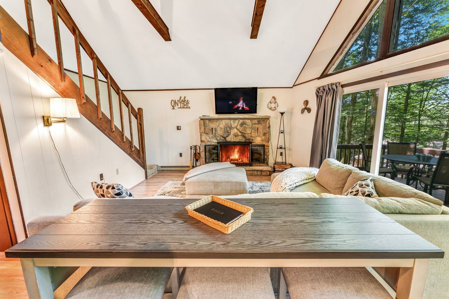 Welcome to our spacious 3BD retreat w/ extra sleeping room just a short walk to Lake Wallenpaupack (Seasonal Views). Experience outdoor living with a wood-burning hot tub & outdoor TV, large deck featuring BBQ and a cozy gas firepit. Inside, unwind by the crackling real wood fireplace. Ideal for families or groups seeking relaxation and outdoor adventures in scenic Greentown. Explore nearby hiking trails, fishing spots and local attractions for a memorable getaway in the heart of the Poconos.