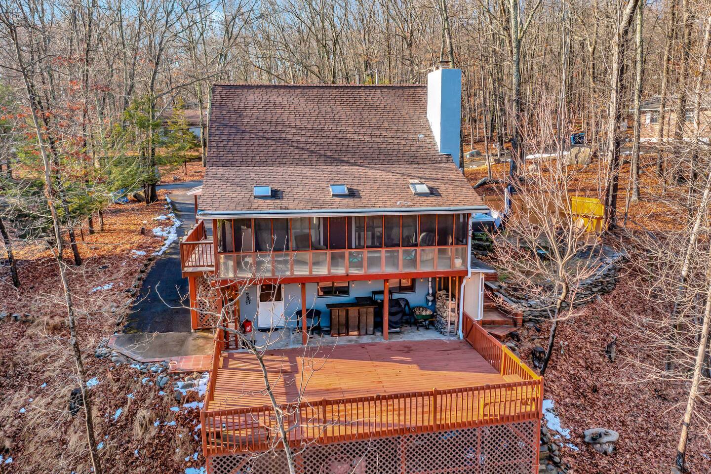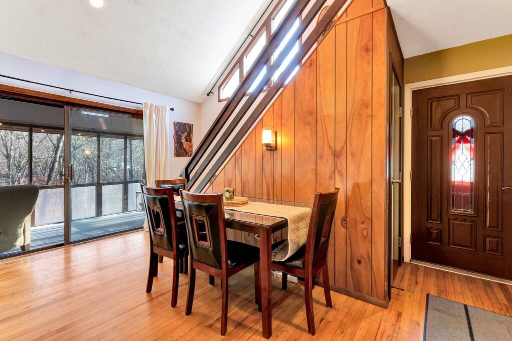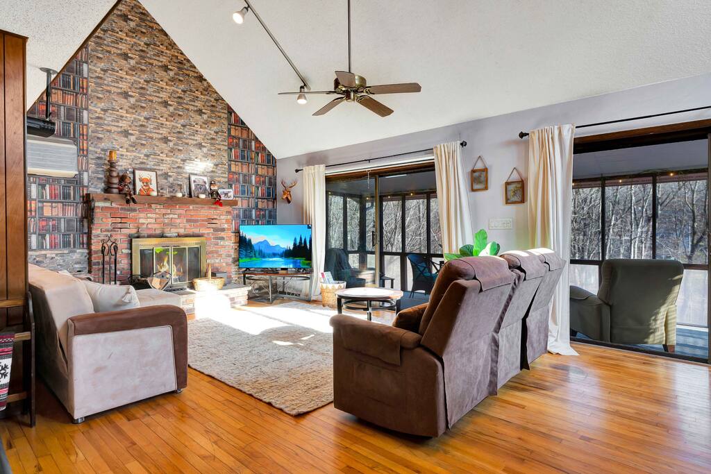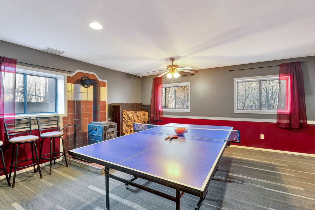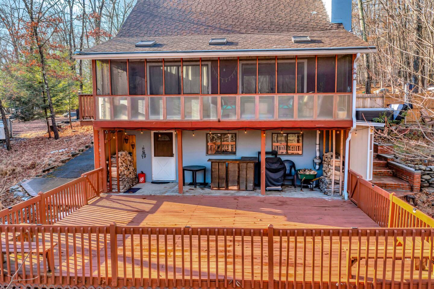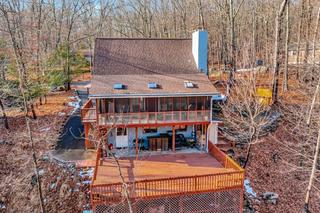 Escape to our cozy 3BD retreat in the Poconos, 20 min from Bushkill Falls & Shawnee Mountain. Relax in the outdoor hot tub or gather around the fire pit while enjoying stunning seasonal views. The spacious deck features a BBQ for outdoor dining, while the open-concept living room with a fireplace and sunroom offer cozy indoor spaces. The lower level boasts a game room with a ping pong table, a sauna, and an additional fire pit. Perfect for families and friends, your mountain getaway awaits!