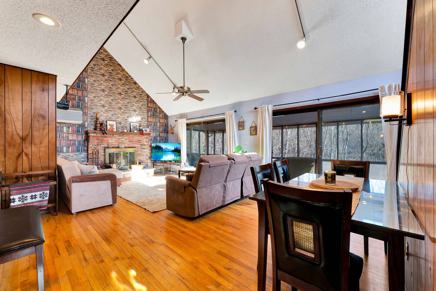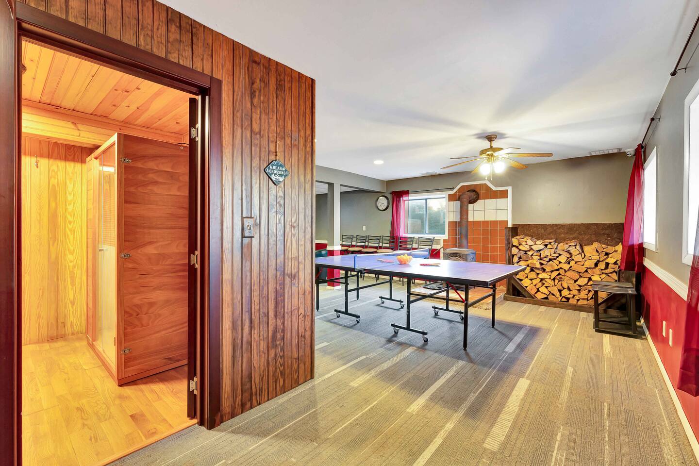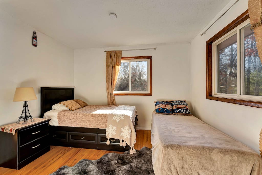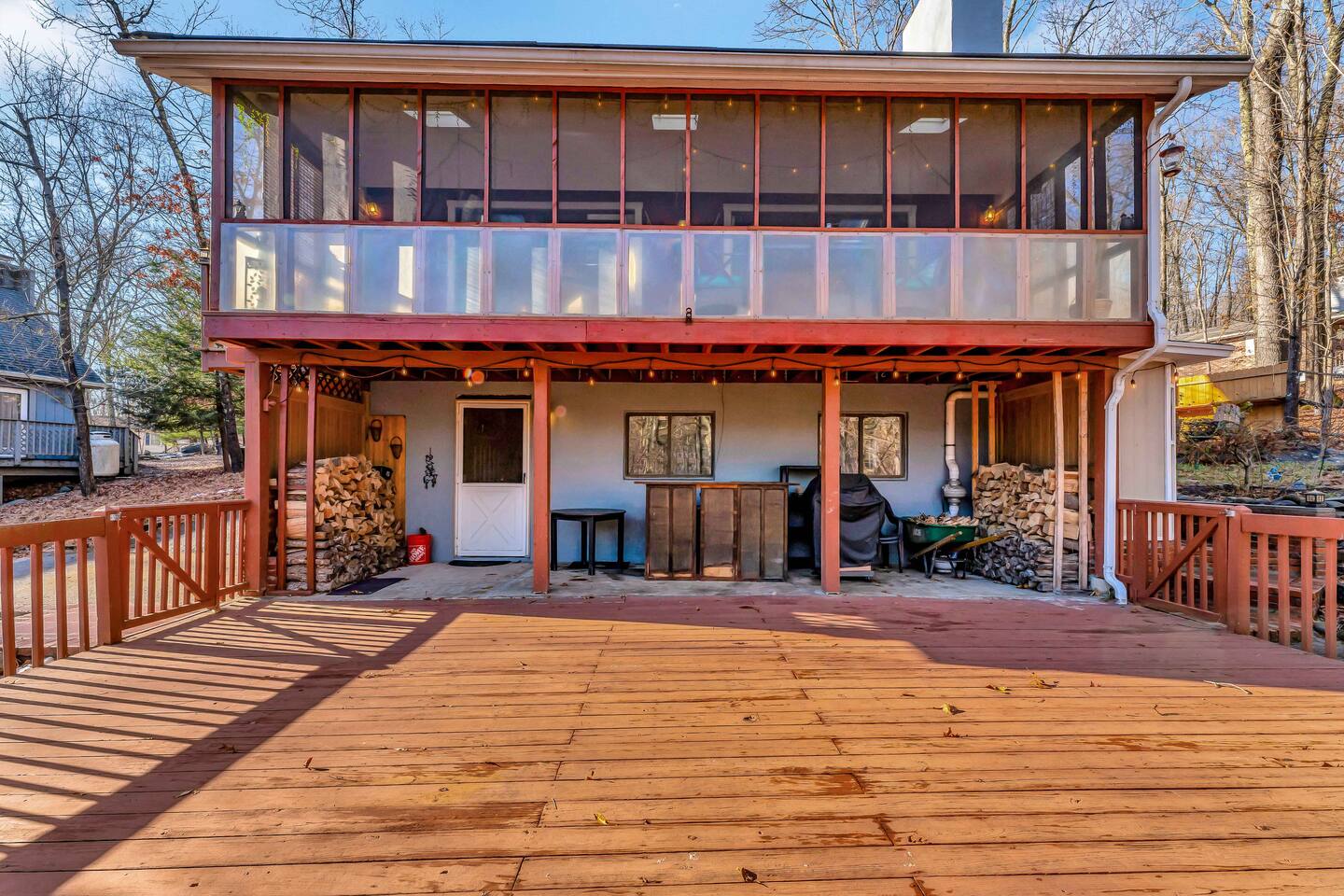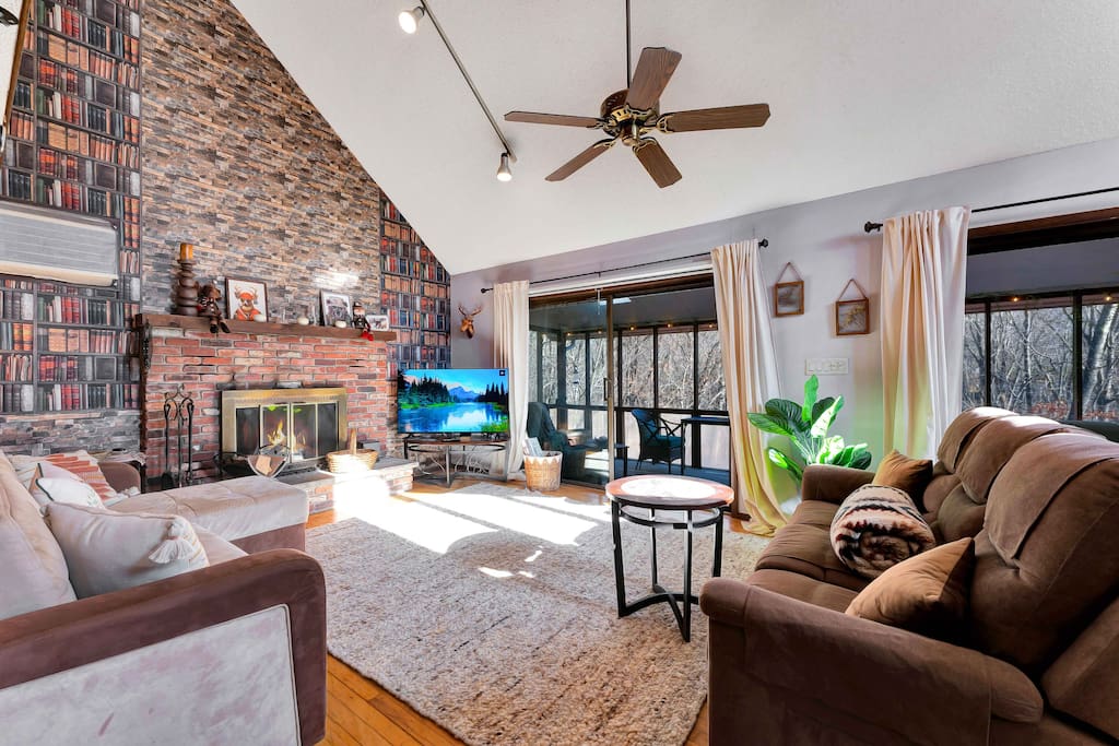 Escape to our cozy 3BD retreat in the Poconos, 20 min from Bushkill Falls & Shawnee Mountain. Relax in the outdoor hot tub or gather around the fire pit while enjoying stunning seasonal views. The spacious deck features a BBQ for outdoor dining, while the open-concept living room with a fireplace and sunroom offer cozy indoor spaces. The lower level boasts a game room with a ping pong table, a sauna, and an additional fire pit. Perfect for families and friends, your mountain getaway awaits!