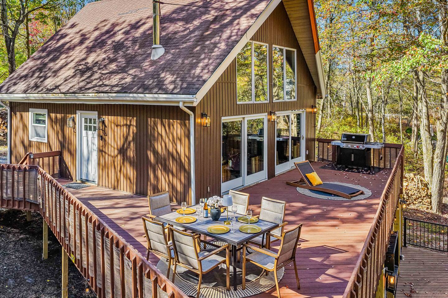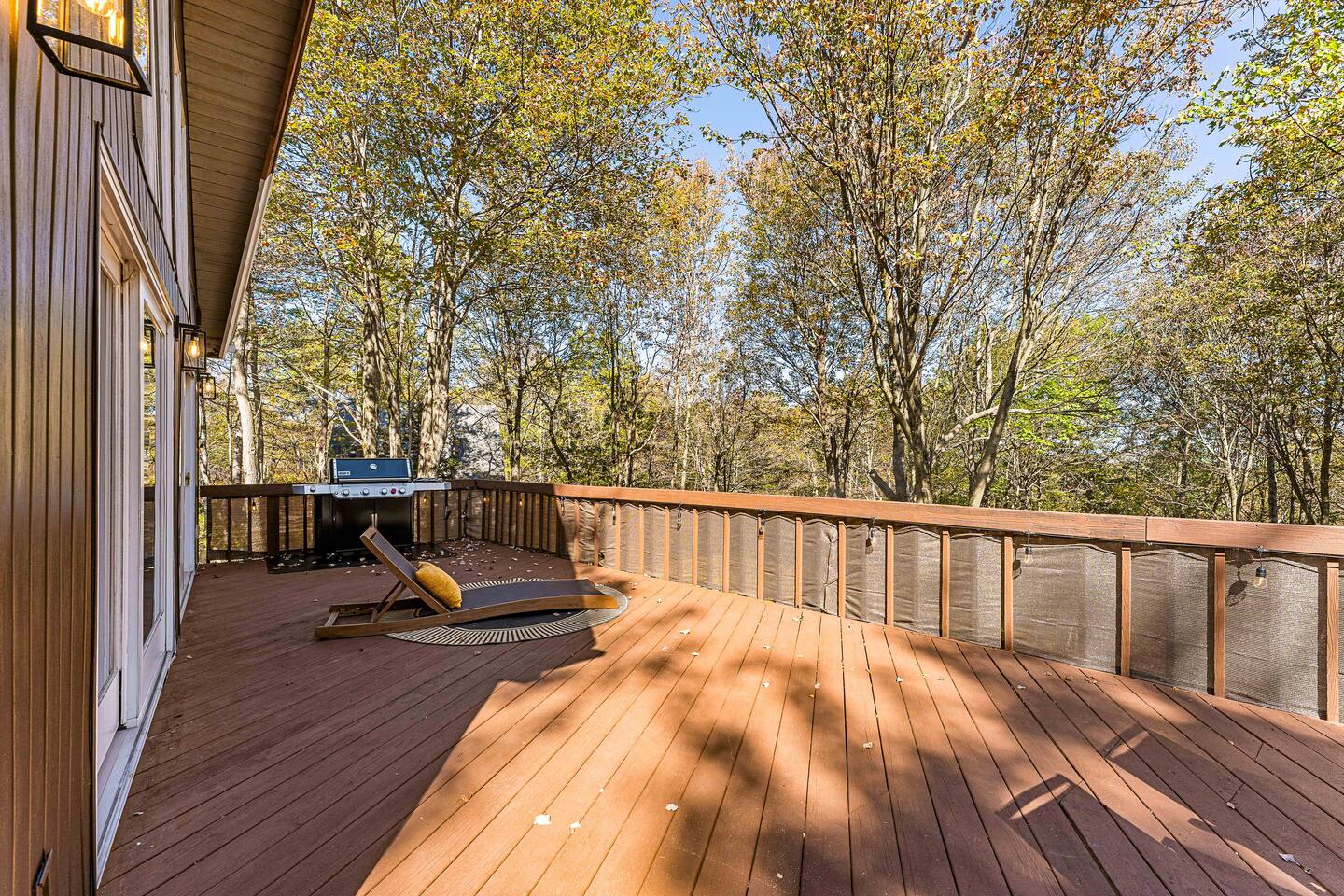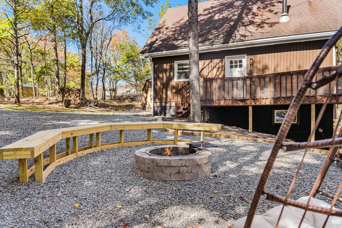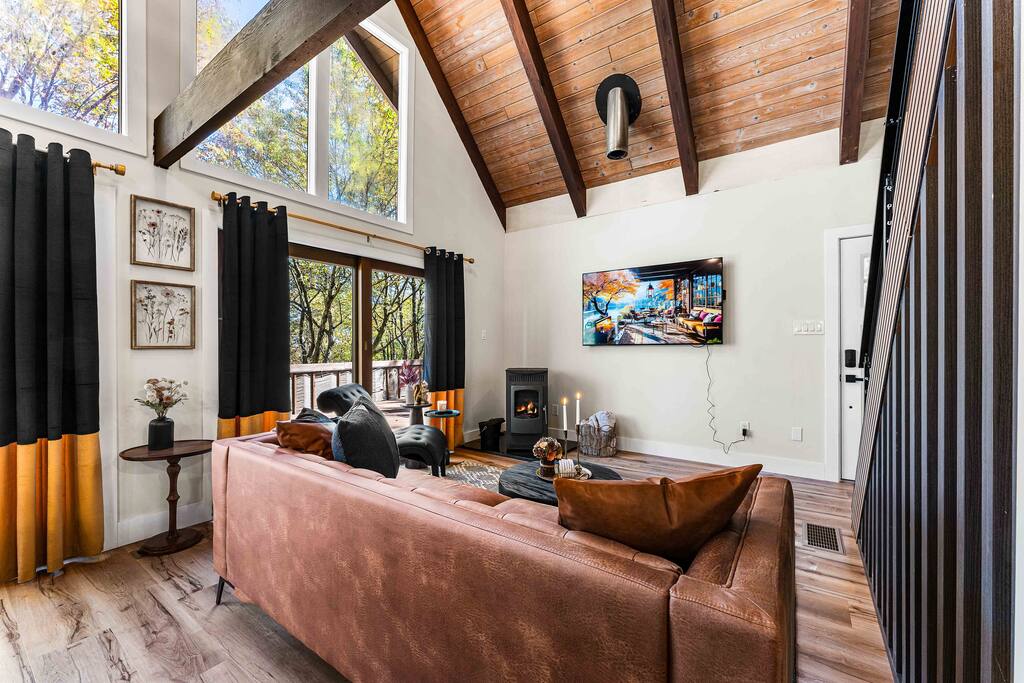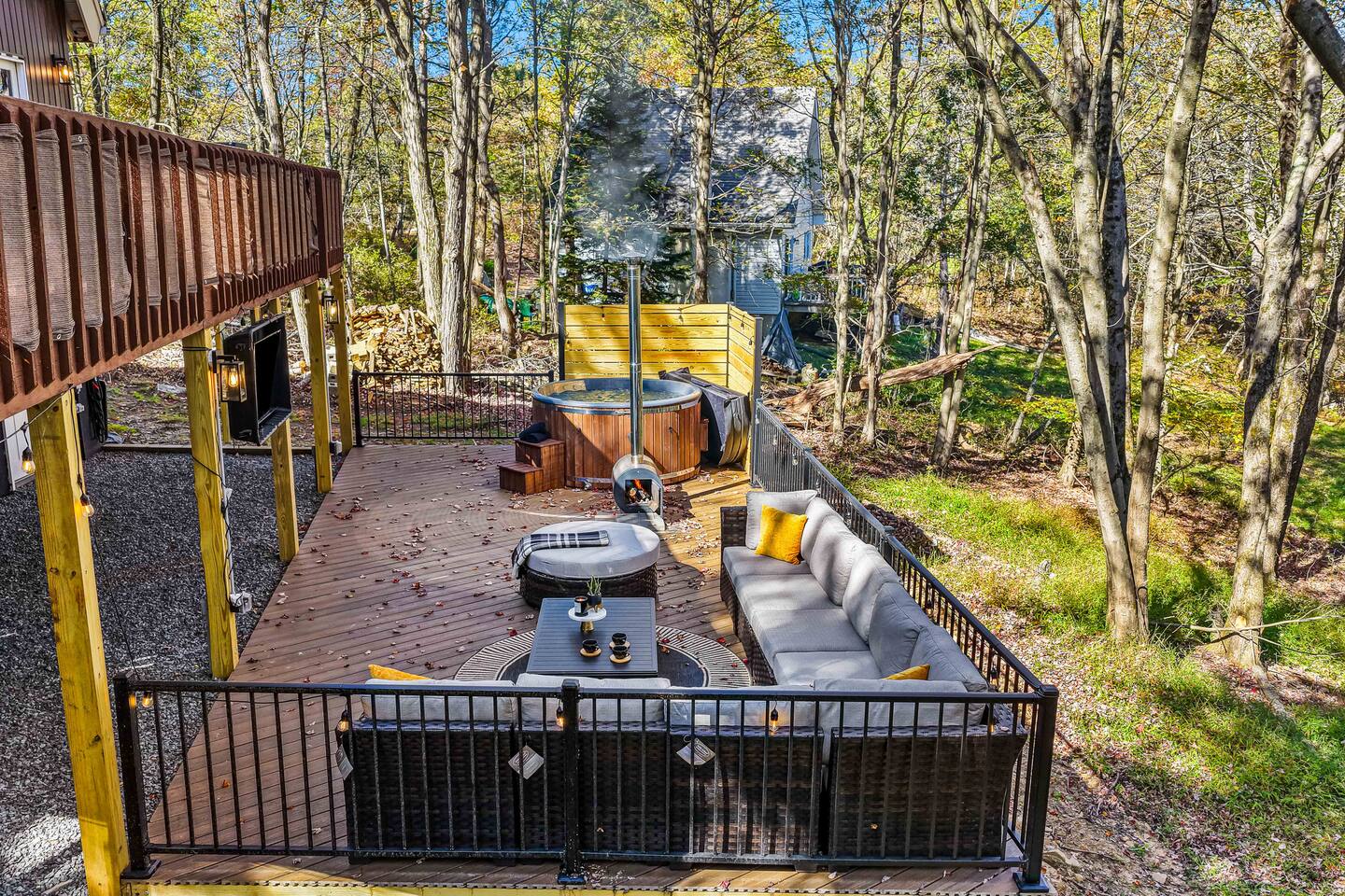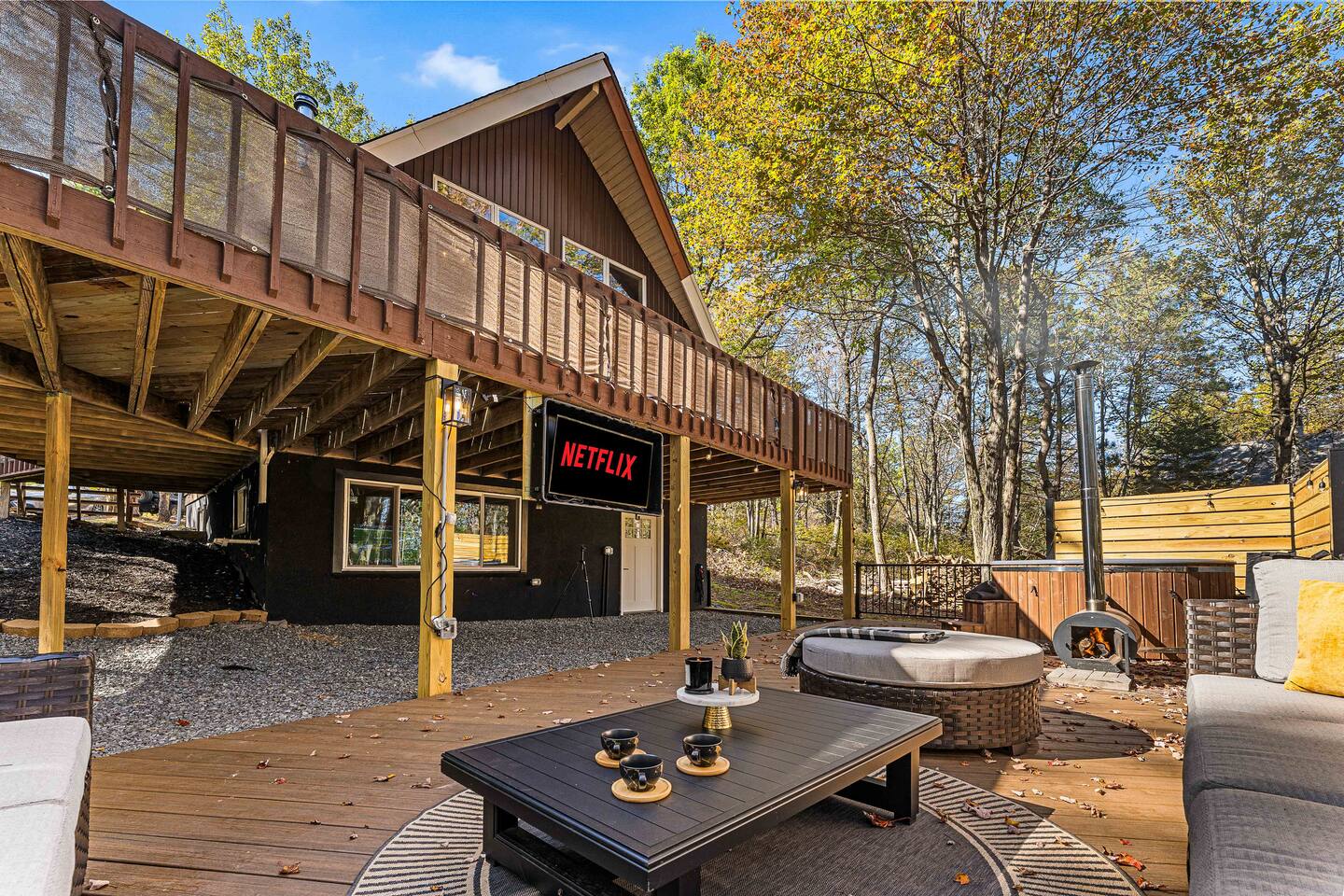 Experience rustic-modern charm in this Poconos A-frame w/ wood, black & gold accents. Relax in the loft w/ freestanding tub, cozy living room w/pellet stove&sleek kitchen w/ black stainless appliances. Enjoy the basement game room, tv area & sauna. Step out to the lower deck with wood-burning hot tub, outdoor TV, and lounge area, or dine on the main deck with BBQ. Enjoy Fire pit w/ swing set in the yard. Nearby community amenities like indoor pool with extra fee.Minutes from Kalahari&Camelback.