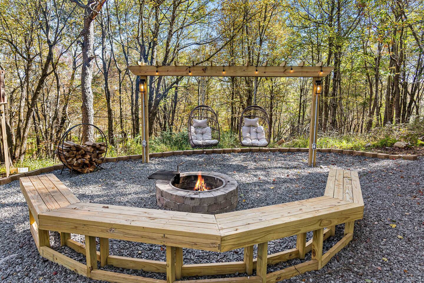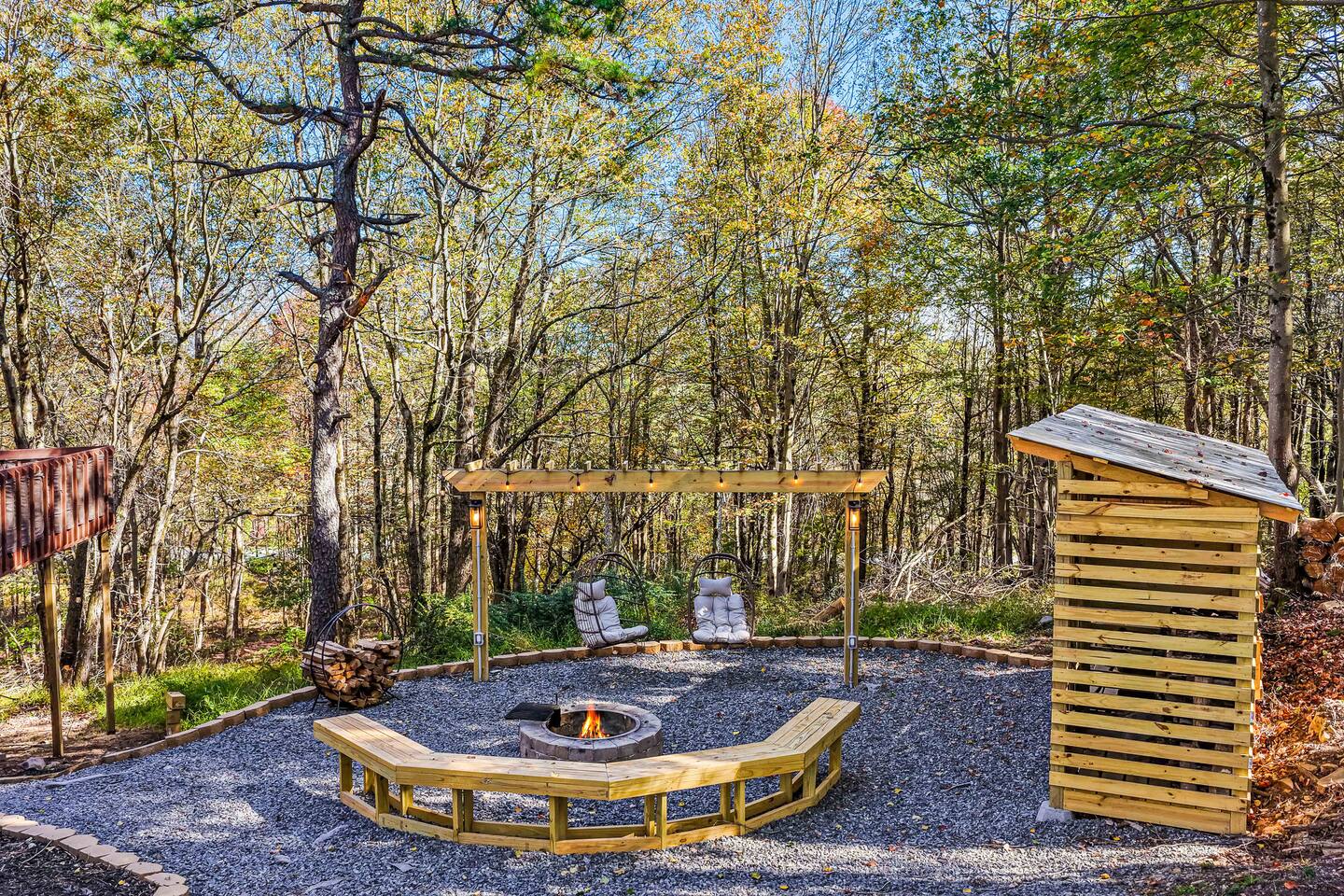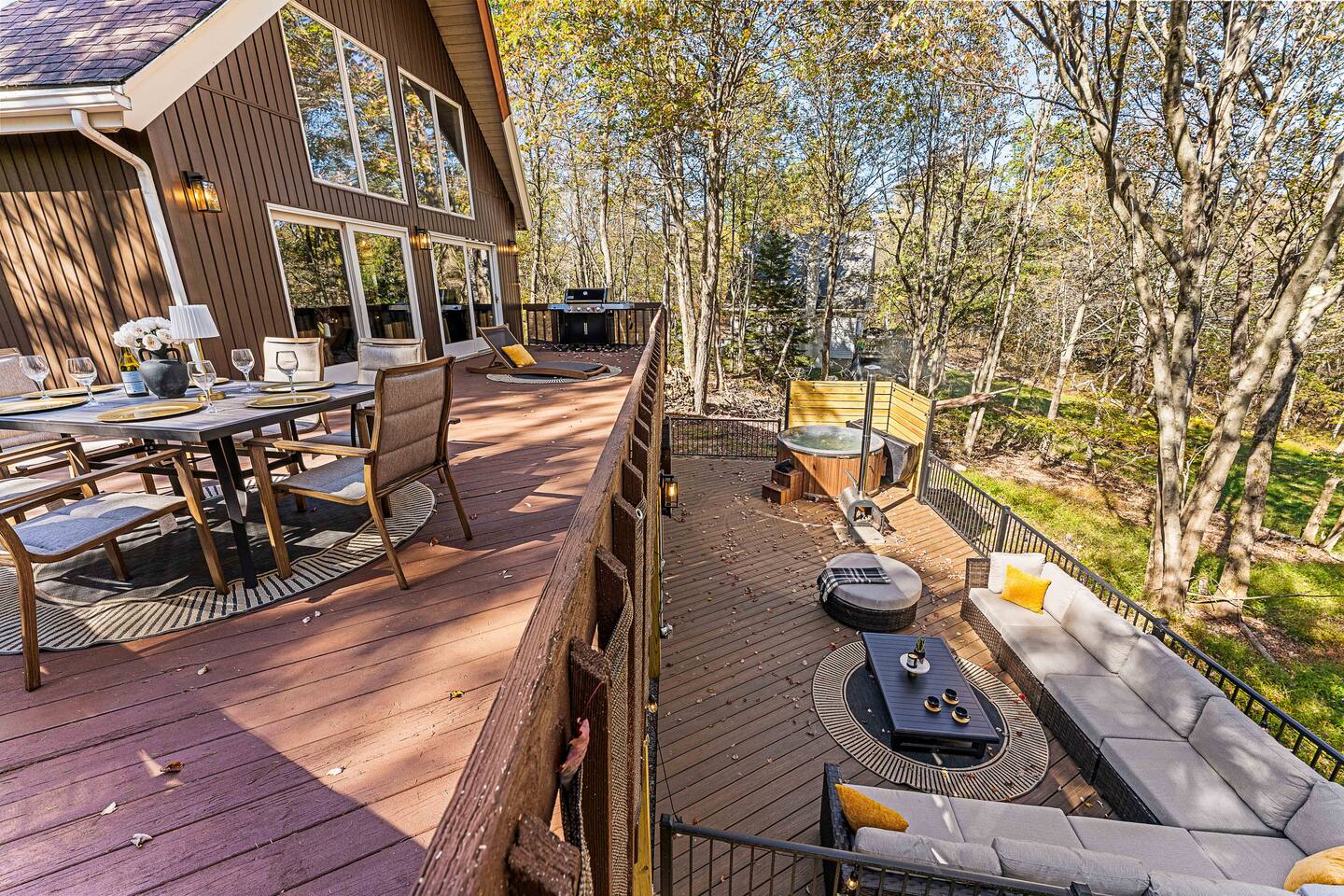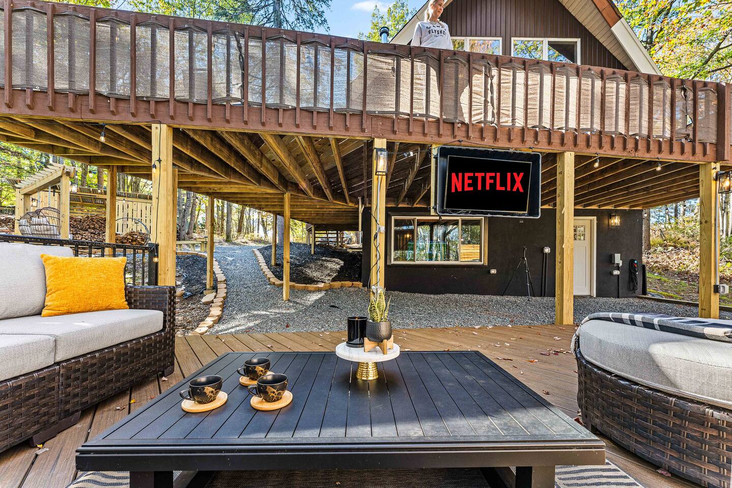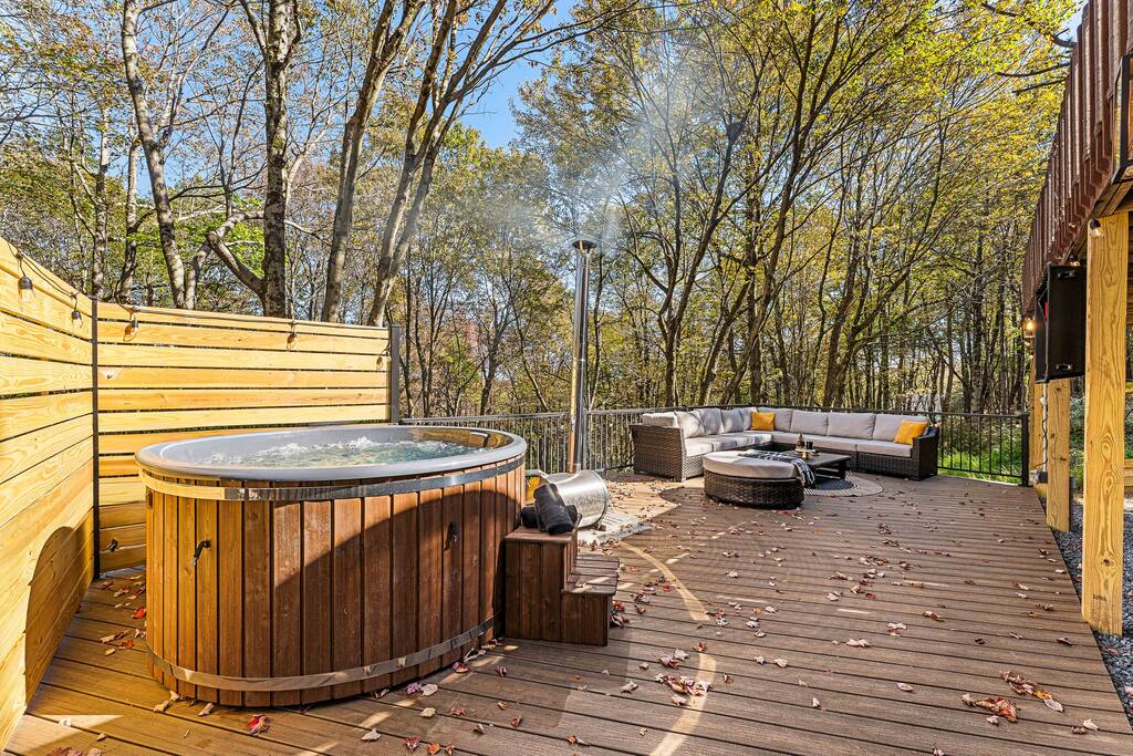 Experience rustic-modern charm in this Poconos A-frame w/ wood, black & gold accents. Relax in the loft w/ freestanding tub, cozy living room w/pellet stove&sleek kitchen w/ black stainless appliances. Enjoy the basement game room, tv area & sauna. Step out to the lower deck with wood-burning hot tub, outdoor TV, and lounge area, or dine on the main deck with BBQ. Enjoy Fire pit w/ swing set in the yard. Nearby community amenities like indoor pool with extra fee.Minutes from Kalahari&Camelback.