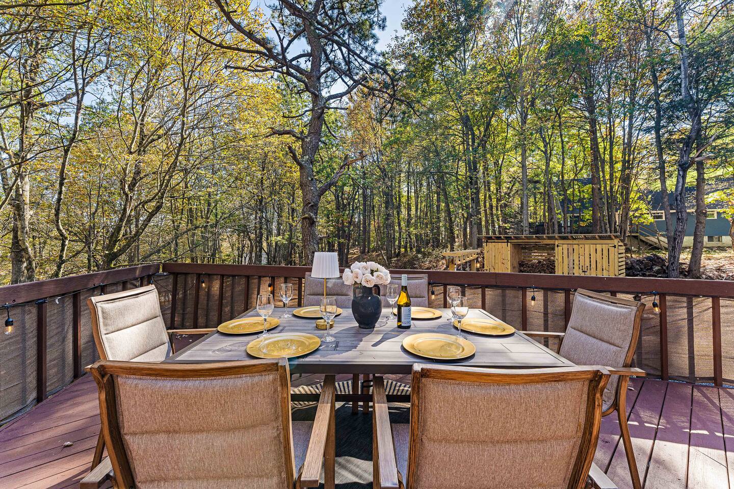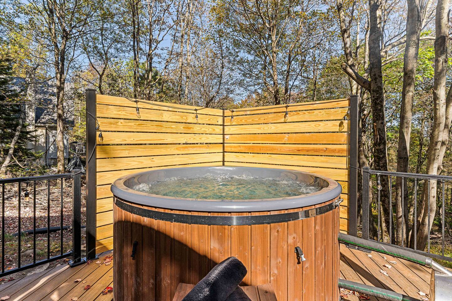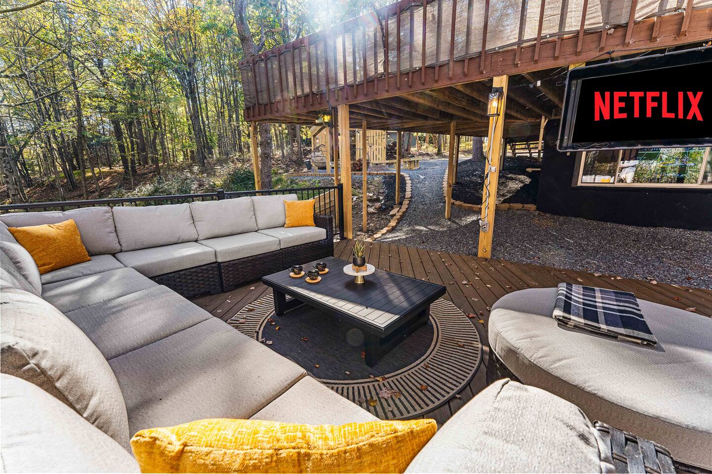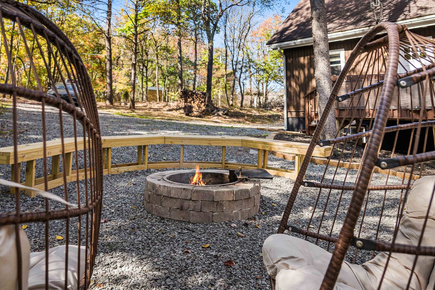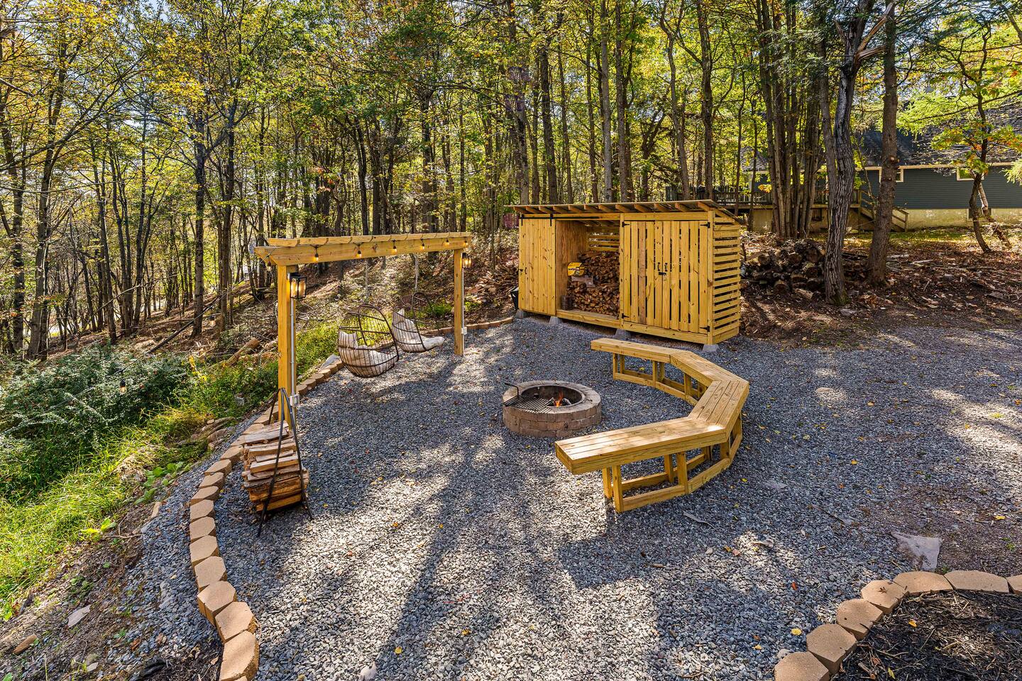 Experience rustic-modern charm in this Poconos A-frame w/ wood, black & gold accents. Relax in the loft w/ freestanding tub, cozy living room w/pellet stove&sleek kitchen w/ black stainless appliances. Enjoy the basement game room, tv area & sauna. Step out to the lower deck with wood-burning hot tub, outdoor TV, and lounge area, or dine on the main deck with BBQ. Enjoy Fire pit w/ swing set in the yard. Nearby community amenities like indoor pool with extra fee.Minutes from Kalahari&Camelback.