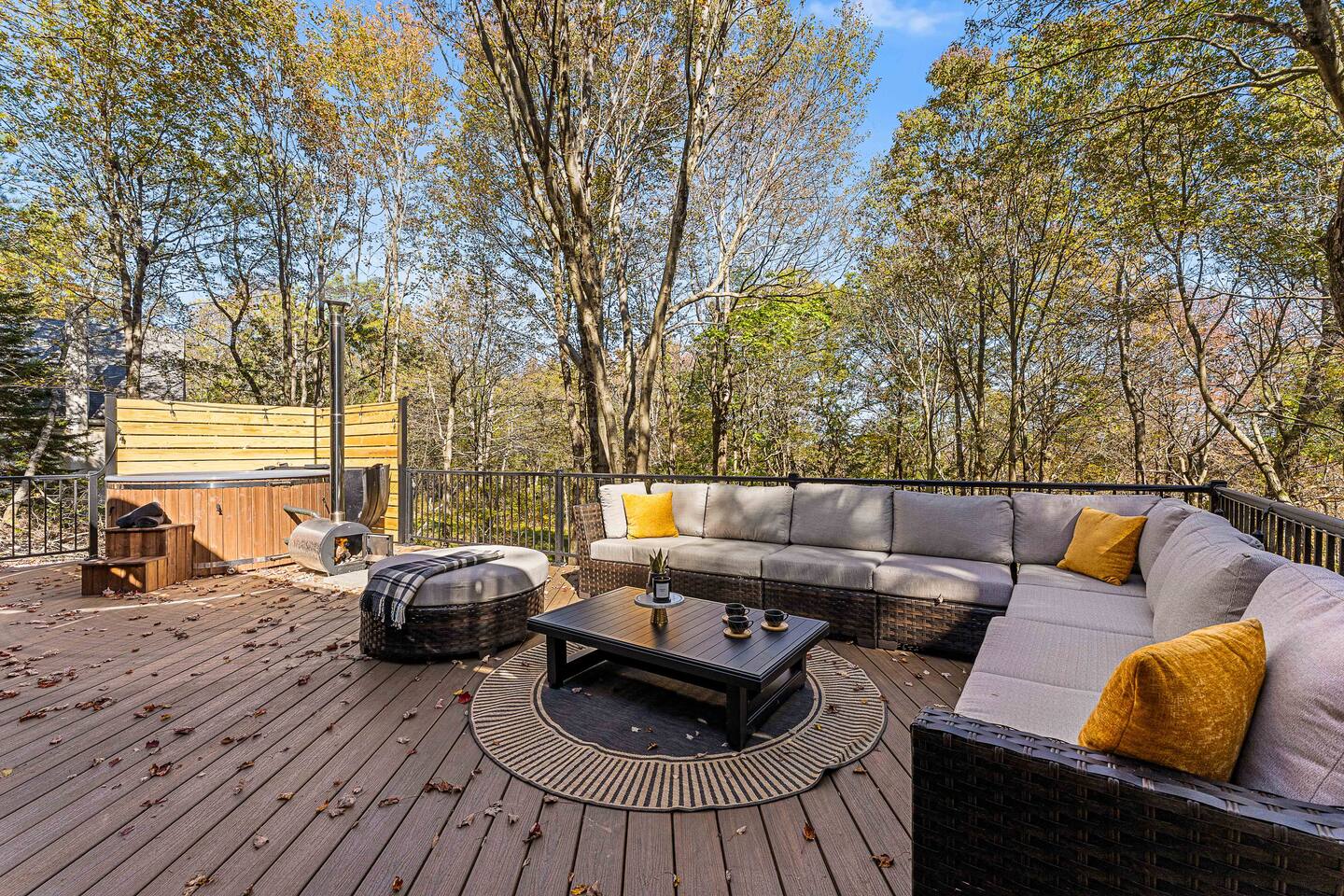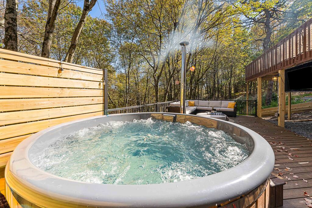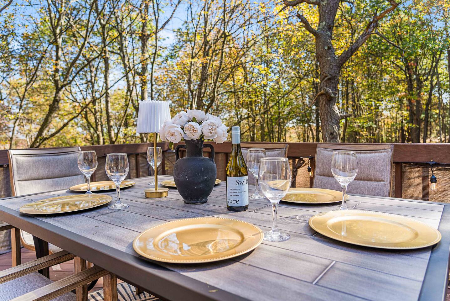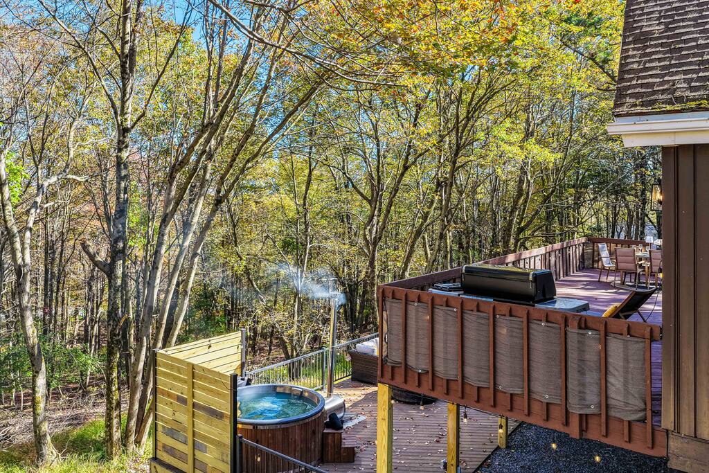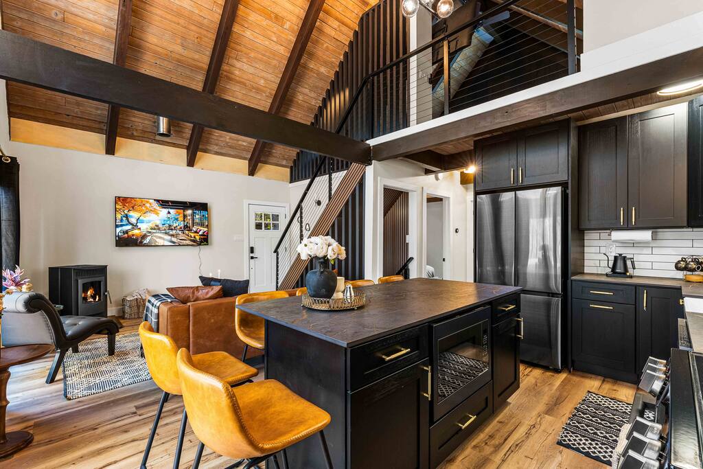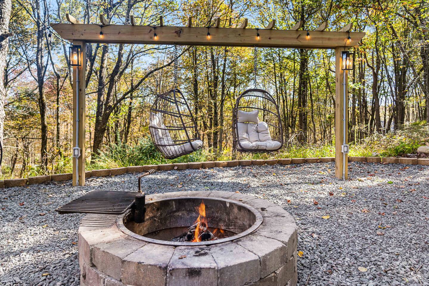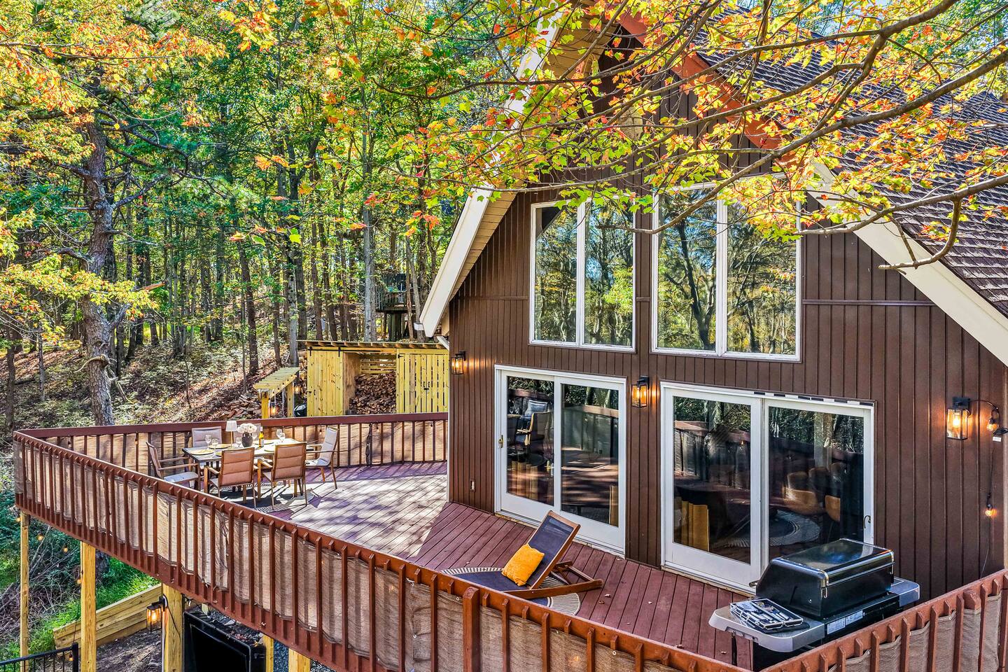 Experience rustic-modern charm in this Poconos A-frame w/ wood, black & gold accents. Relax in the loft w/ freestanding tub, cozy living room w/pellet stove&sleek kitchen w/ black stainless appliances. Enjoy the basement game room, tv area & sauna. Step out to the lower deck with wood-burning hot tub, outdoor TV, and lounge area, or dine on the main deck with BBQ. Enjoy Fire pit w/ swing set in the yard. Nearby community amenities like indoor pool with extra fee.Minutes from Kalahari&Camelback.