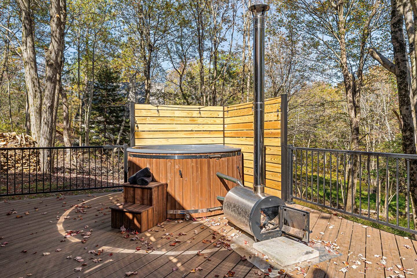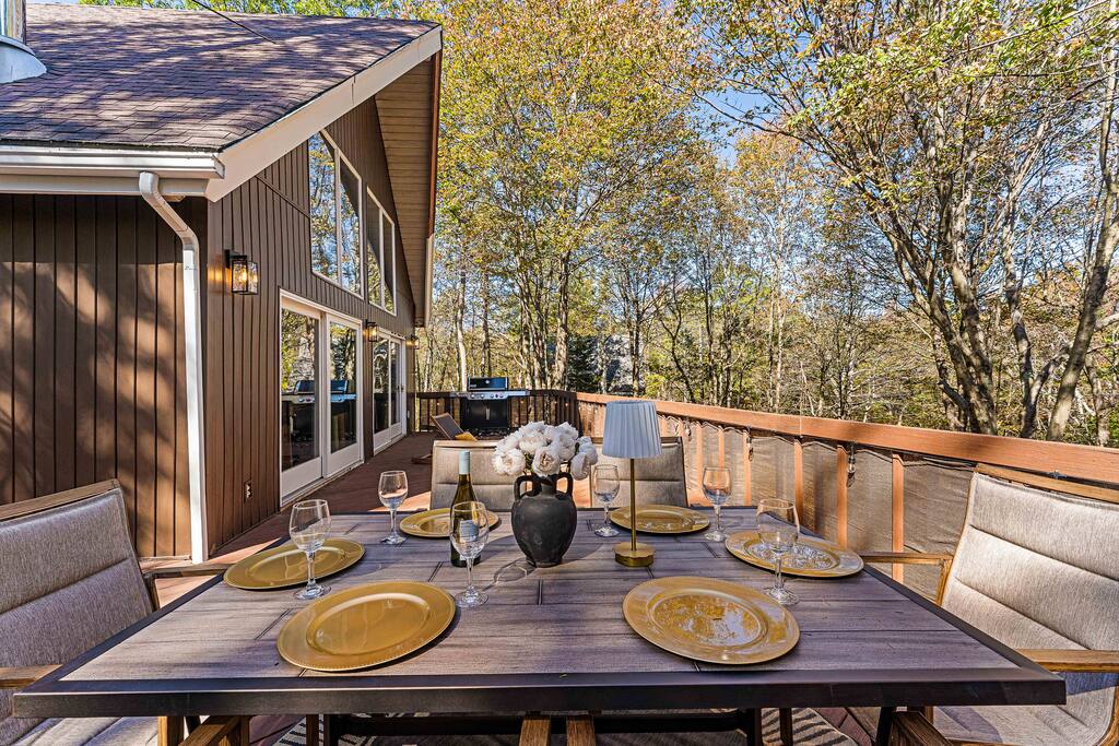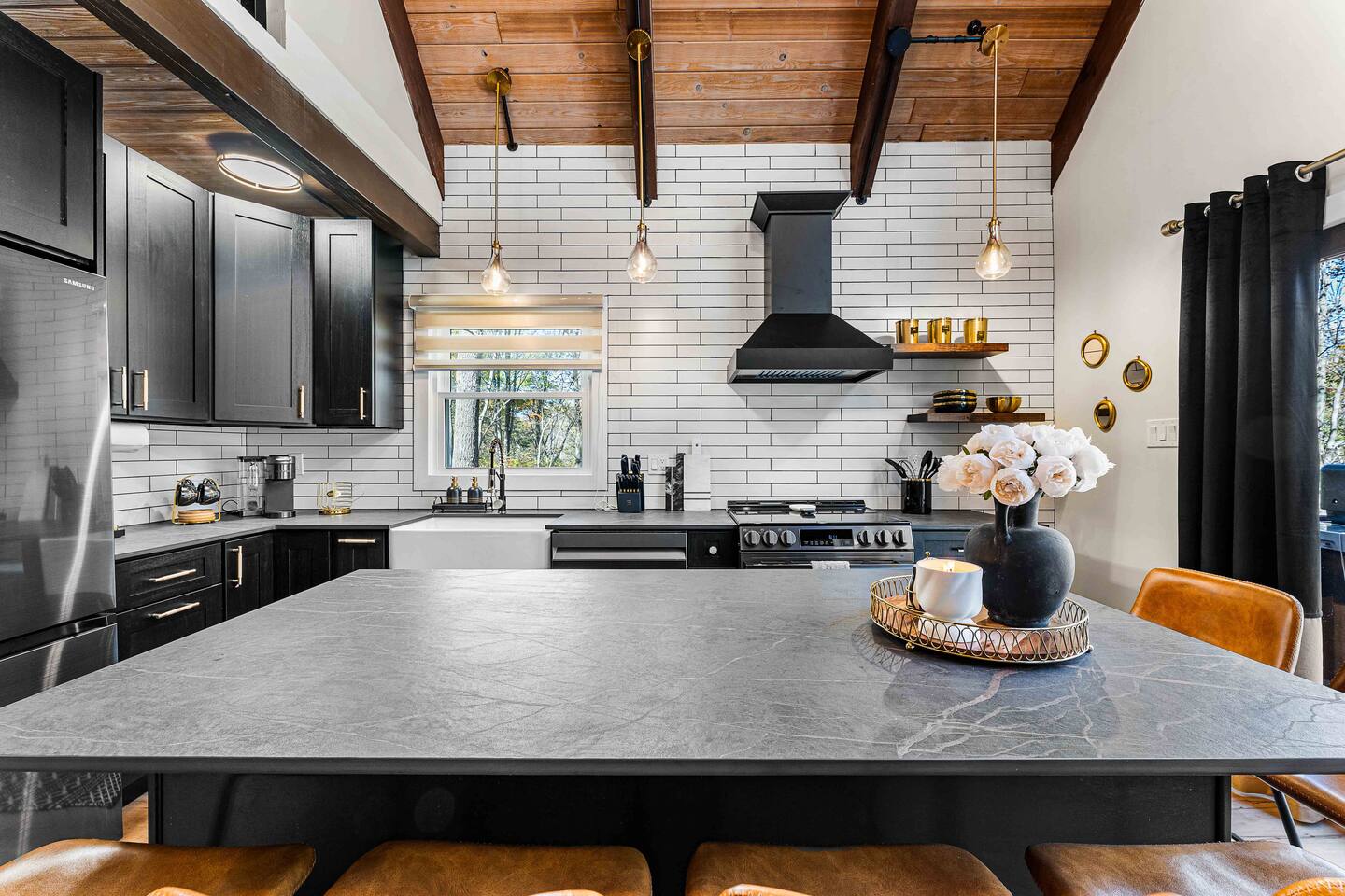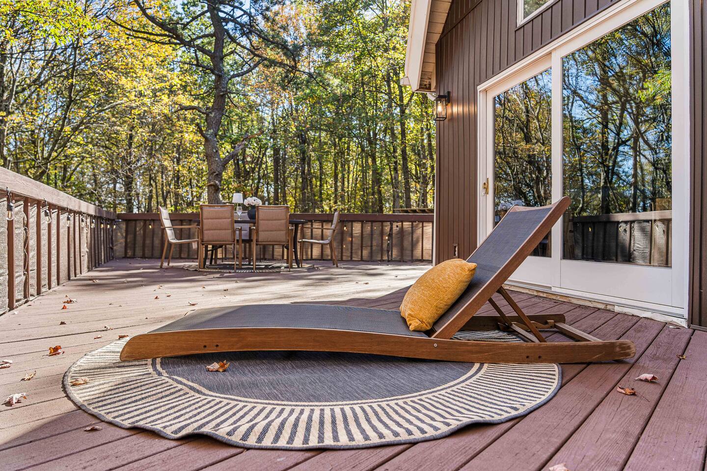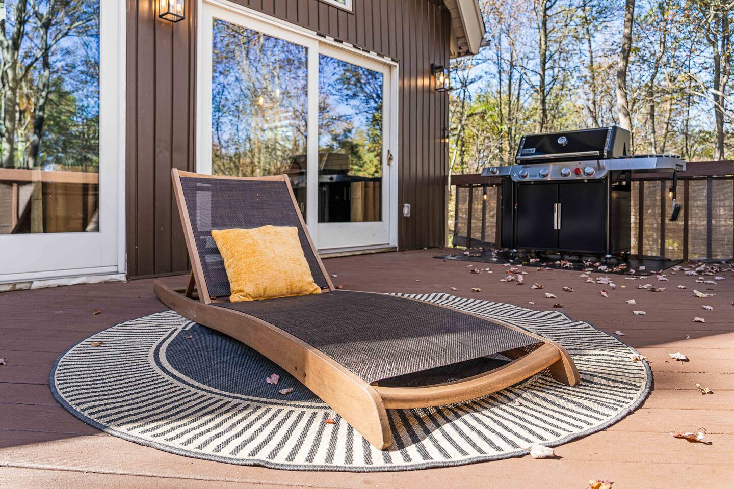 Experience rustic-modern charm in this Poconos A-frame w/ wood, black & gold accents. Relax in the loft w/ freestanding tub, cozy living room w/pellet stove&sleek kitchen w/ black stainless appliances. Enjoy the basement game room, tv area & sauna. Step out to the lower deck with wood-burning hot tub, outdoor TV, and lounge area, or dine on the main deck with BBQ. Enjoy Fire pit w/ swing set in the yard. Nearby community amenities like indoor pool with extra fee.Minutes from Kalahari&Camelback.