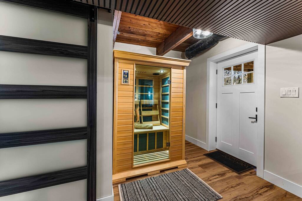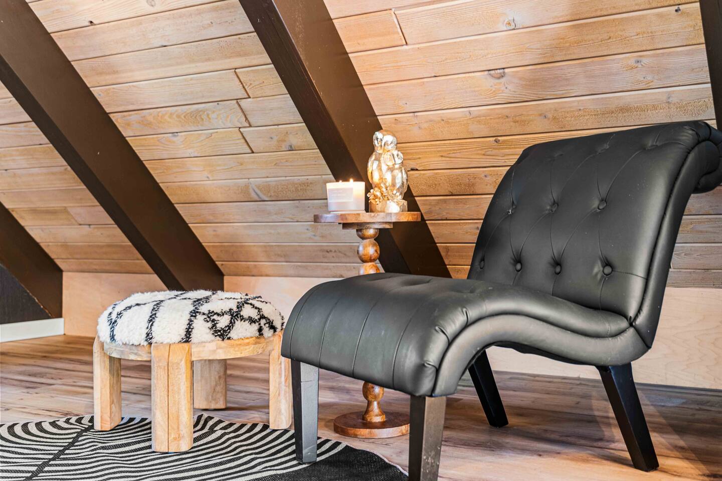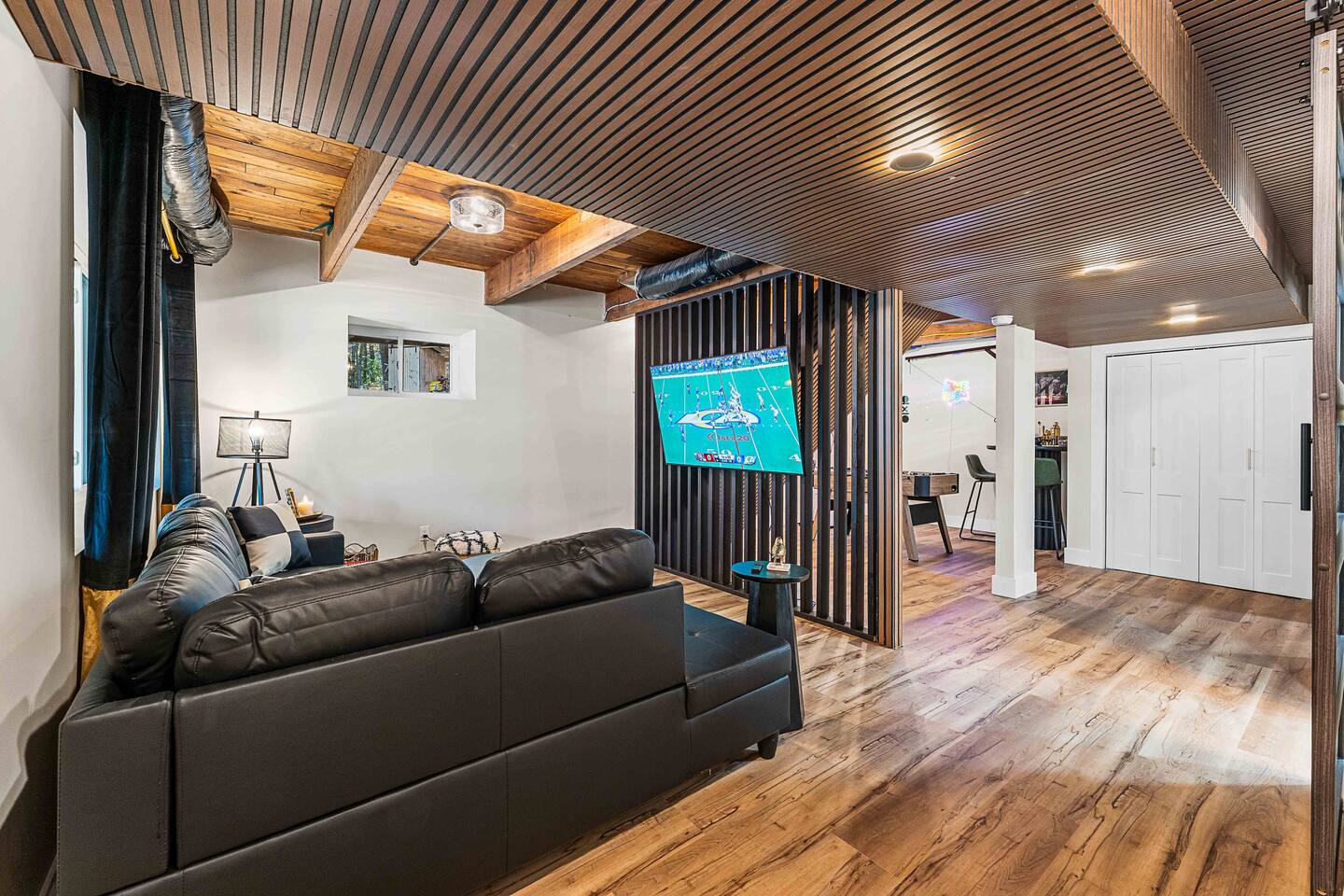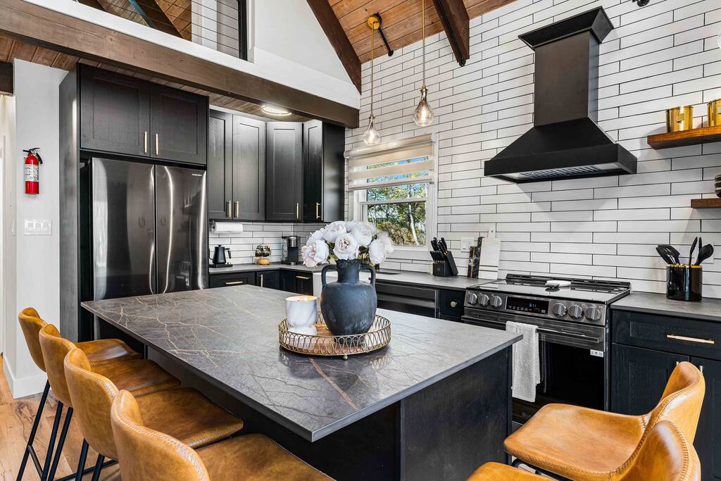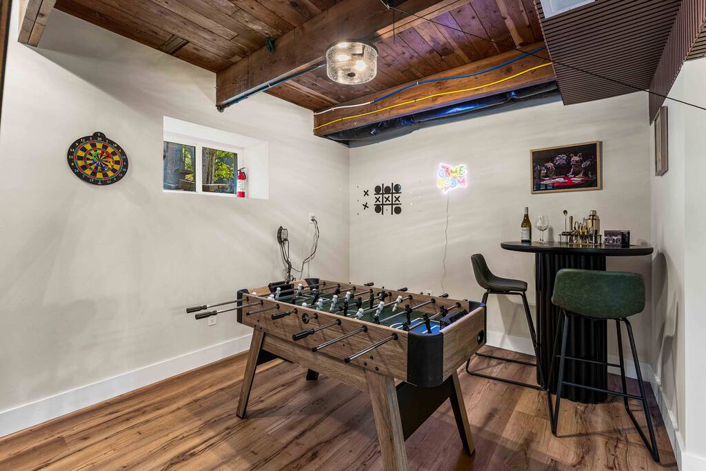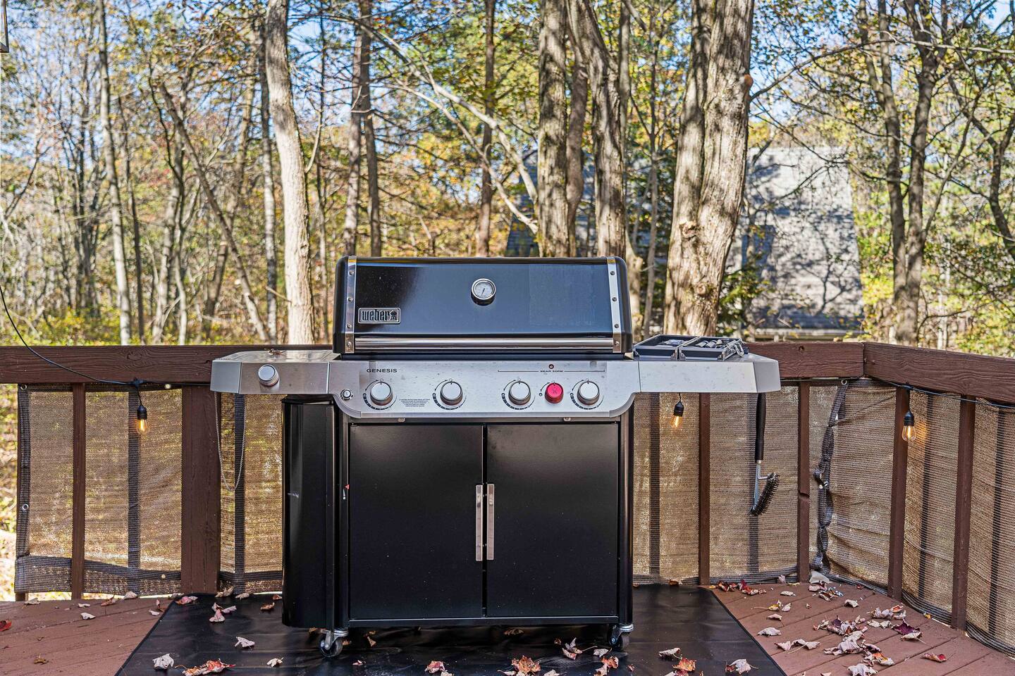 Experience rustic-modern charm in this Poconos A-frame w/ wood, black & gold accents. Relax in the loft w/ freestanding tub, cozy living room w/pellet stove&sleek kitchen w/ black stainless appliances. Enjoy the basement game room, tv area & sauna. Step out to the lower deck with wood-burning hot tub, outdoor TV, and lounge area, or dine on the main deck with BBQ. Enjoy Fire pit w/ swing set in the yard. Nearby community amenities like indoor pool with extra fee.Minutes from Kalahari&Camelback.