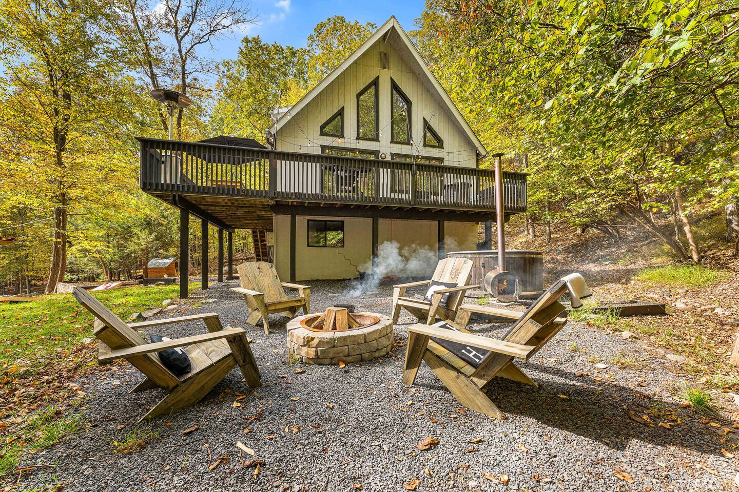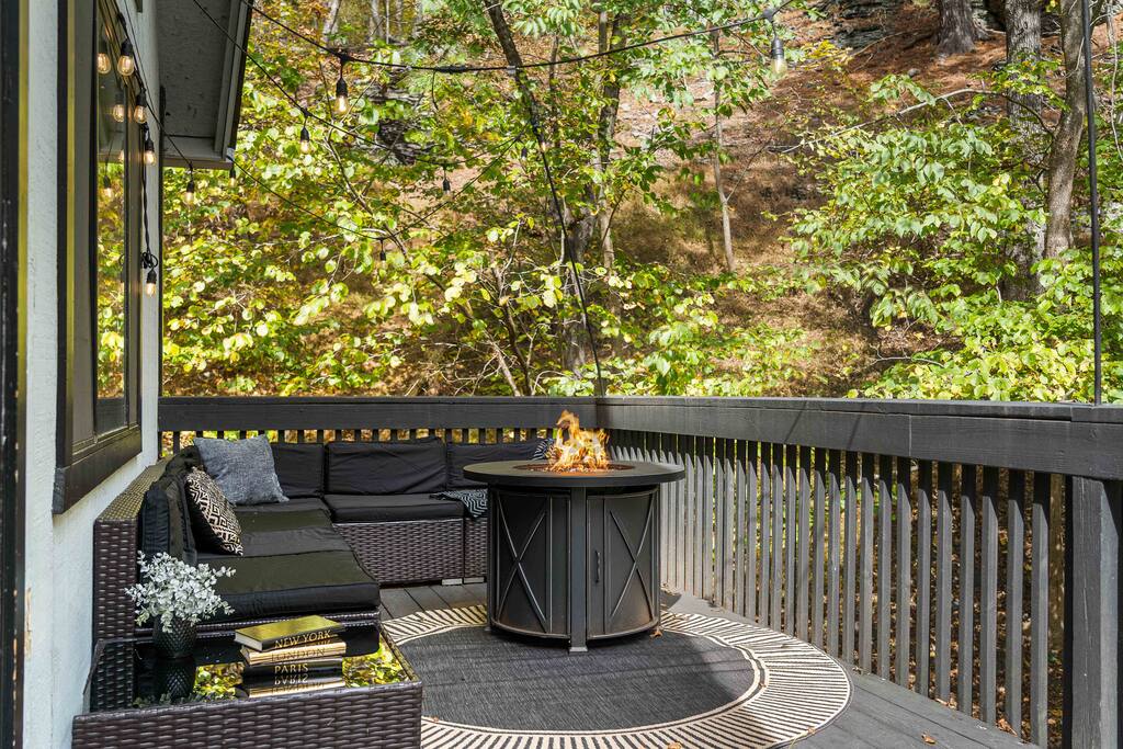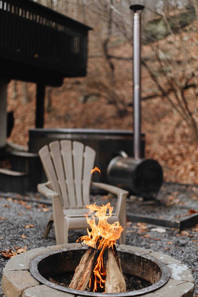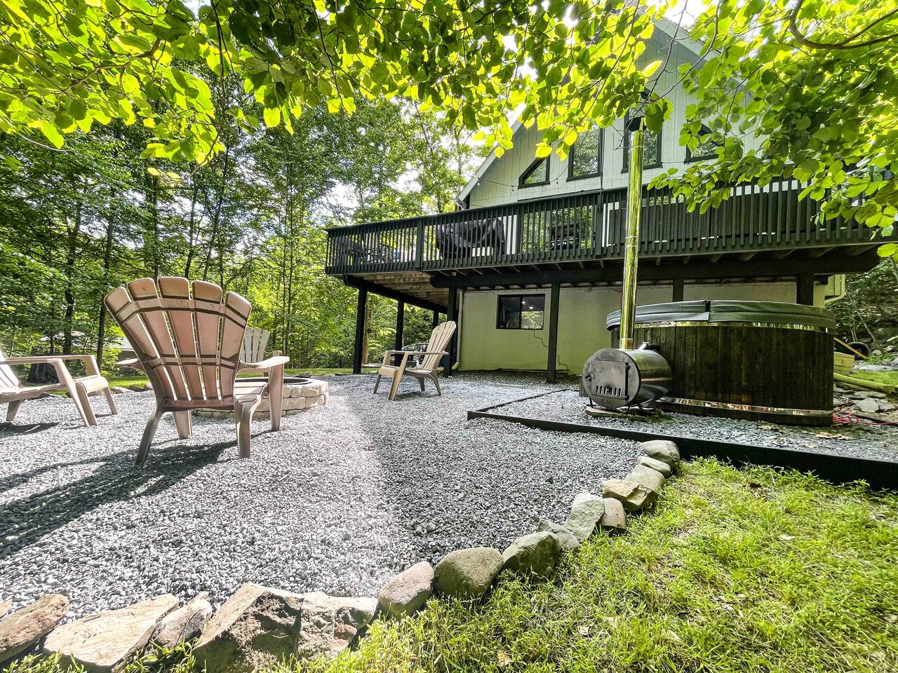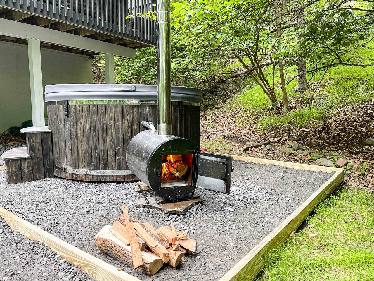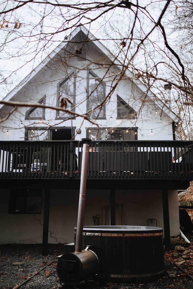 True mountain escape with designer finishes and high end appliances. The Cabin is situated near Bushkill Falls surrounded by a creek accessible for kayaking and fishing. The house is suited for 6 people 2 queen bedrooms on the main level and King Loft on the upper level. Open kitchen plan that connects with the living space highlighted by a beautiful fireplace. Beautiful deck for entertaining with a fire pit. Only 20mins away from Shawnee Mountain & 24/7 Supermarket.