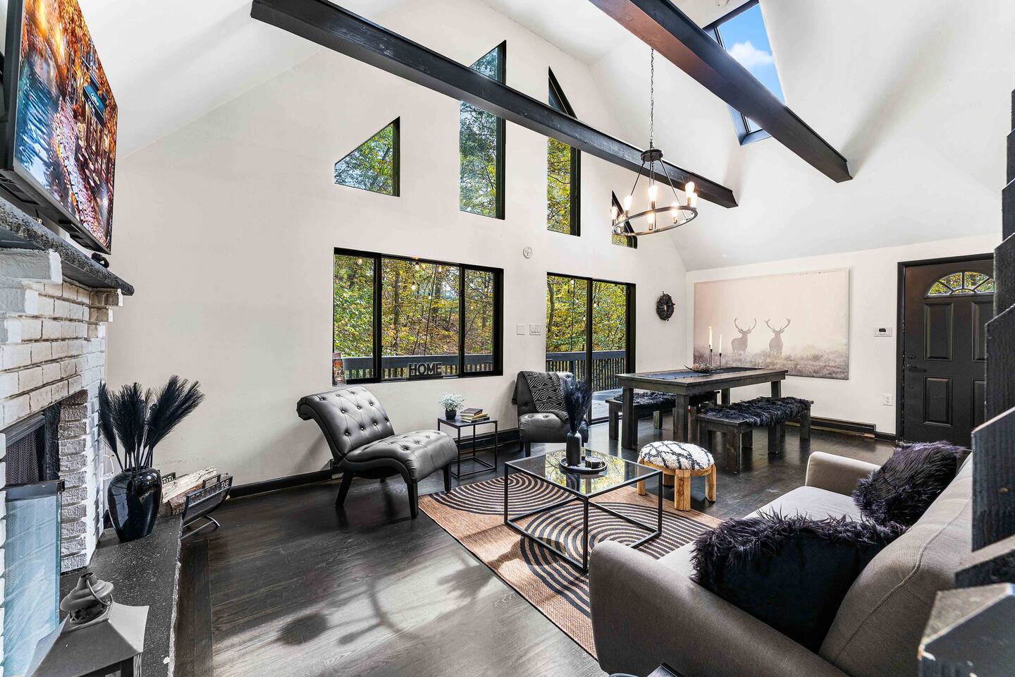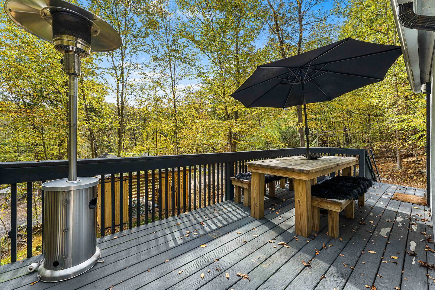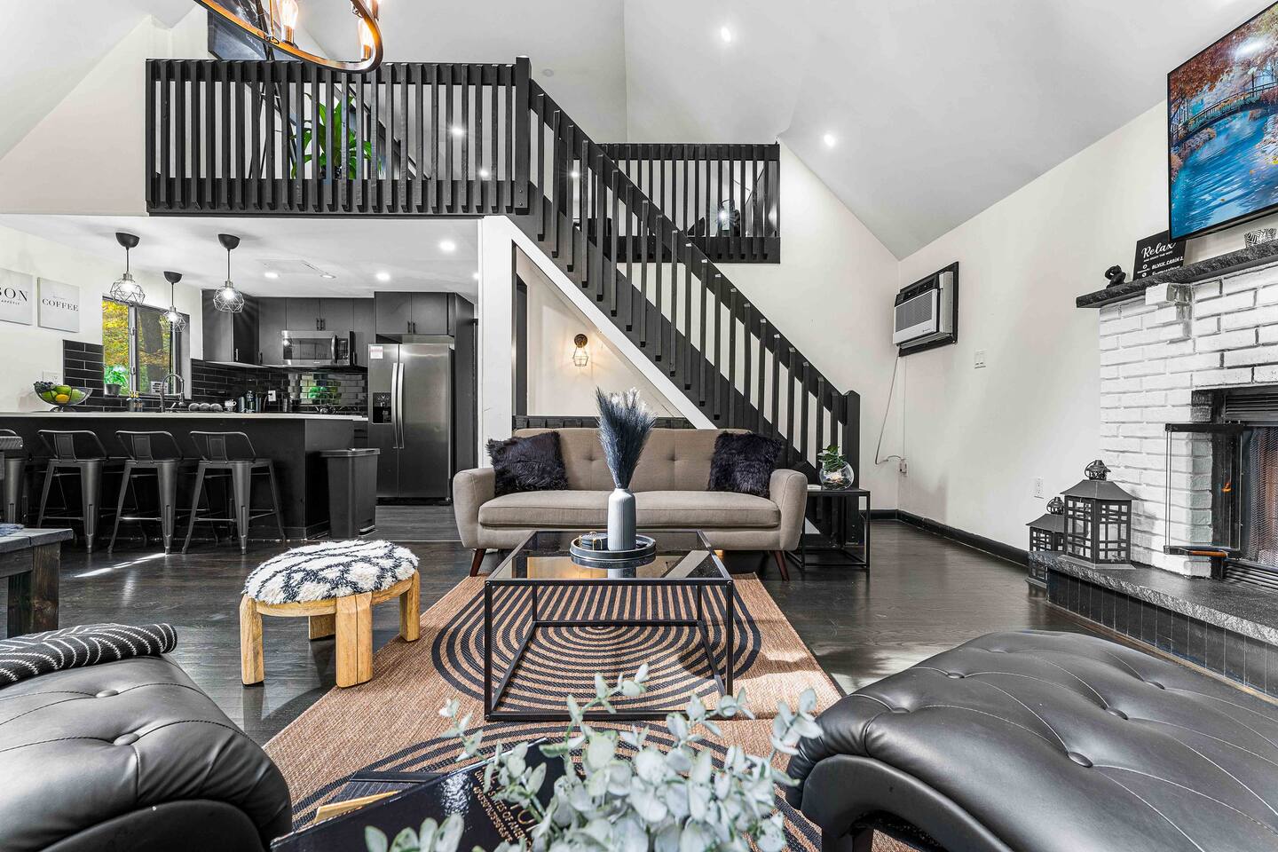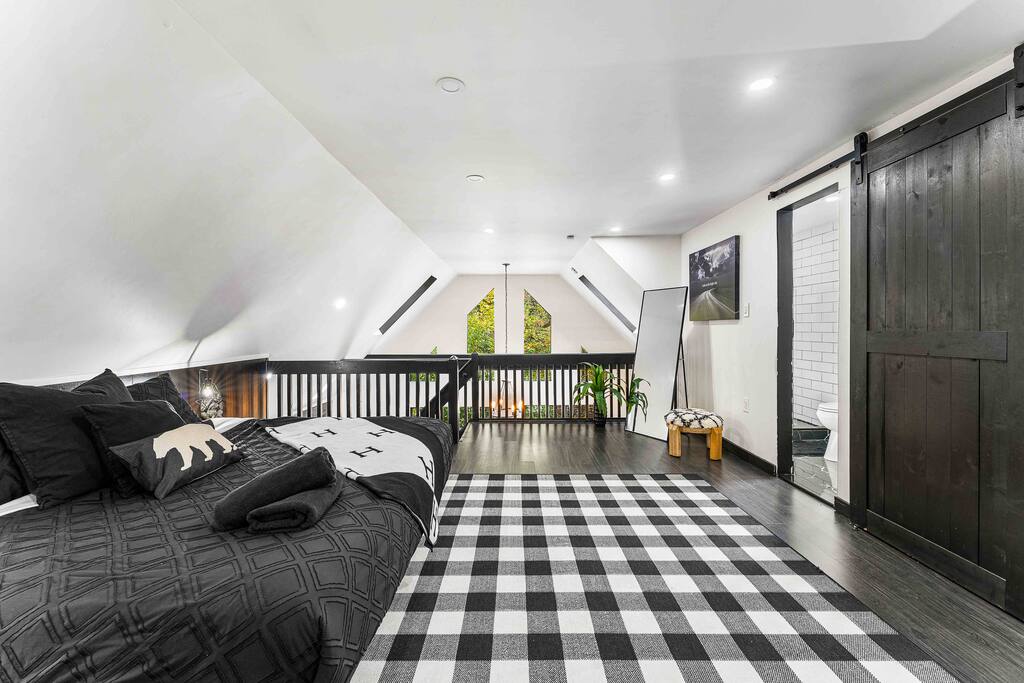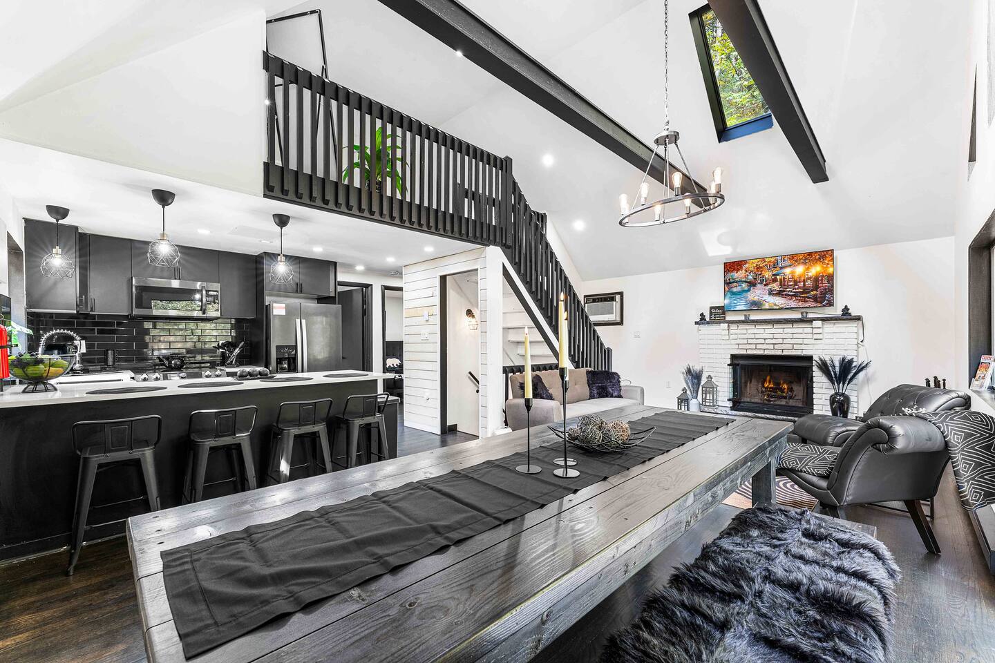 True mountain escape with designer finishes and high end appliances. The Cabin is situated near Bushkill Falls surrounded by a creek accessible for kayaking and fishing. The house is suited for 6 people 2 queen bedrooms on the main level and King Loft on the upper level. Open kitchen plan that connects with the living space highlighted by a beautiful fireplace. Beautiful deck for entertaining with a fire pit. Only 20mins away from Shawnee Mountain & 24/7 Supermarket.