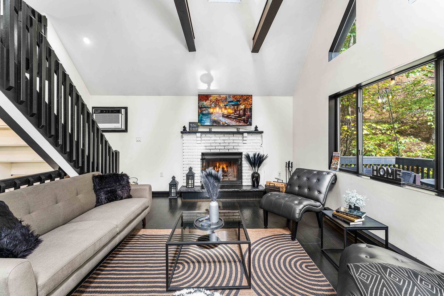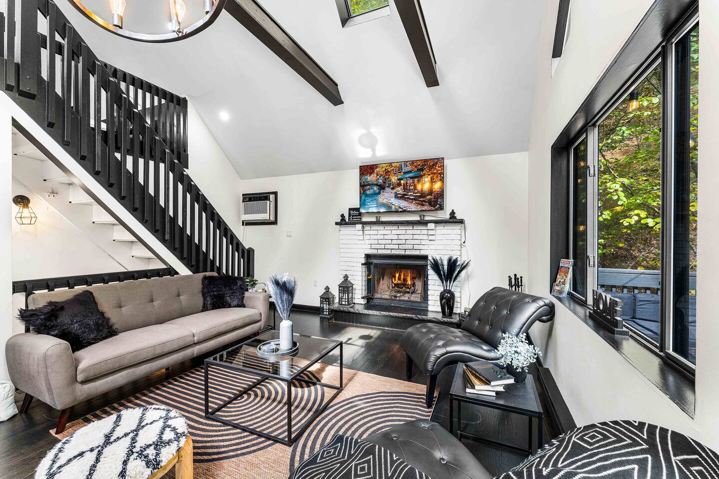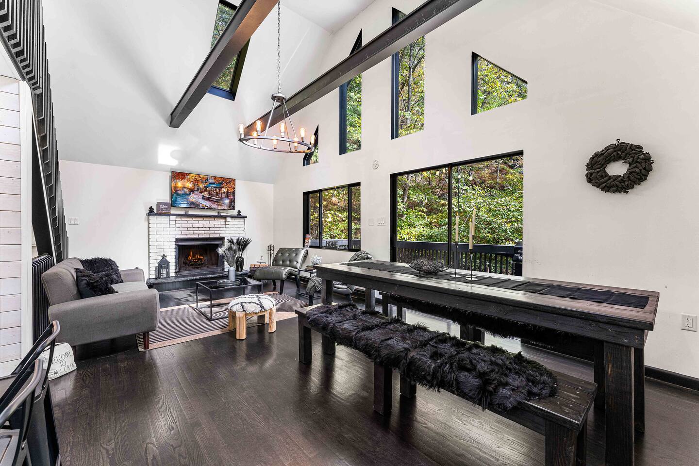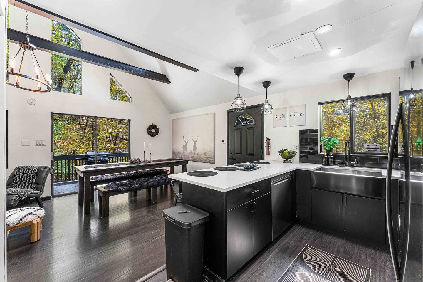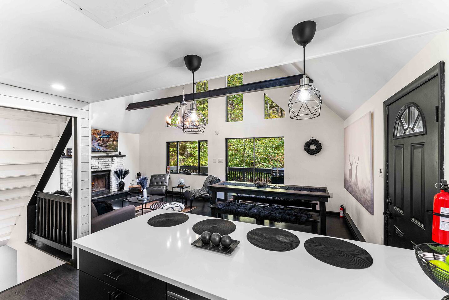 True mountain escape with designer finishes and high end appliances. The Cabin is situated near Bushkill Falls surrounded by a creek accessible for kayaking and fishing. The house is suited for 6 people 2 queen bedrooms on the main level and King Loft on the upper level. Open kitchen plan that connects with the living space highlighted by a beautiful fireplace. Beautiful deck for entertaining with a fire pit. Only 20mins away from Shawnee Mountain & 24/7 Supermarket.